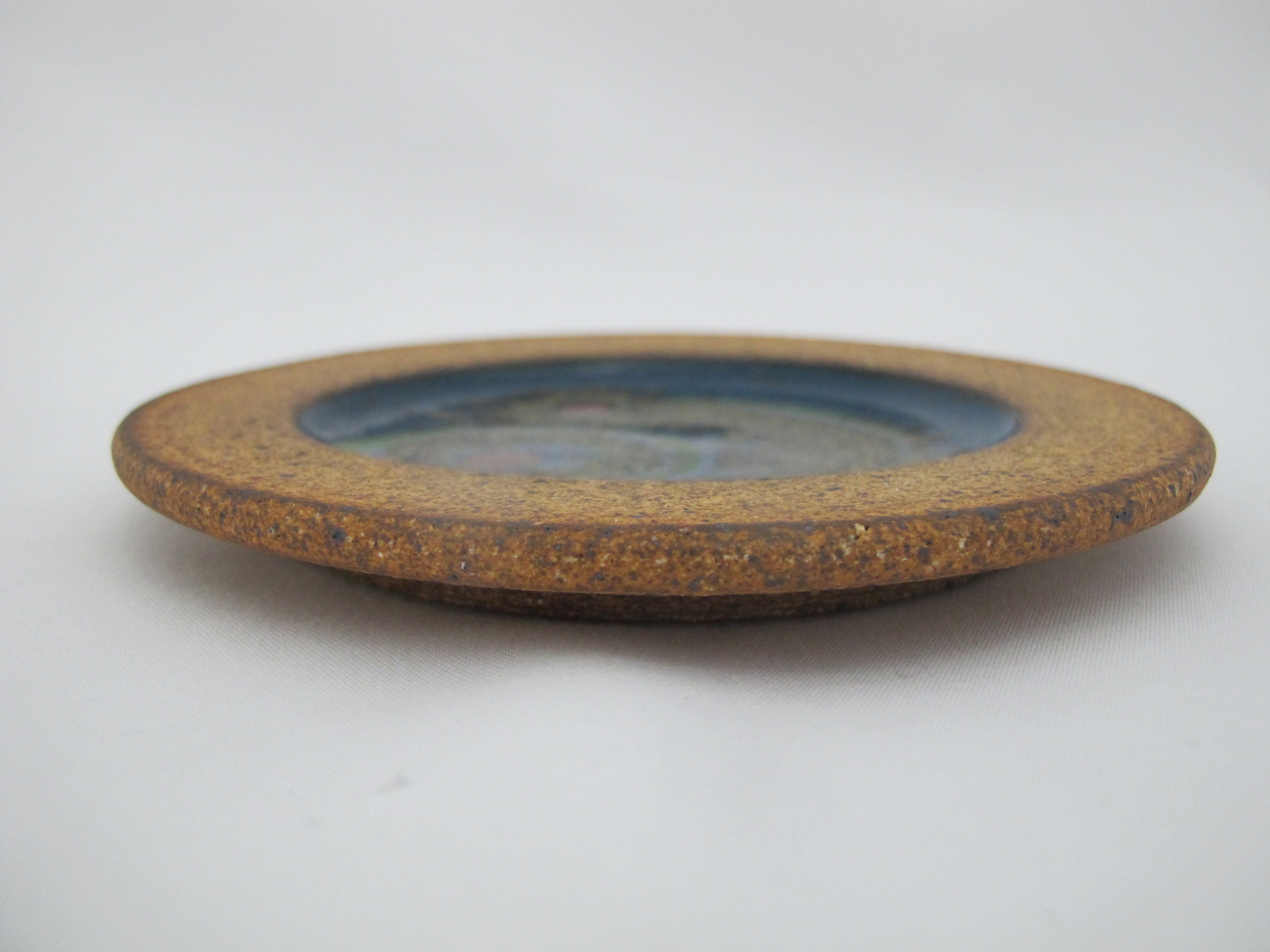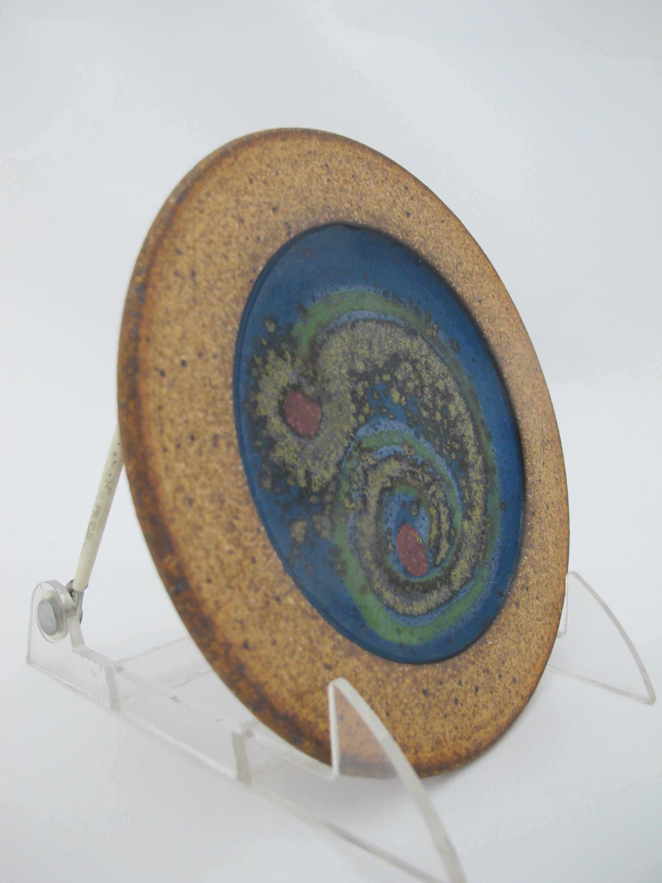 Round trivet dish with with clay loop at back to allow hanging. Stoneware pottery showing a gorgeous array of swirling blues and green highlighted by the natural stoneware rim.