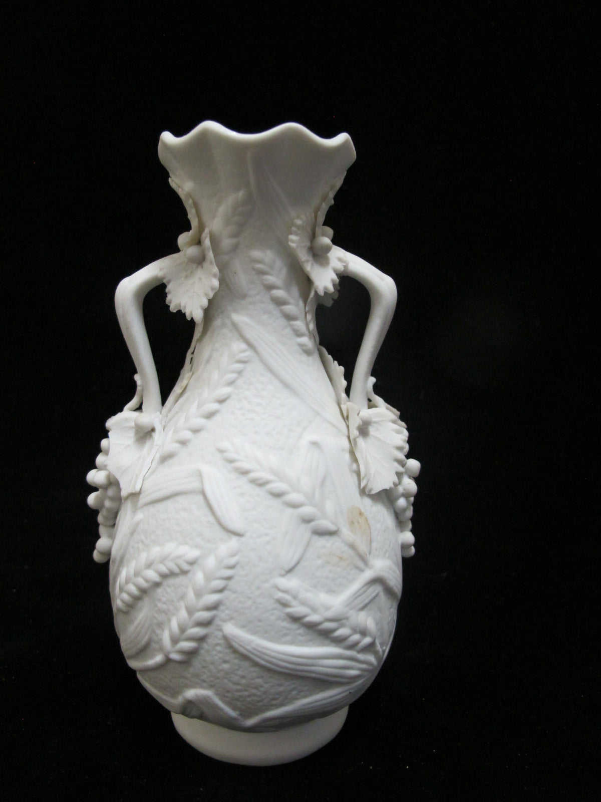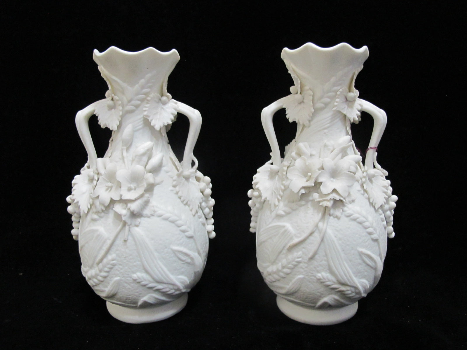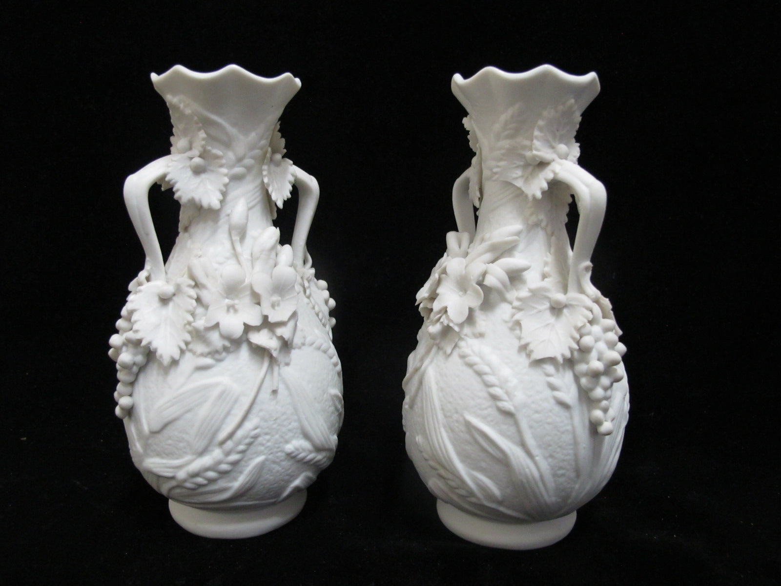 Antique Parian ware vase pair. Each vase in white bisque porcelain with ornate raised floral, grape, and wheat design.