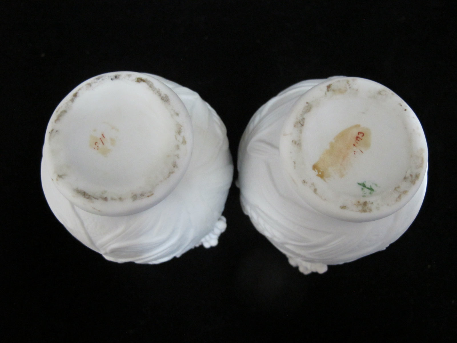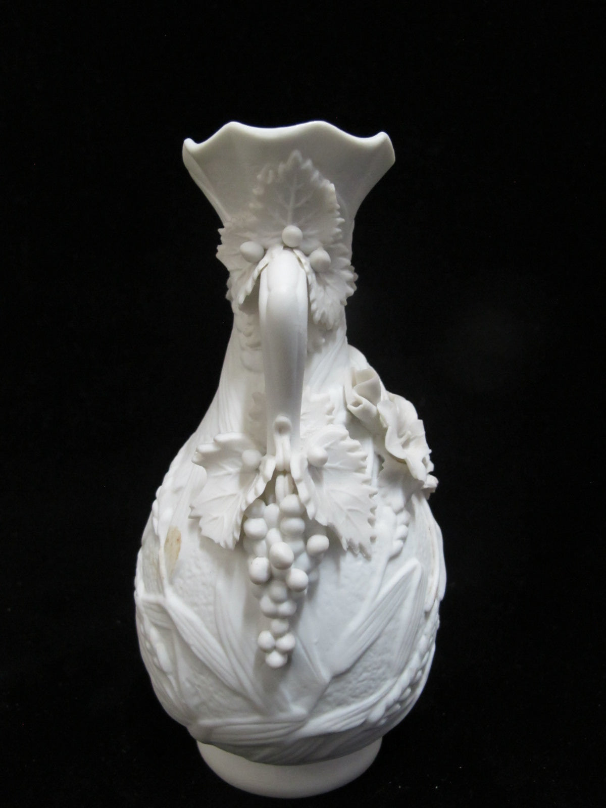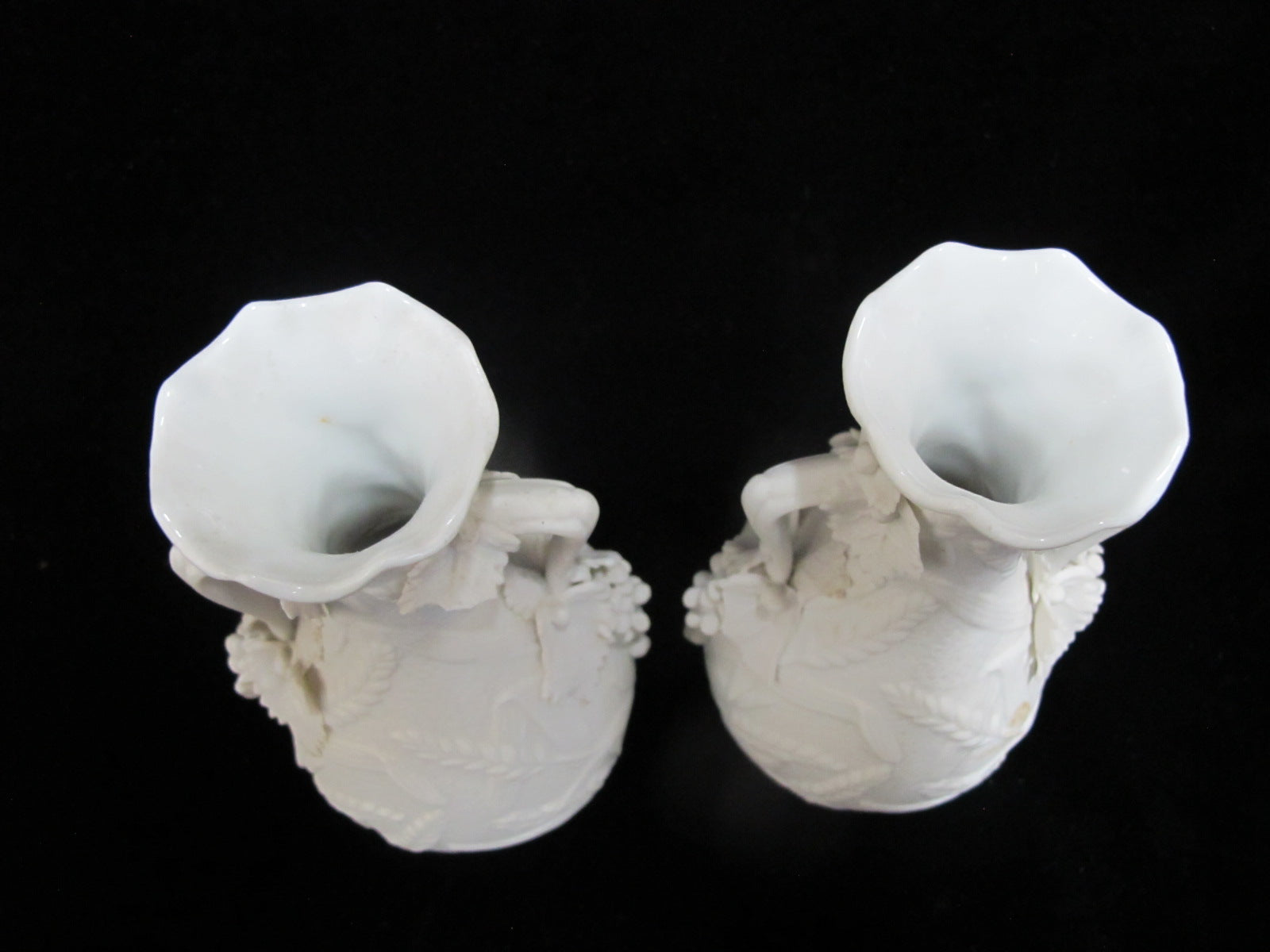 Antique Parian ware vase pair. Each vase in white bisque porcelain with ornate raised floral, grape, and wheat design.
