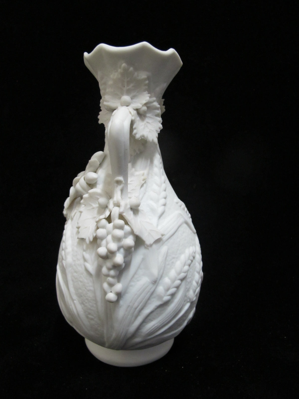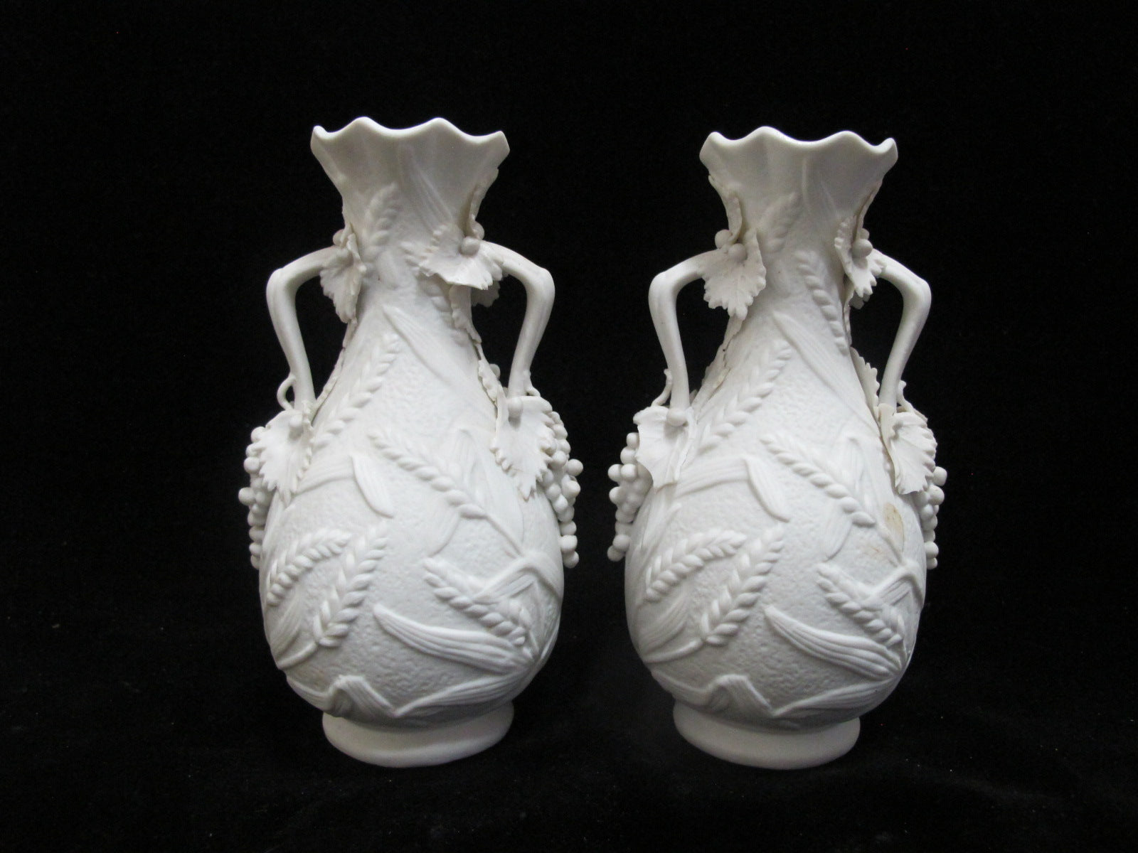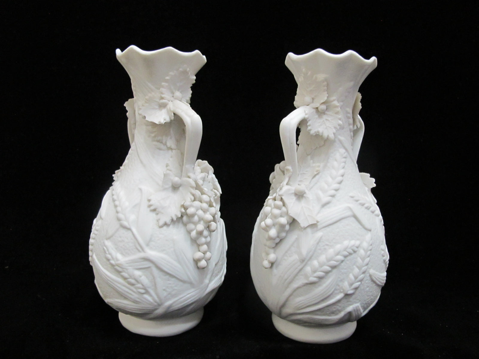 White PARIAN Bisque Porcelain Raised WHEAT & GRAPE Pattern Handled Vase Pair