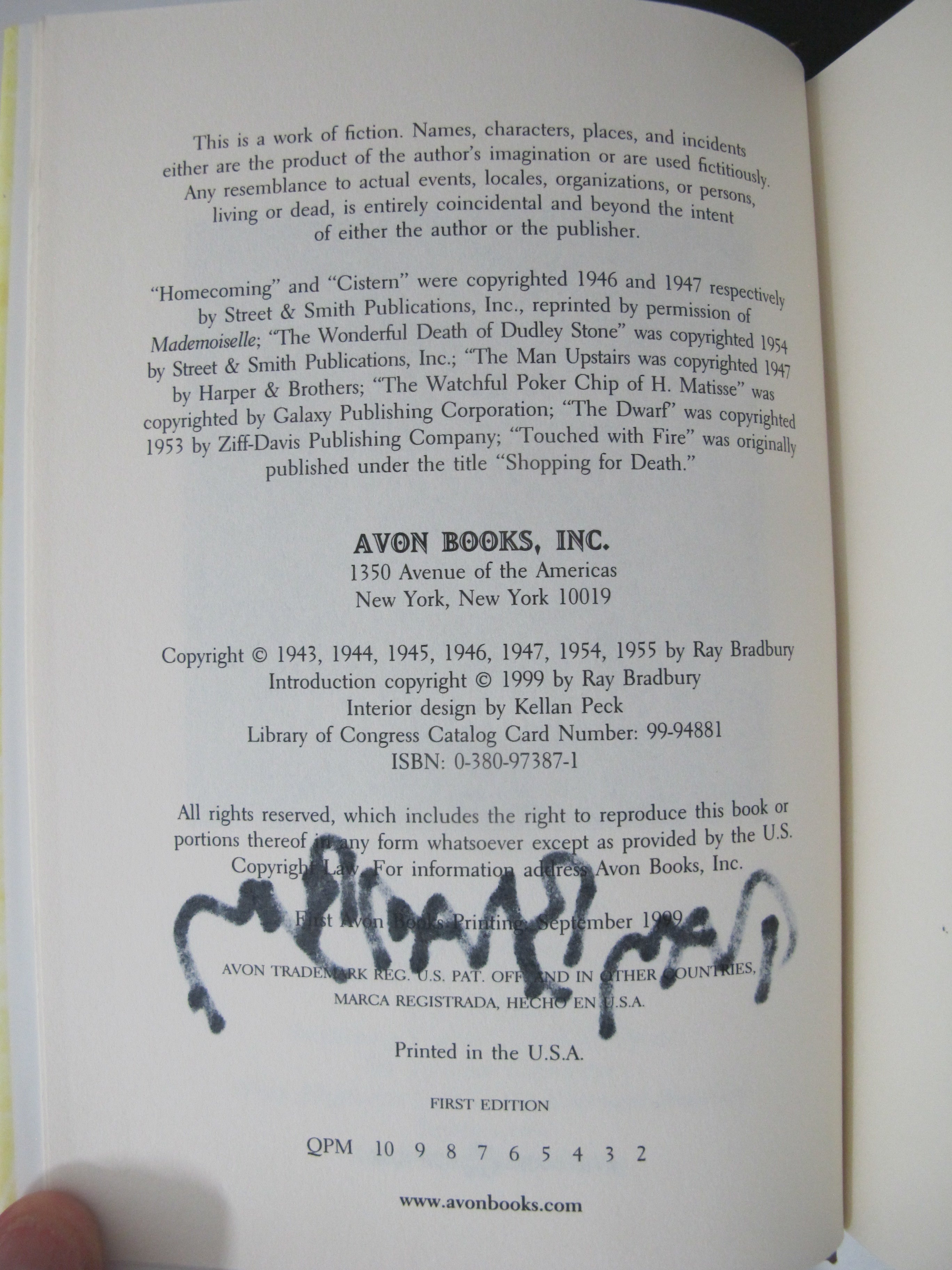 Ray Bradbury's 'The October Country' hardcover book with dust jacket. Signed by Ray Bradbury inner page, Avon Books, 1999.