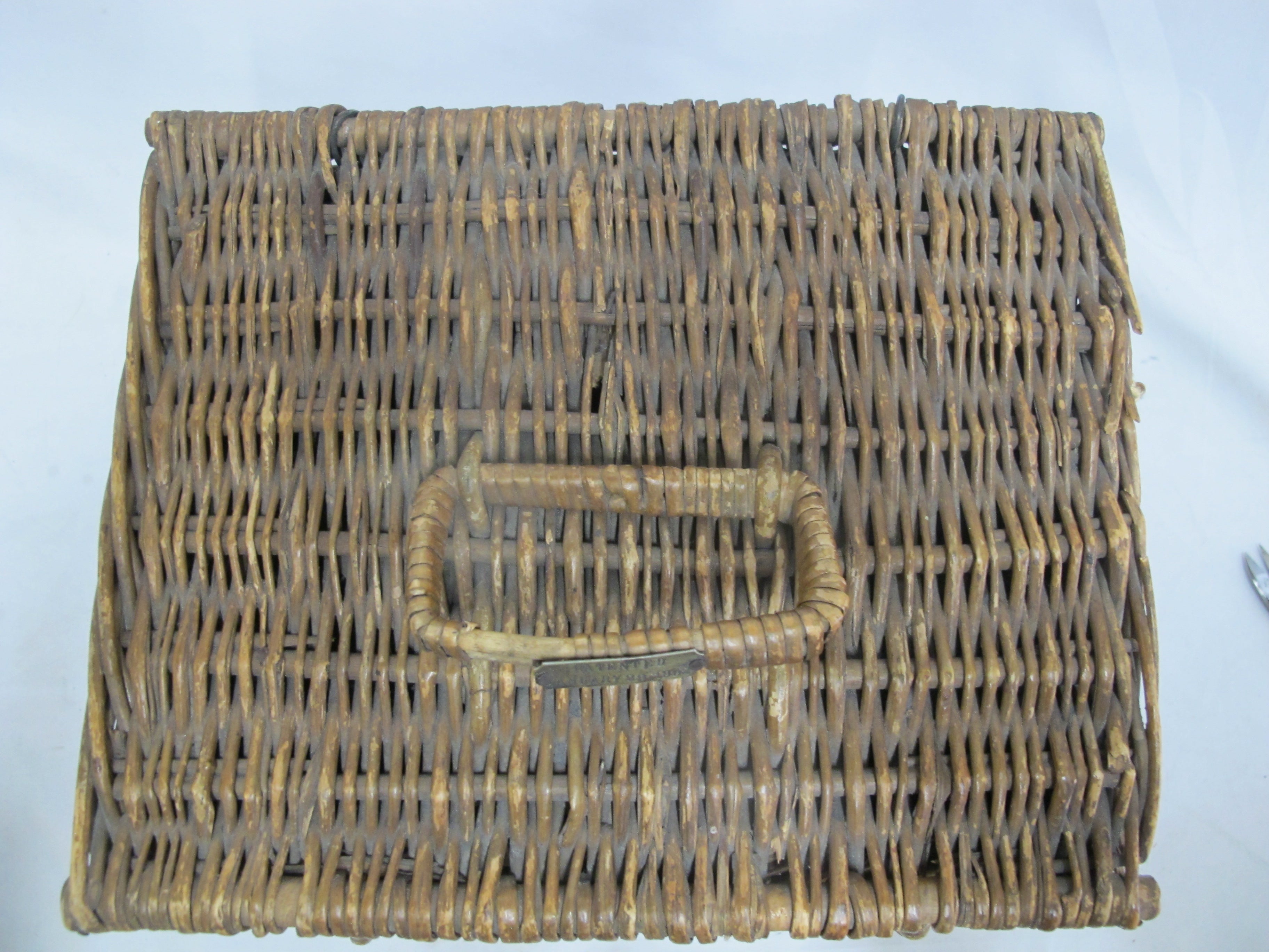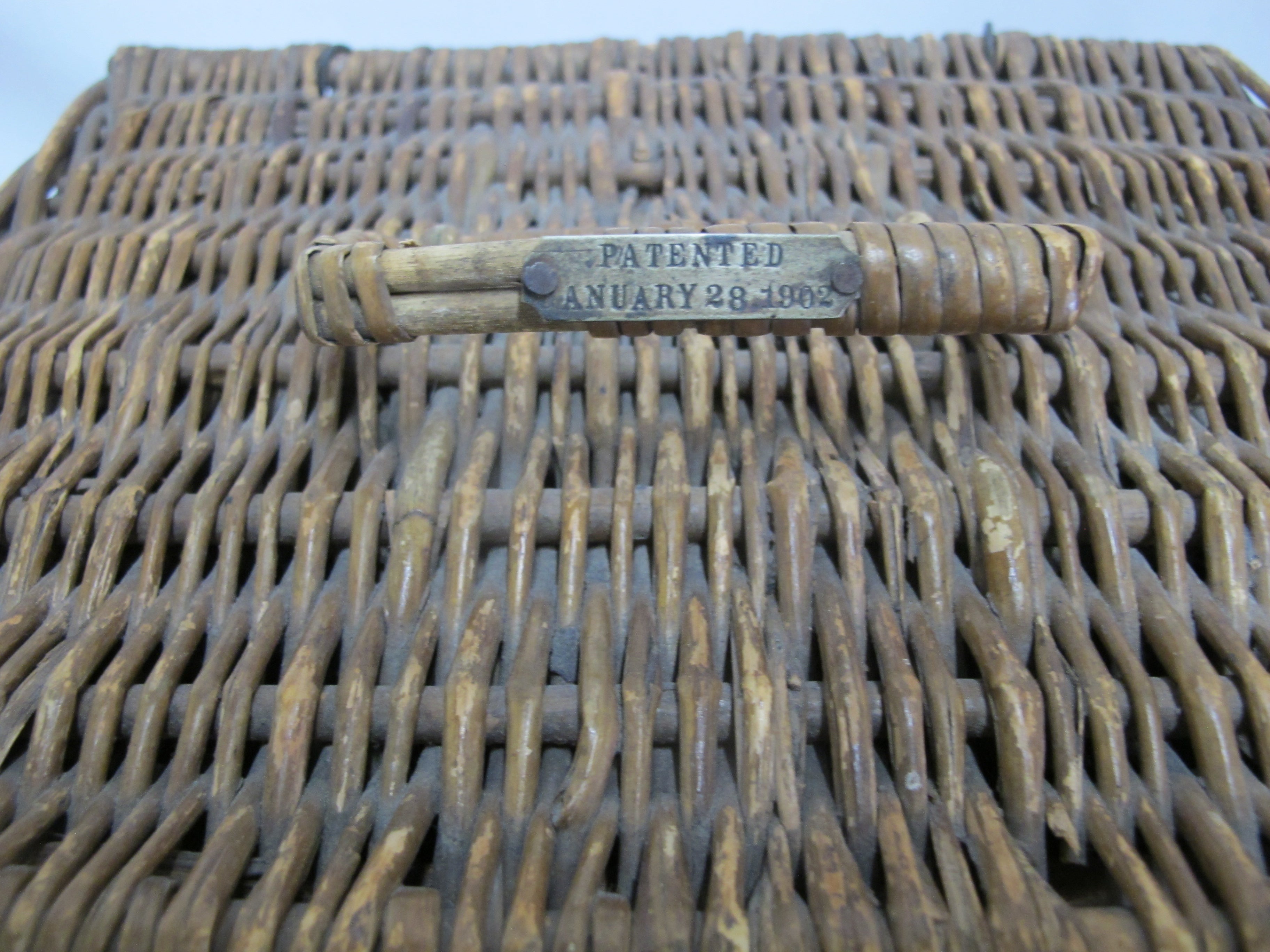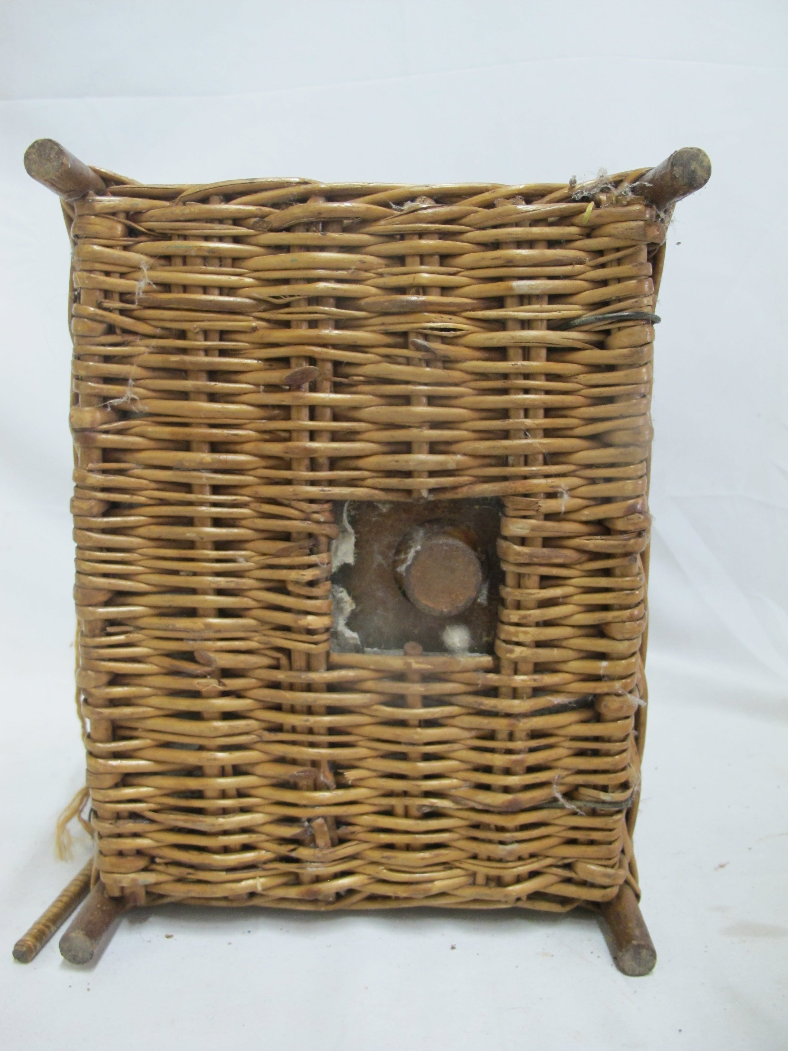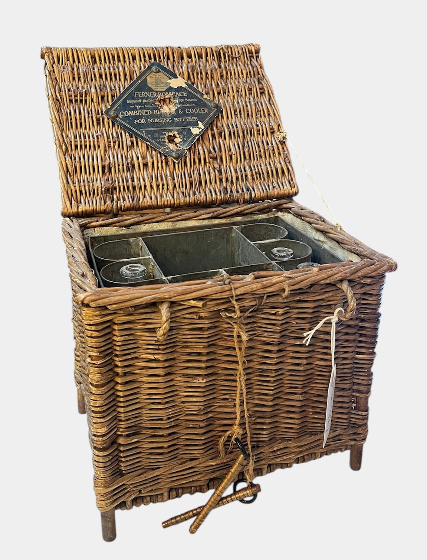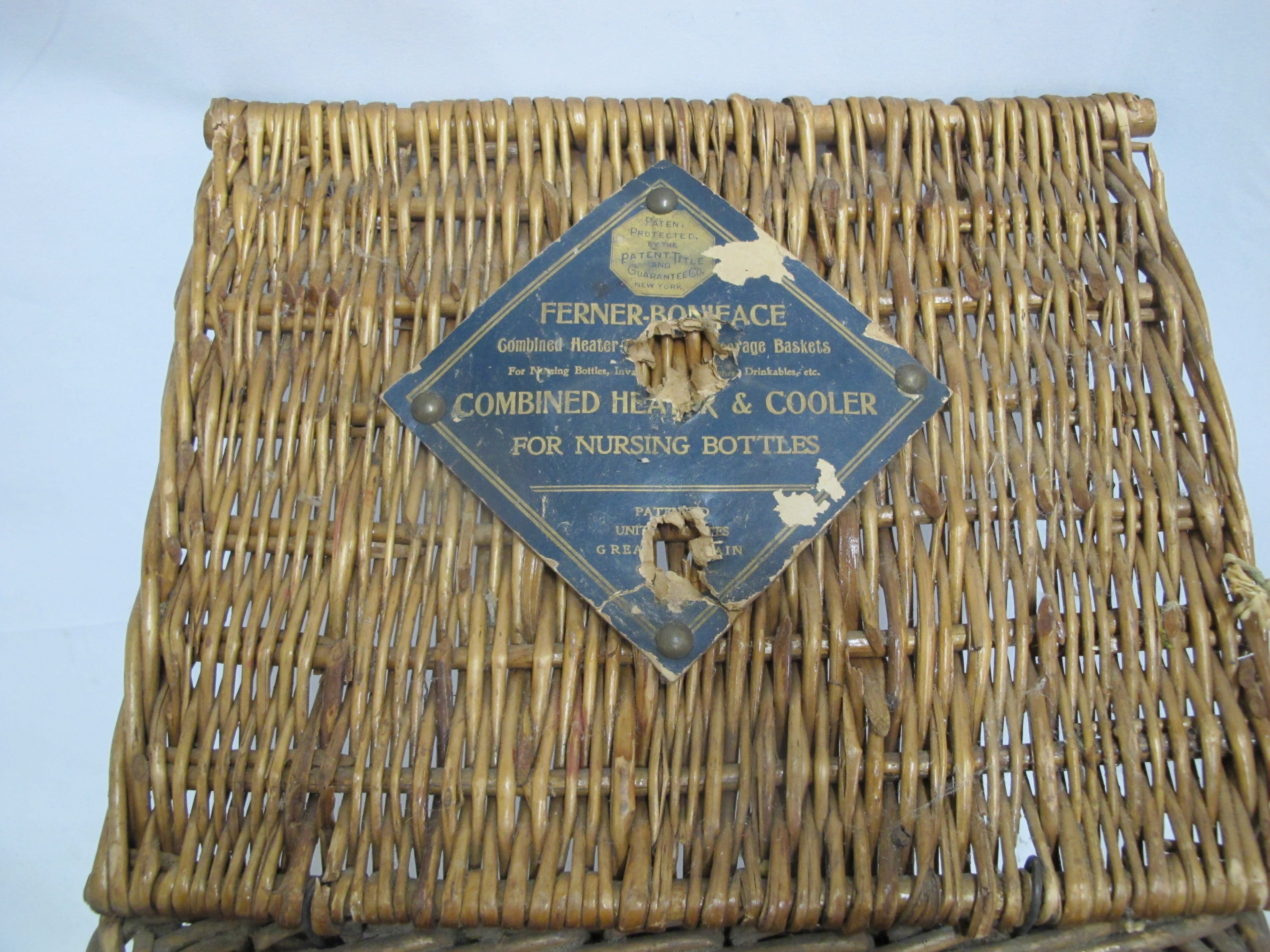 Antique wicker travel basket with a label for "FERNER-BONIFACE COMBINED HEATER & COOLER FOR NURSING BOTTLES," Also shows patent for January 28th 1905 and New York. Wicker basket with lid opens to metal insert that holds baby bottles. 6 of the original glass feeding bottles are included, as shown. Very good condition, obvious wear. Please review photos.