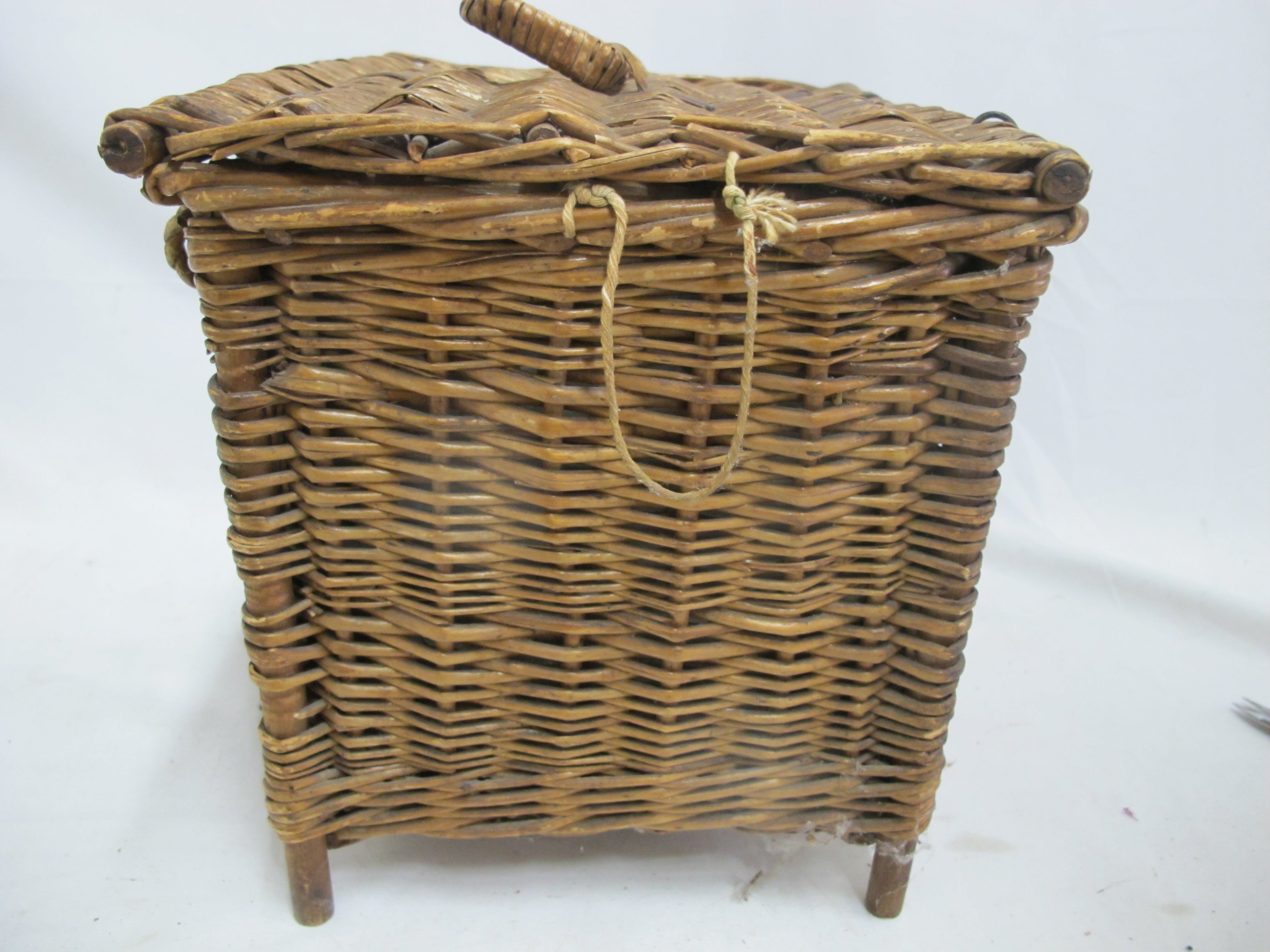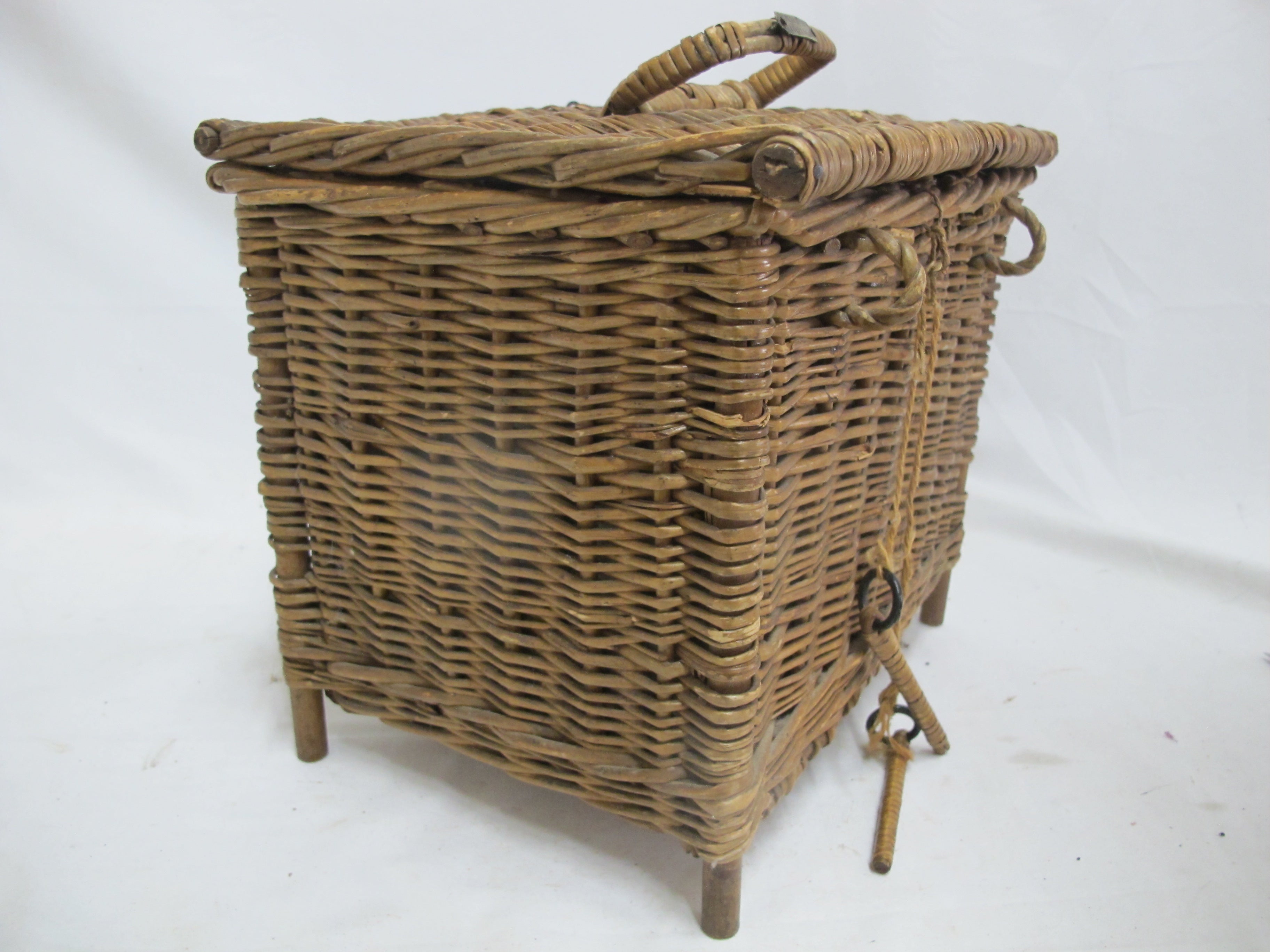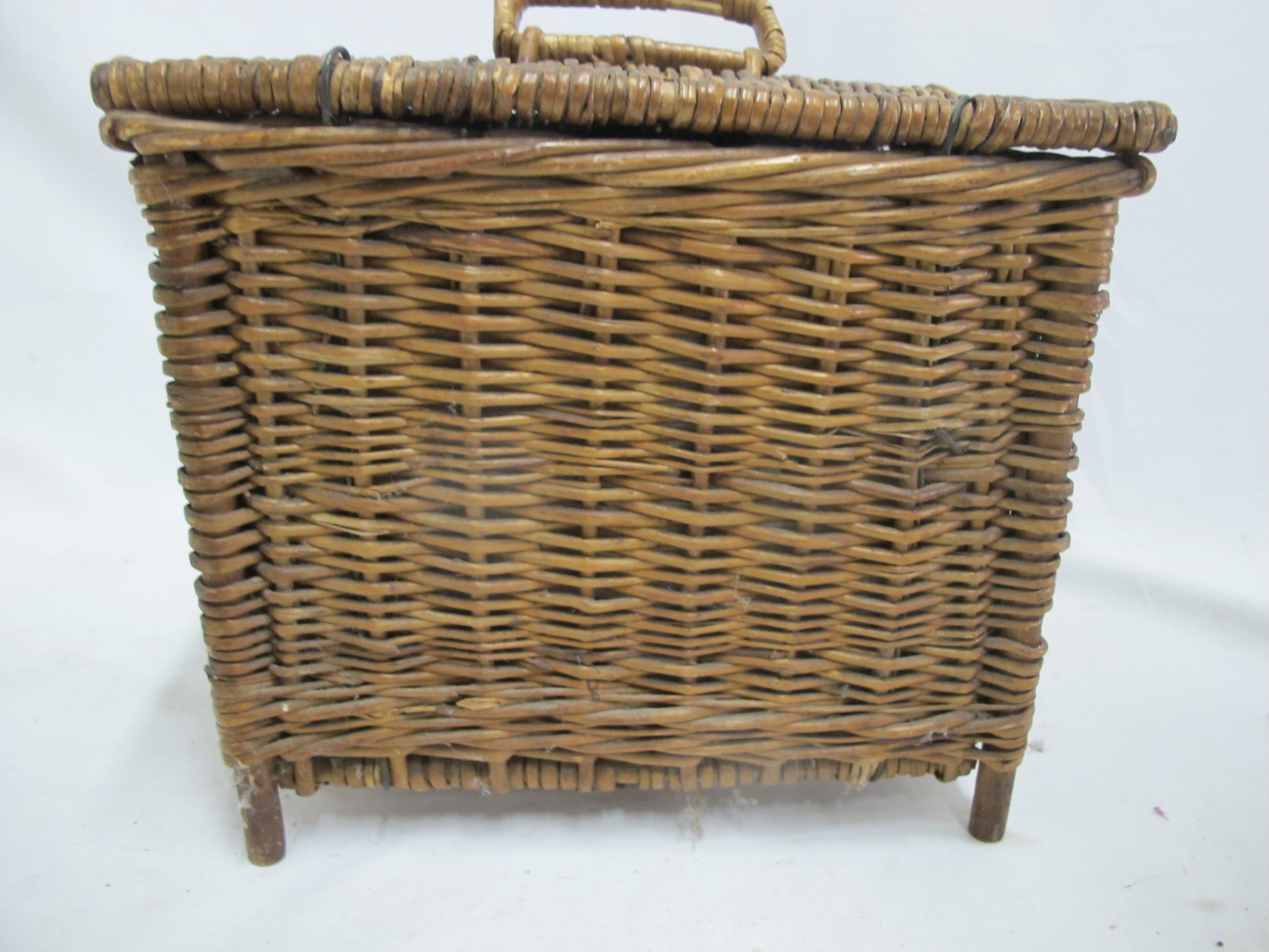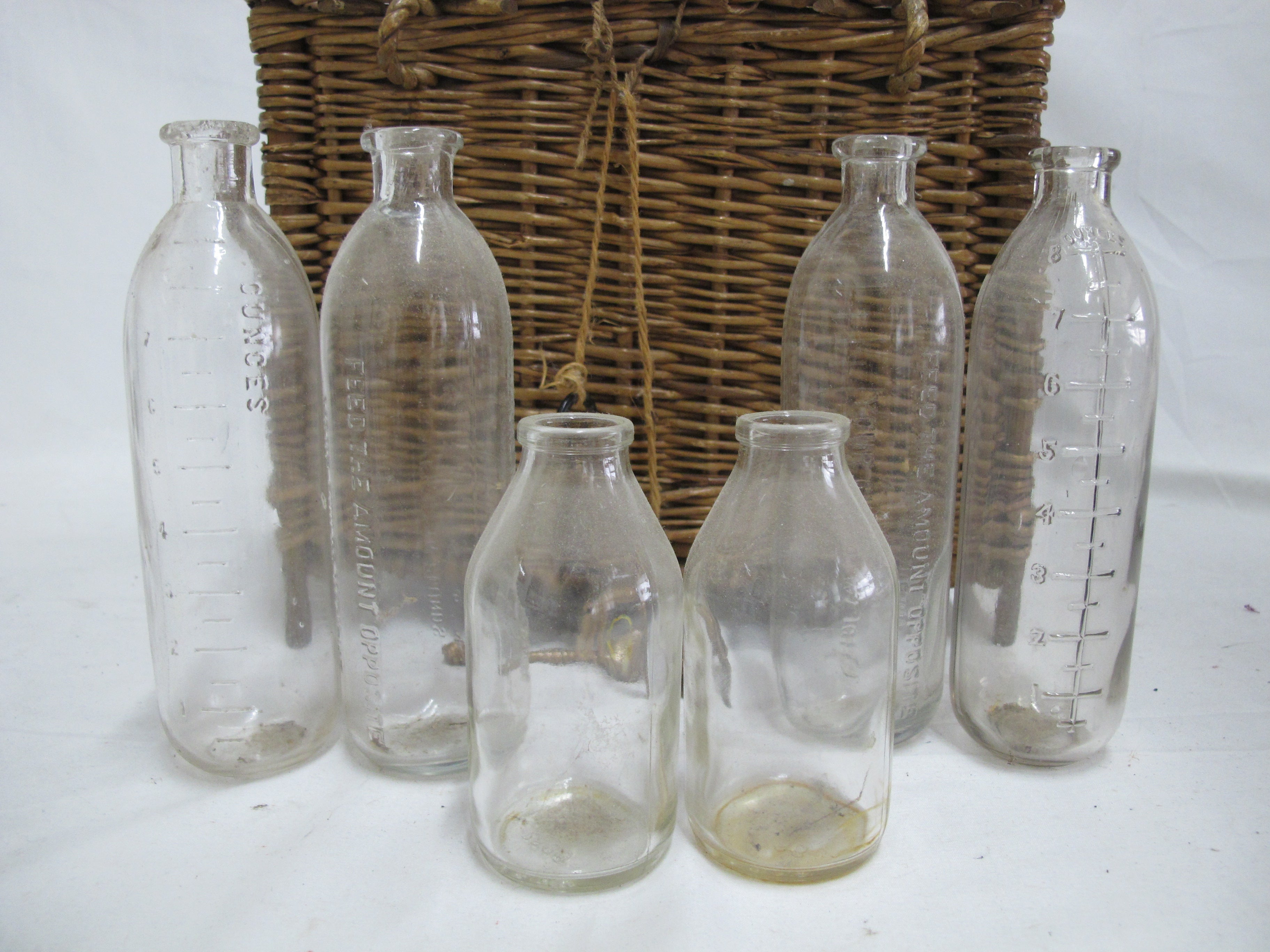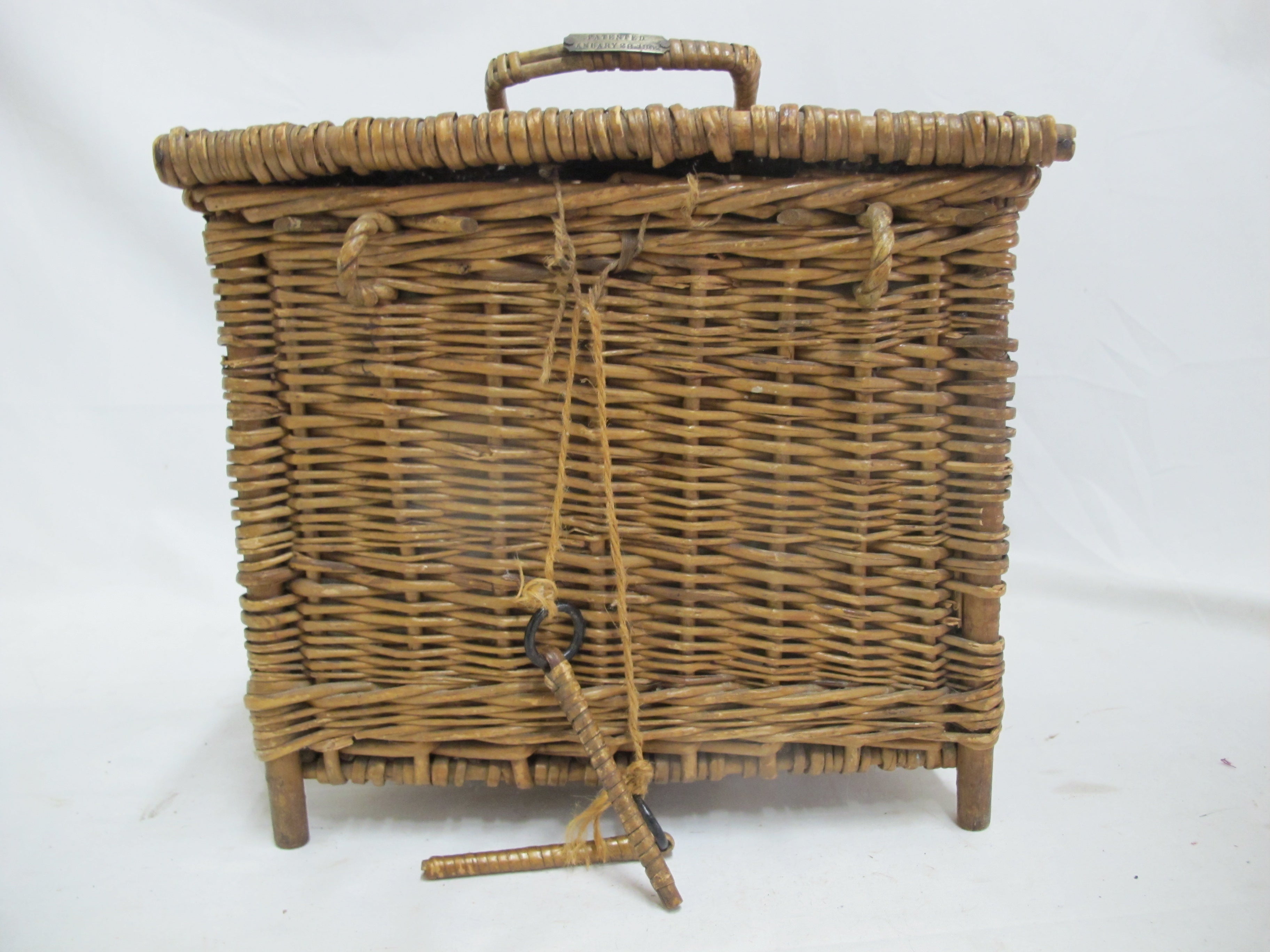 Antique wicker travel basket with a label for "FERNER-BONIFACE COMBINED HEATER & COOLER FOR NURSING BOTTLES," Also shows patent for January 28th 1905 and New York. Wicker basket with lid opens to metal insert that holds baby bottles. 6 of the original glass feeding bottles are included, as shown. Very good condition, obvious wear. Please review photos.