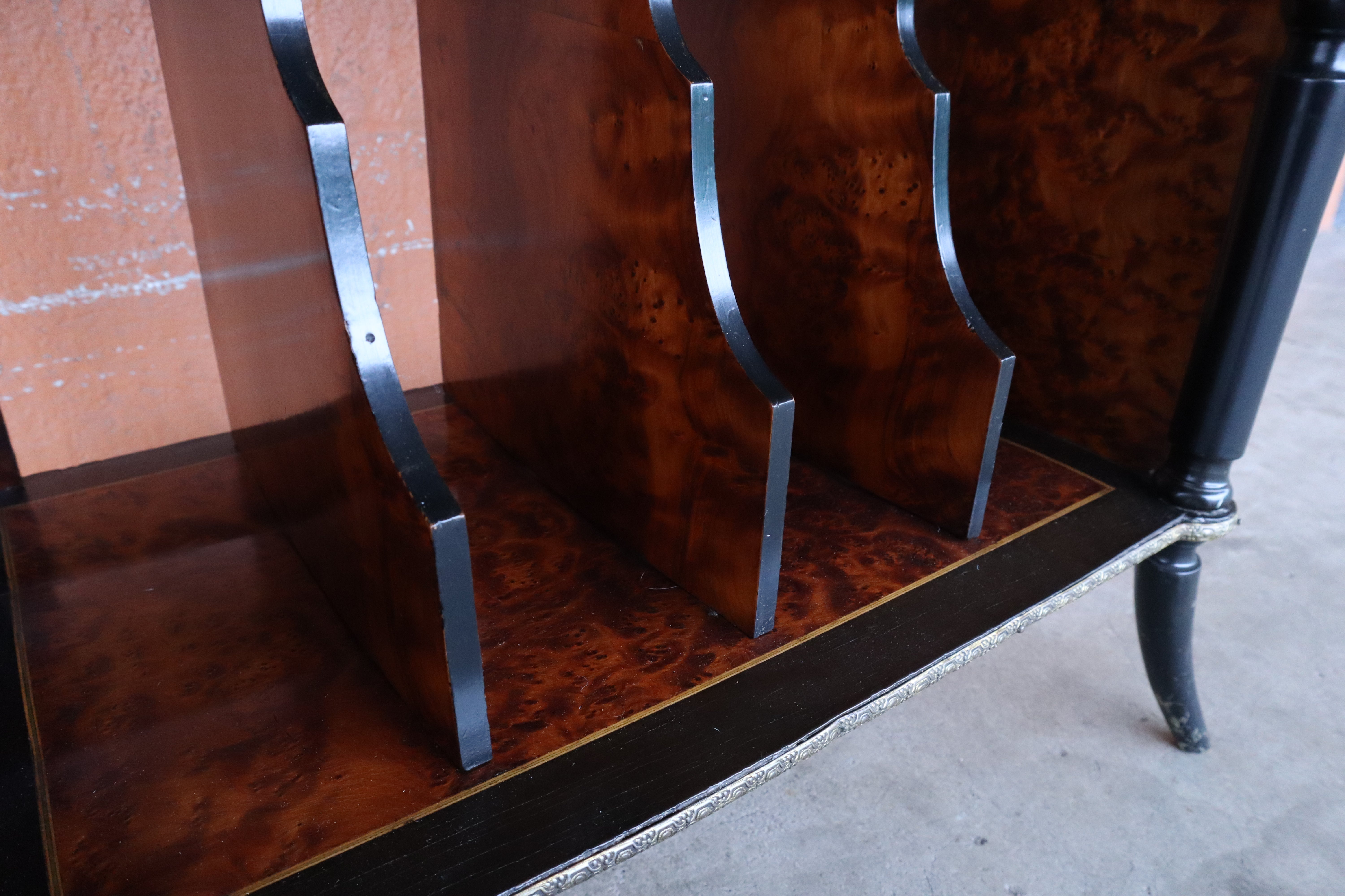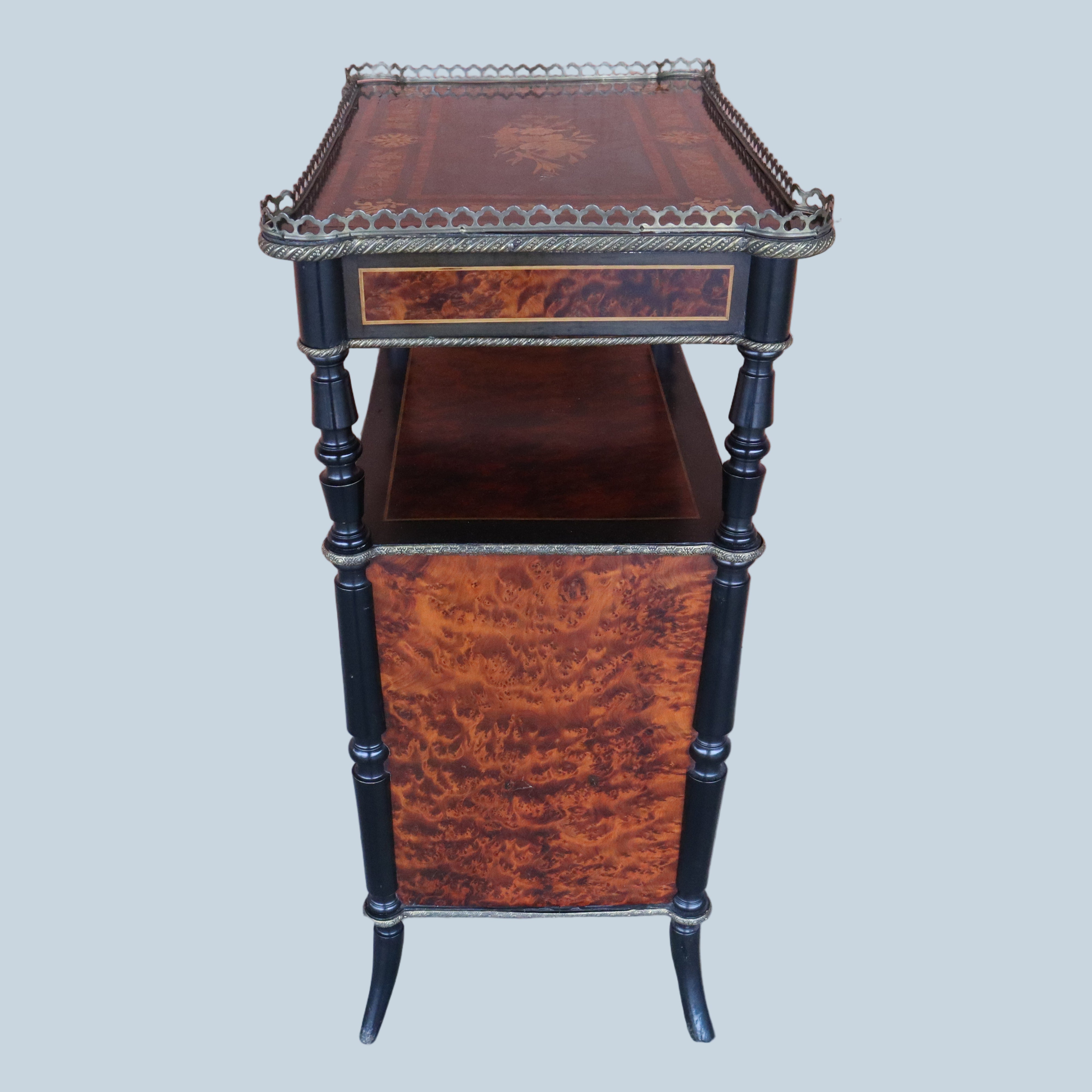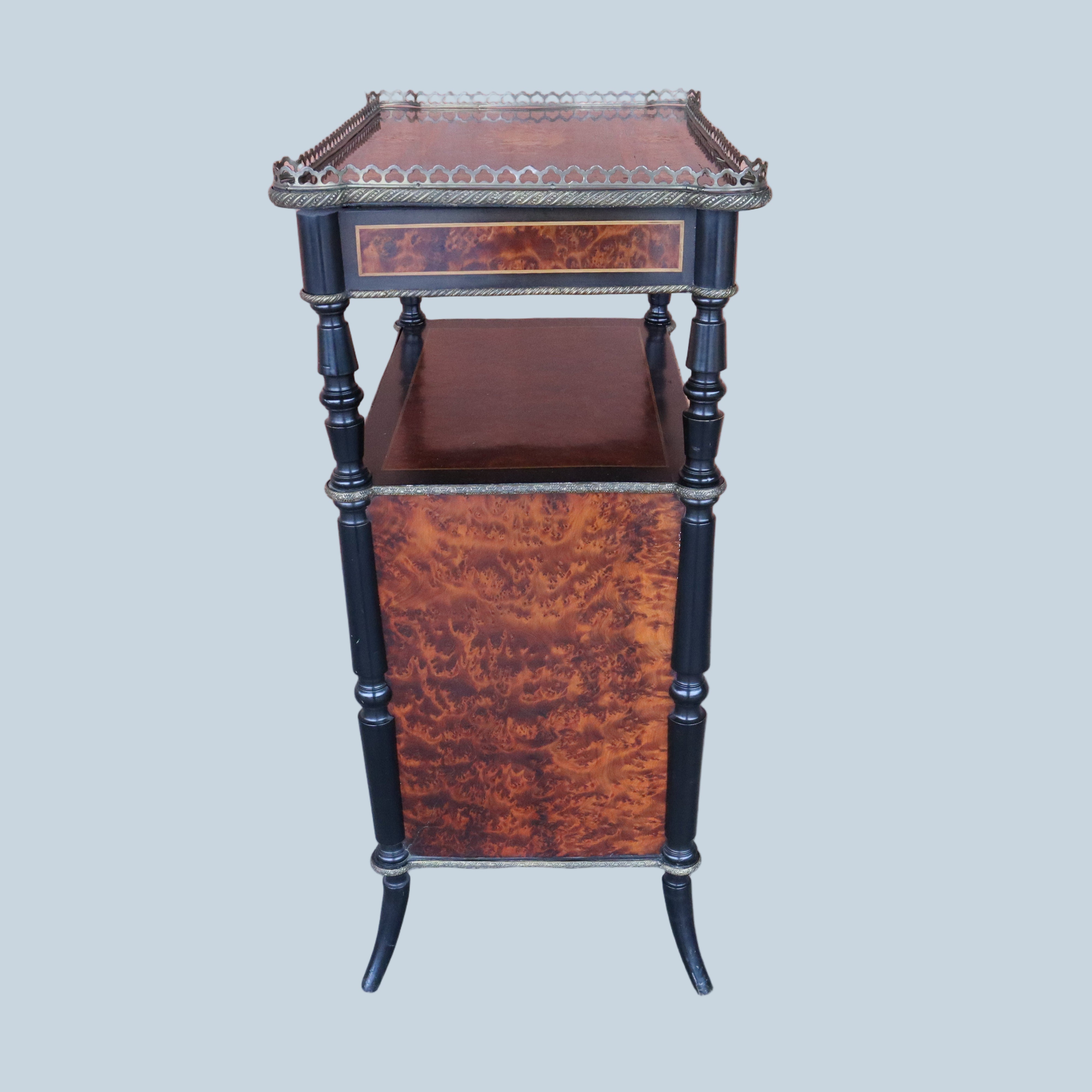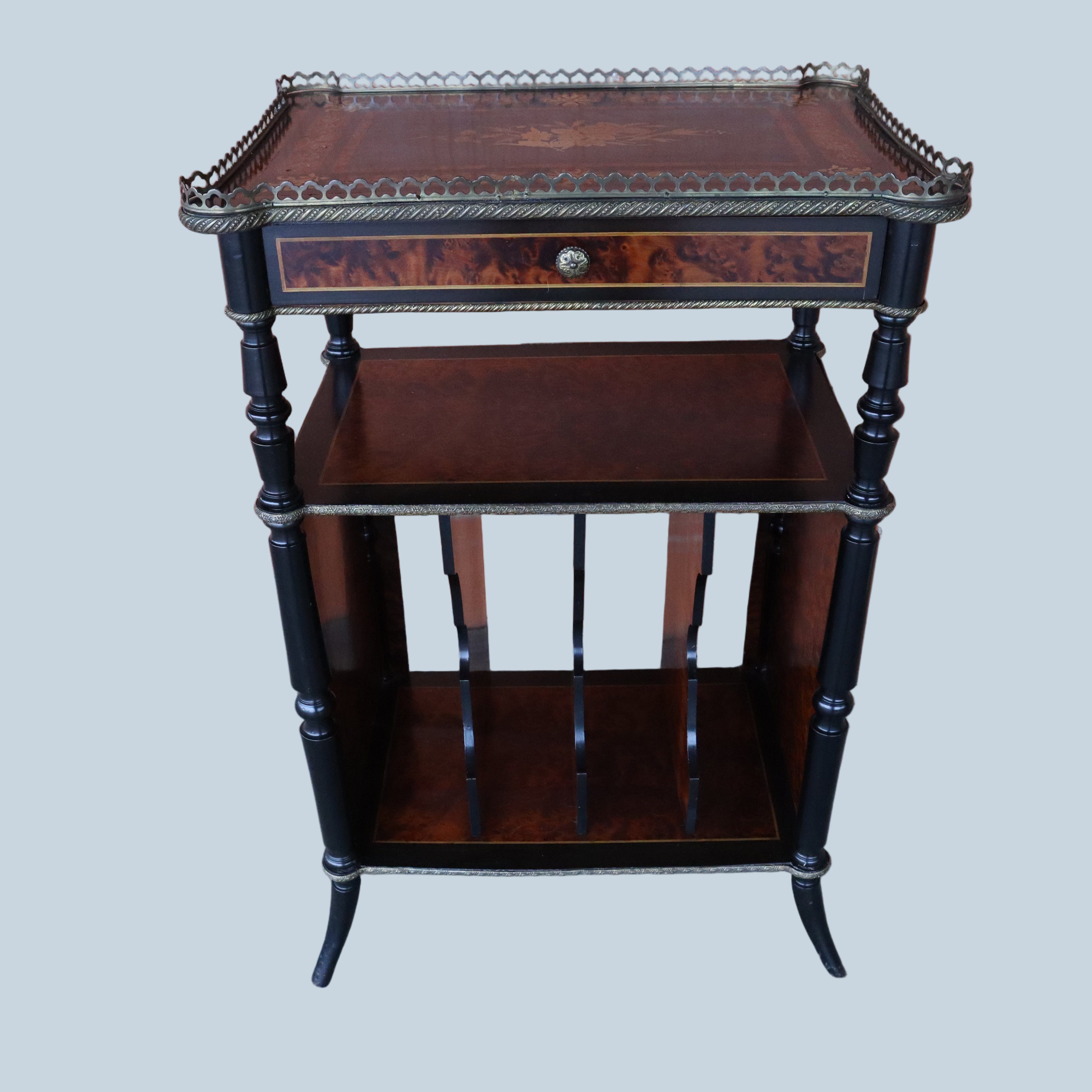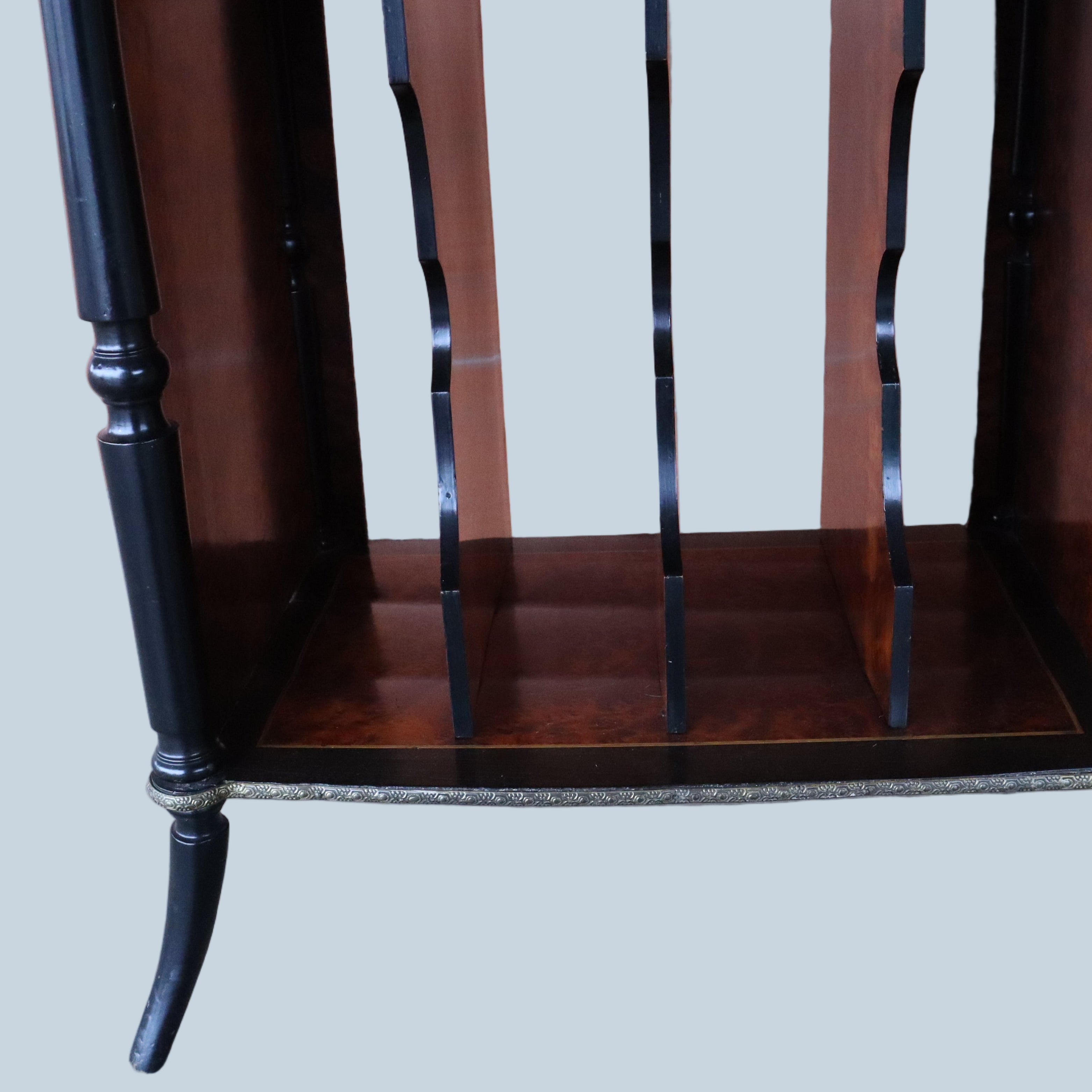 The frieze fitted with a single drawer faced in figured burl walnut and accented with gilt-bronze mounts, raised on turned supports. The lower section is divided into four compartments for the storage of sheet music or folios, flanked by ebonized stiles and standing on splayed legs. Veneered in rich burl walnut with ebonized and gilt-bronze accents throughout.