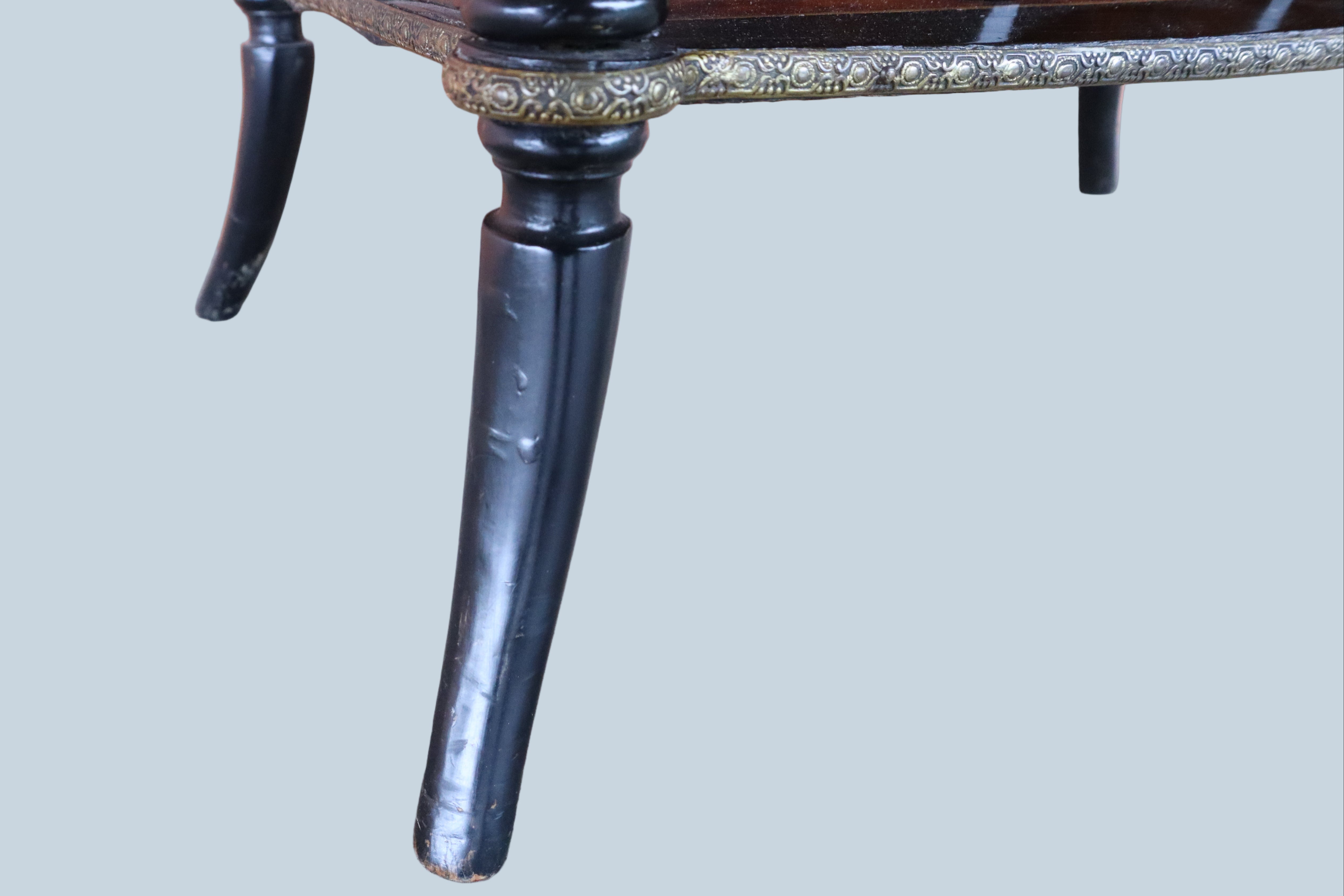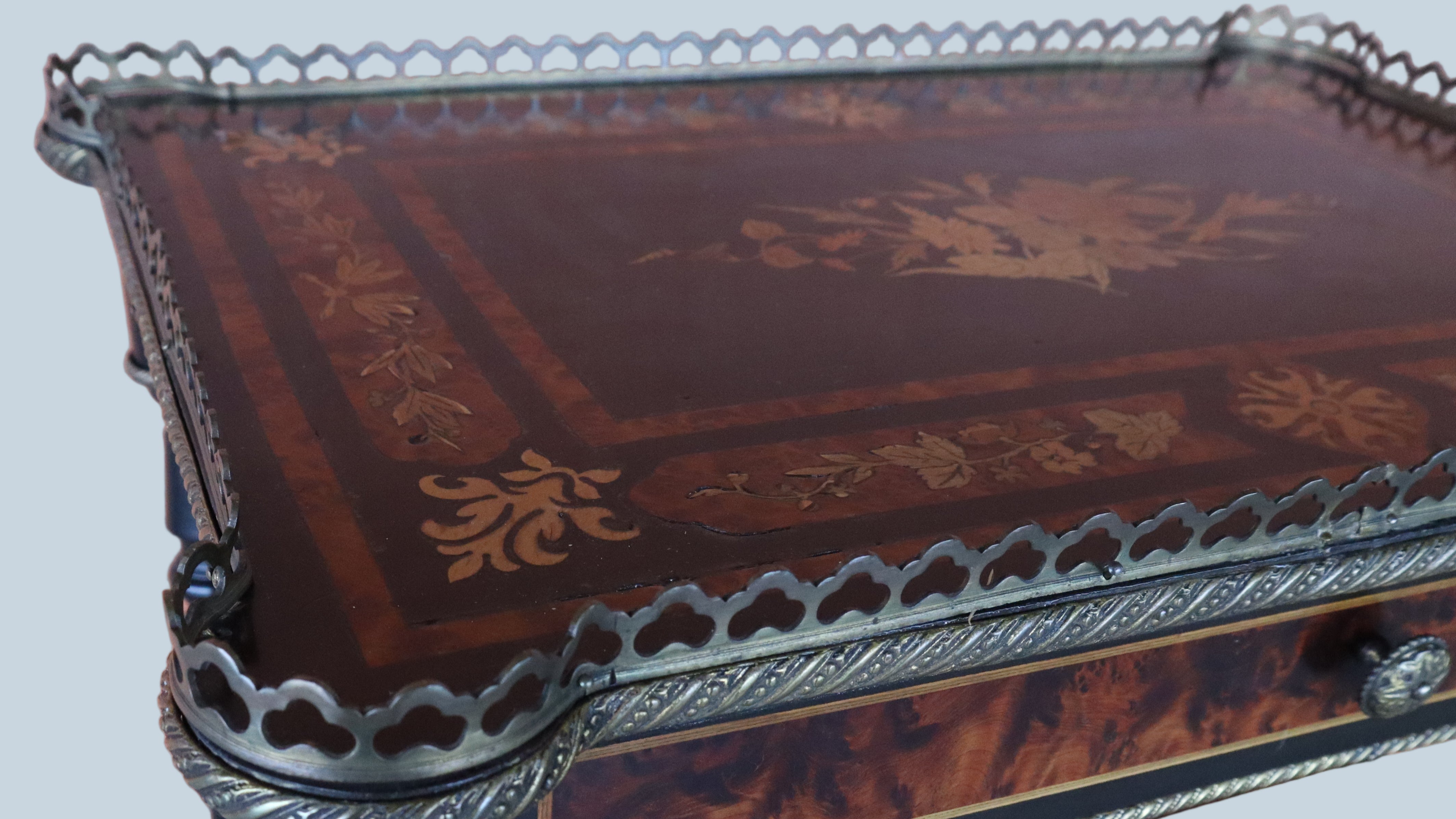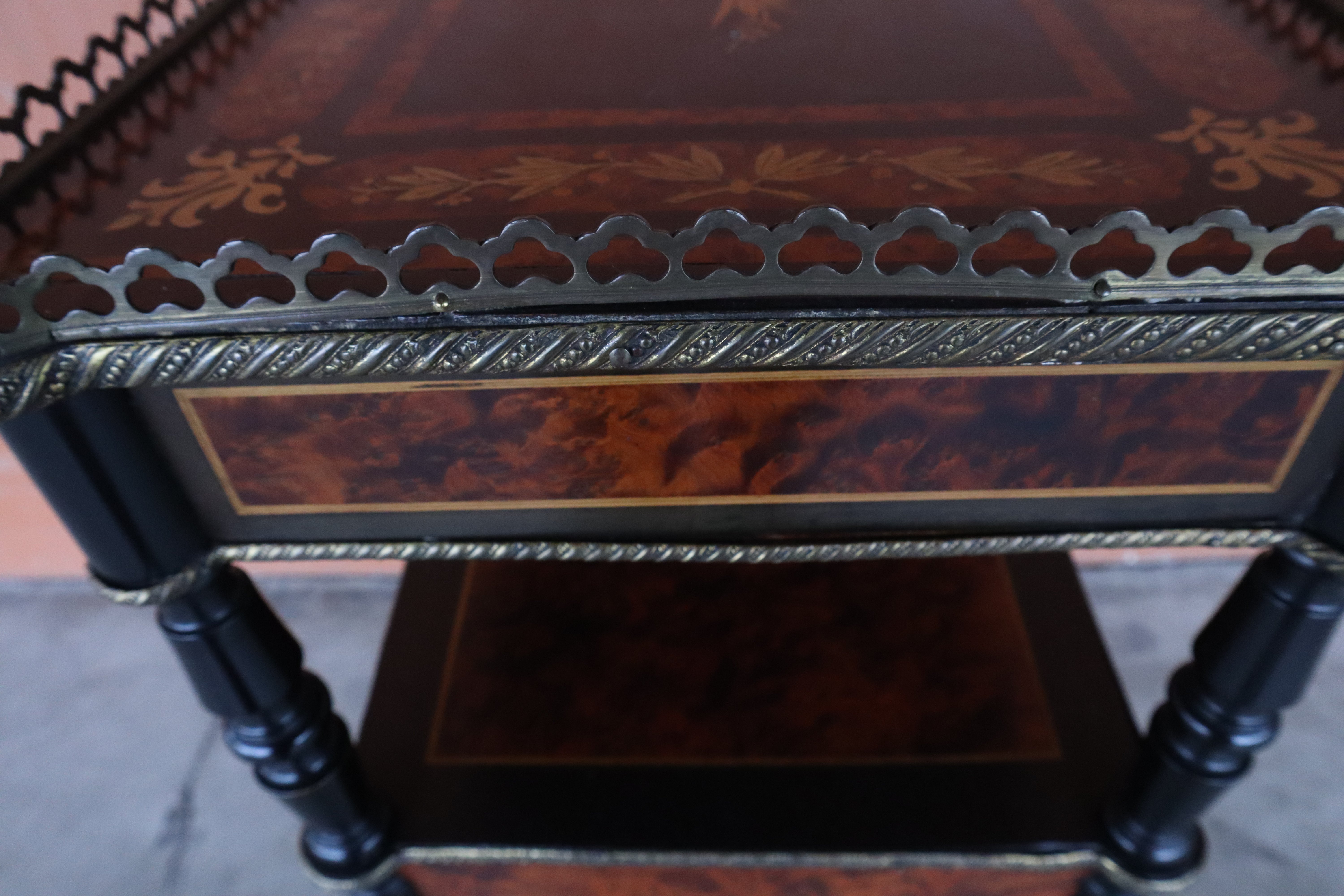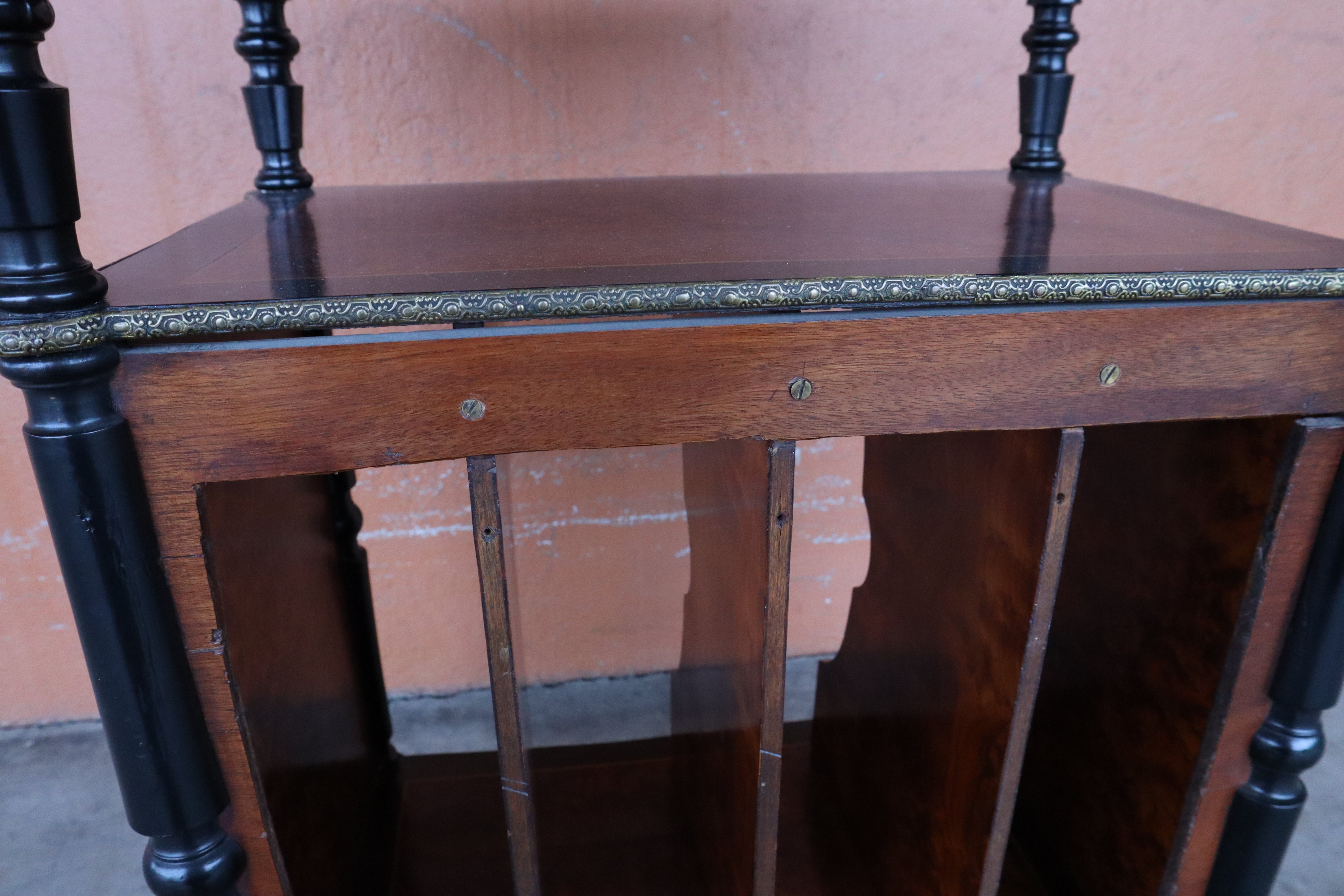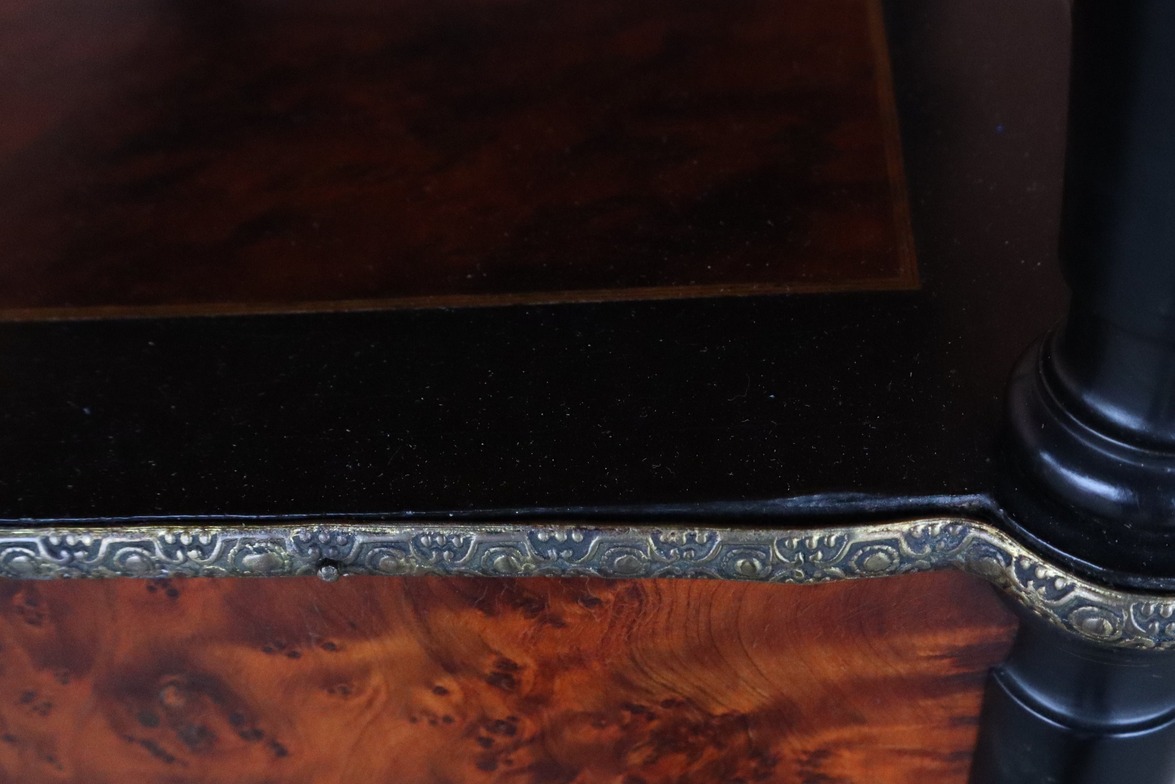 The frieze fitted with a single drawer faced in figured burl walnut and accented with gilt-bronze mounts, raised on turned supports. The lower section is divided into four compartments for the storage of sheet music or folios, flanked by ebonized stiles and standing on splayed legs. Veneered in rich burl walnut with ebonized and gilt-bronze accents throughout.