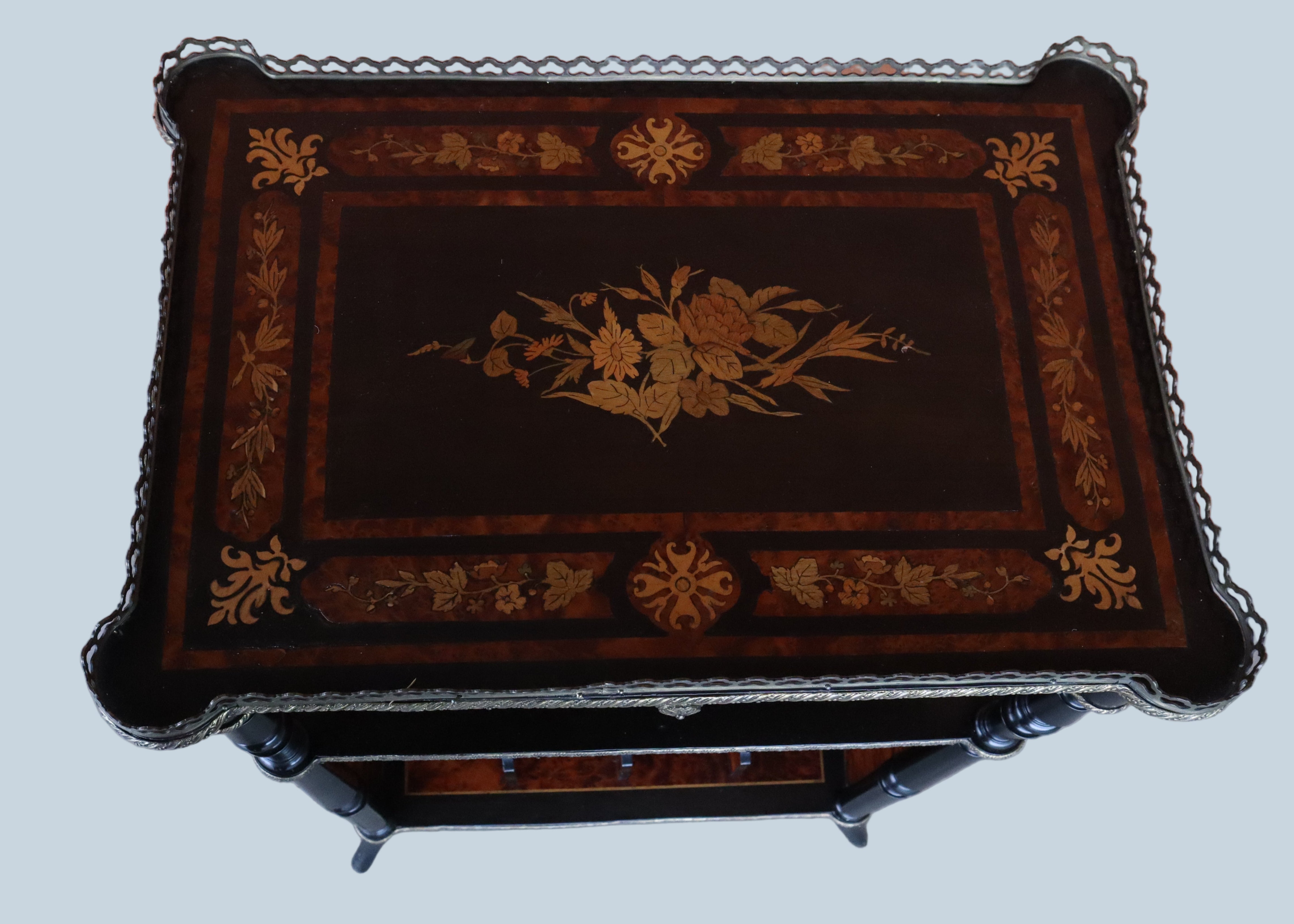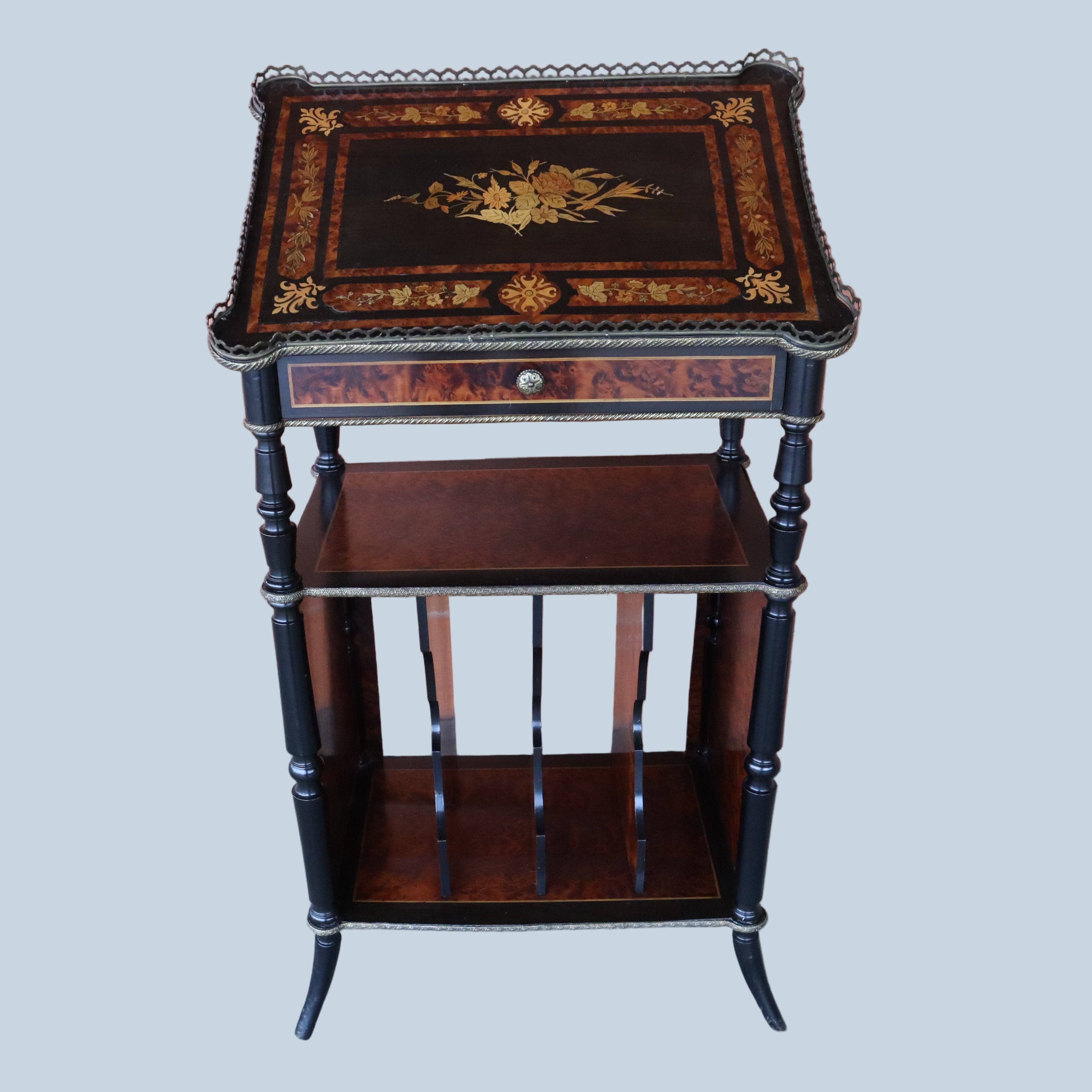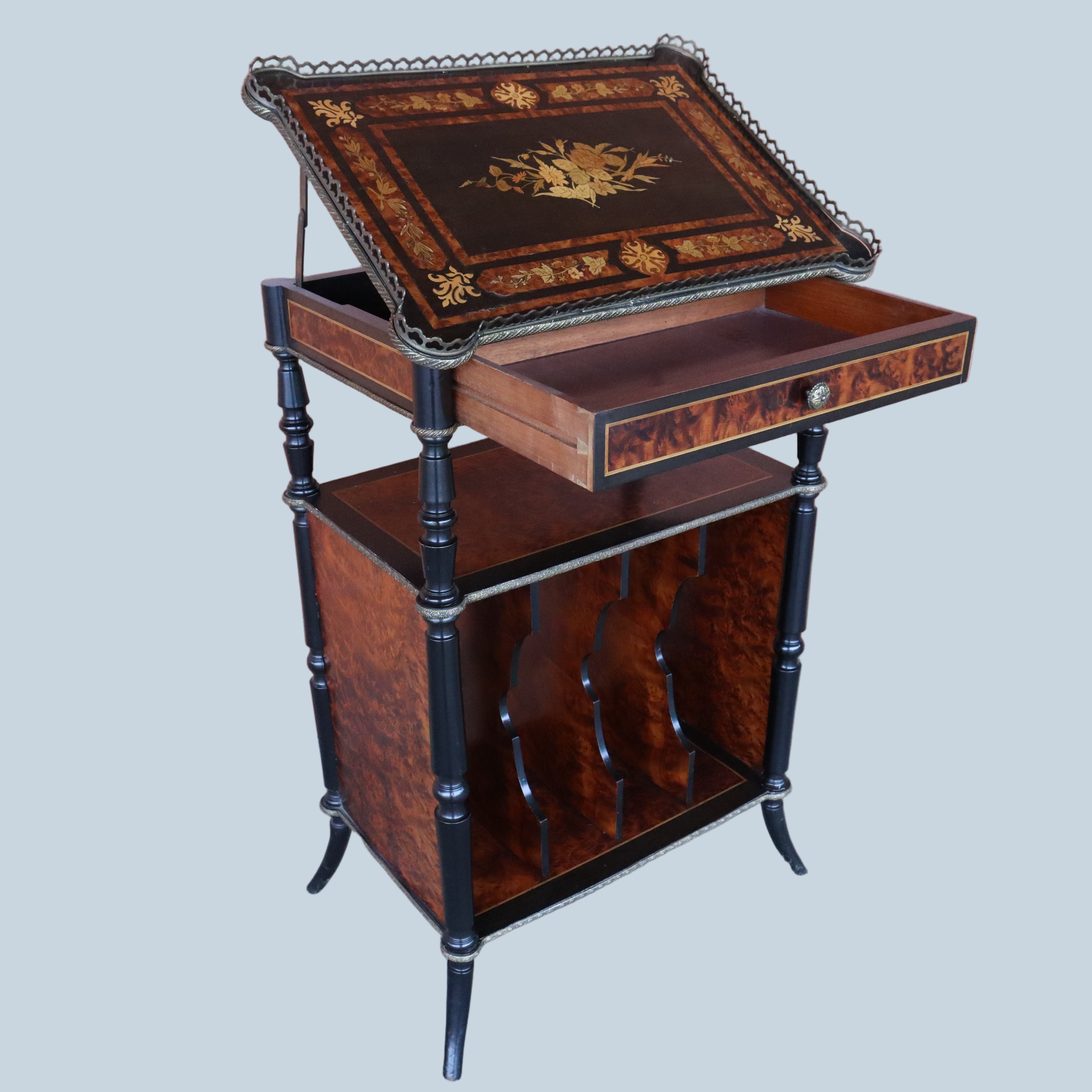 A very fine raised Victorian music stand with cabinet, shelf and drawer. The rectangular top also has a hinged easel panel inlaid with floral marquetry of exotic woods within geometric and foliate borders, all enclosed by a pierced gilt-bronze gallery.