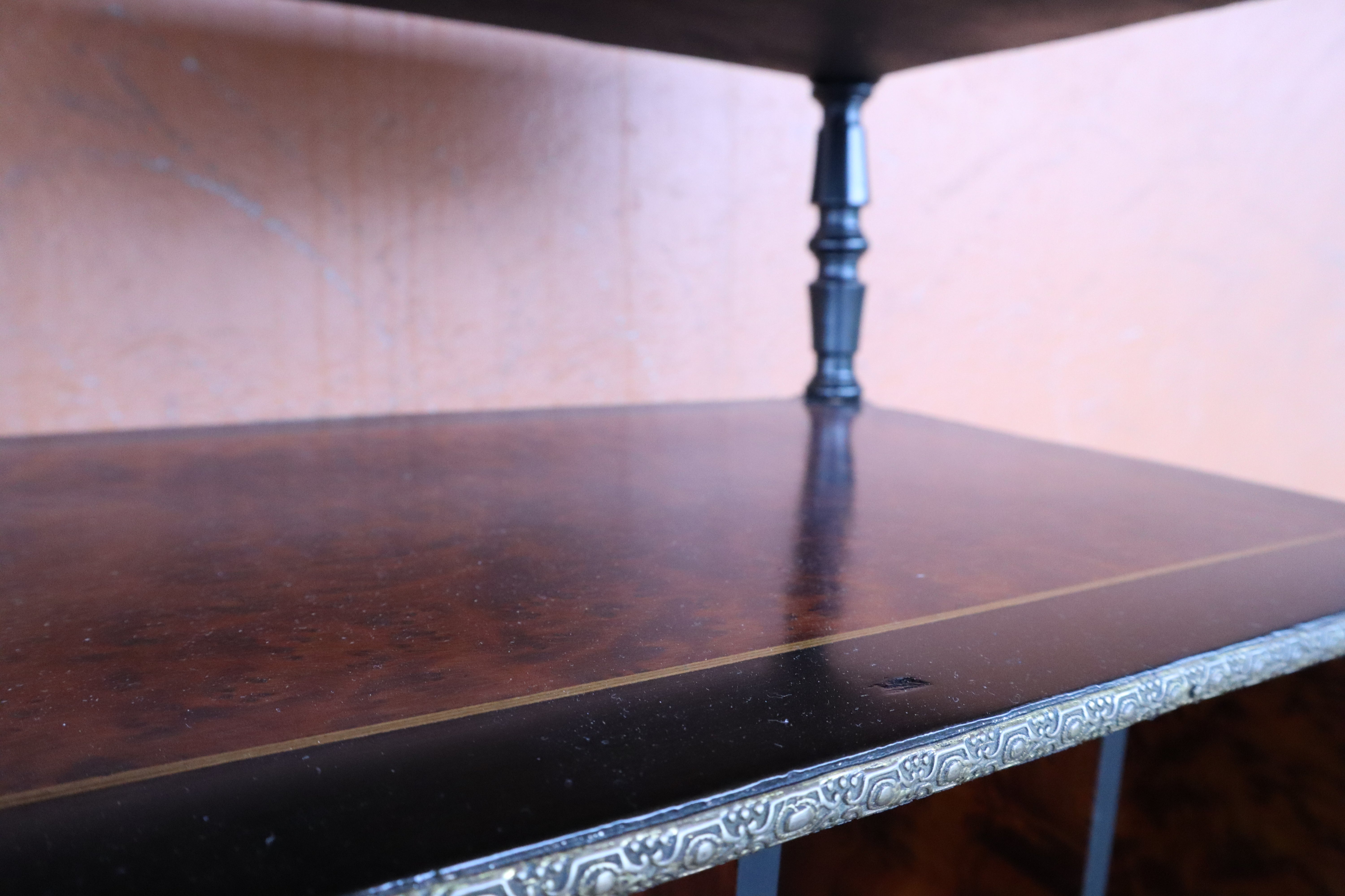 Great condition, some pulling on the metal edging. Small dent on the second shelf near the edge.