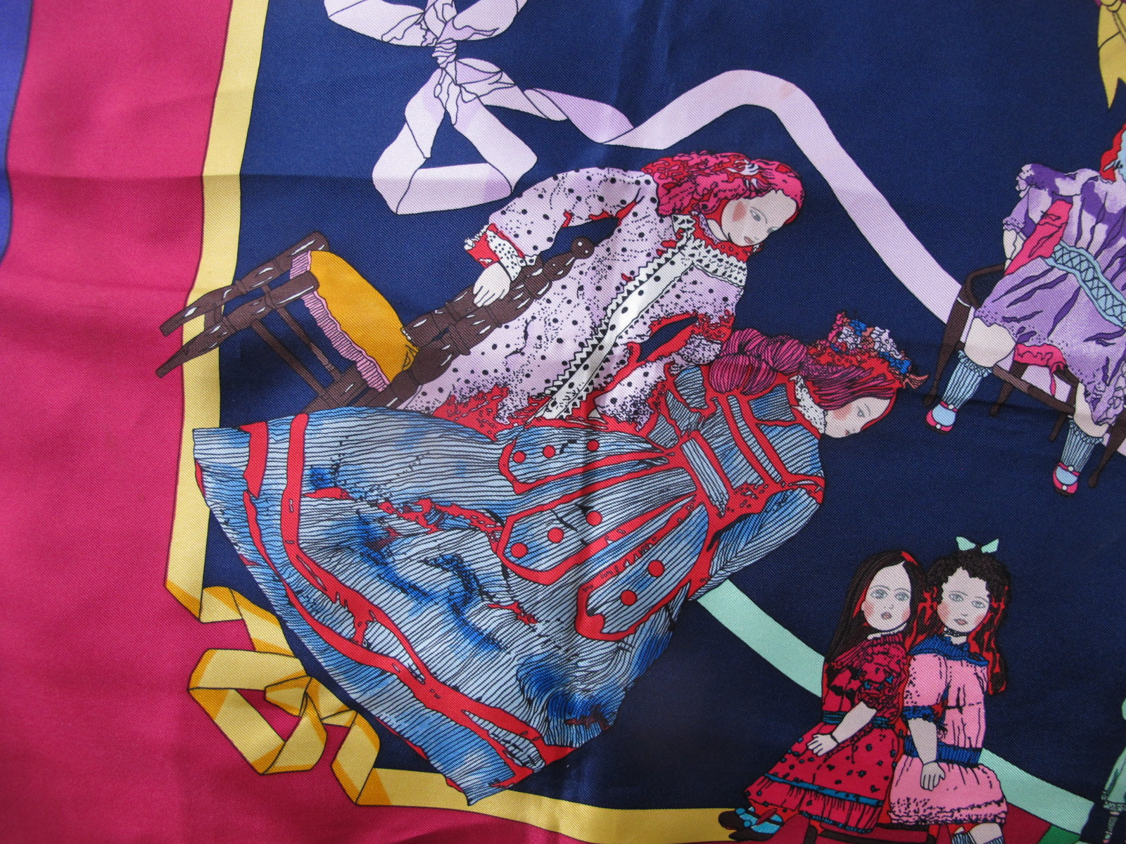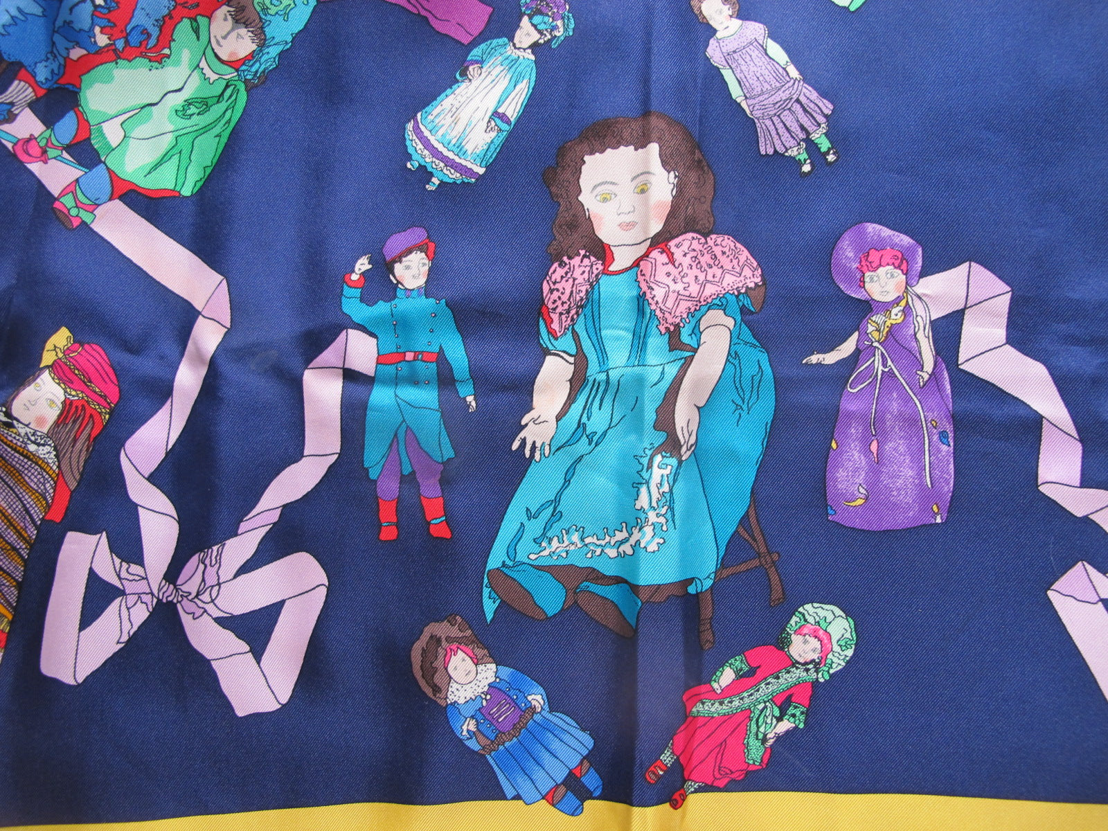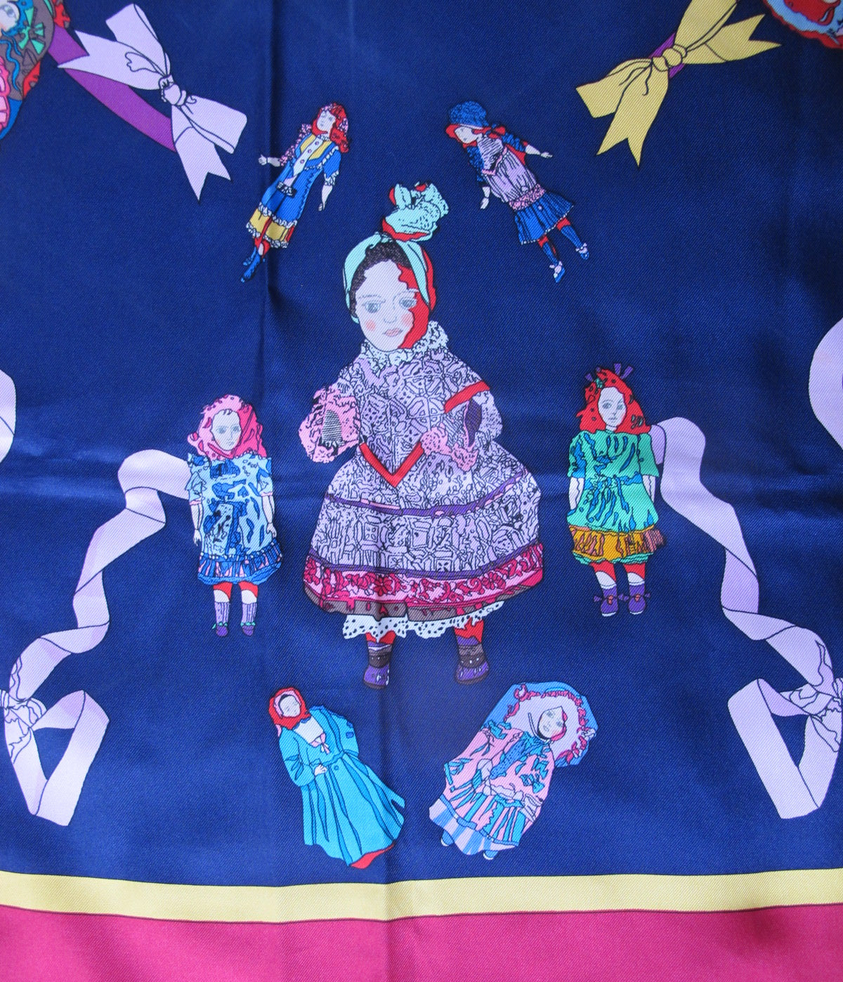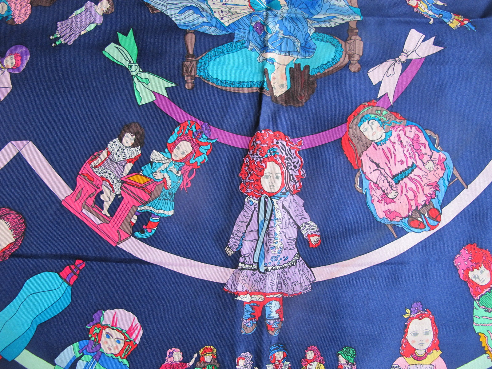 HERMES France Carre 90 HELLO DOLLY Loic Dubigeon Creepy DOLLS Navy Silk Scarf