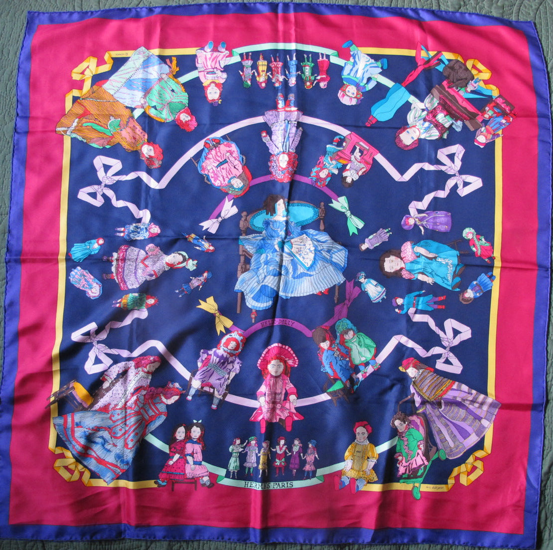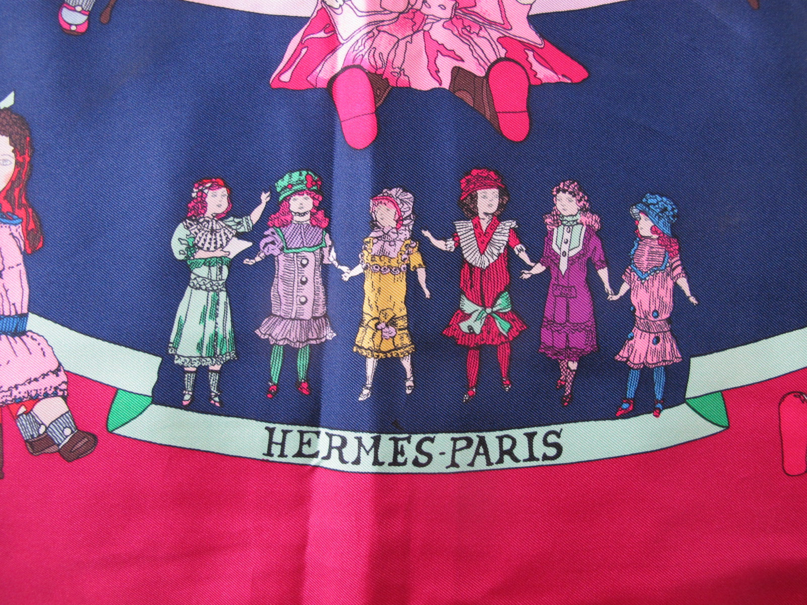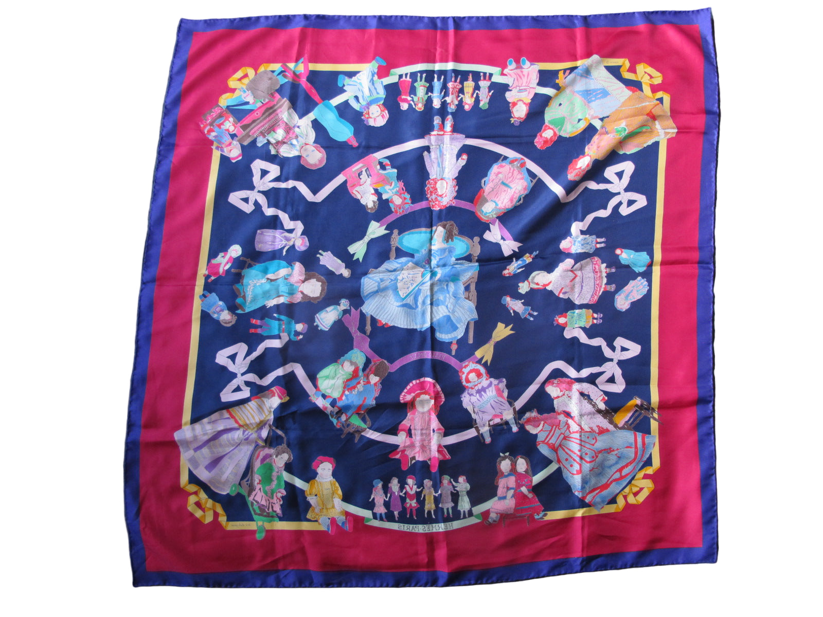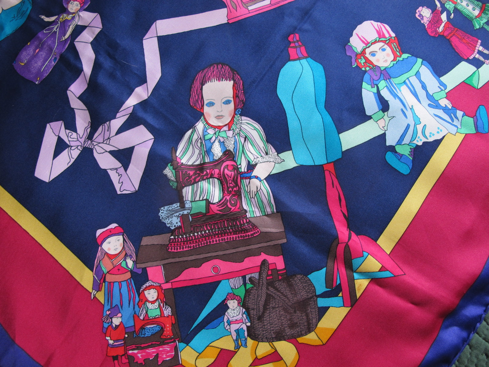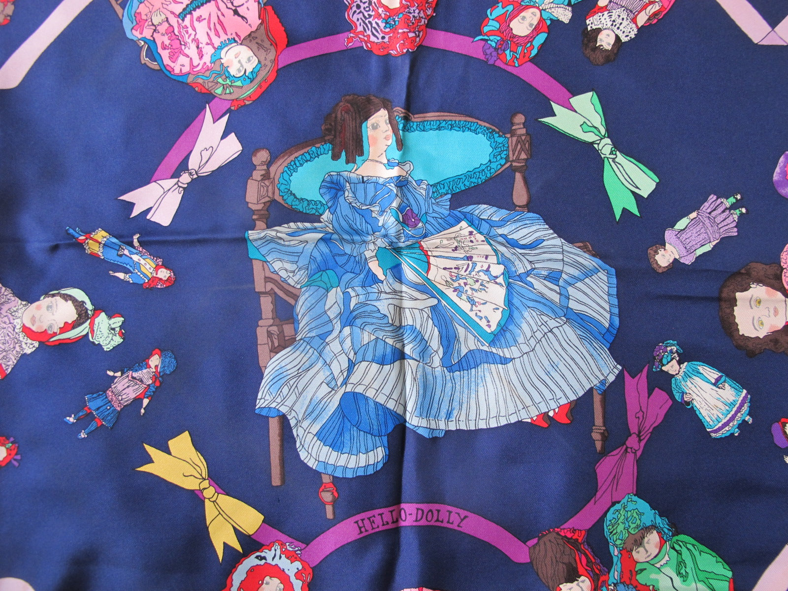 HERMES France Carre 90 HELLO DOLLY Loic Dubigeon Creepy DOLLS Navy Silk Scarf