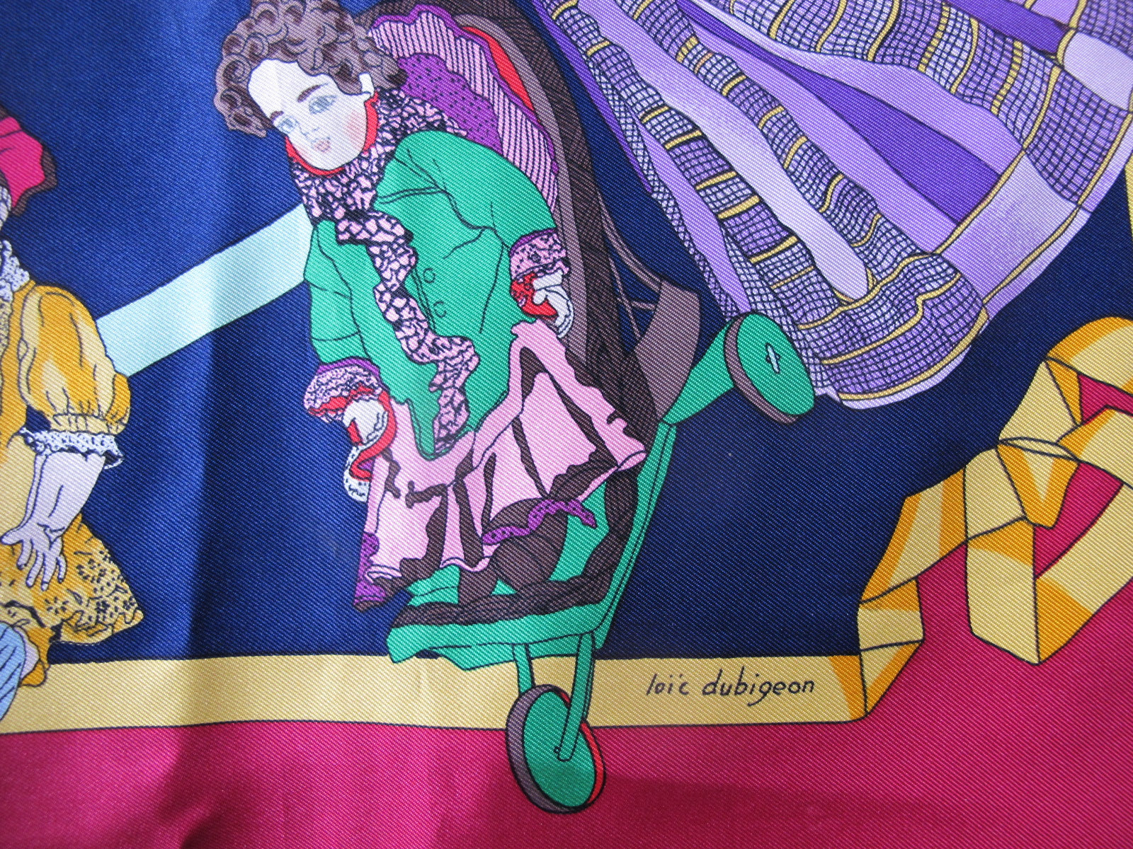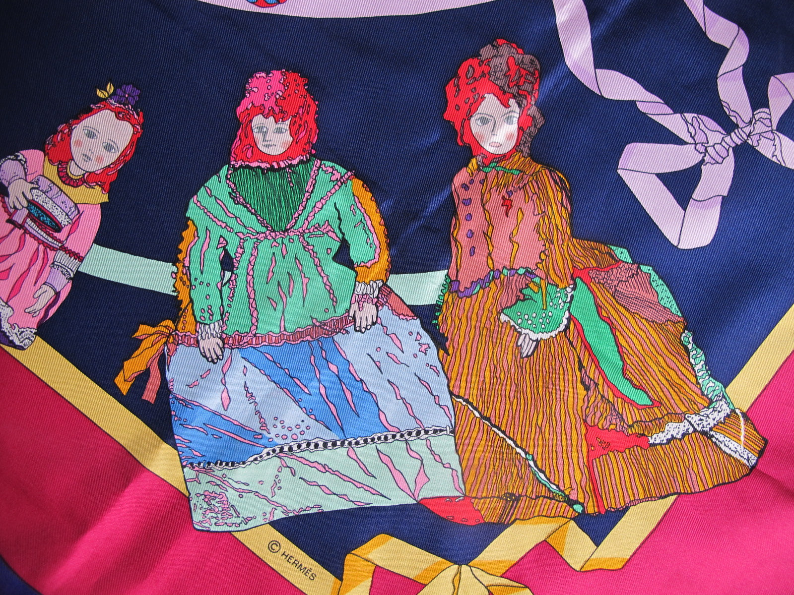 Vintage Hermes France Carre 90 graphic designer scarf, 'Hello Dolly'. Designed by Loic Dubigeon in the 1990's. Signature printed in scarf. This is quite the scarf for Hermes! Bright bold colors and incredibly creepy cool print.