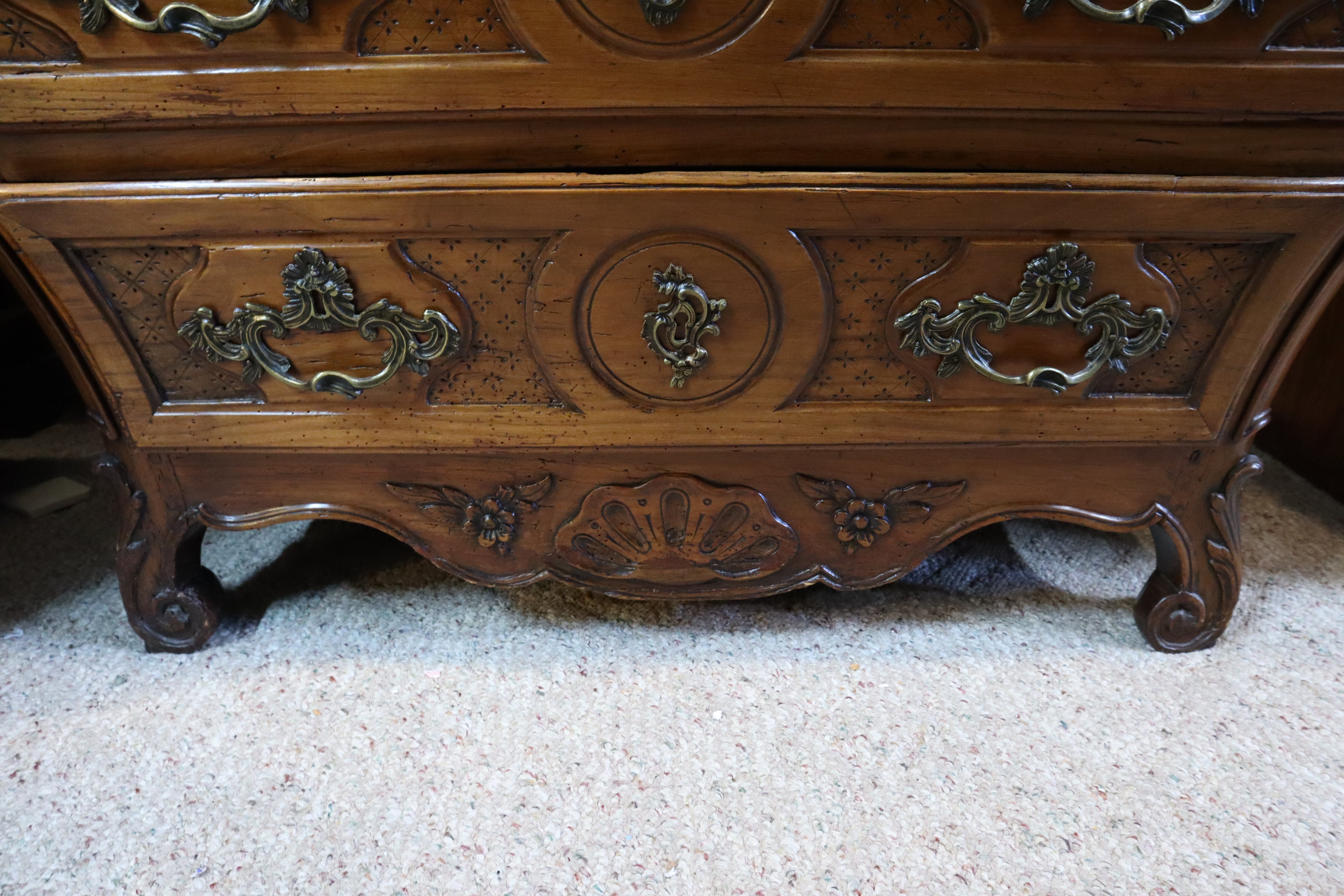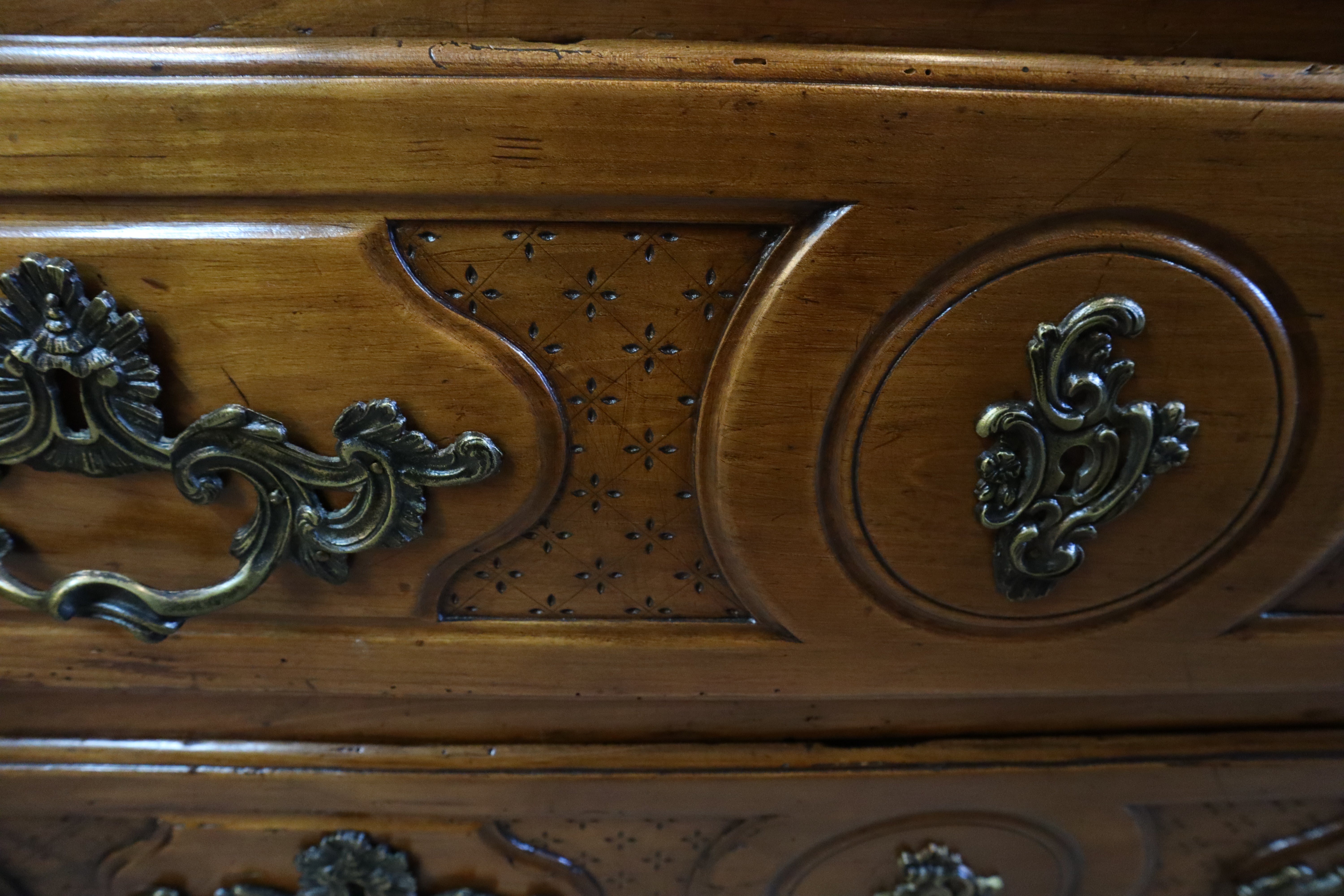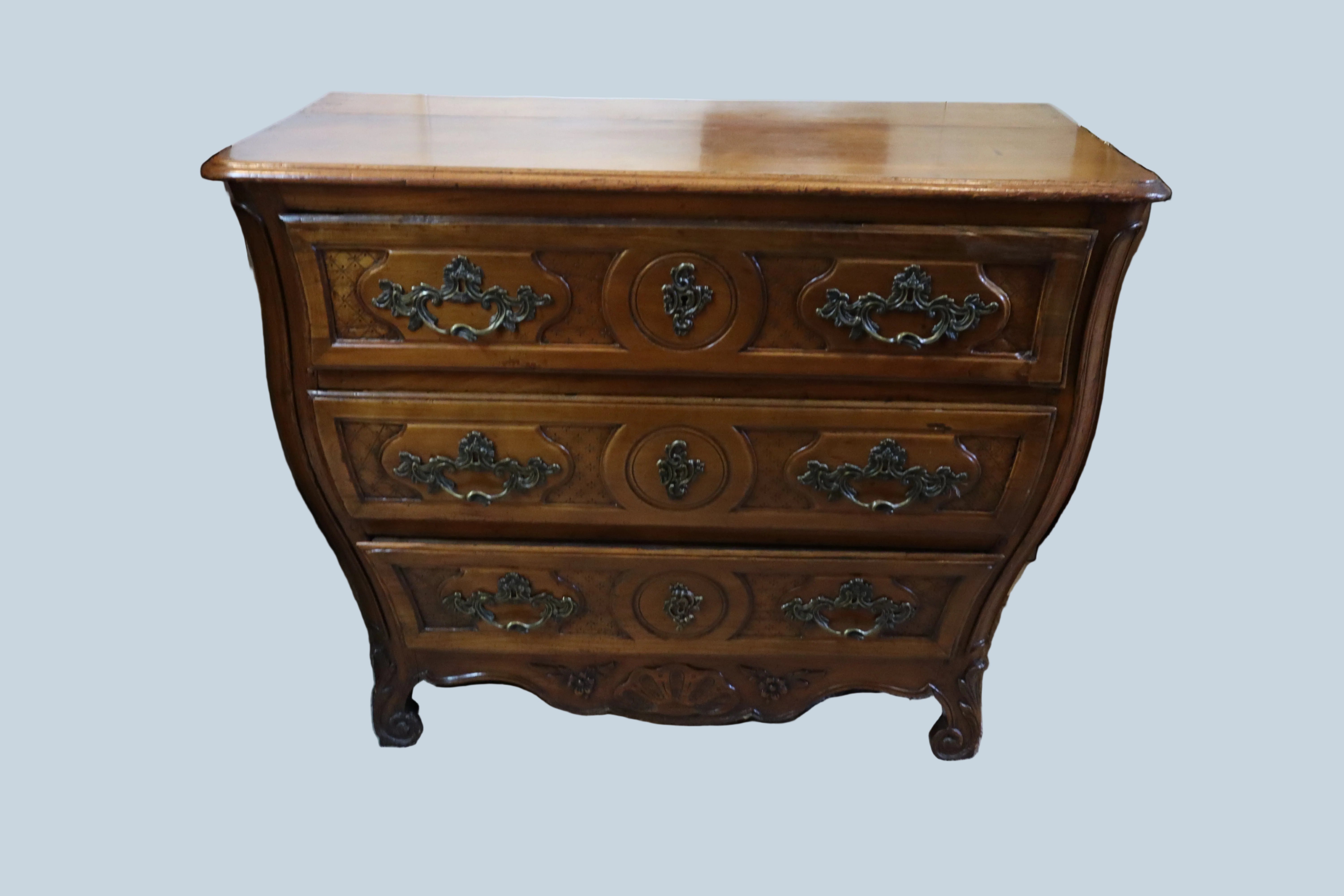 Charming and stunning three-drawer bombe commode constructed out of walnut wood. This dresser is adorned with intricately detailed Rococo style metal hardware, including the original and fabulous floral motived handles. There are three drawers, all spanning the entire width of the dresser. They descend slightly in length as the dresser is bigger at the top than it is at the bottom. The bottom of the raised dresser is adorned with a carved apron on cabriole legs with scroll feet.