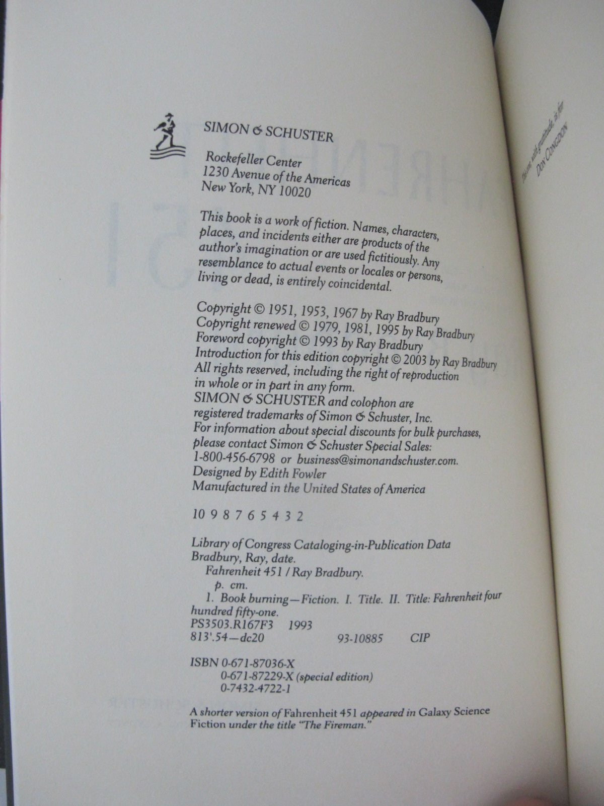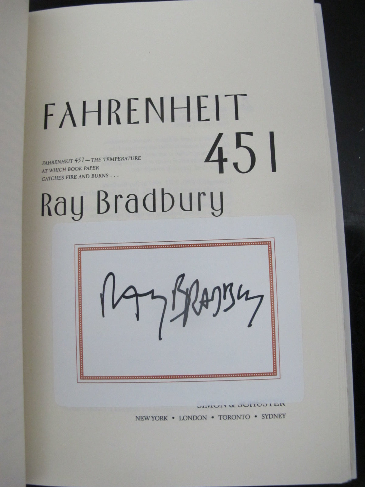 Ray Bradbury's 'Fahrenheit 451, Simon & Schuster 50th Anniversary, Classic Edition, 2003. Hand signed by author on sticker attached to inner page. Hard cover with dust jacket.