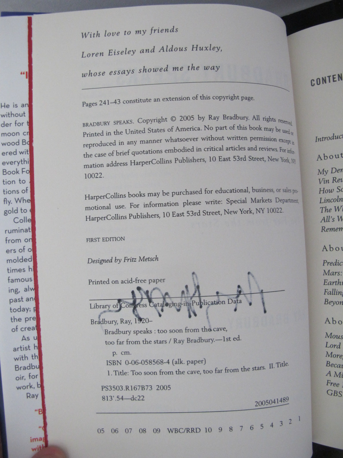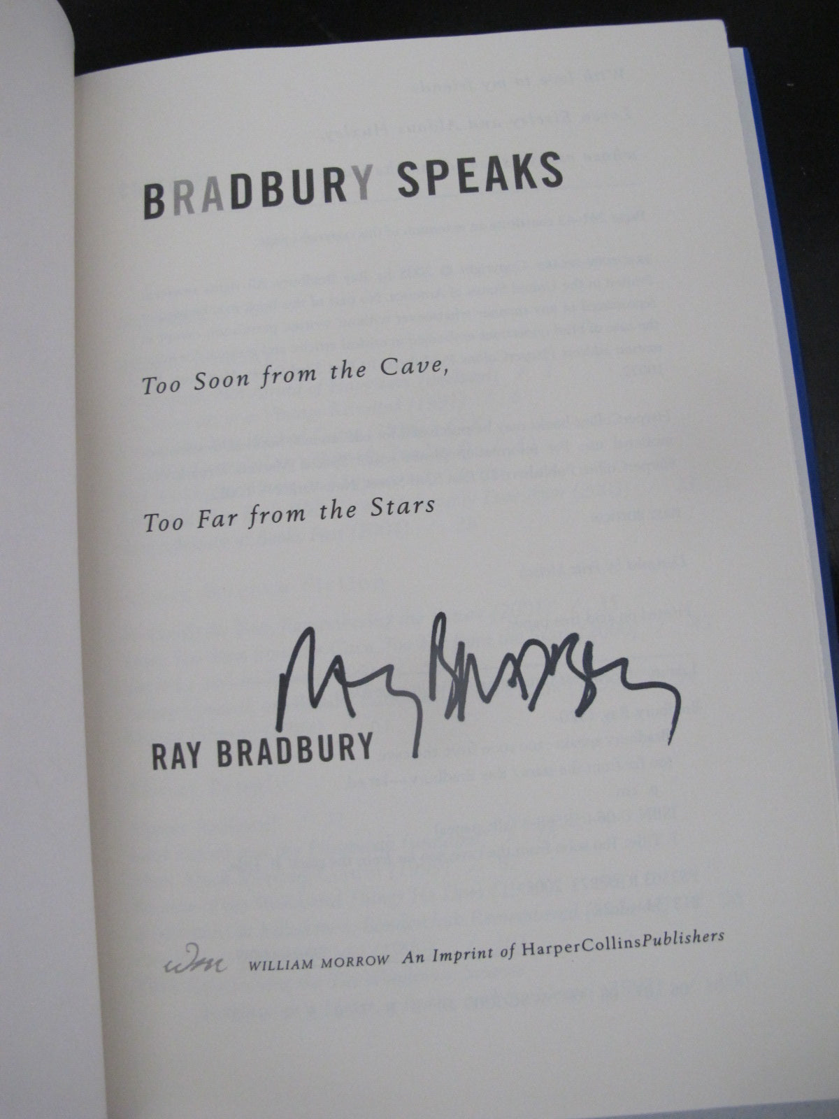 Ray Bradbury, "Bradbury Speaks: Too Soon From the Cave, Too Far From the Stars, Essays on the Past, the Future, and Everything in Between". William Morrow 2005, first edition copy signed by Ray Bradbury inner page. Hardcover with dust jacket