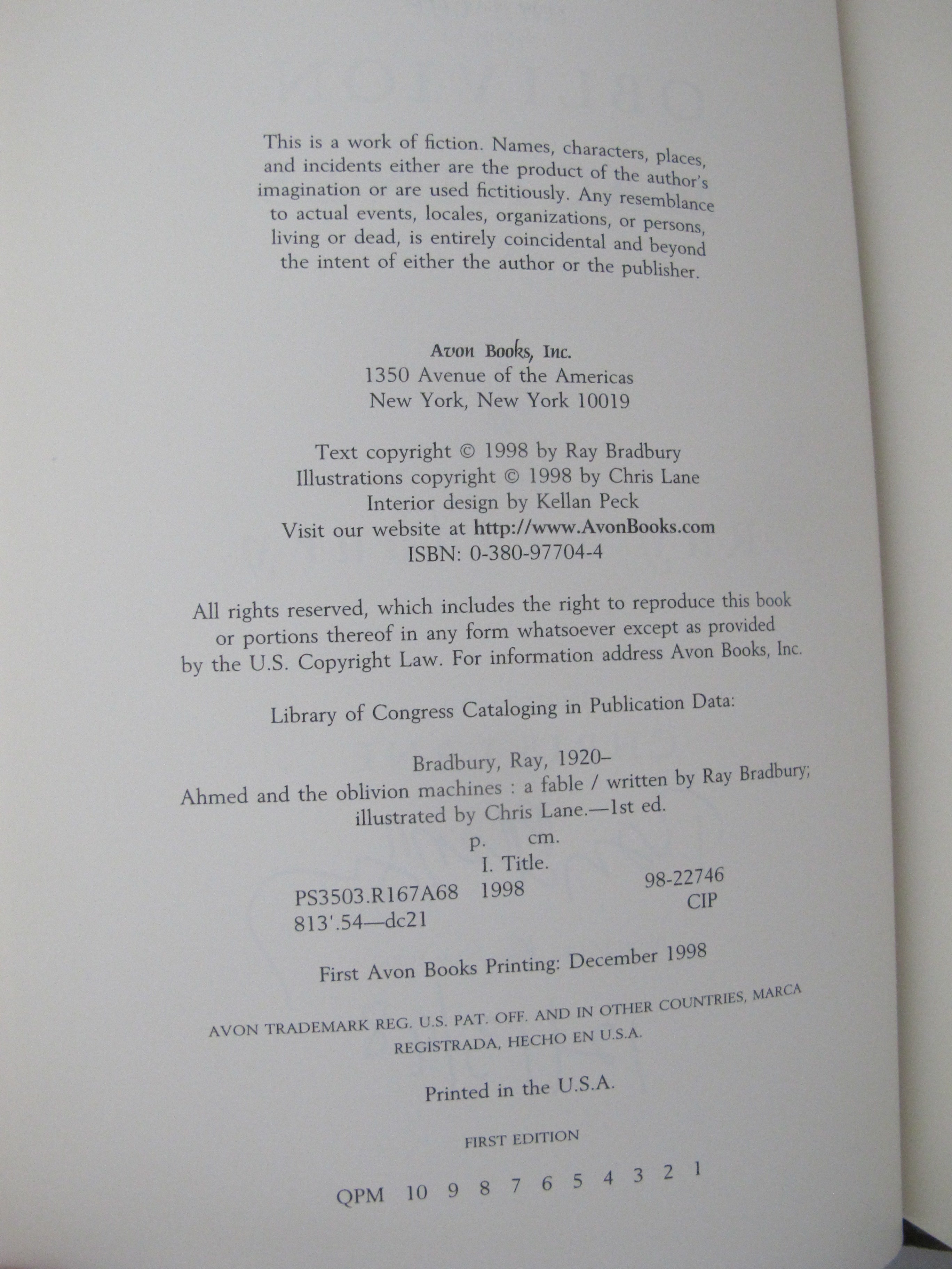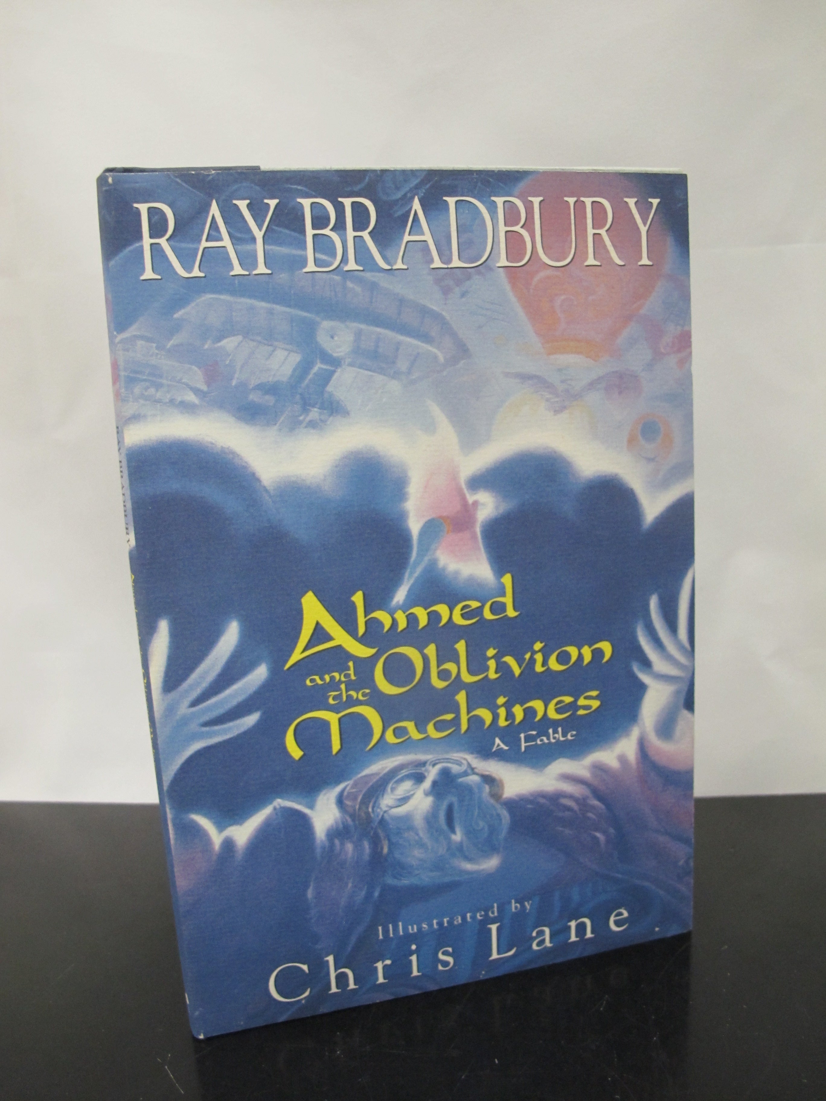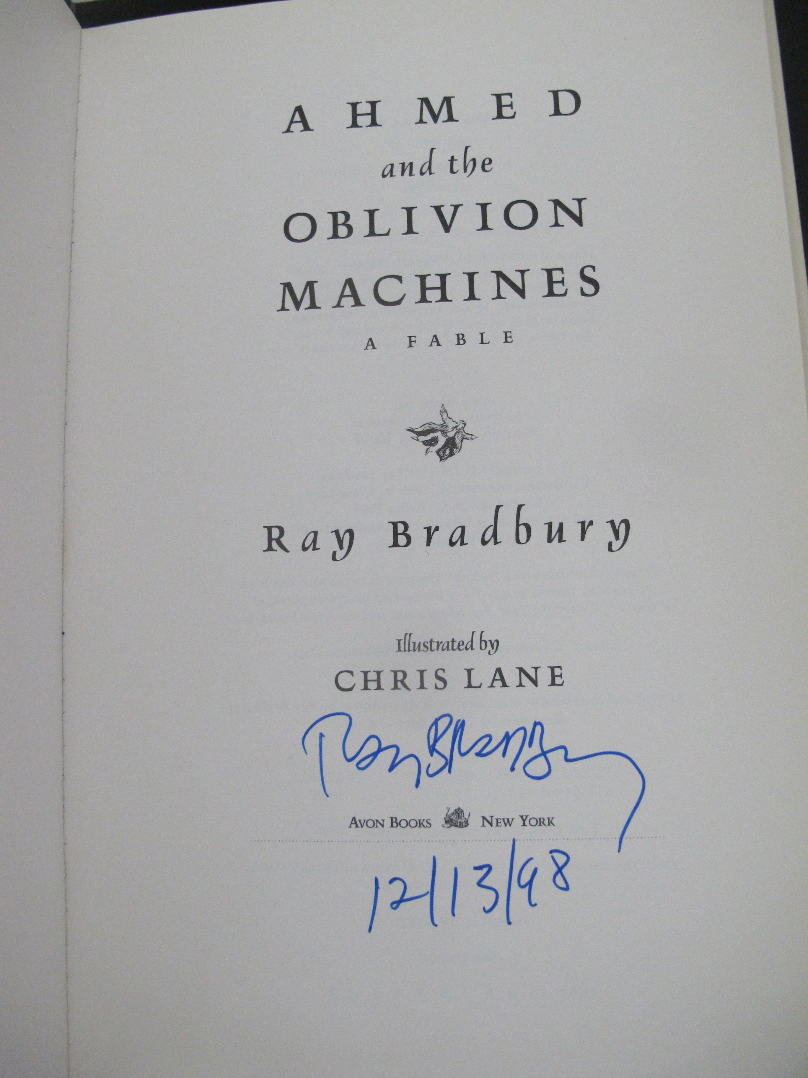 Ray Bradbury, "Ahmed and the Oblivion Machines, a Fable", illustrated by Chris Lane. This is the Avon Books 1998 first edition copy, signed by Ray Bradbury and dated 12/13/98 inner page. Hardcover with dust jacket