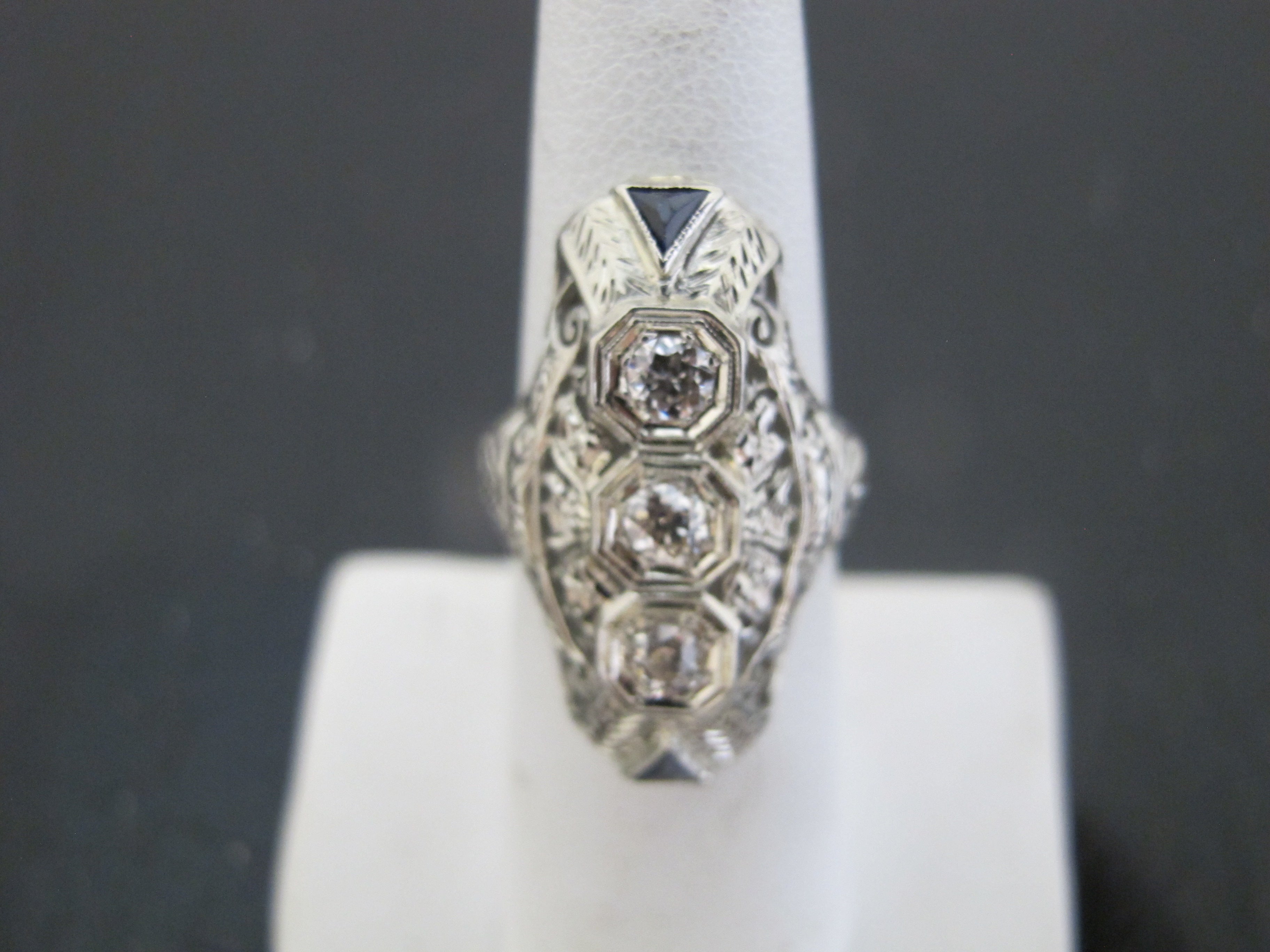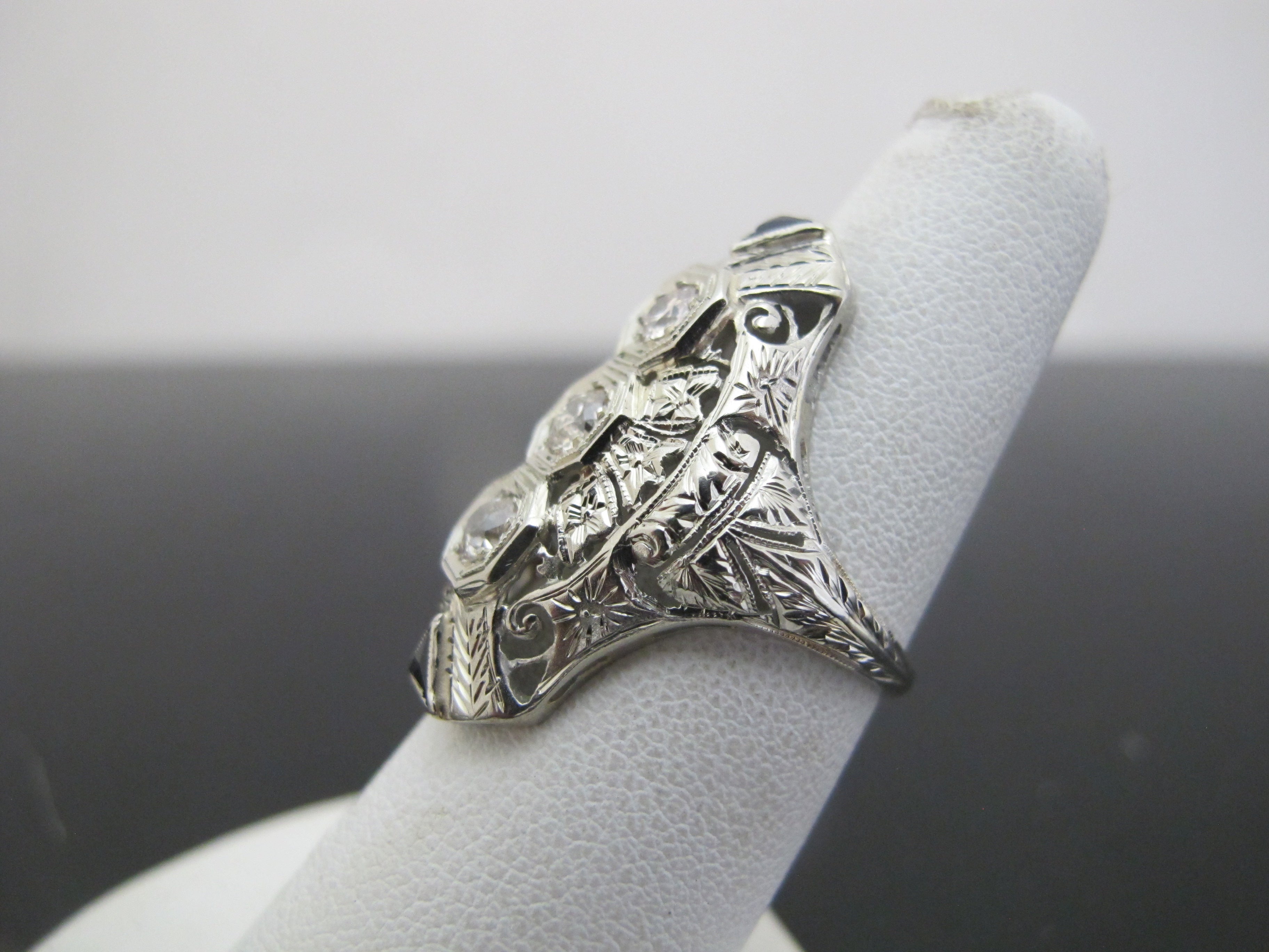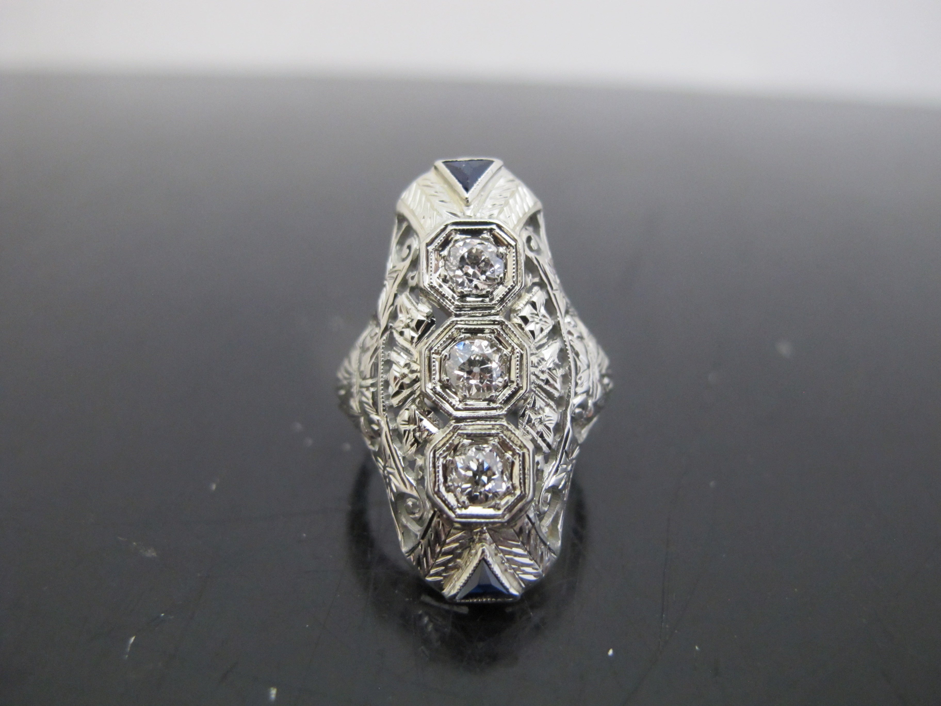 One vintage 18karat white gold diamond ring accented with 3 small Old European cut diamonds and 2 triangular cut lab grown sapphires. The Art Deco styled ring is pierced out with millgrain and engraved foliate detail. The 3 diamonds are bead set in octagonal heads and the sapphires are channel set. The mounting measures 28.09mm in length and the ring's shank tapers to 1.64mm in width at the base of the mounting. The inside of shank is stamped with the gold fineness, "18k" and a unidentified maker's mark. The ring tested to 18 karat gold with XRF metal analysis. This ring is cast construction with polished and engraved finish and has a total gem and metal weight of 4.89 grams.
