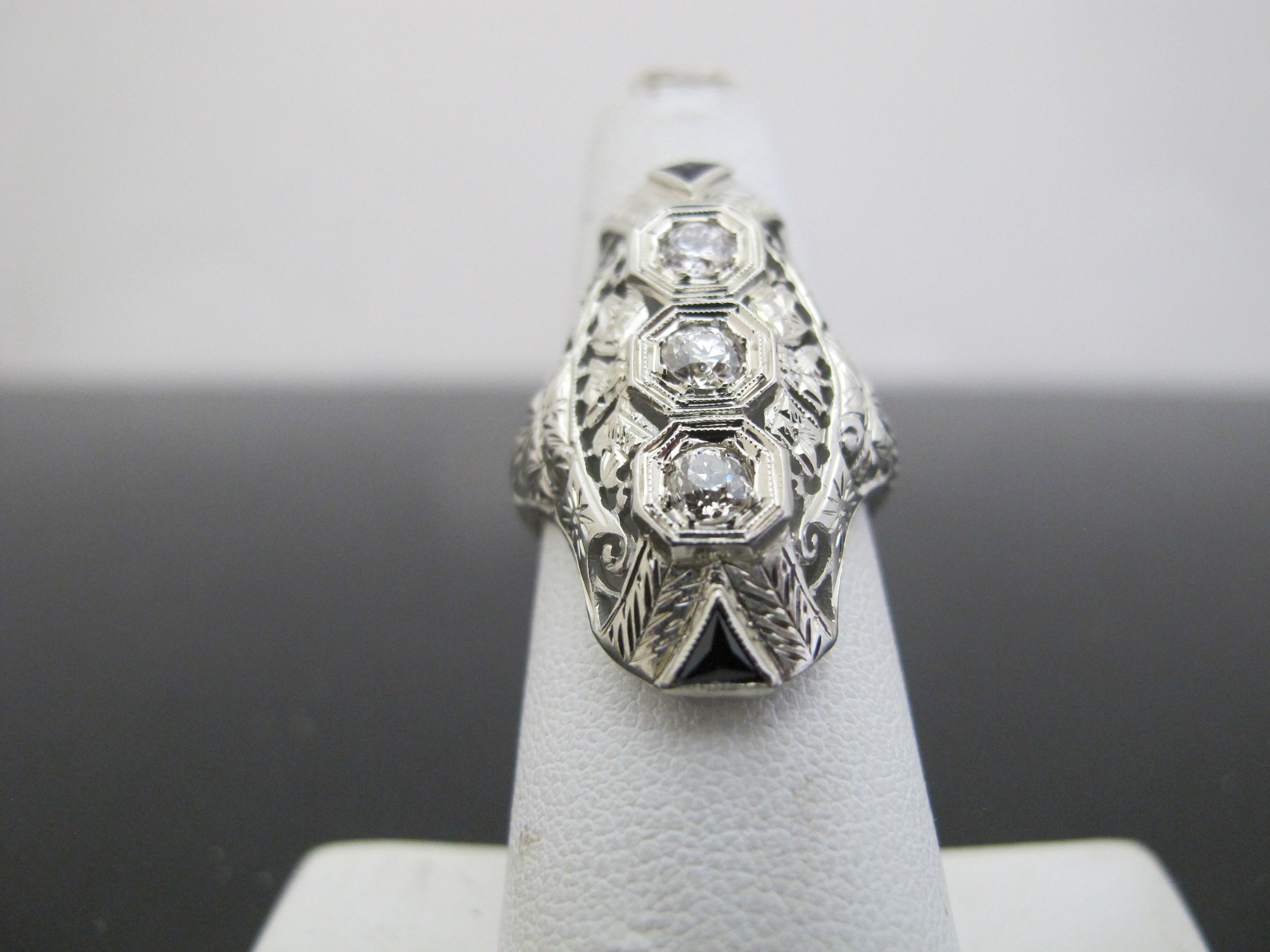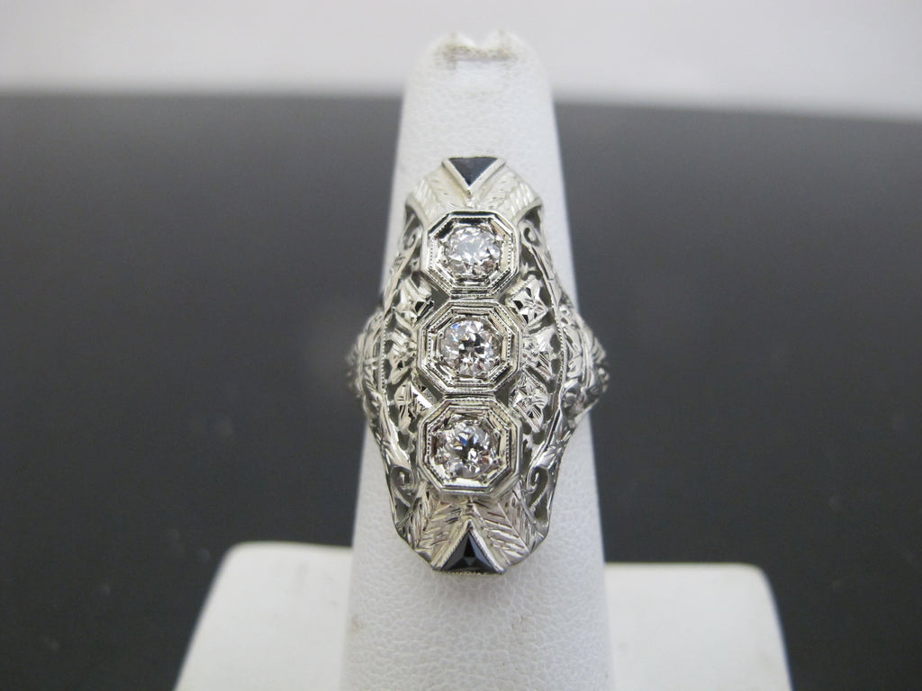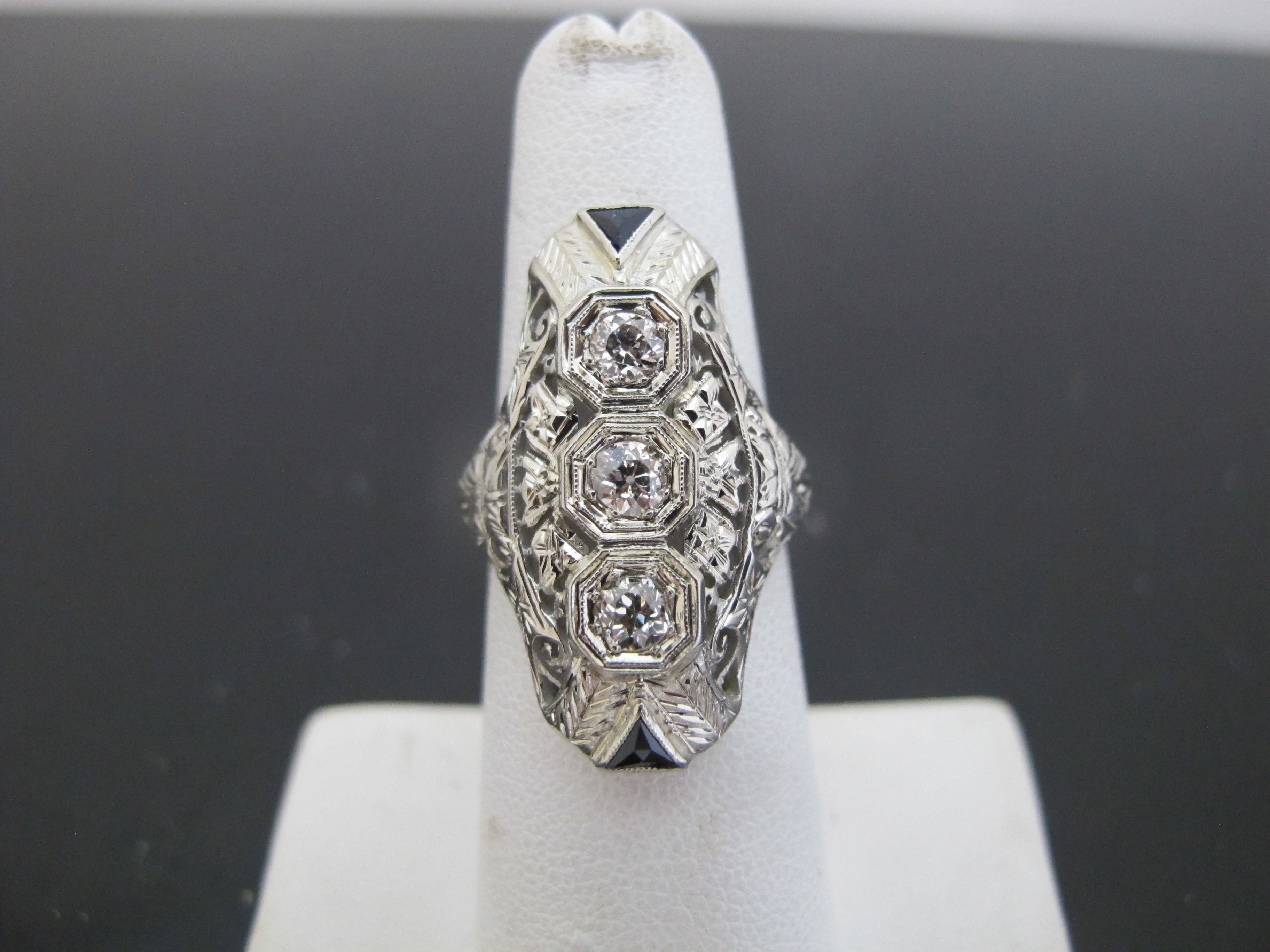 One vintage 18karat white gold diamond ring accented with 3 small Old European cut diamonds and 2 triangular cut lab grown sapphires. The Art Deco styled ring is pierced out with millgrain and engraved foliate detail. The 3 diamonds are bead set in octagonal heads and the sapphires are channel set. The mounting measures 28.09mm in length and the ring's shank tapers to 1.64mm in width at the base of the mounting. The inside of shank is stamped with the gold fineness, "18k" and a unidentified maker's mark. The ring tested to 18 karat gold with XRF metal analysis. This ring is cast construction with polished and engraved finish and has a total gem and metal weight of 4.89 grams.
