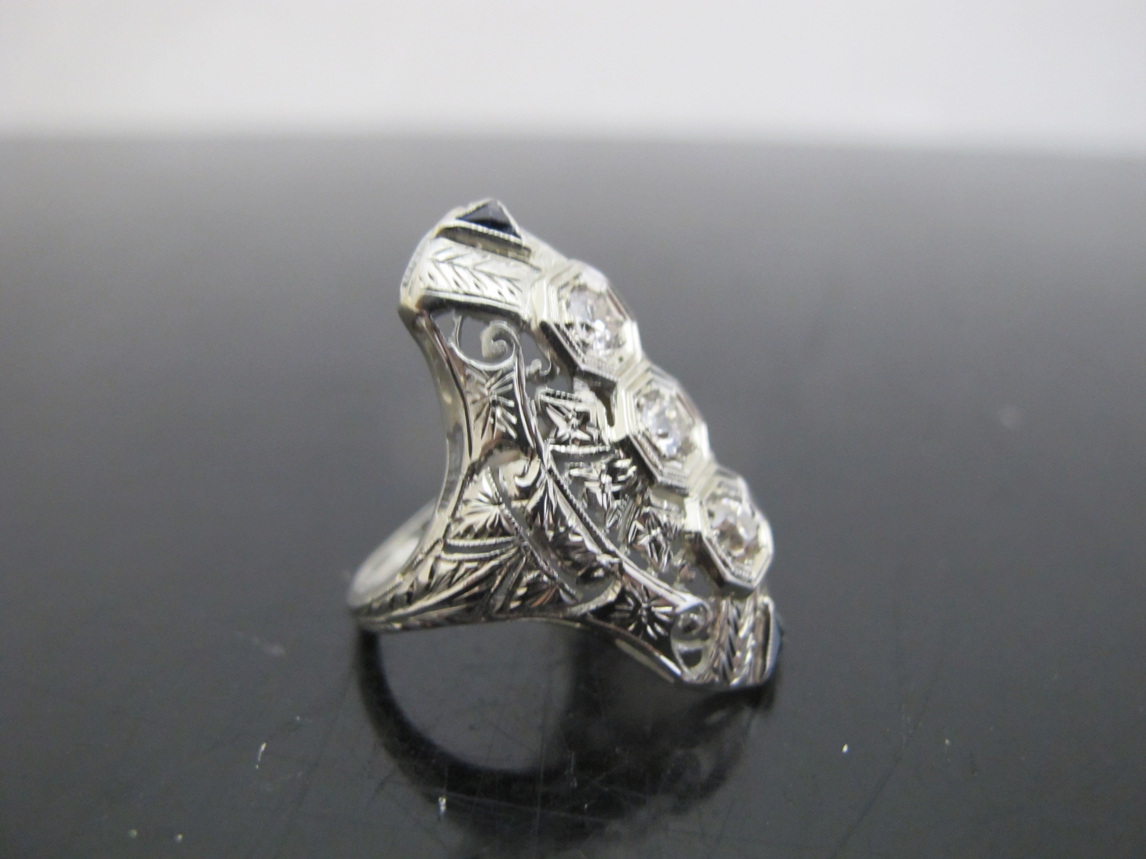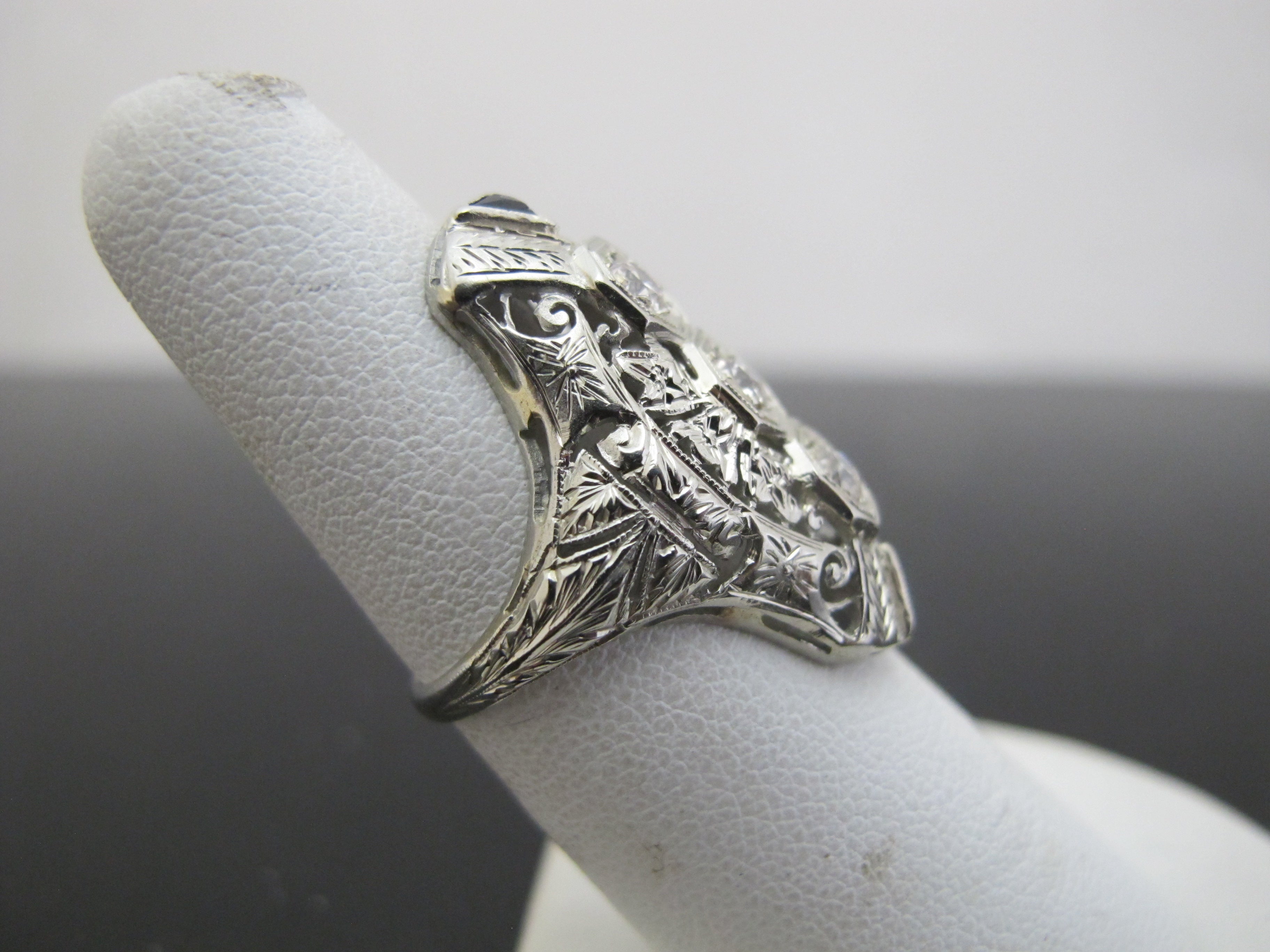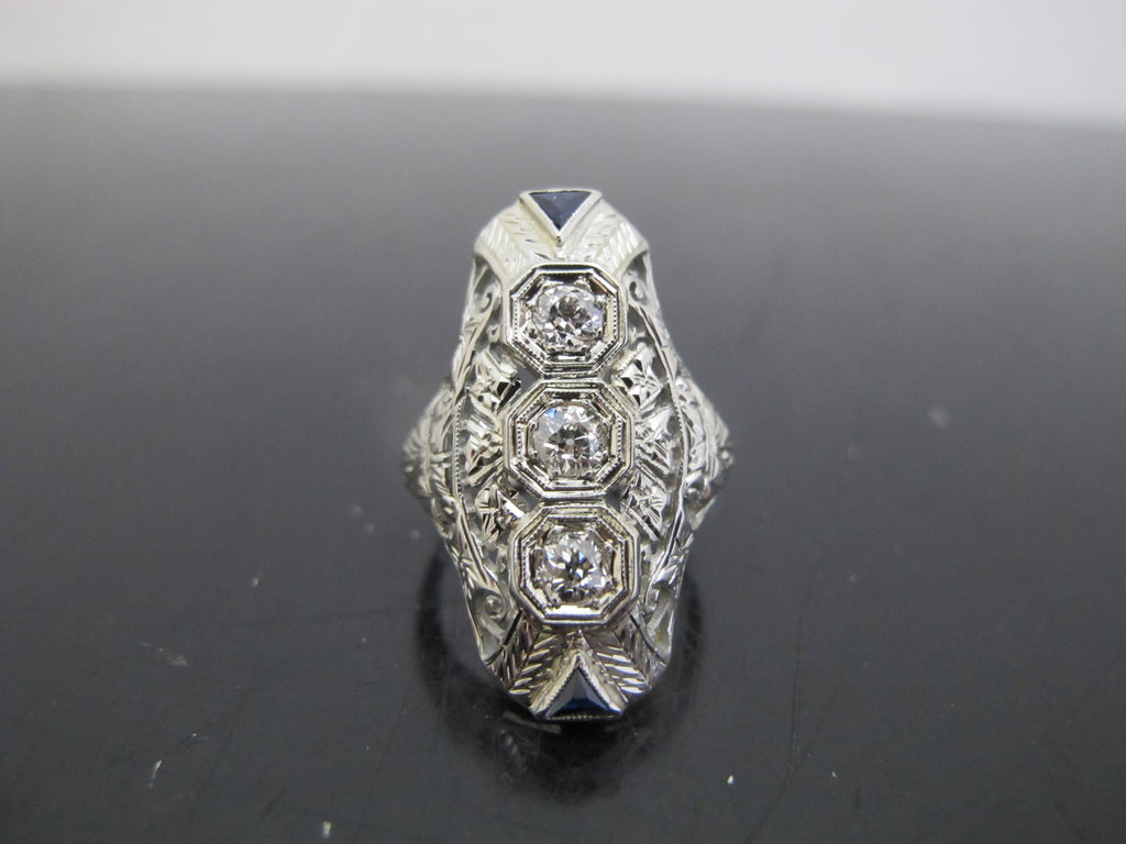 Elegant 18k white gold diamond and sapphire statement ring. Art Deco era and very much of the style showing ornate filigree detail and elongated form.