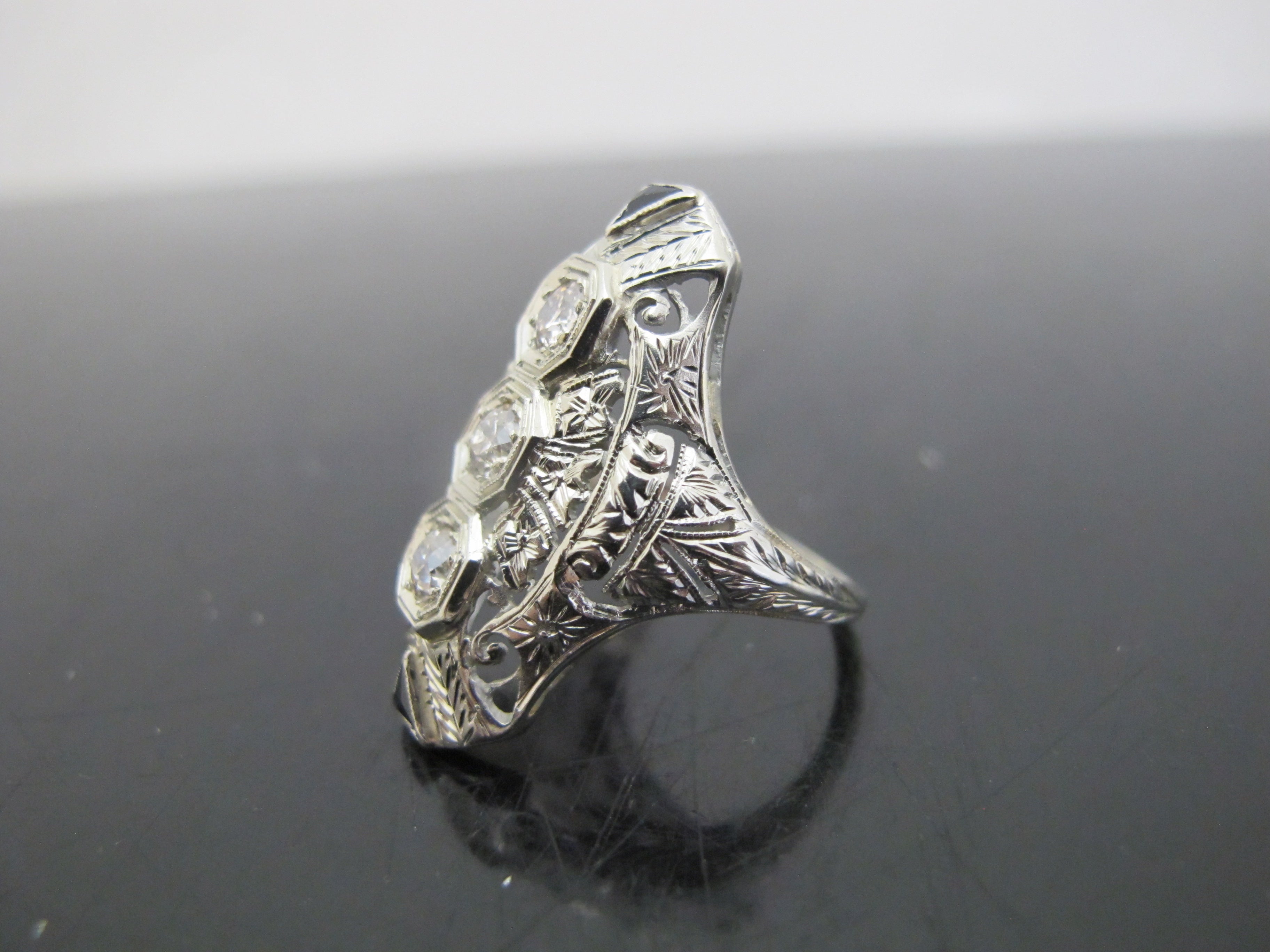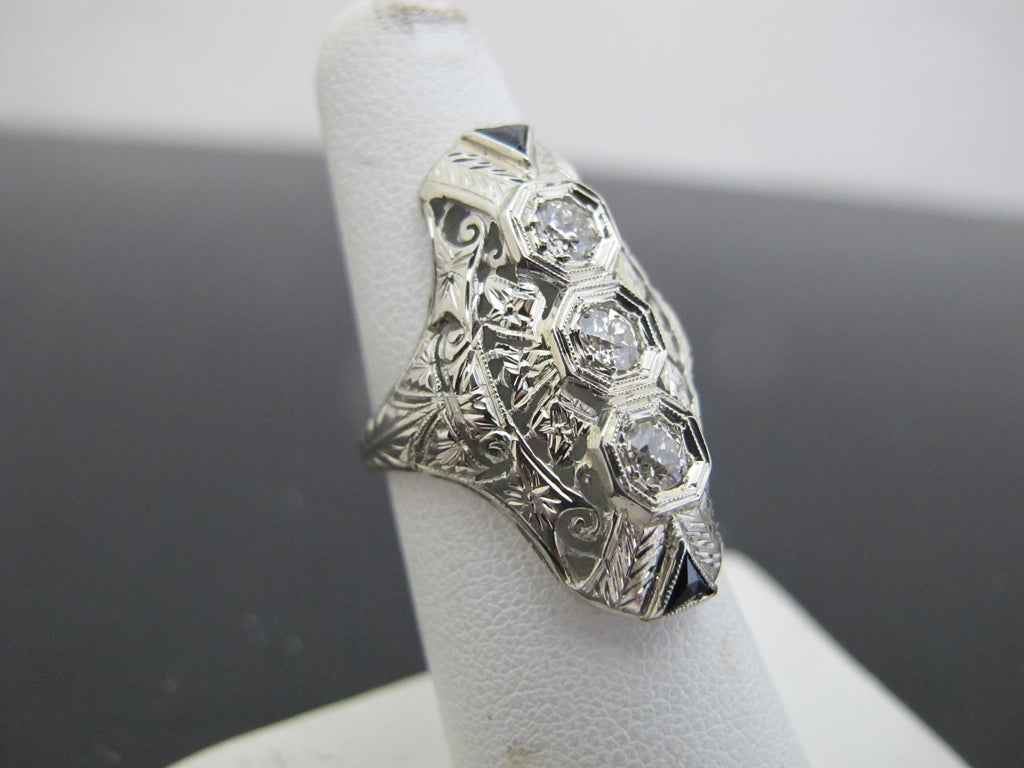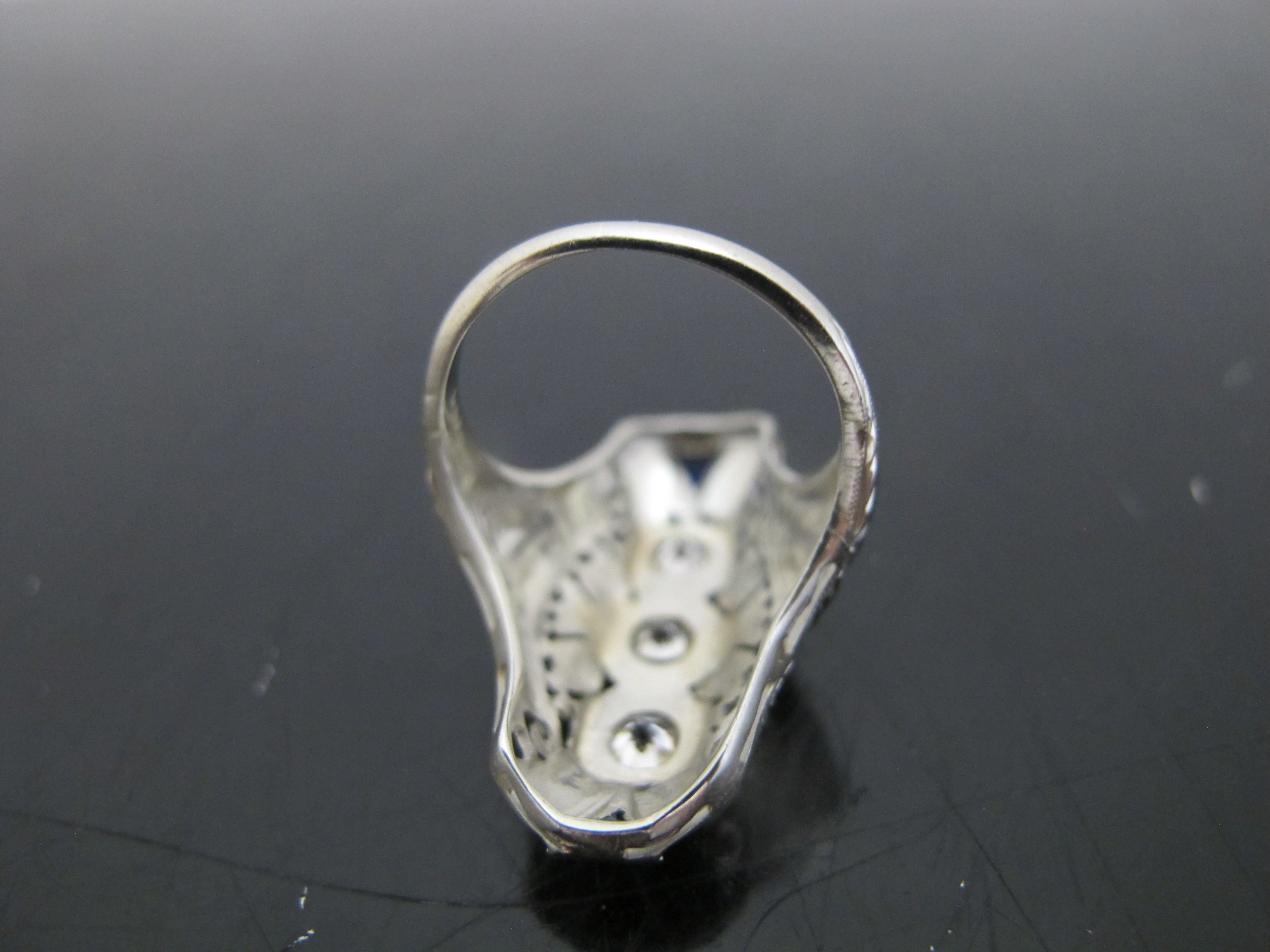 Elegant 18k white gold diamond and sapphire statement ring. Art Deco era and very much of the style showing ornate filigree detail and elongated form.