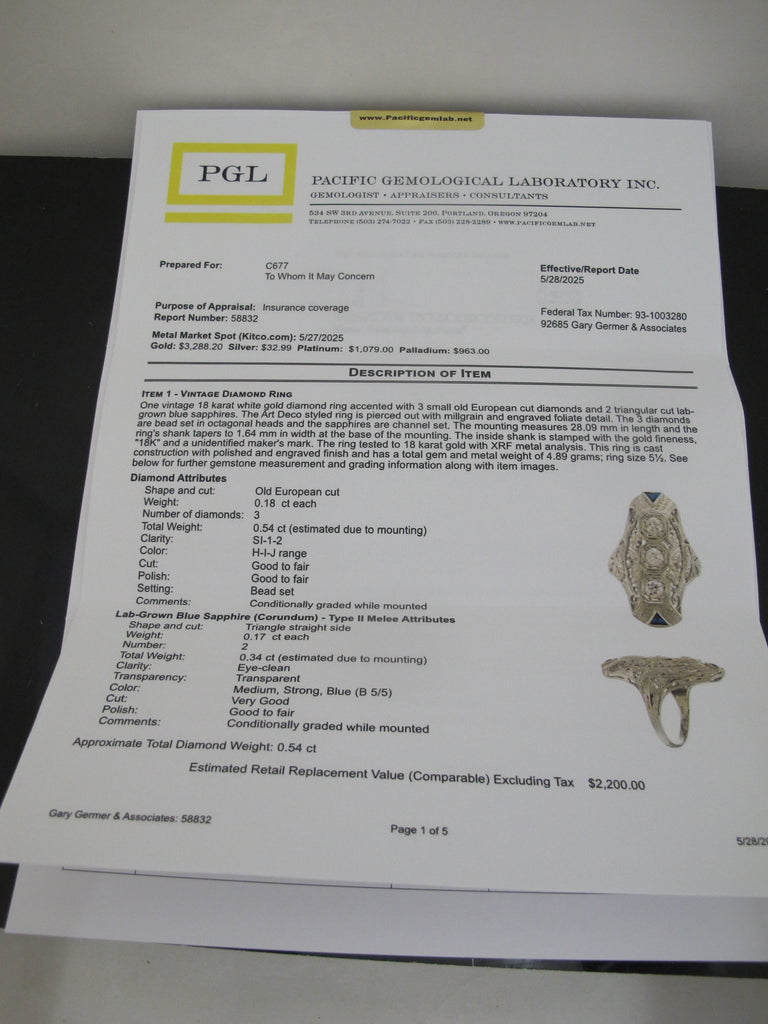 ART DECO 18k White Gold Old European Cut DIAMOND & SAPPHIRE Filigree Ring w/GIA