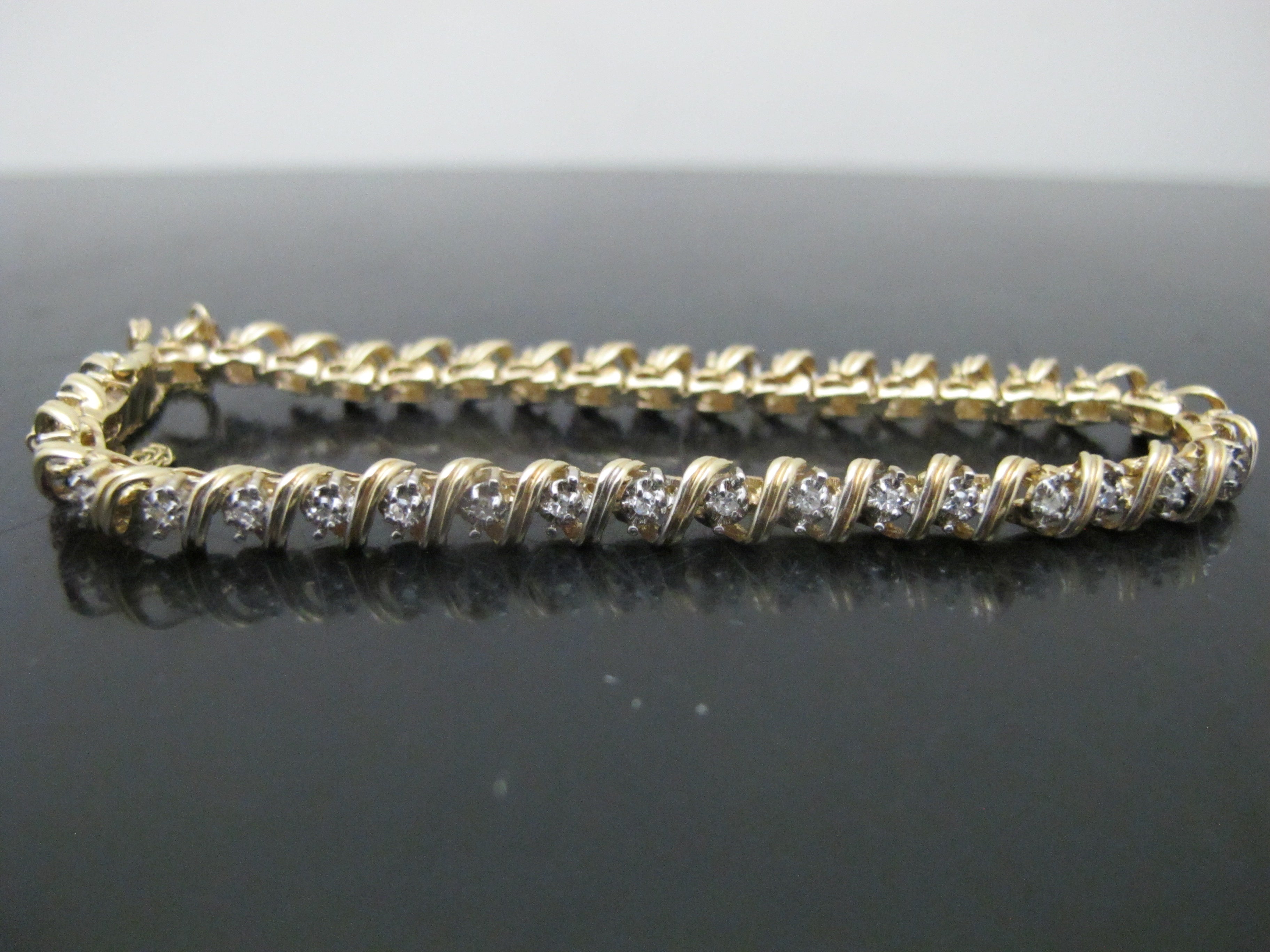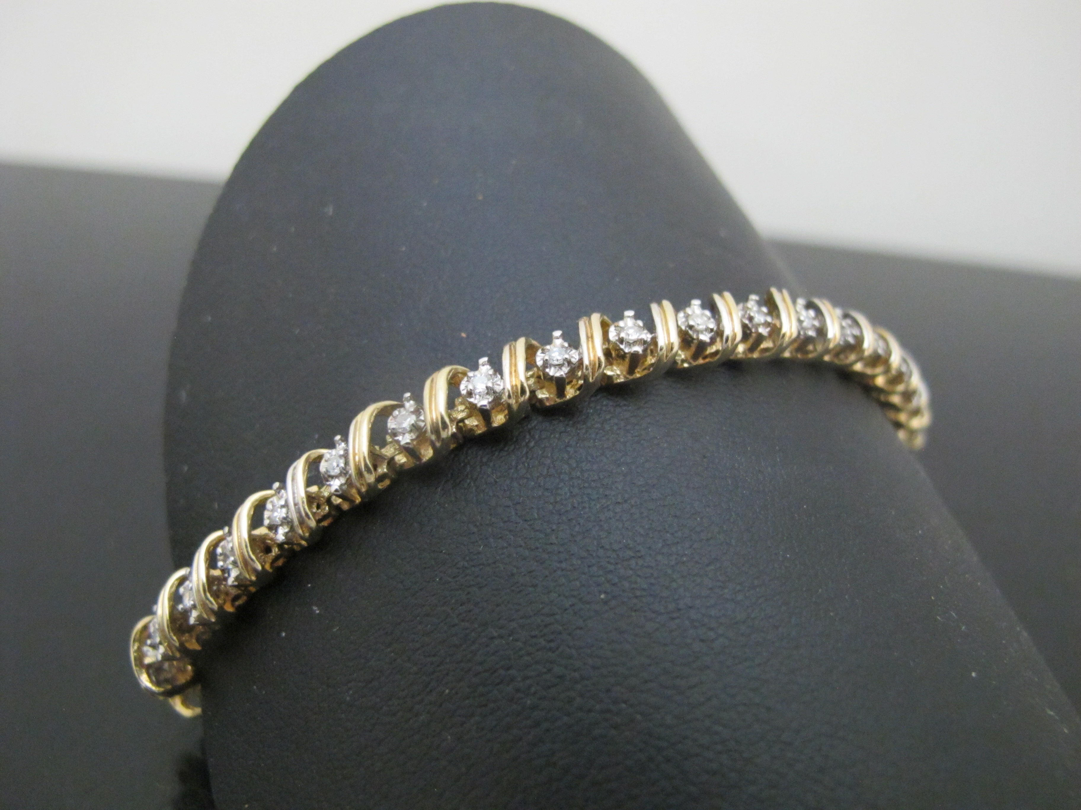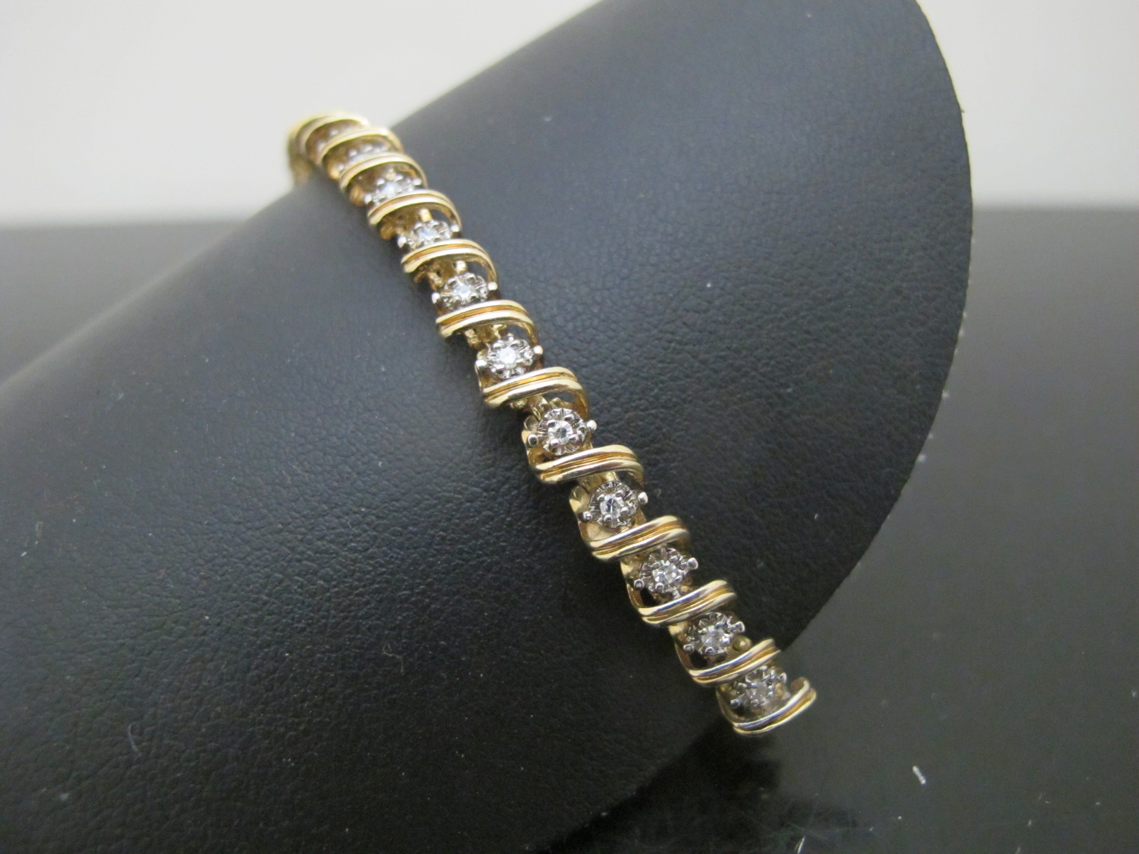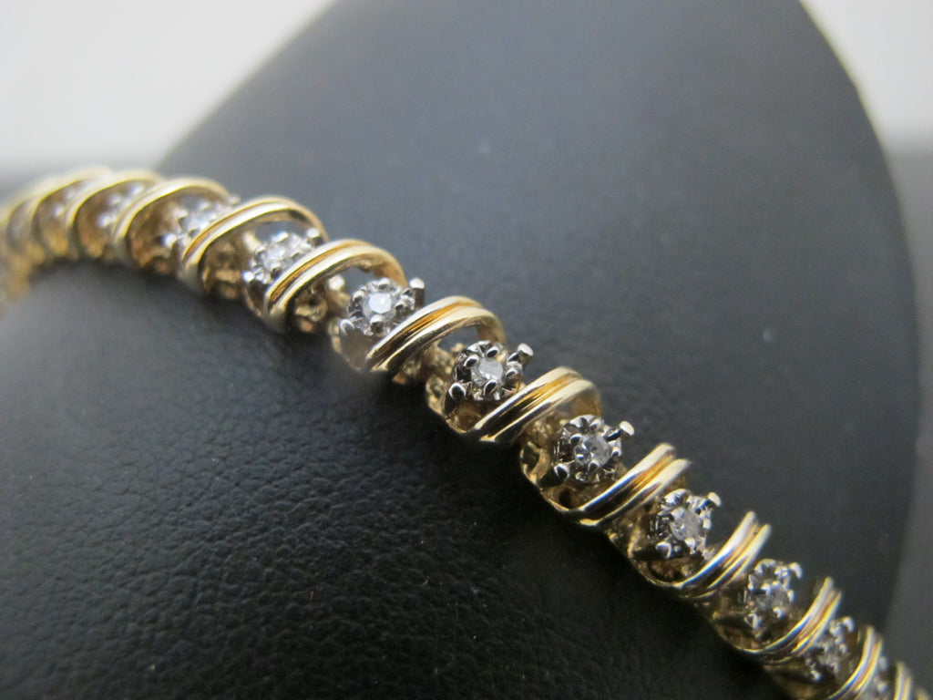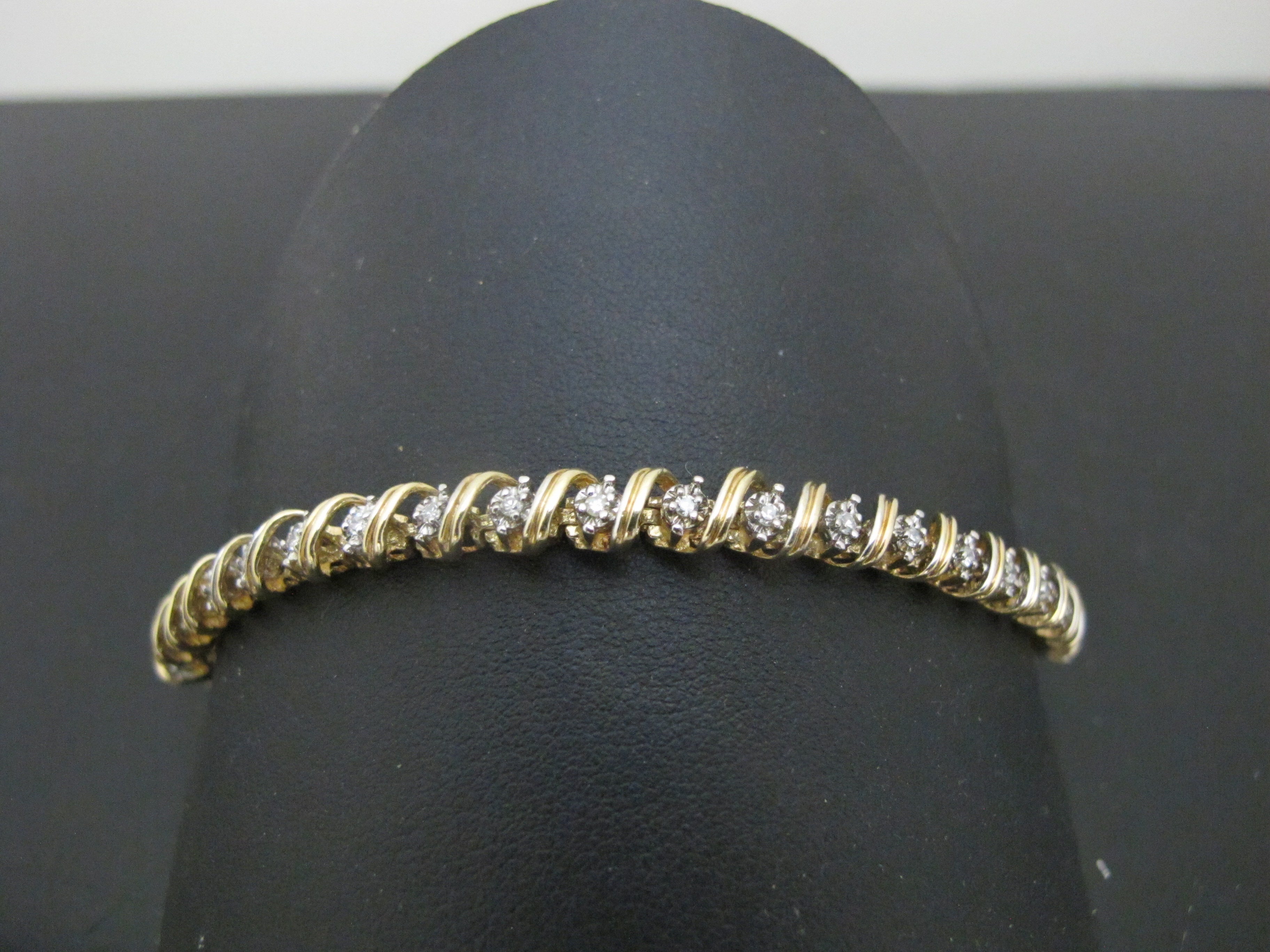 Stunning 10k yellow gold diamond tennis bracelet. A variation of the classic tennis bracelet, this style is a "S-link" or "swirl link," featuring a continuous line of diamonds set within interconnected S-shaped or spiral-shaped gold links.