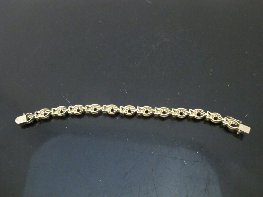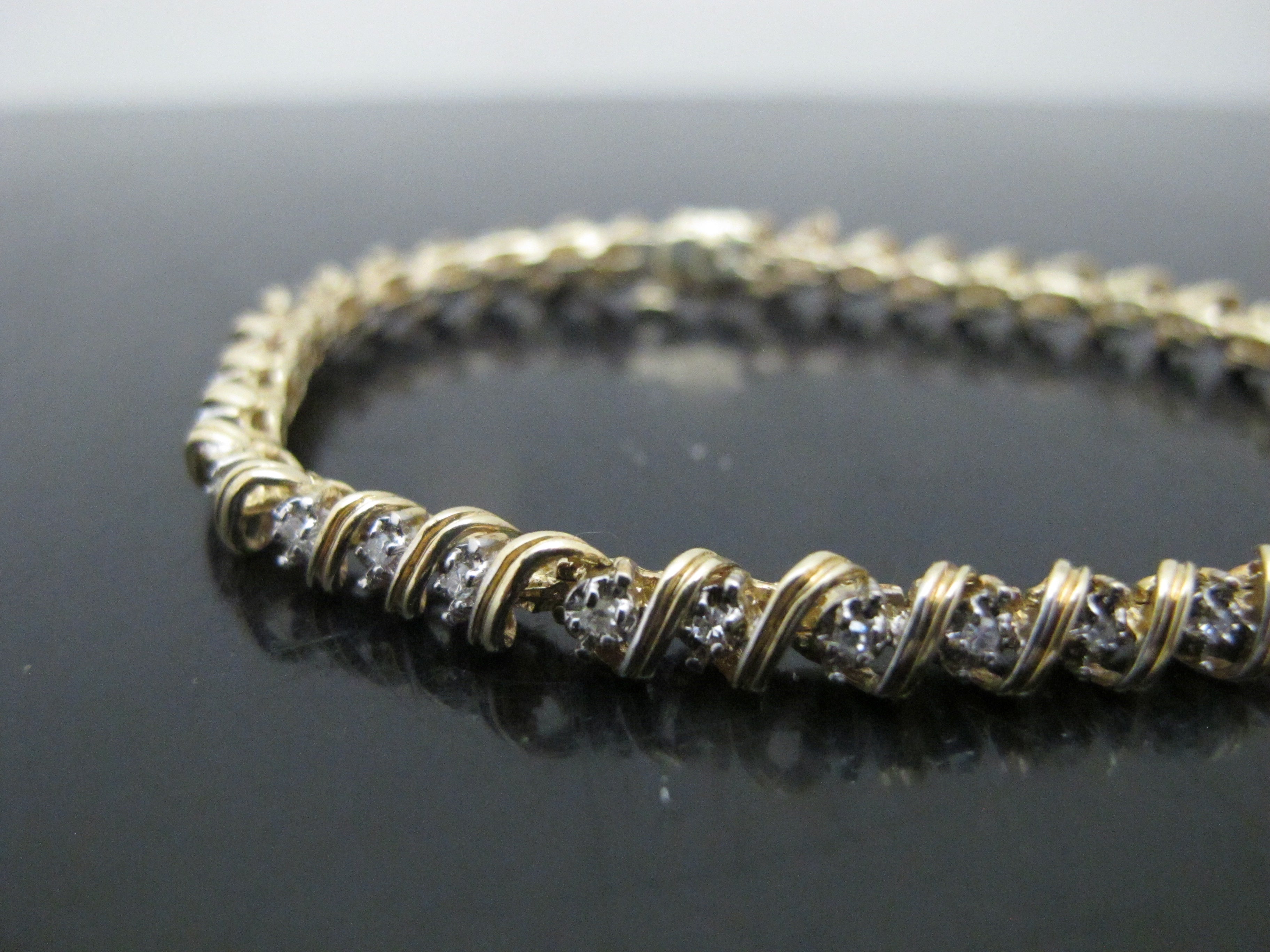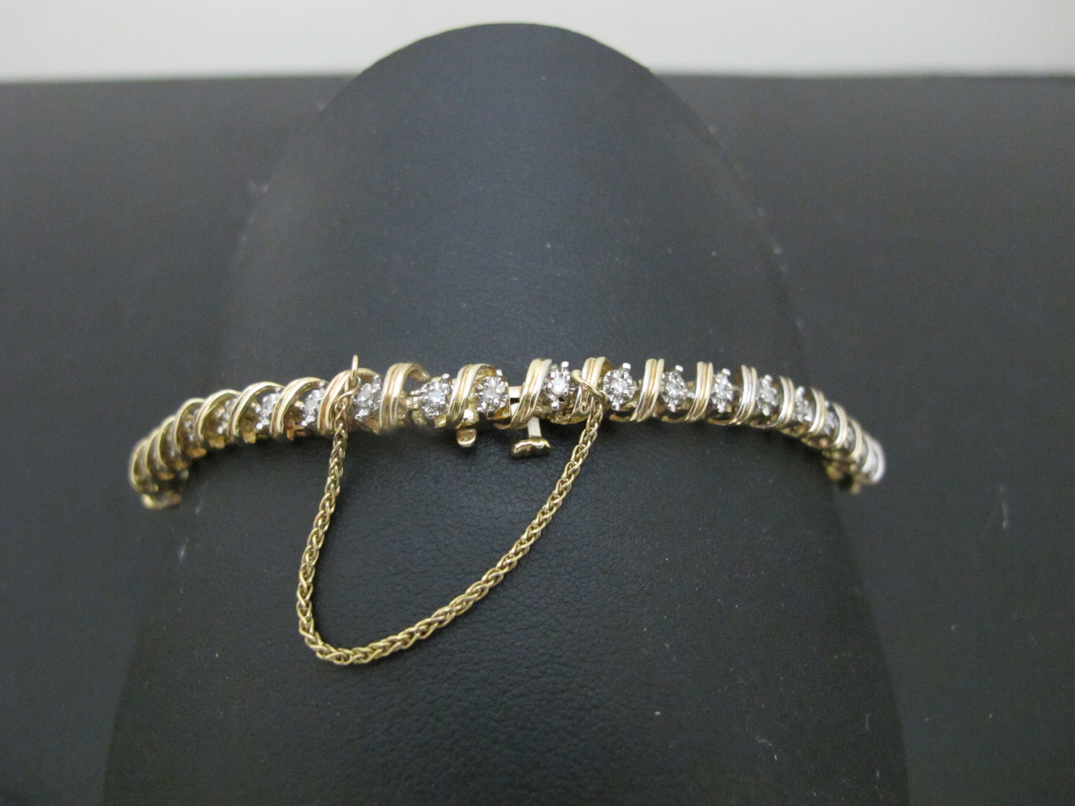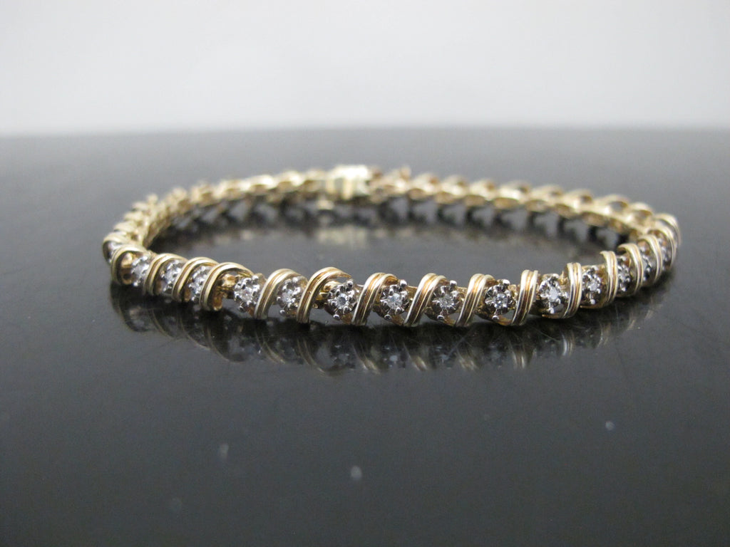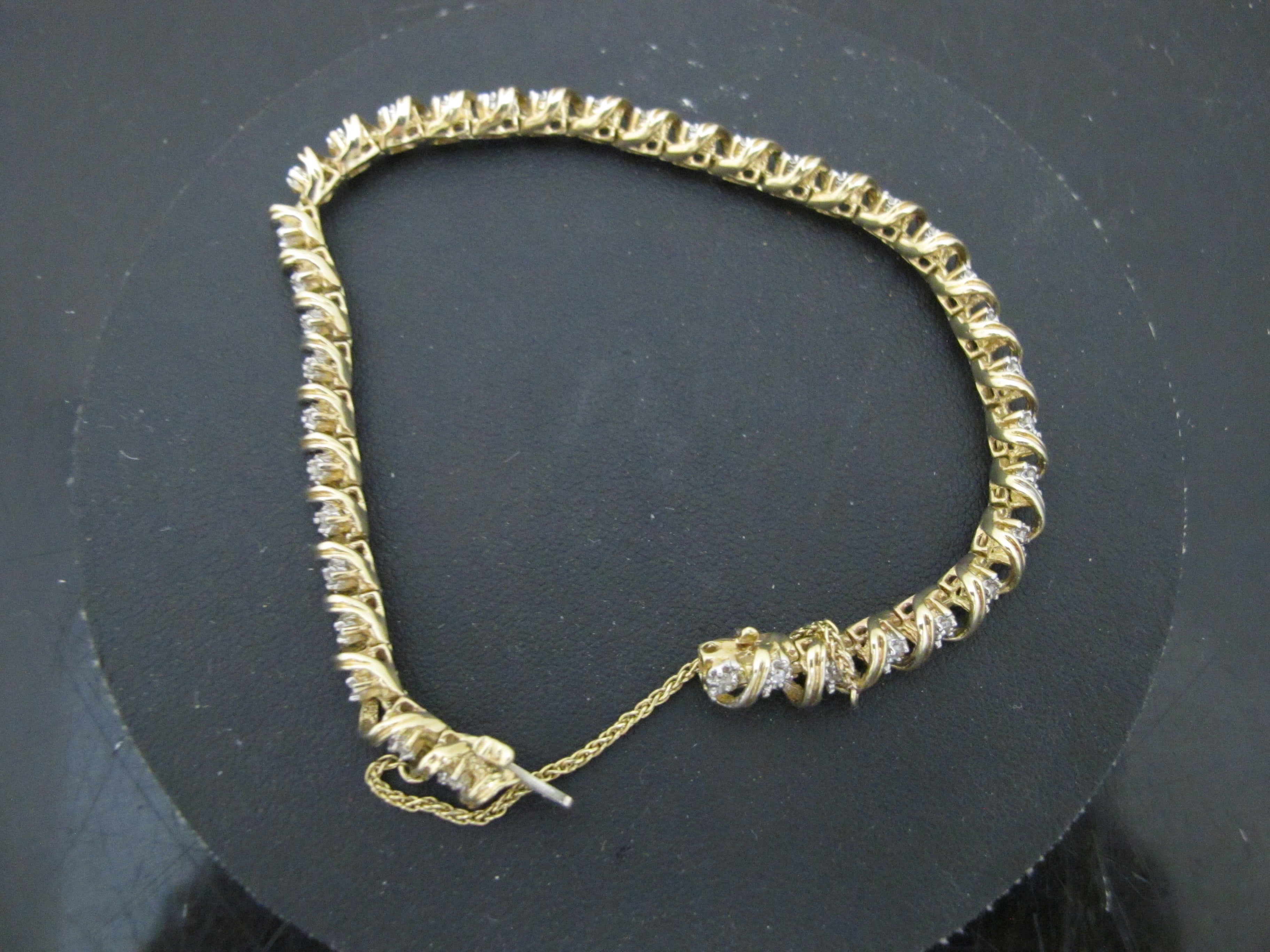 Stunning 10k yellow gold diamond tennis bracelet. A variation of the classic tennis bracelet, this style is a "S-link" or "swirl link," featuring a continuous line of diamonds set within interconnected S-shaped or spiral-shaped gold links.