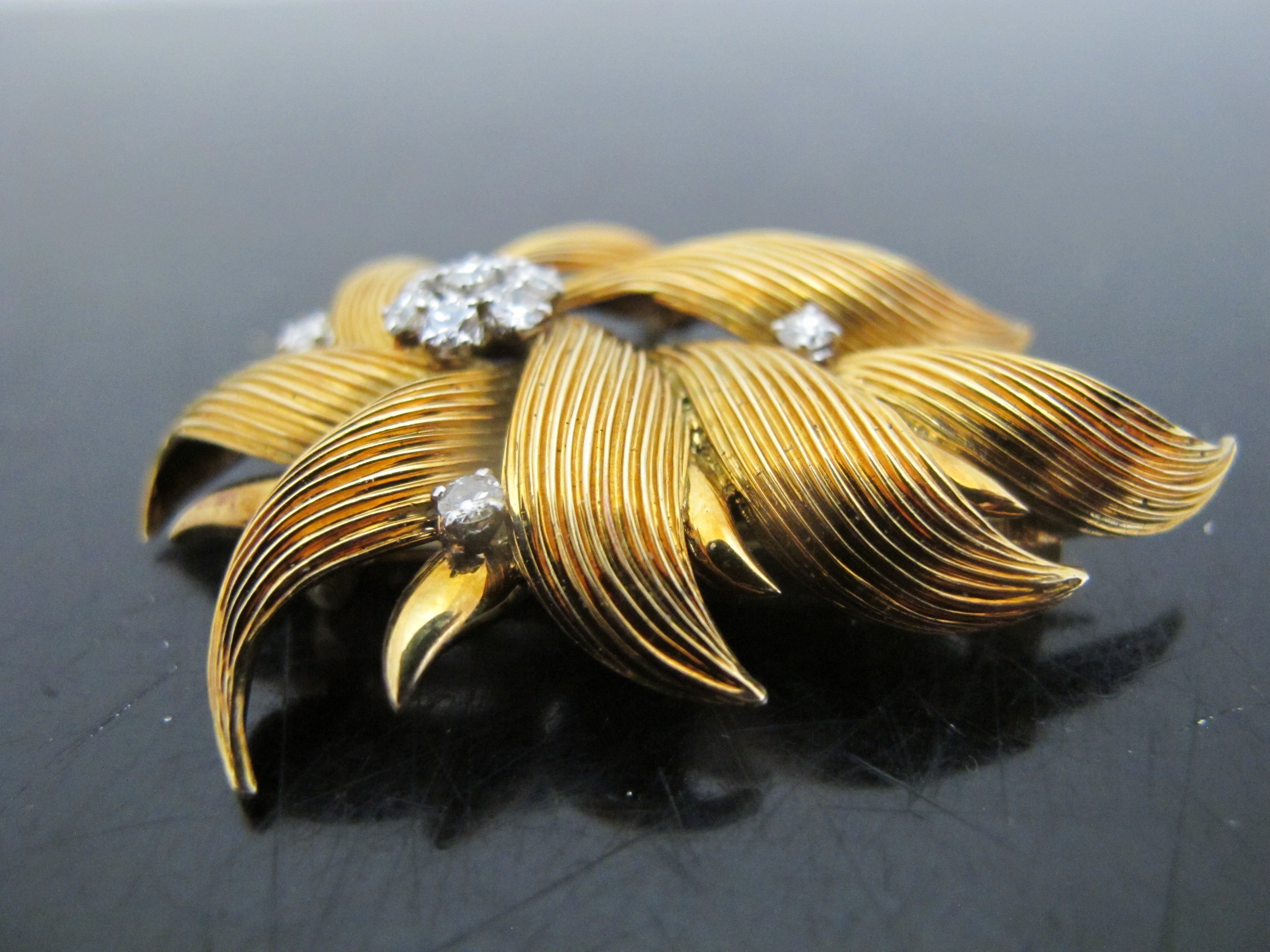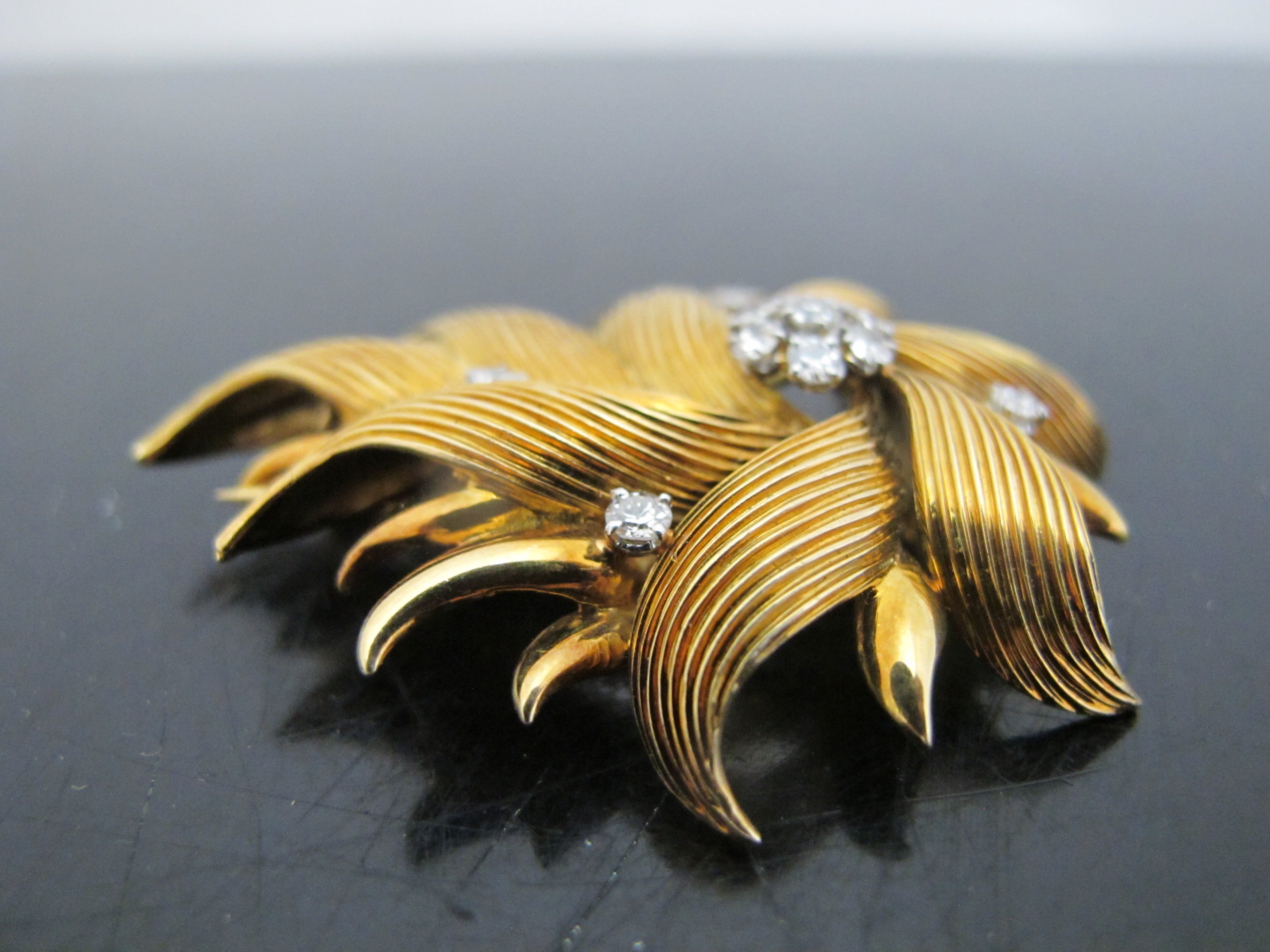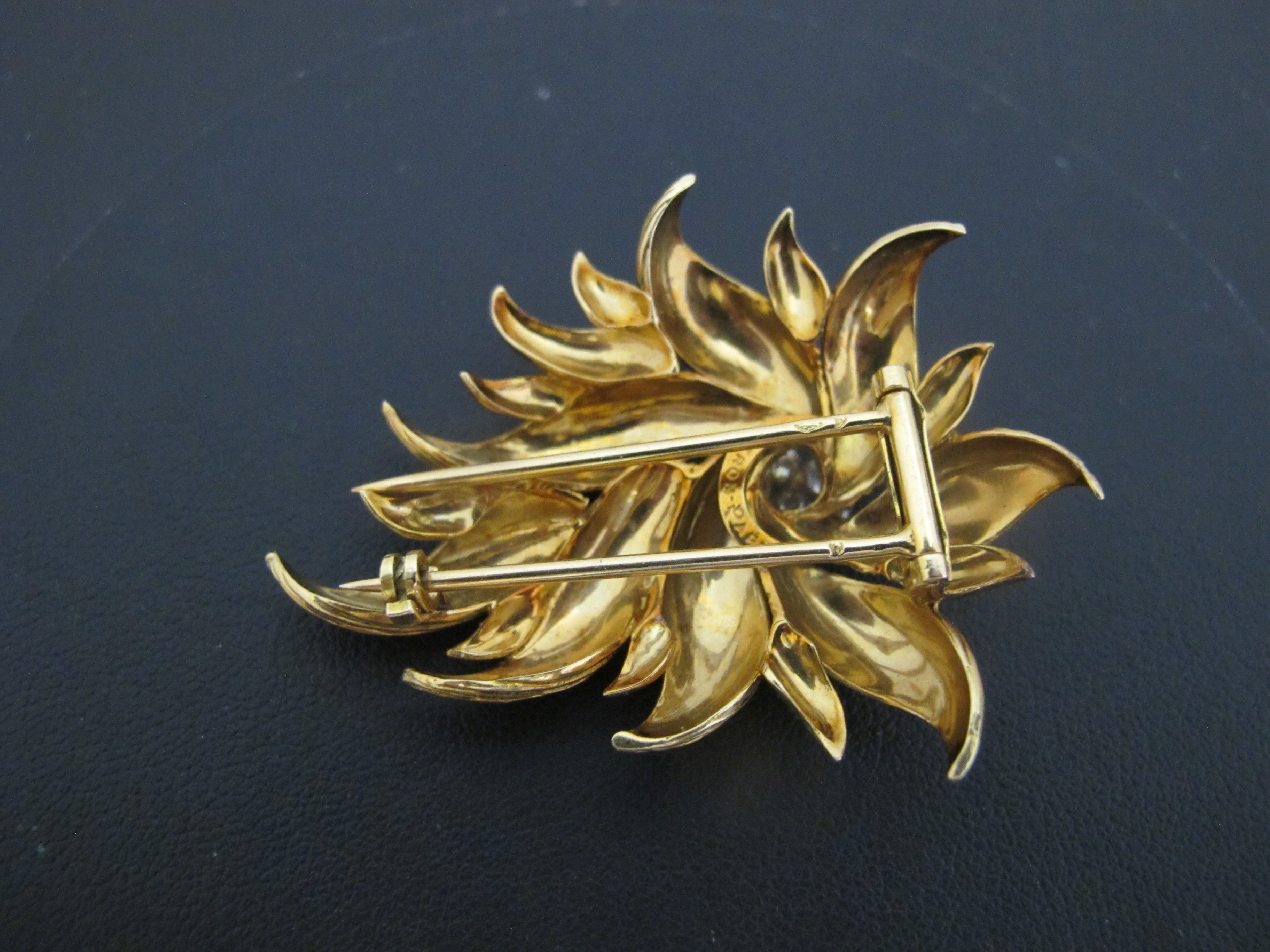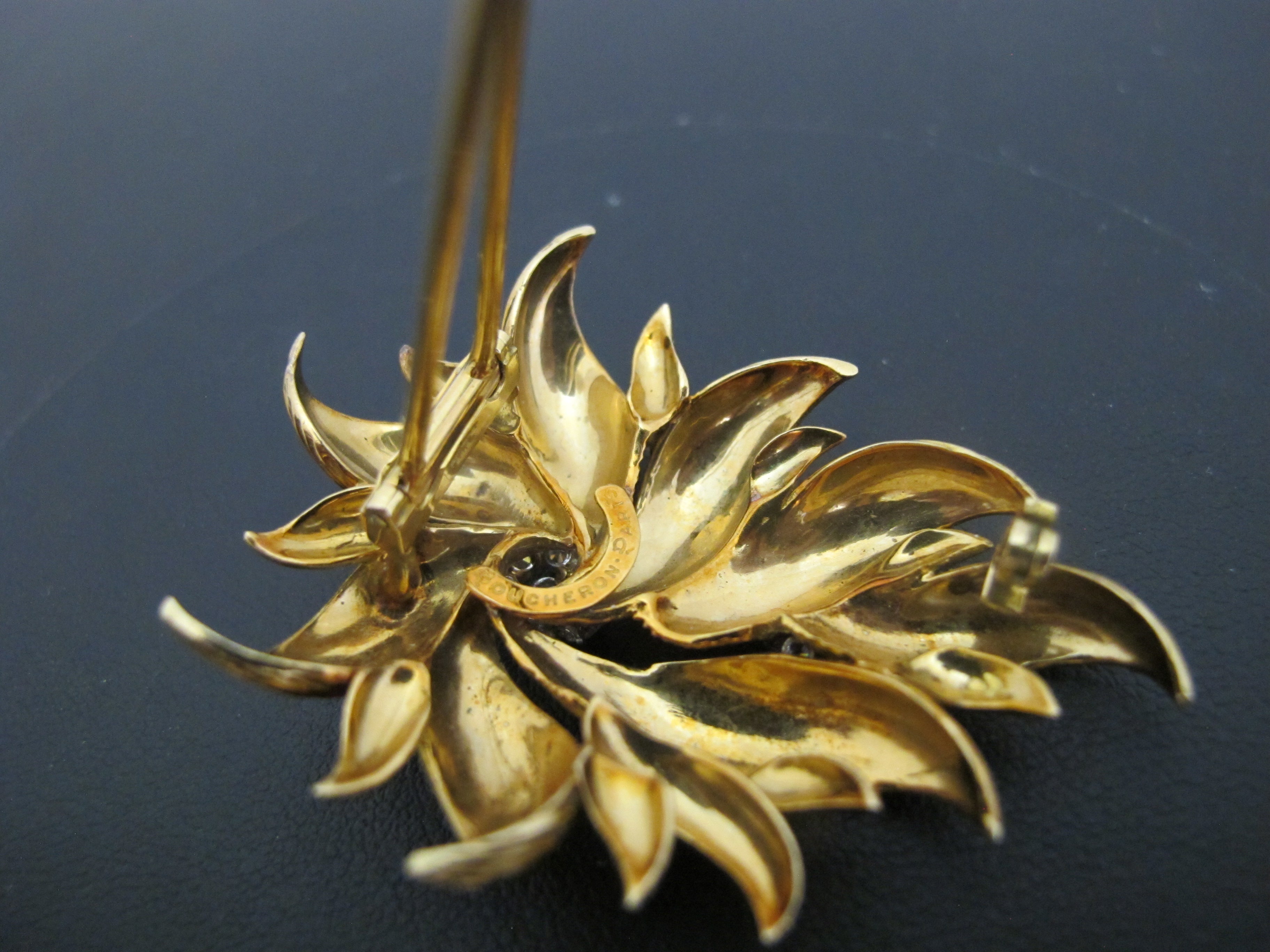 Stunning Maison Boucheron Paris, French 18k yellow gold and diamond brooch pin. Ornate textured leaves with diamond accents. 4 outer diamonds, each measures approximately 2.3mm. An inner cluster of diamonds at the center form a small flower design, a total of 7 diamonds, each approximately 2.7mm. Total weight 16.30 grams. Hallmarks at back of brooch.