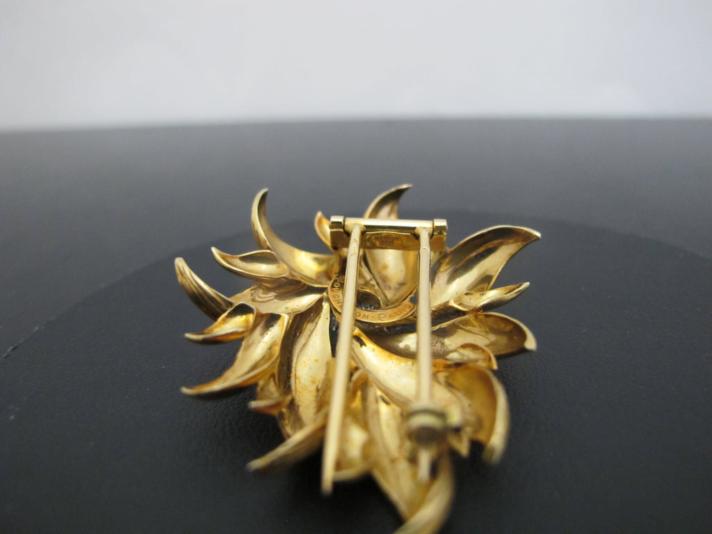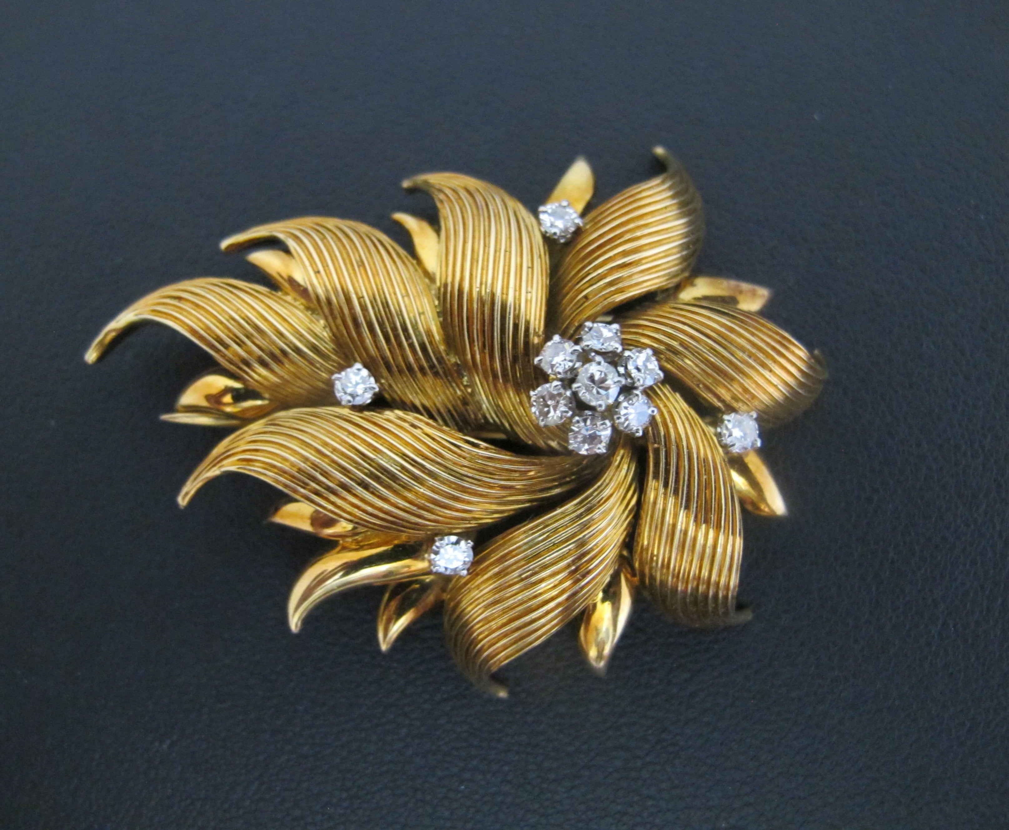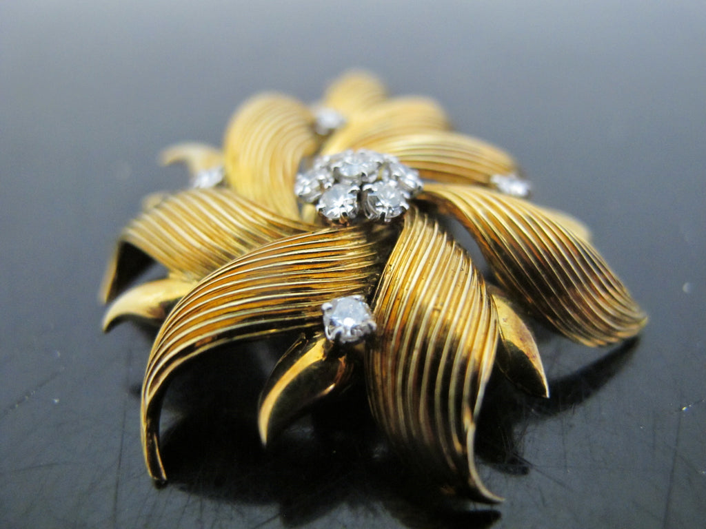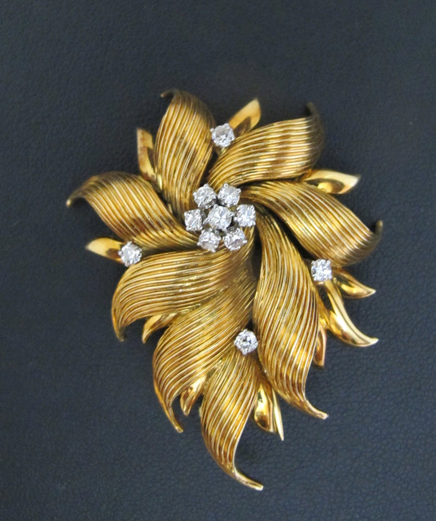 Stunning Maison Boucheron Paris, French 18k yellow gold and diamond brooch pin. Ornate textured leaves with diamond accents. 4 outer diamonds, each measures approximately 2.3mm. An inner cluster of diamonds at the center form a small flower design, a total of 7 diamonds, each approximately 2.7mm. Total weight 16.30 grams. Hallmarks at back of brooch.