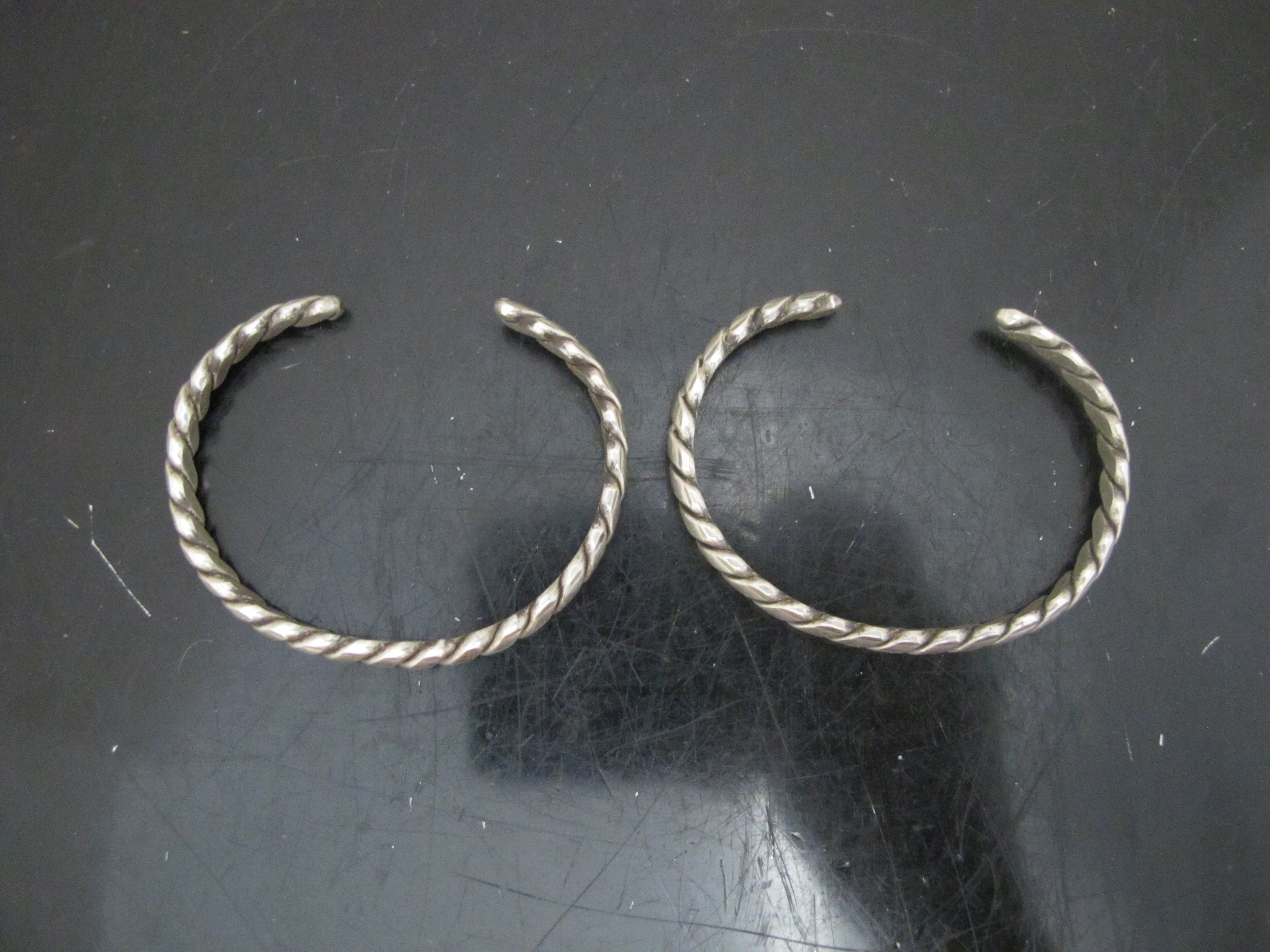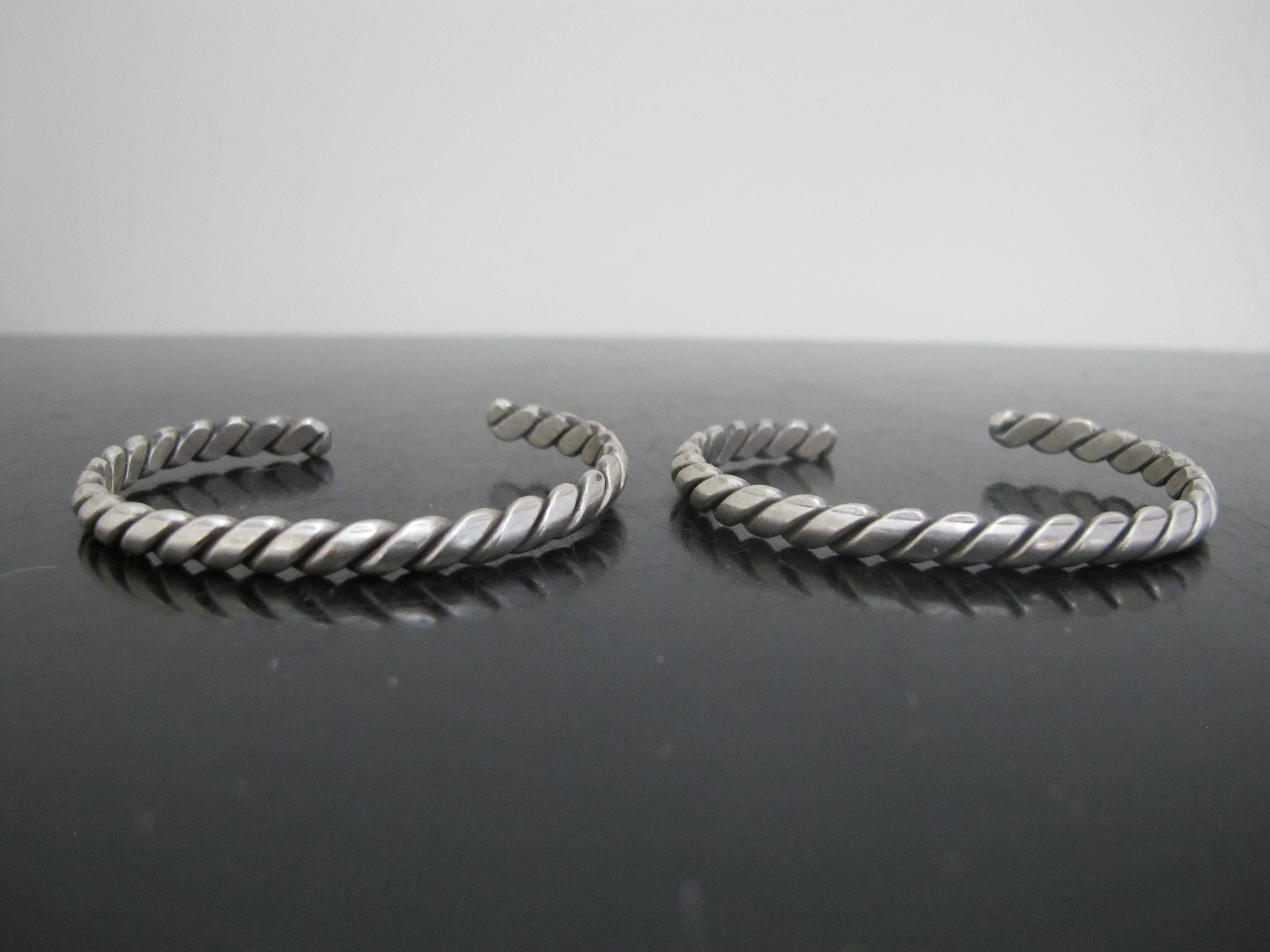 Navajo sterling silver rope bracelet pair. Each measures about 1/4" thick. Can be worn together or separately. Inner cuff measures 5" with a 3/4" gap. Total weight of 32.07 grams. Both tested sterling.