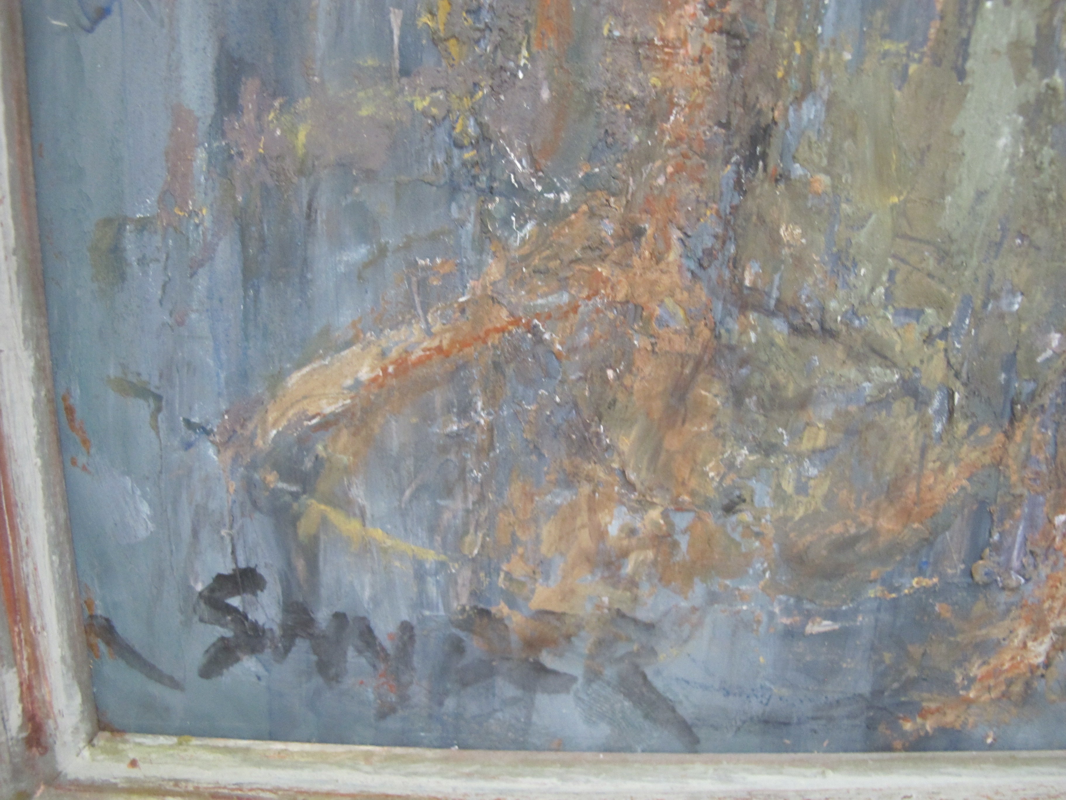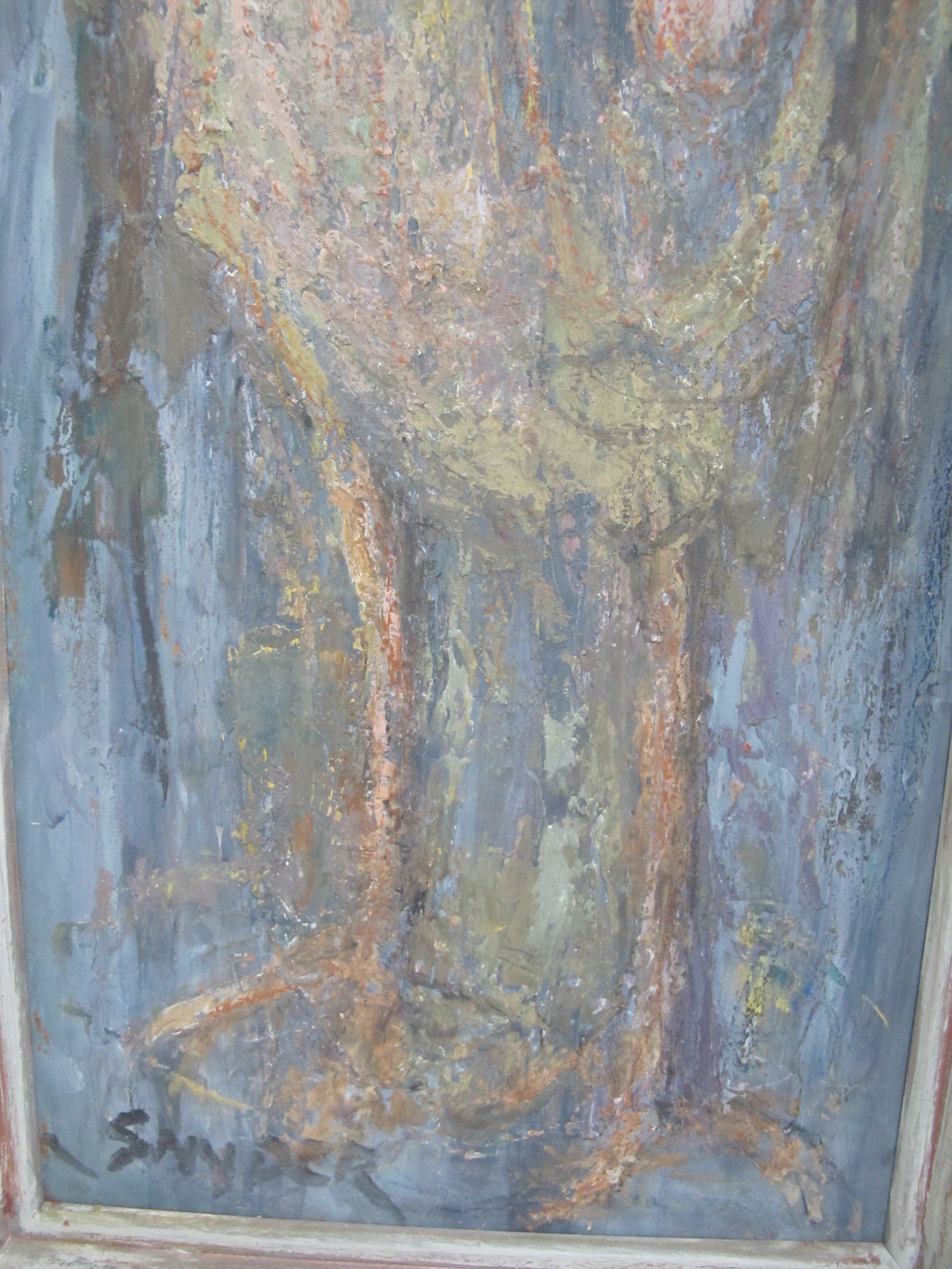 Snyder liked the rough texture of many layers of paint softened by scumbling, using that technique to great effect. In 1929 she met C.S. Price at one of his gallery shows. He later informed her that her work, especially the clowns and religious paintings, had something in common with the French painter Rouault. Snyder, who was not familiar with Rouault, had independently developed her use of heavy black outlines. She was, however, influenced by Charles Heaney, Price, and his circle. She made mannequins as models for her clown figures and sent one of these to Price. One can detect a wistfulness and sadness in her clown figures. Snyder also painted portraits and still lifes. Over the years her style changed from realistic through impressionistic to the increasingly abstract.