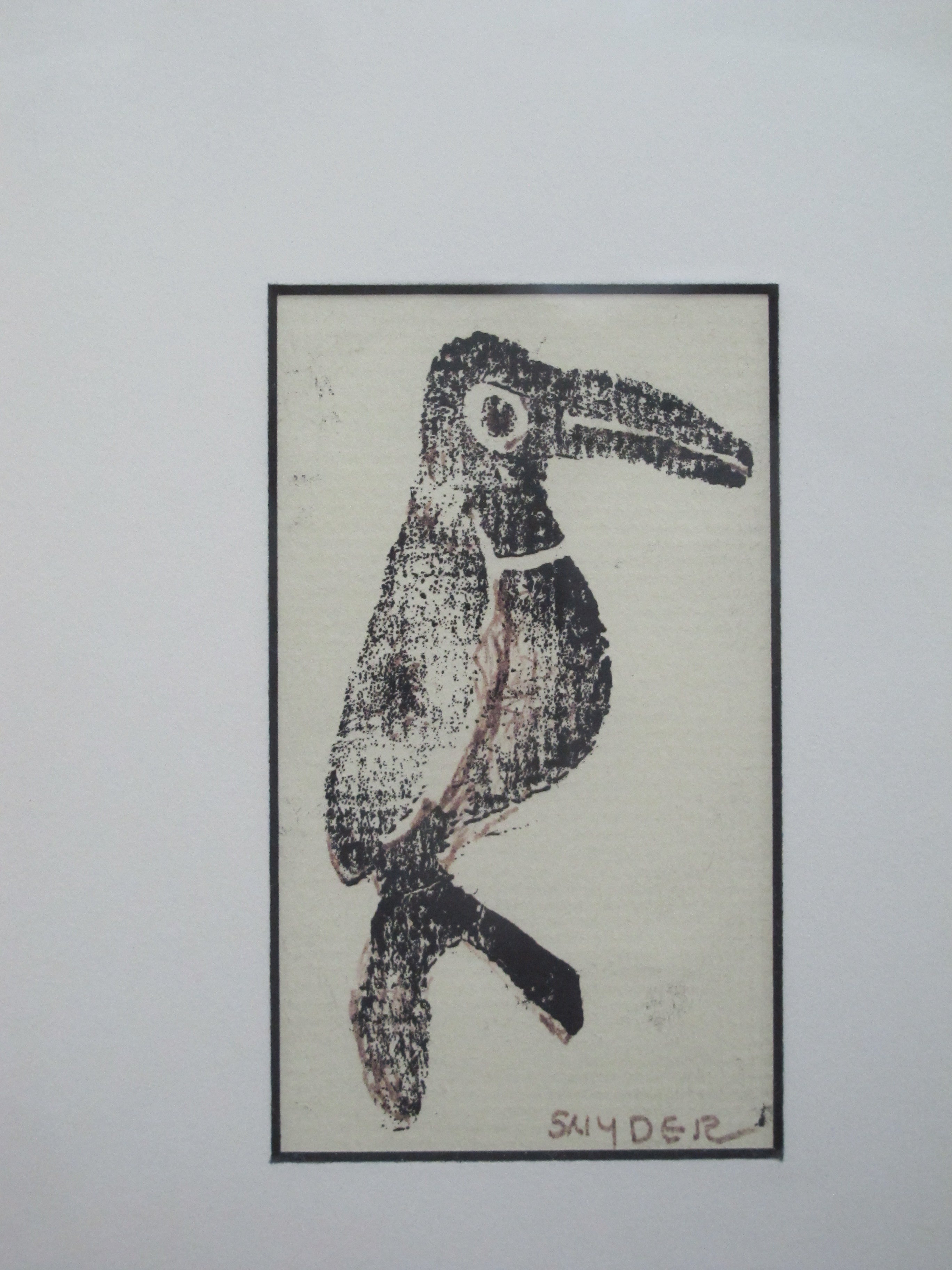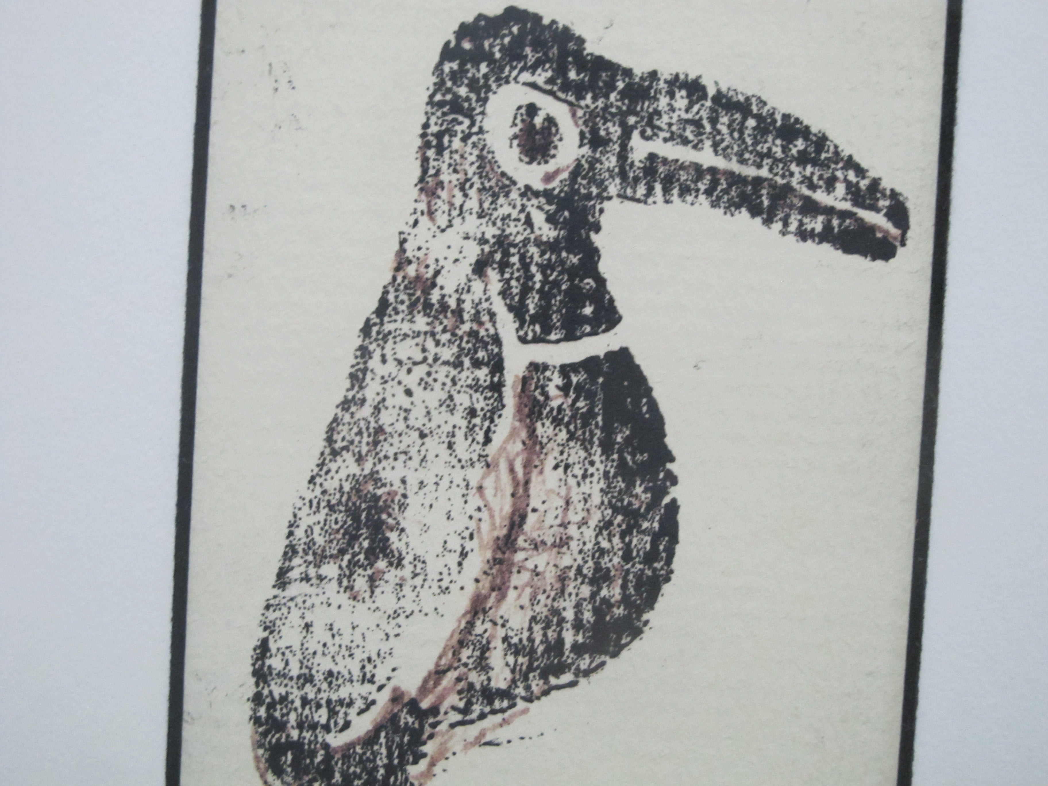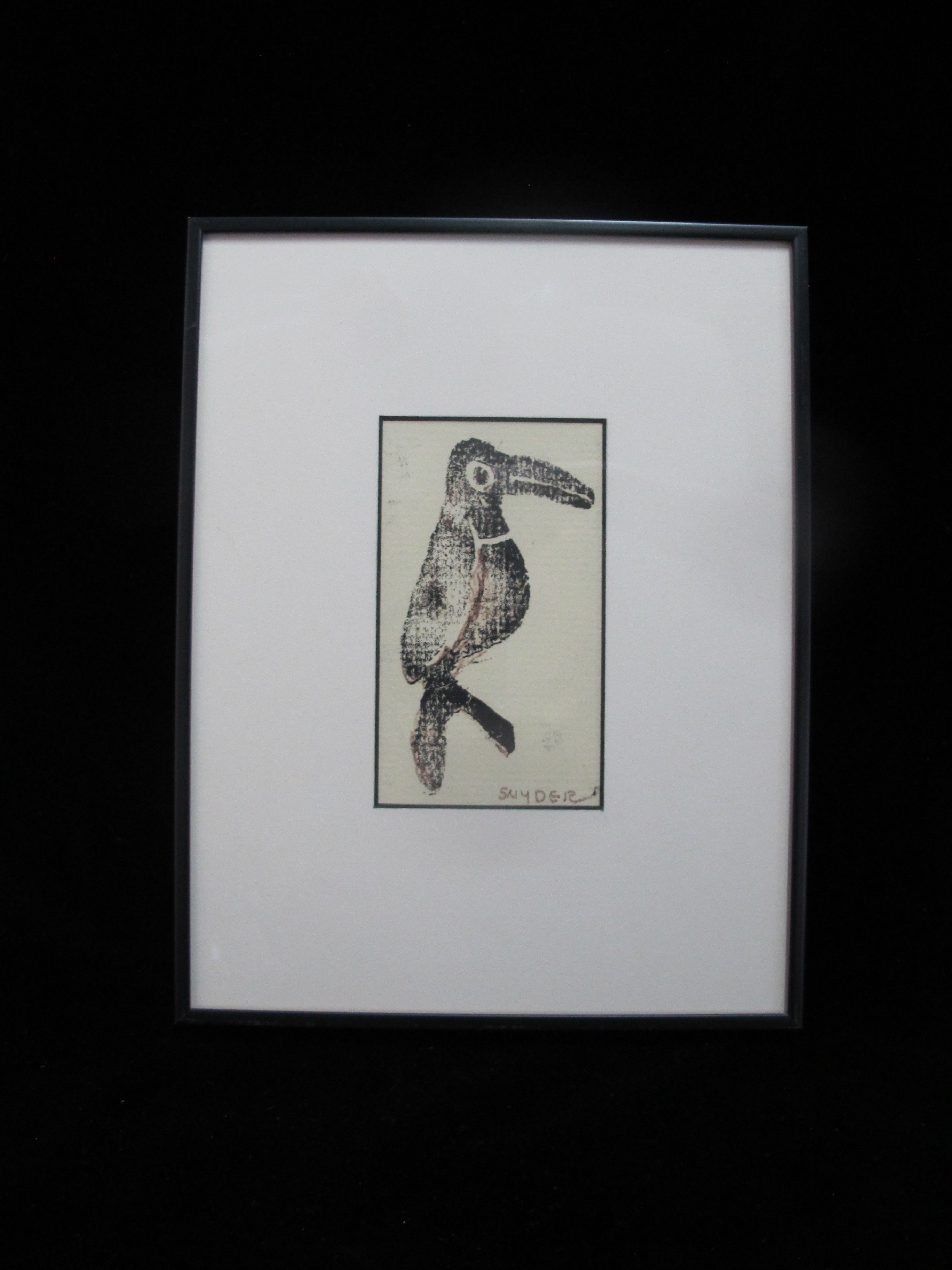 Pacific NW artist, Amanda Snyder framed woodblock print of a toucan bird. Signed at lower right. Frame measures 9 3/8" x 7 1/4", print measures 4 1/2" x 2 3/4". Excellent condition and nicely framed.