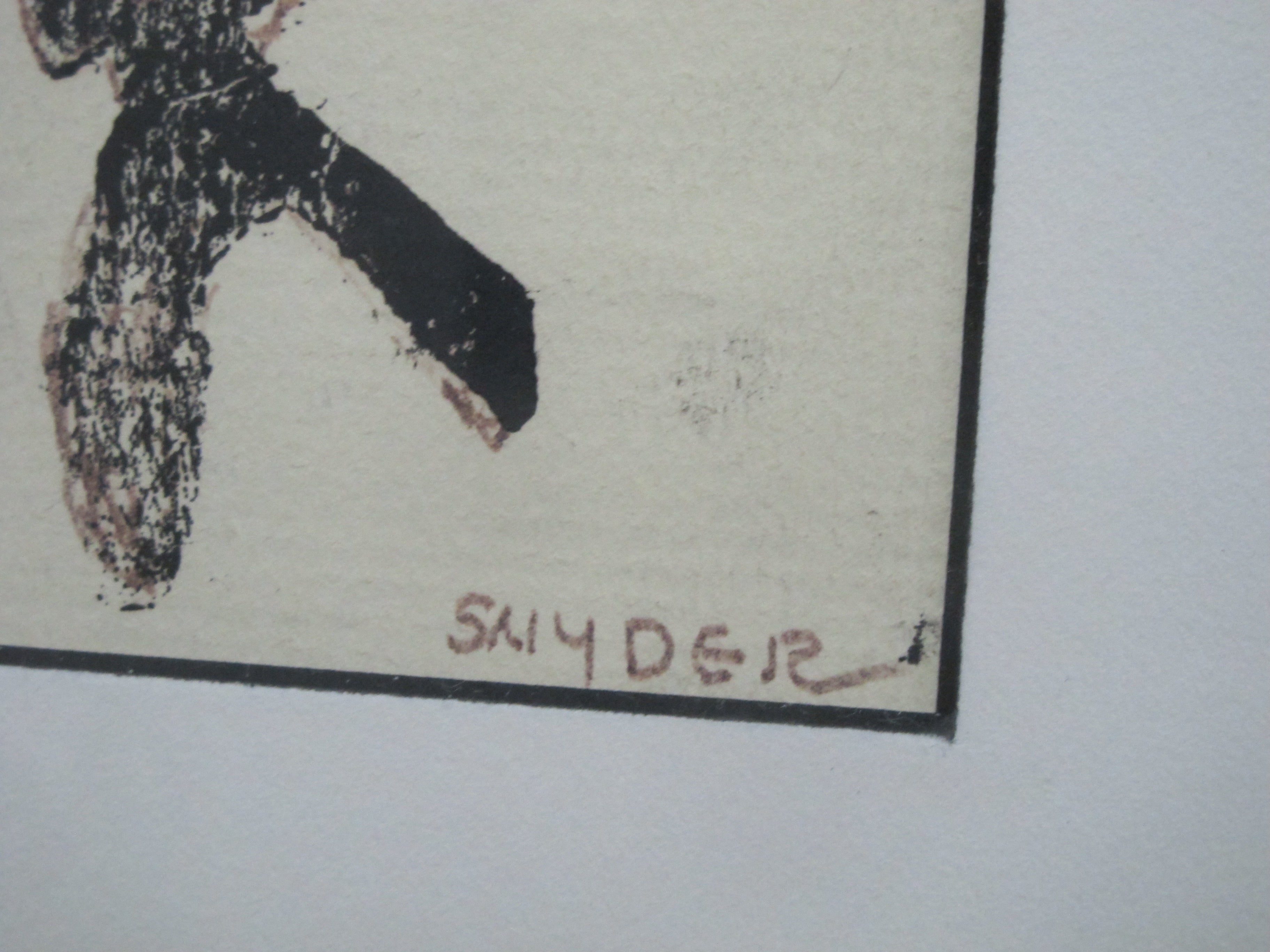 Snyder liked the rough texture of many layers of paint softened by scumbling, using that technique to great effect. In 1929 she met C.S. Price at one of his gallery shows. He later informed her that her work, especially the clowns and religious paintings, had something in common with the French painter Rouault. Snyder, who was not familiar with Rouault, had independently developed her use of heavy black outlines. She was, however, influenced by Charles Heaney, Price, and his circle. She made mannequins as models for her clown figures and sent one of these to Price. One can detect a wistfulness and sadness in her clown figures. Snyder also painted portraits and still lifes. Over the years her style changed from realistic through impressionistic to the increasingly abstract.