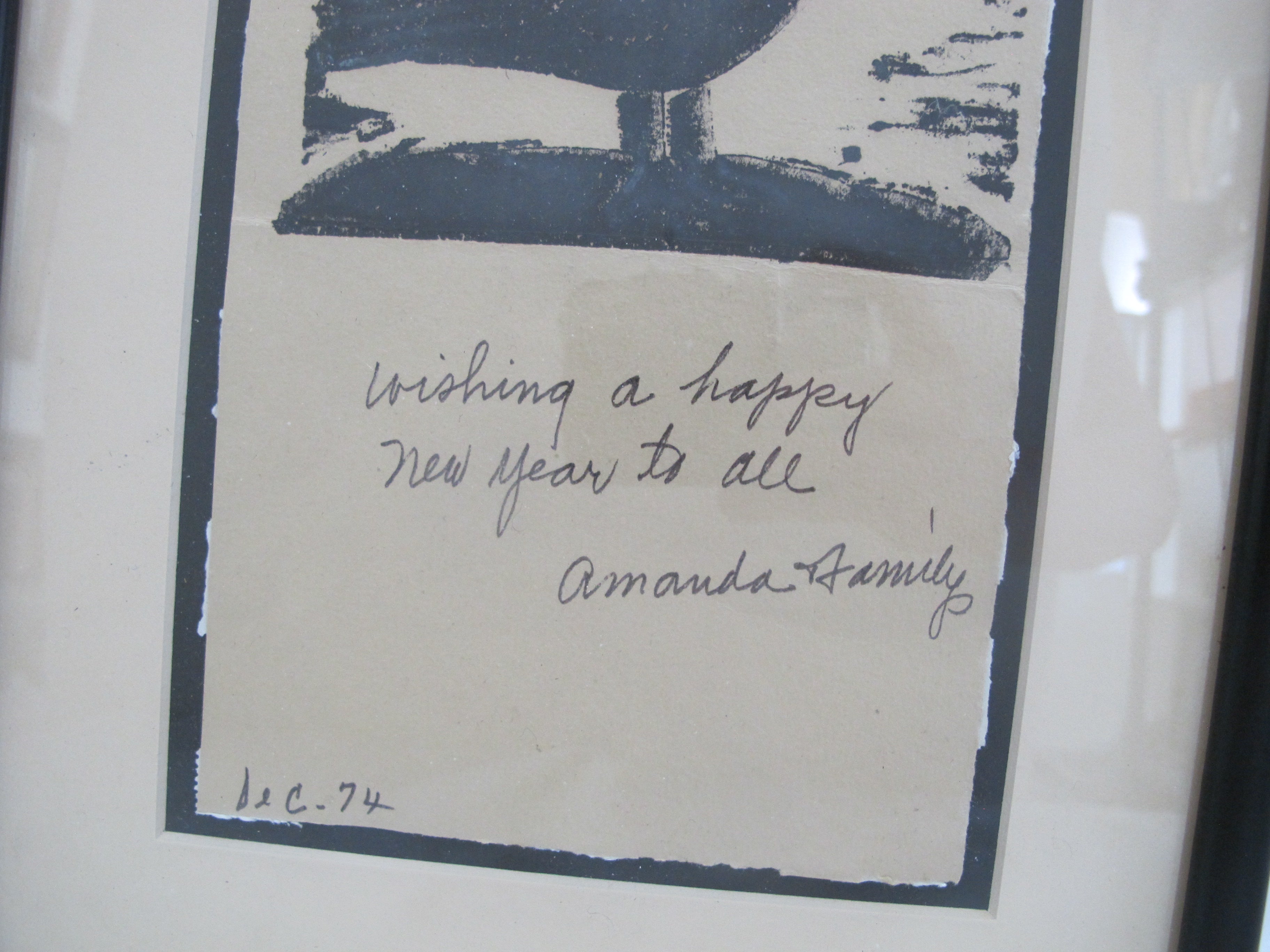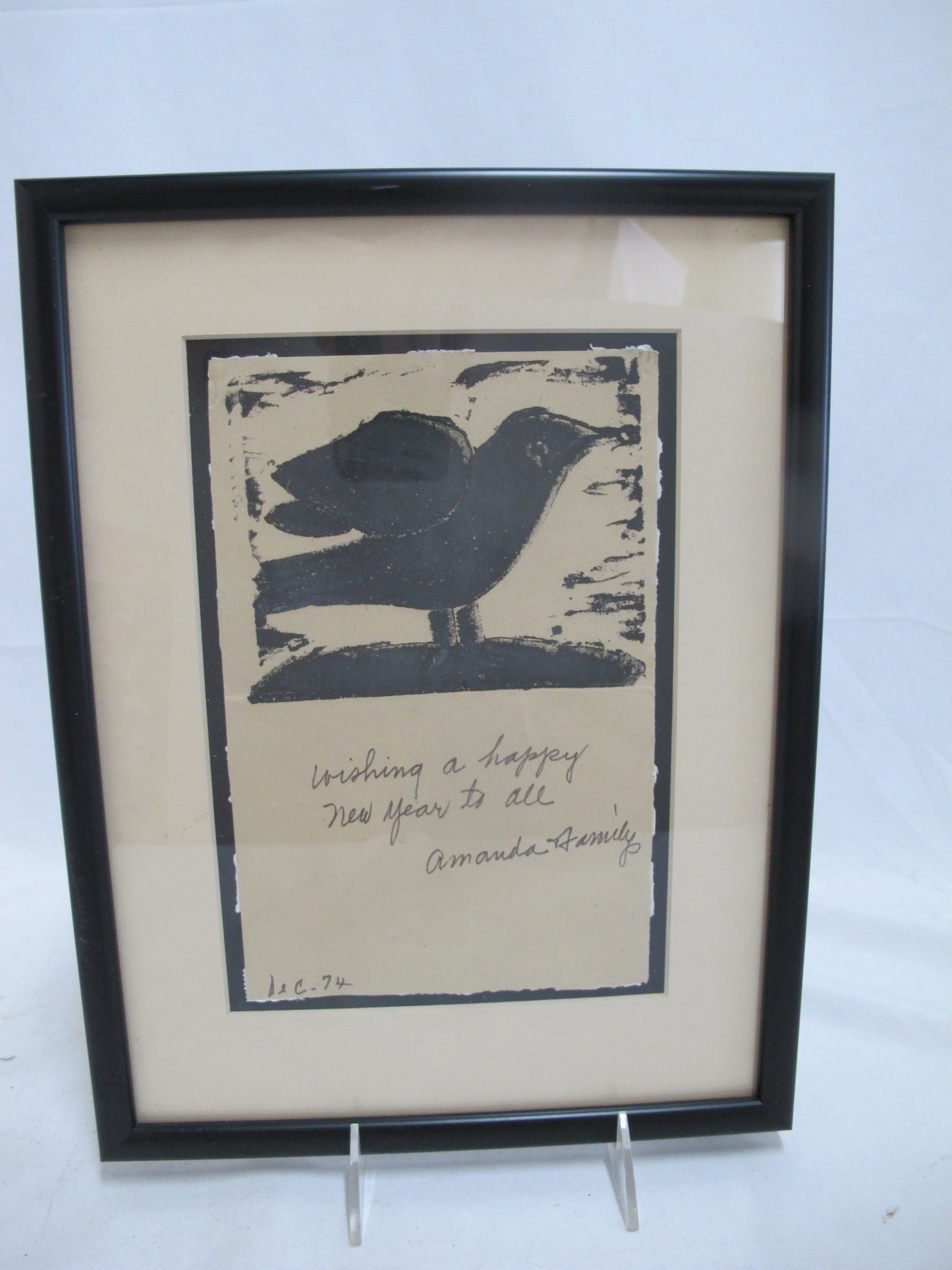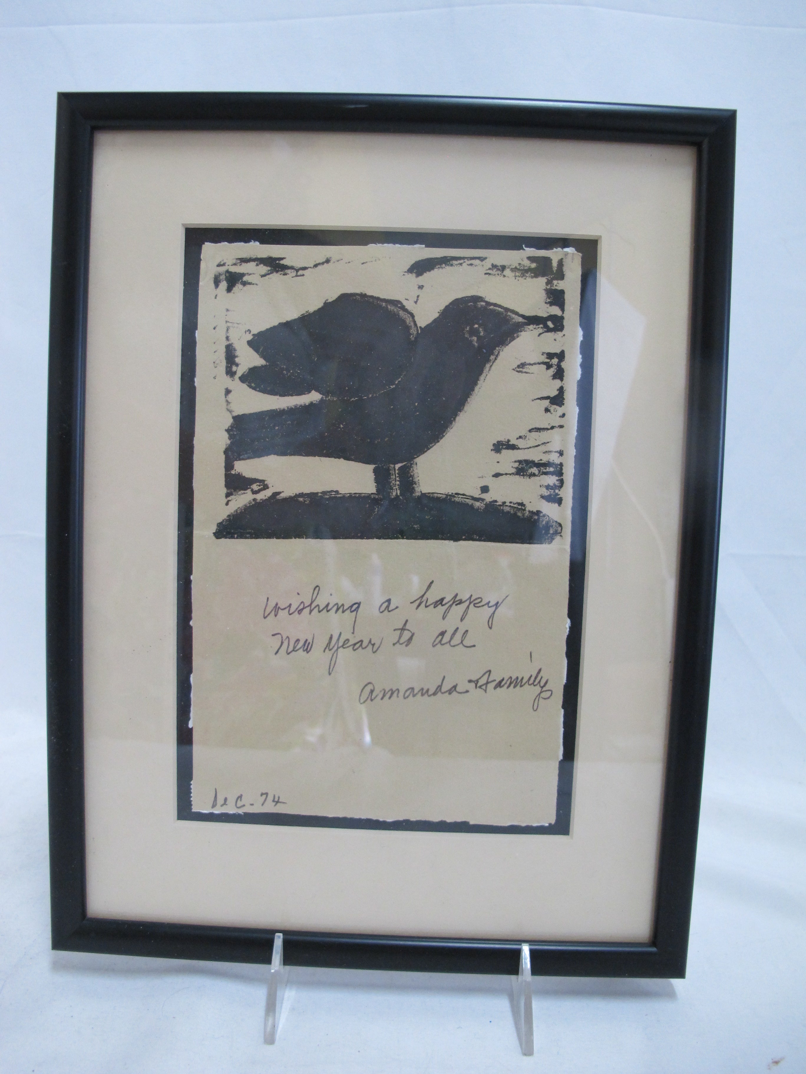 Pacific NW artist, Amanda Snyder framed woodblock. This is a handmade holiday card showing a bird and hand written note by artist "Wishing a happy New Year to All, Amanda & Family". Dated at lower left, Dec-74. Frame measures 9 3/4" x 12 3/4", print measures 5 1/2" x 8 1/4". Excellent condition .