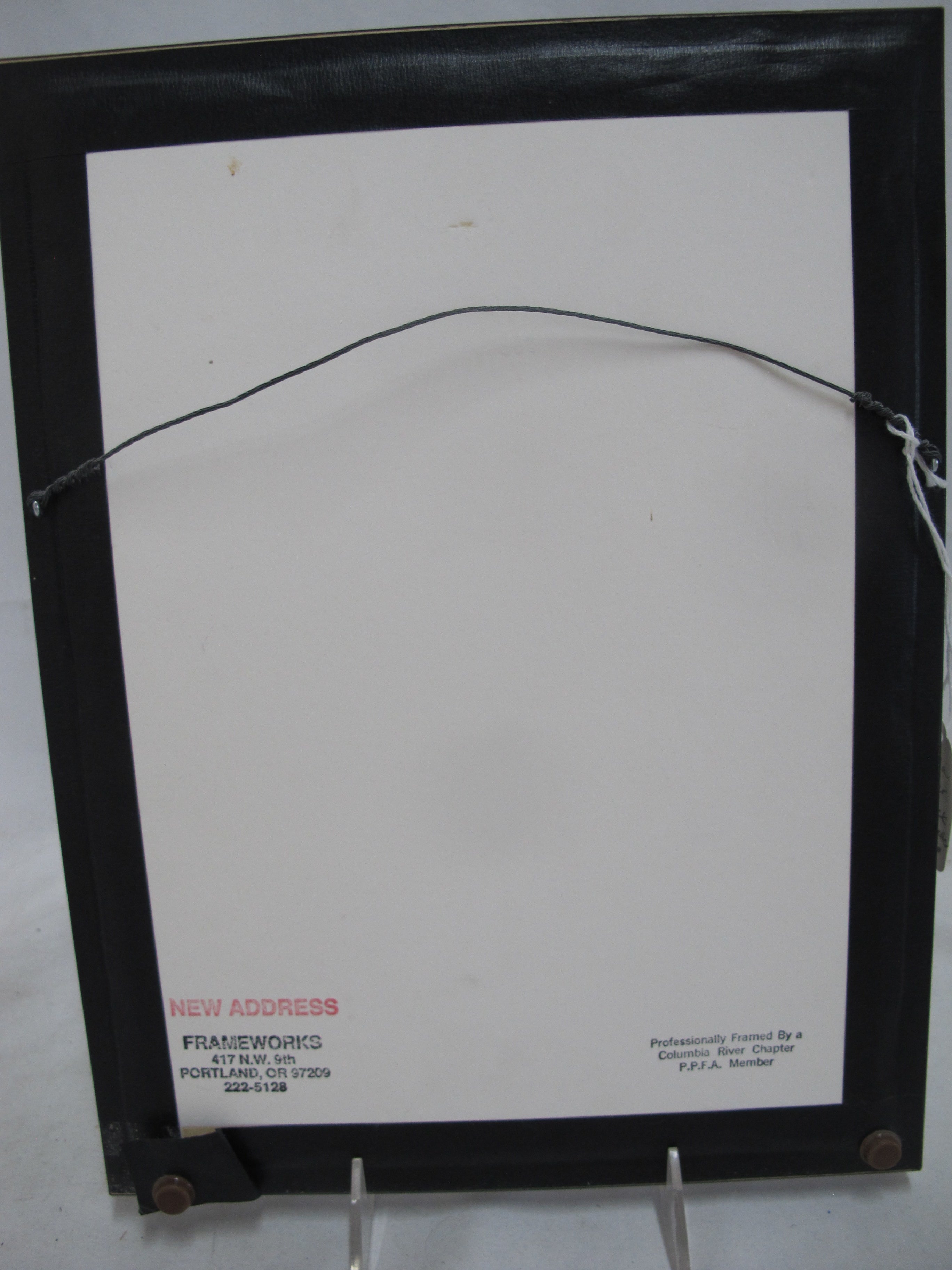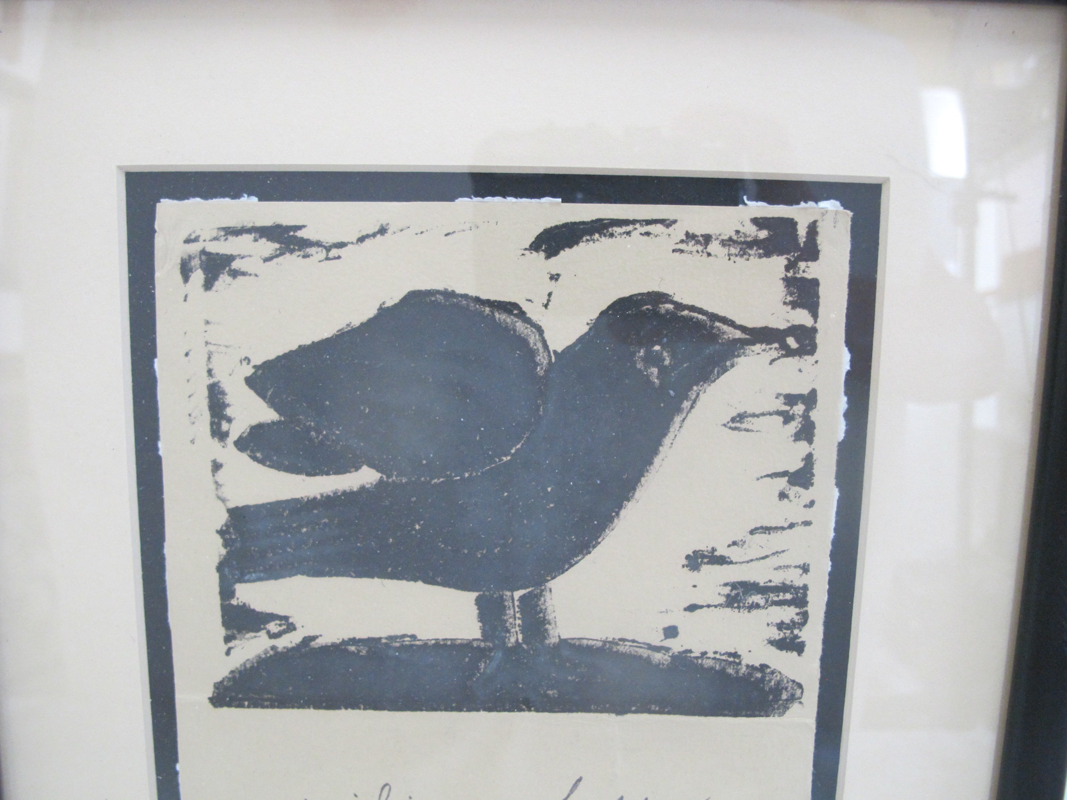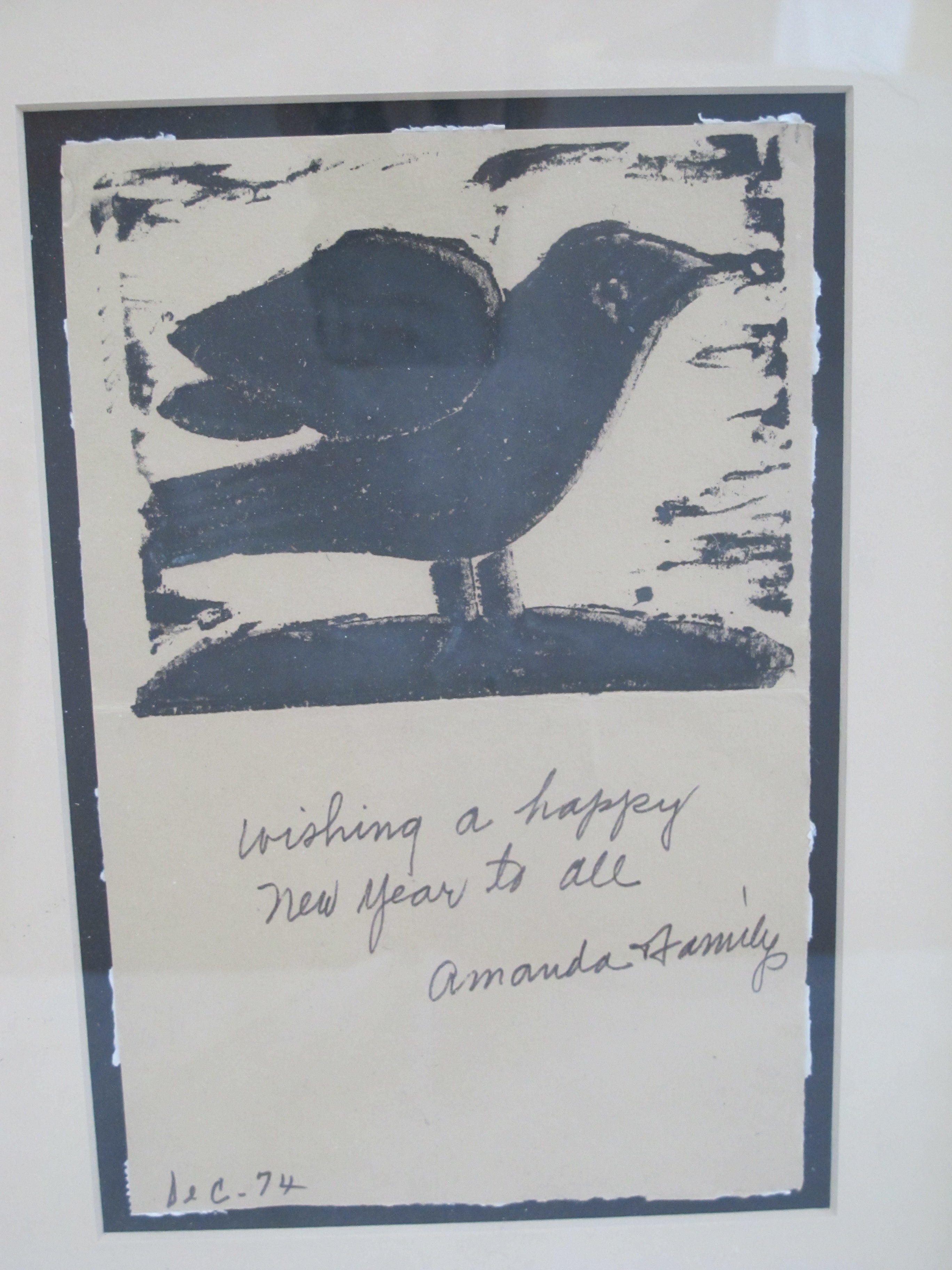 Pacific NW artist, Amanda Snyder framed woodblock. This is a handmade holiday card showing a bird and hand written note by artist "Wishing a happy New Year to All, Amanda & Family". Dated at lower left, Dec-74. Frame measures 9 3/4" x 12 3/4", print measures 5 1/2" x 8 1/4". Excellent condition .