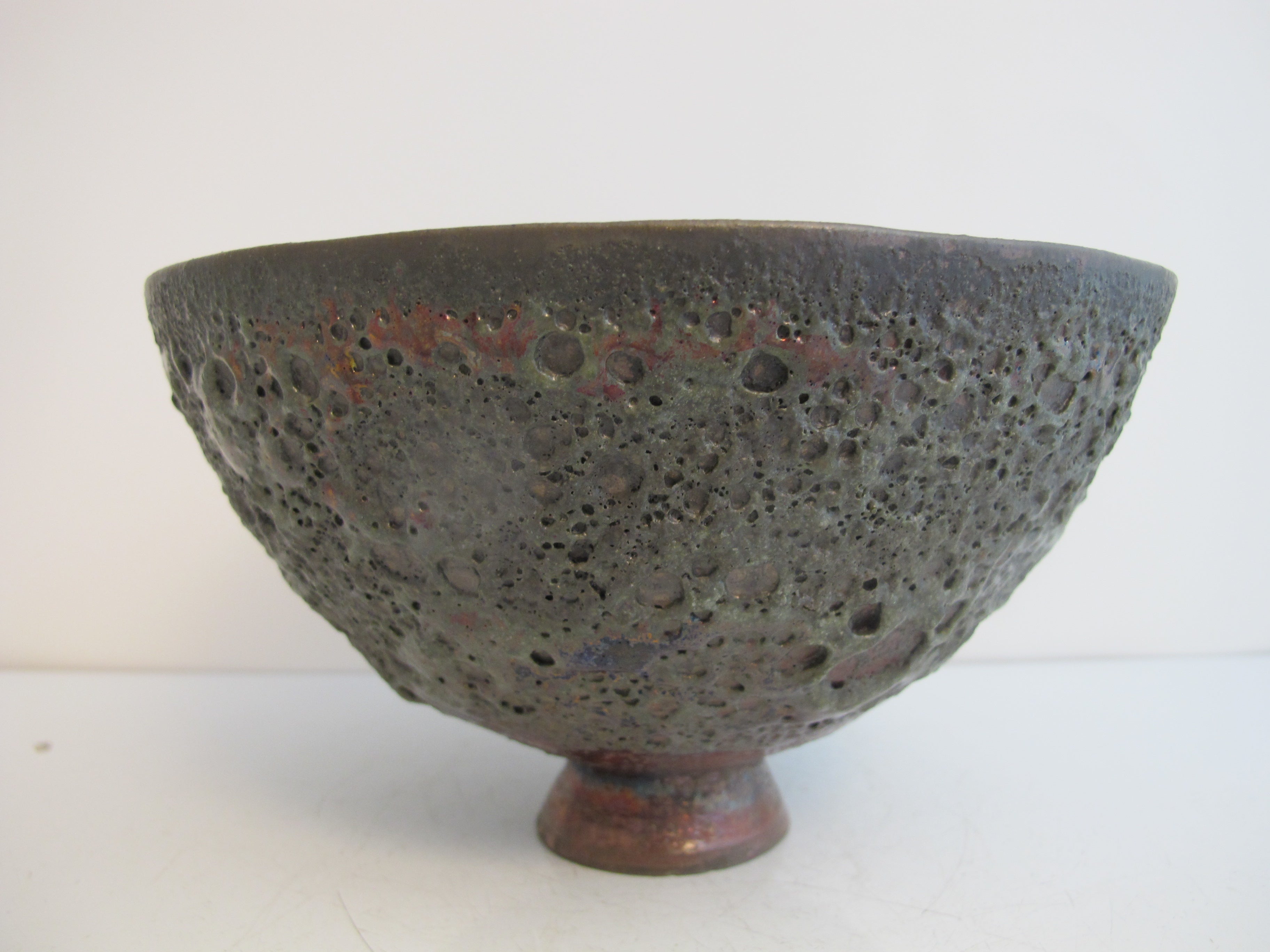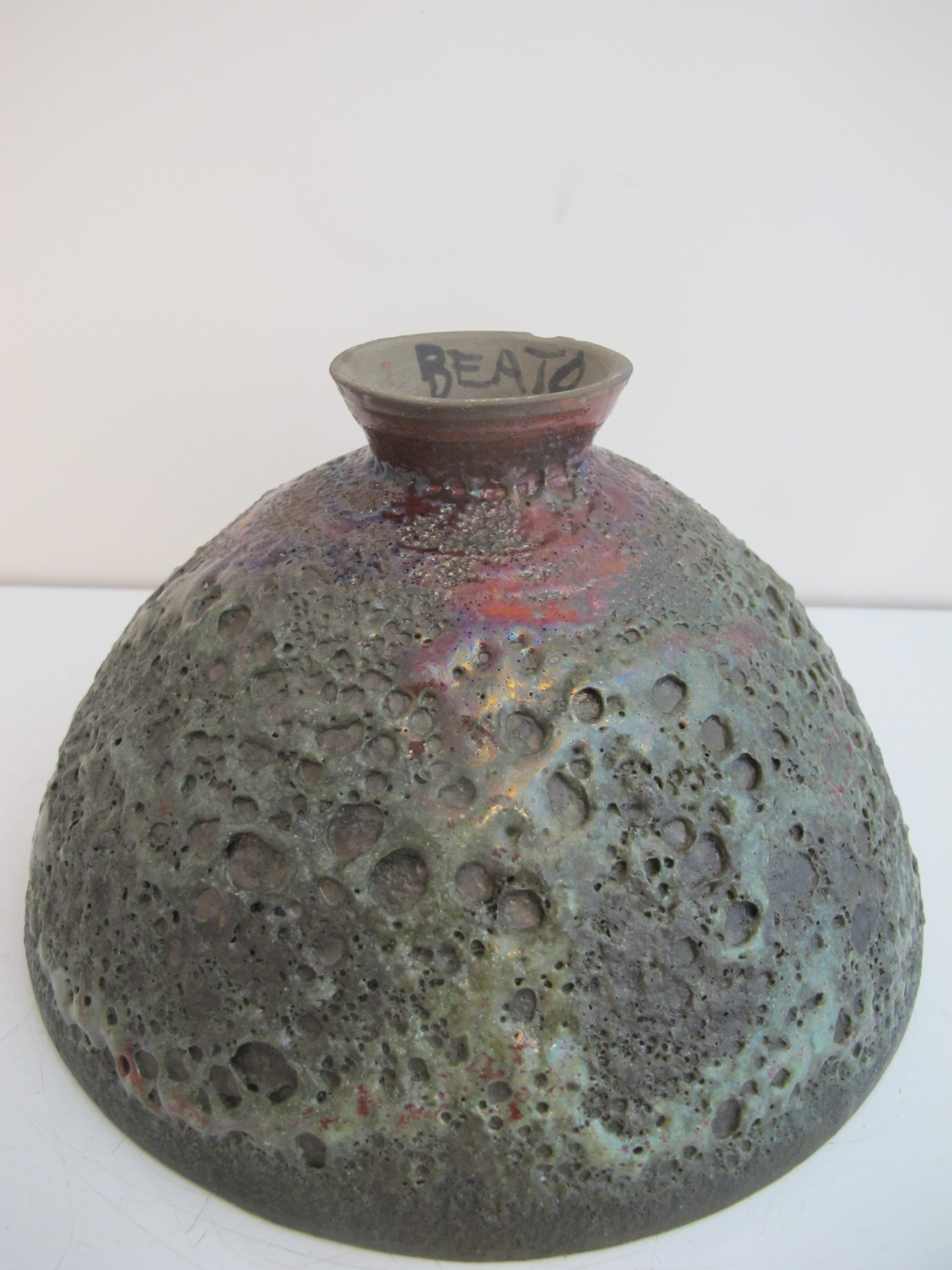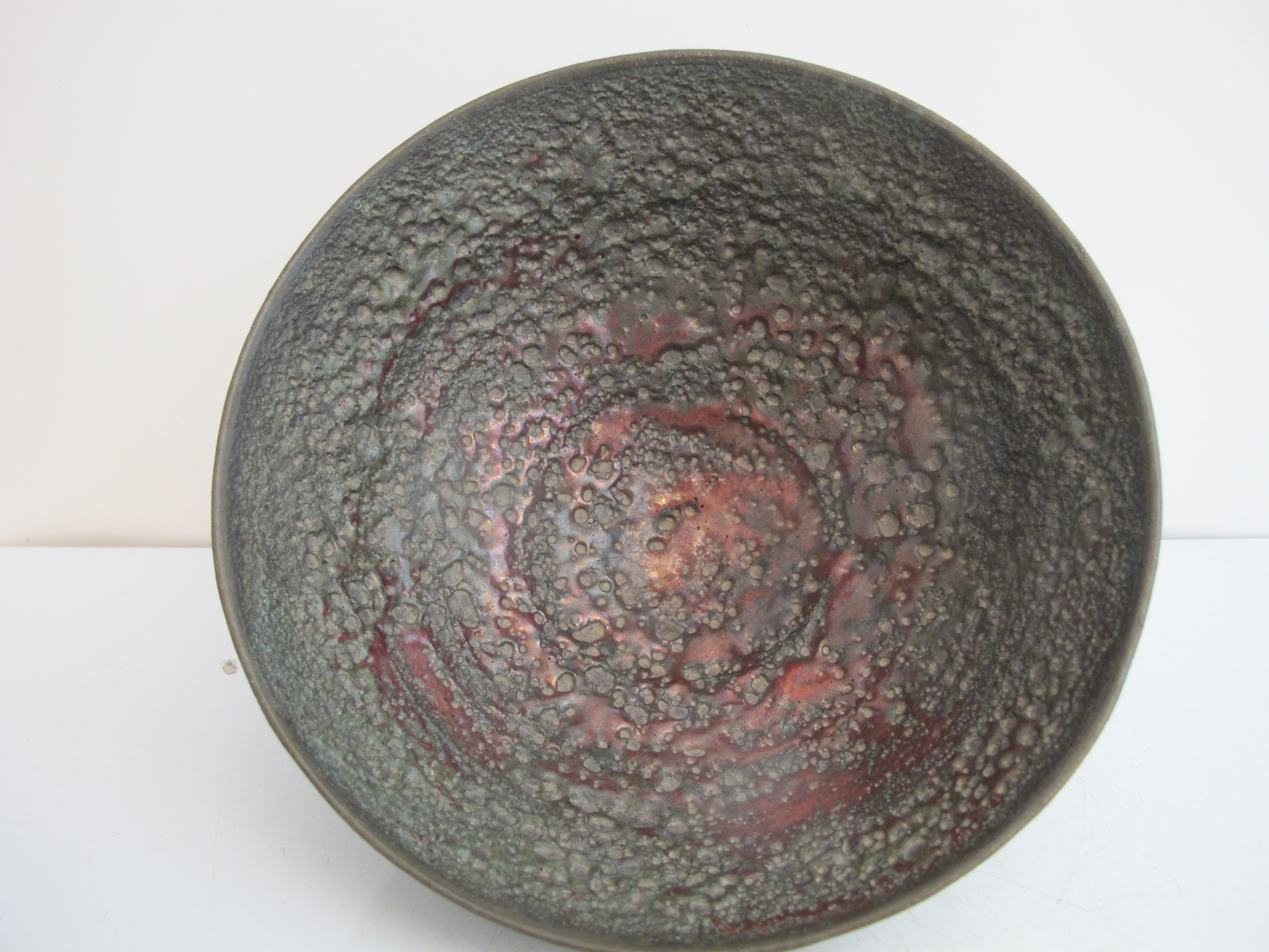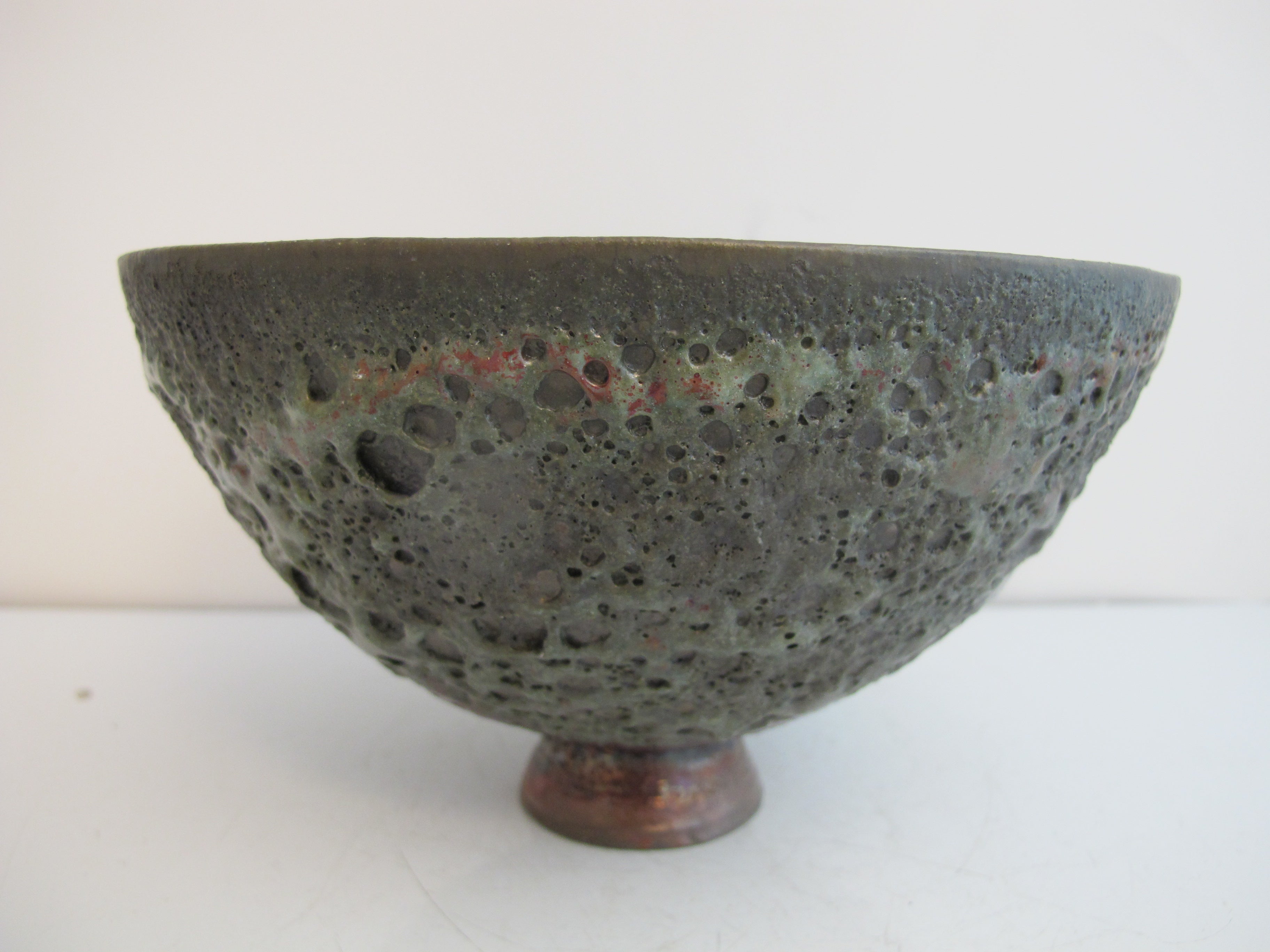 Beatrice Wood (Beato) earthenware pottery bowl. Heavily textured, deeply porous 'volcanic' pottery with in mostly red iridescent glaze. Signed Beato at base.