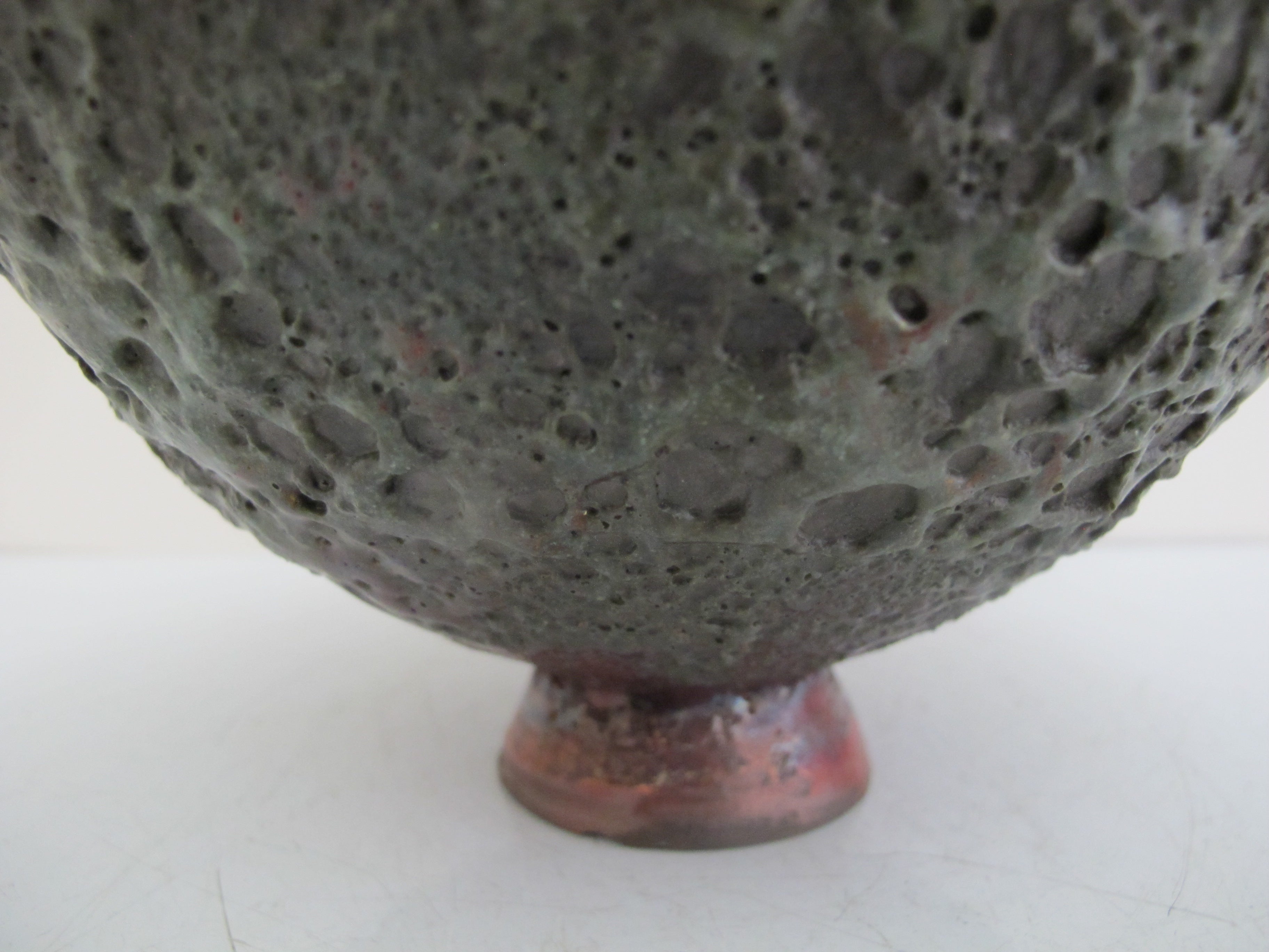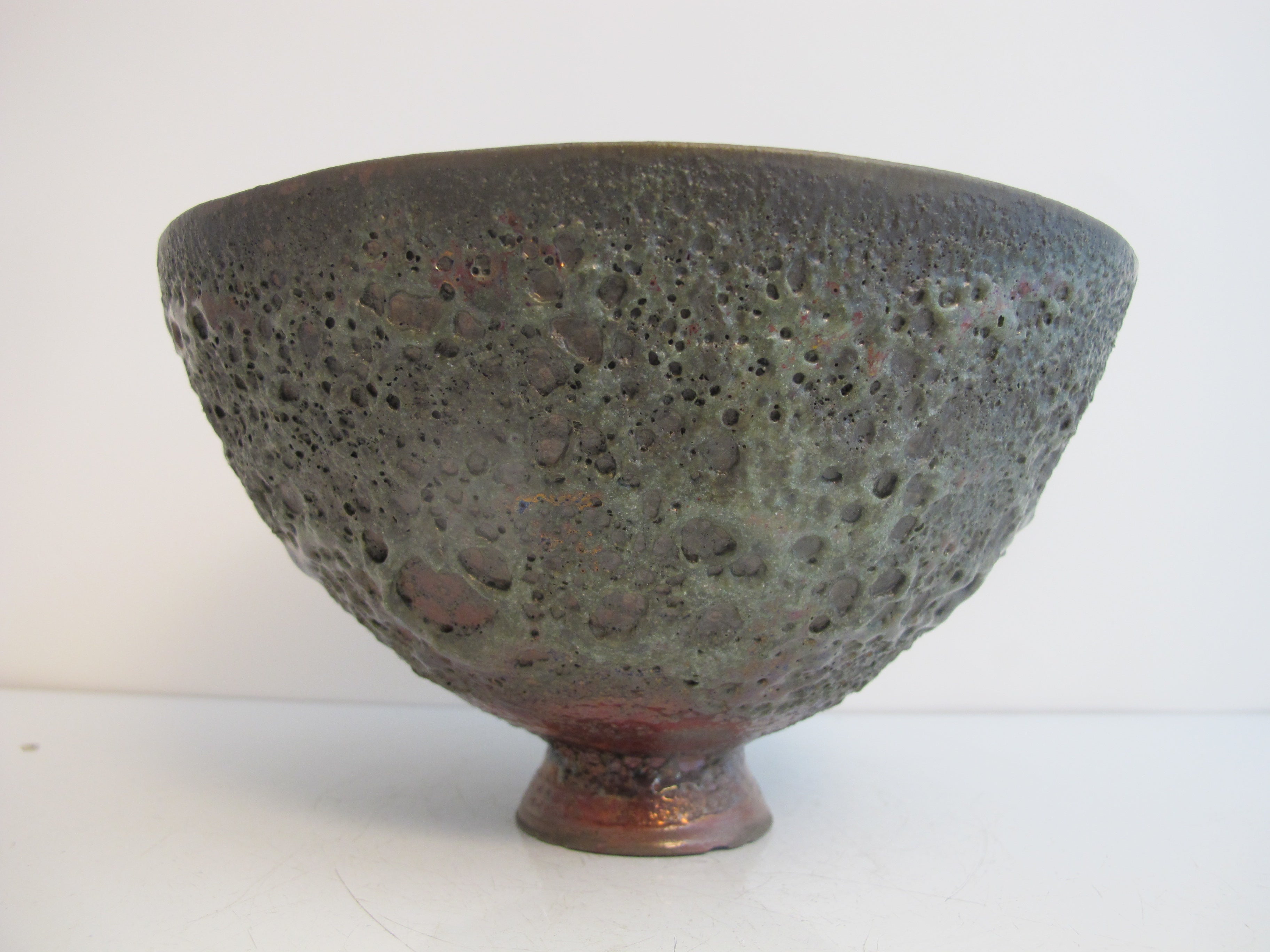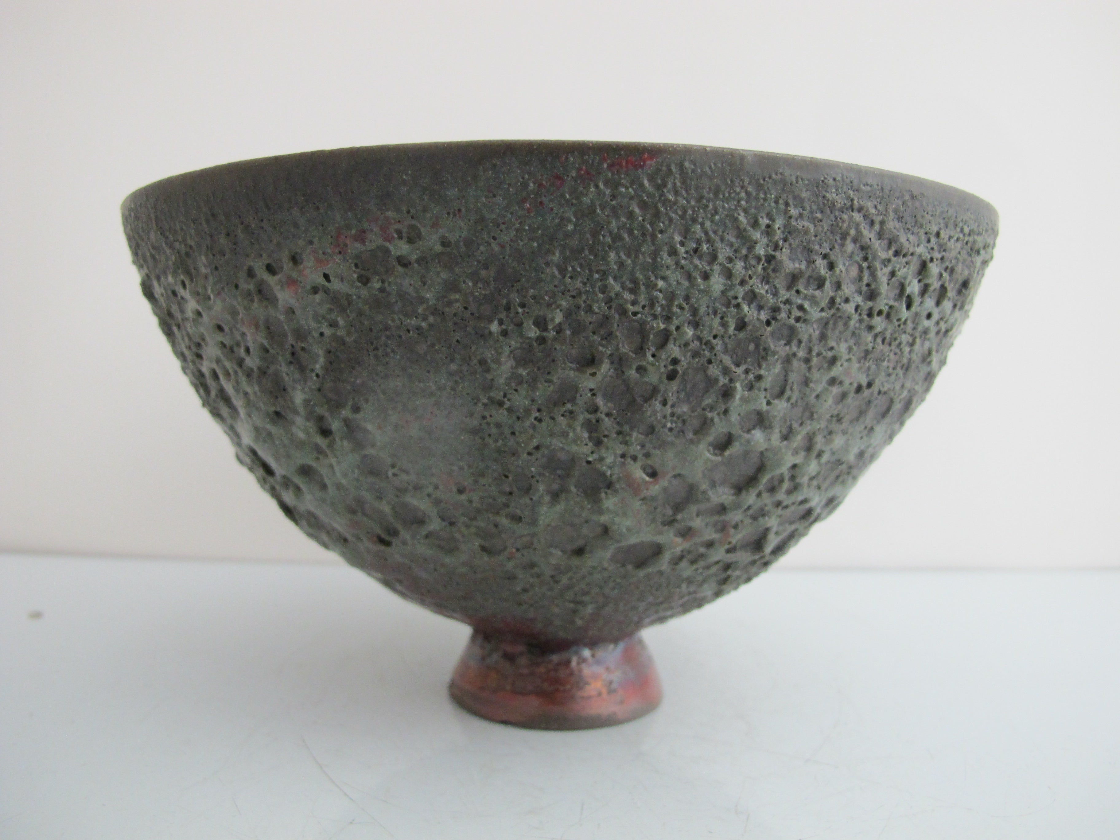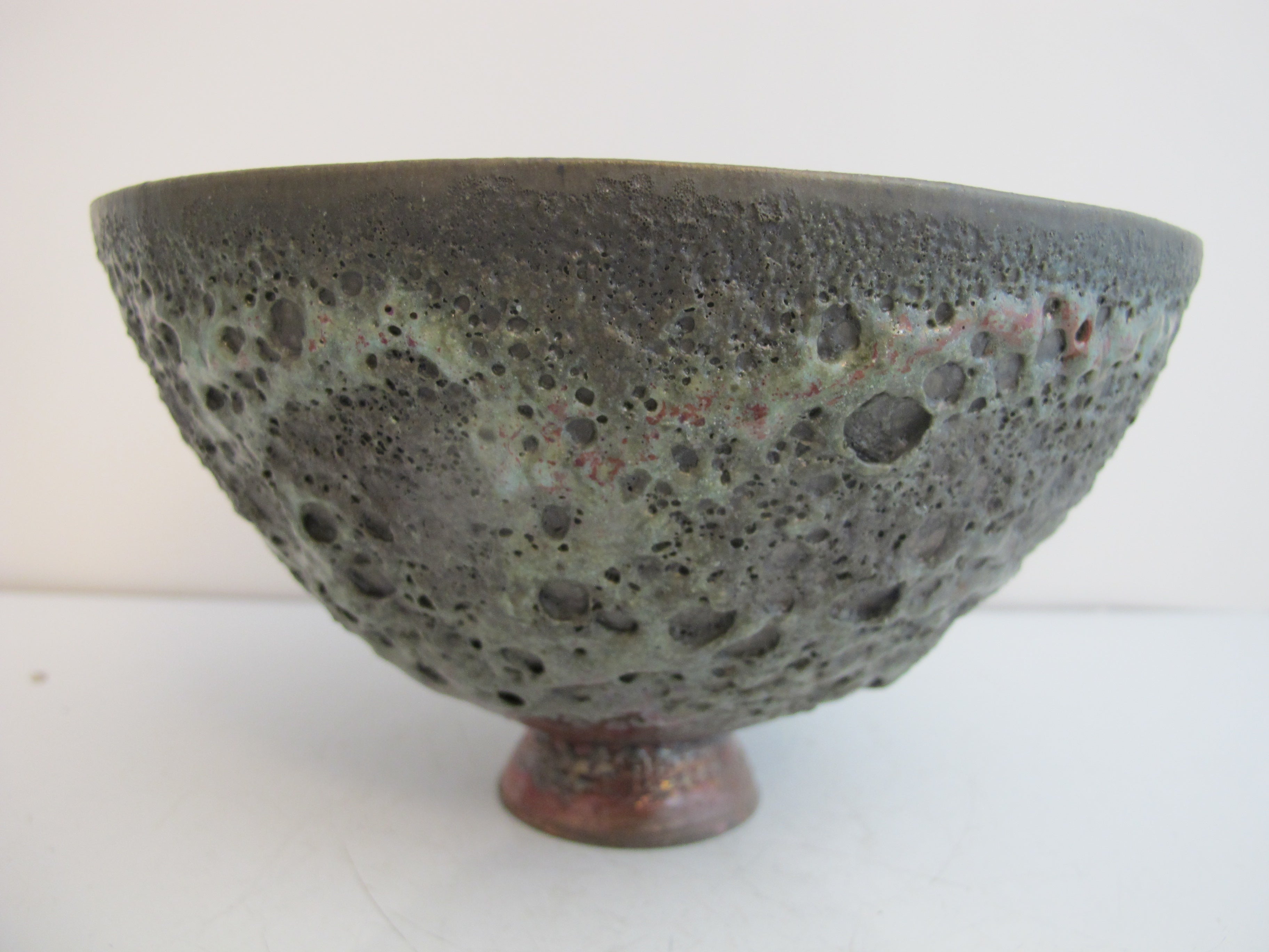 Beatrice Wood (Beato) earthenware pottery bowl. Heavily textured, deeply porous 'volcanic' pottery with in mostly red iridescent glaze. Signed Beato at base.