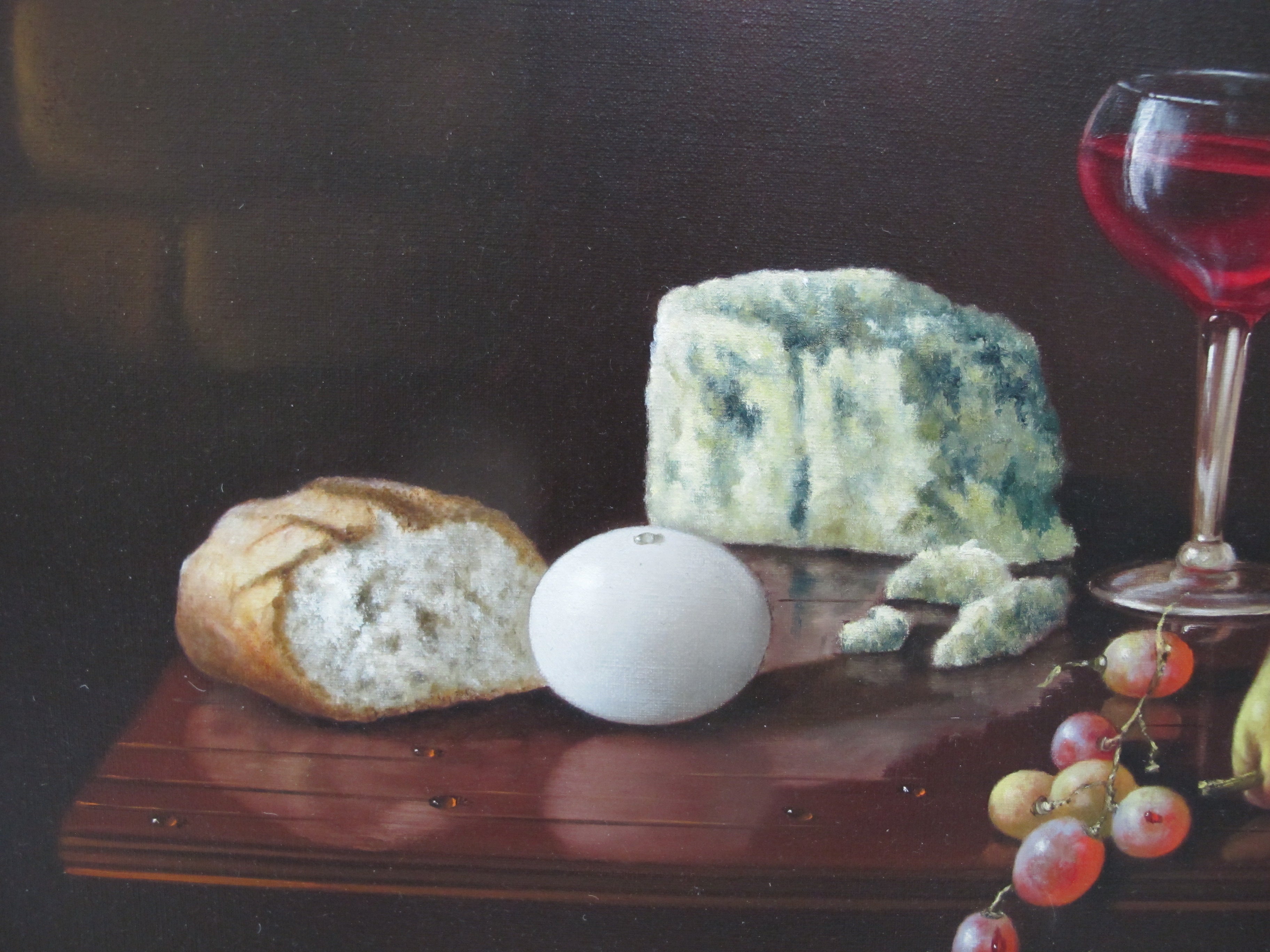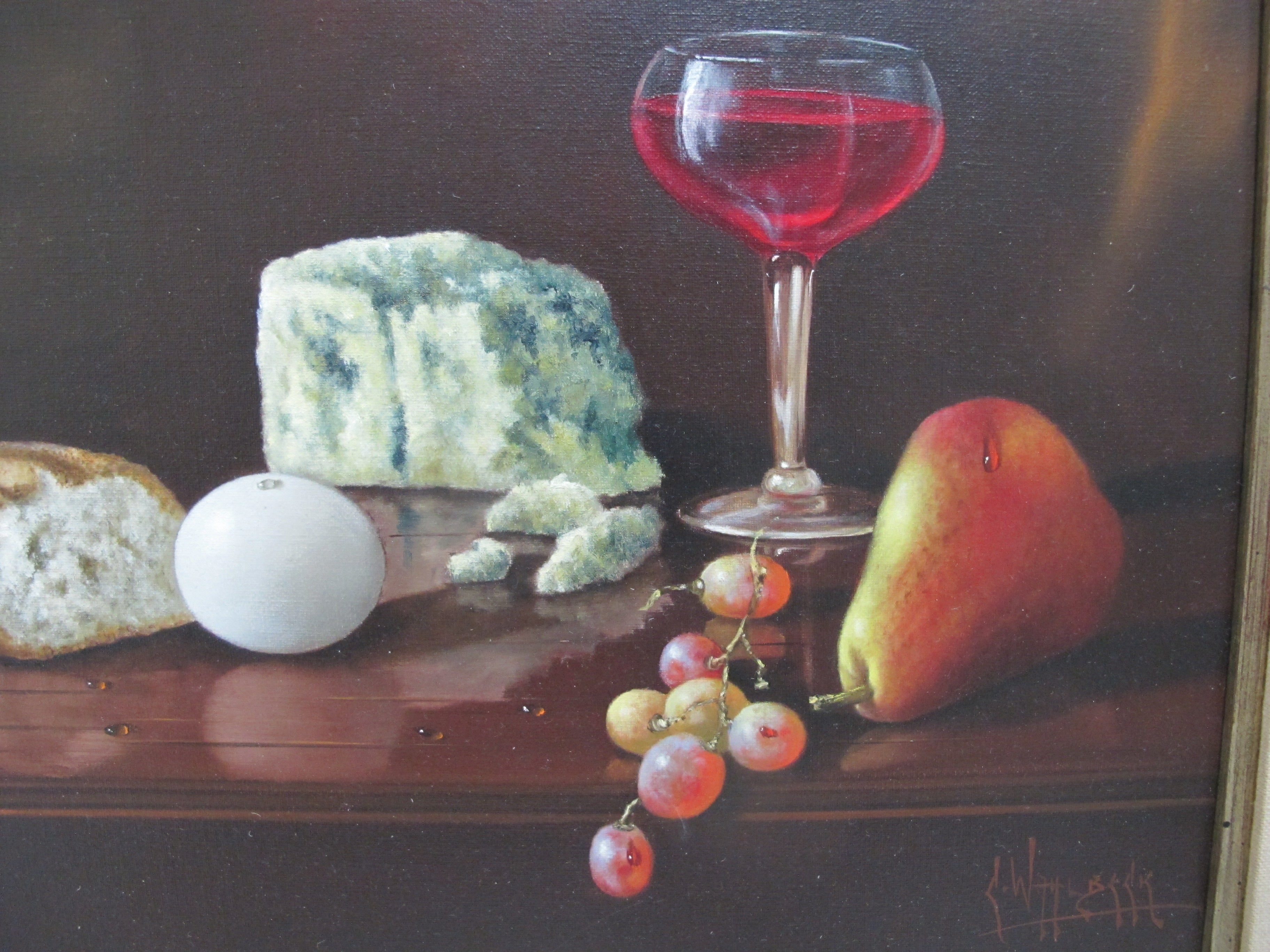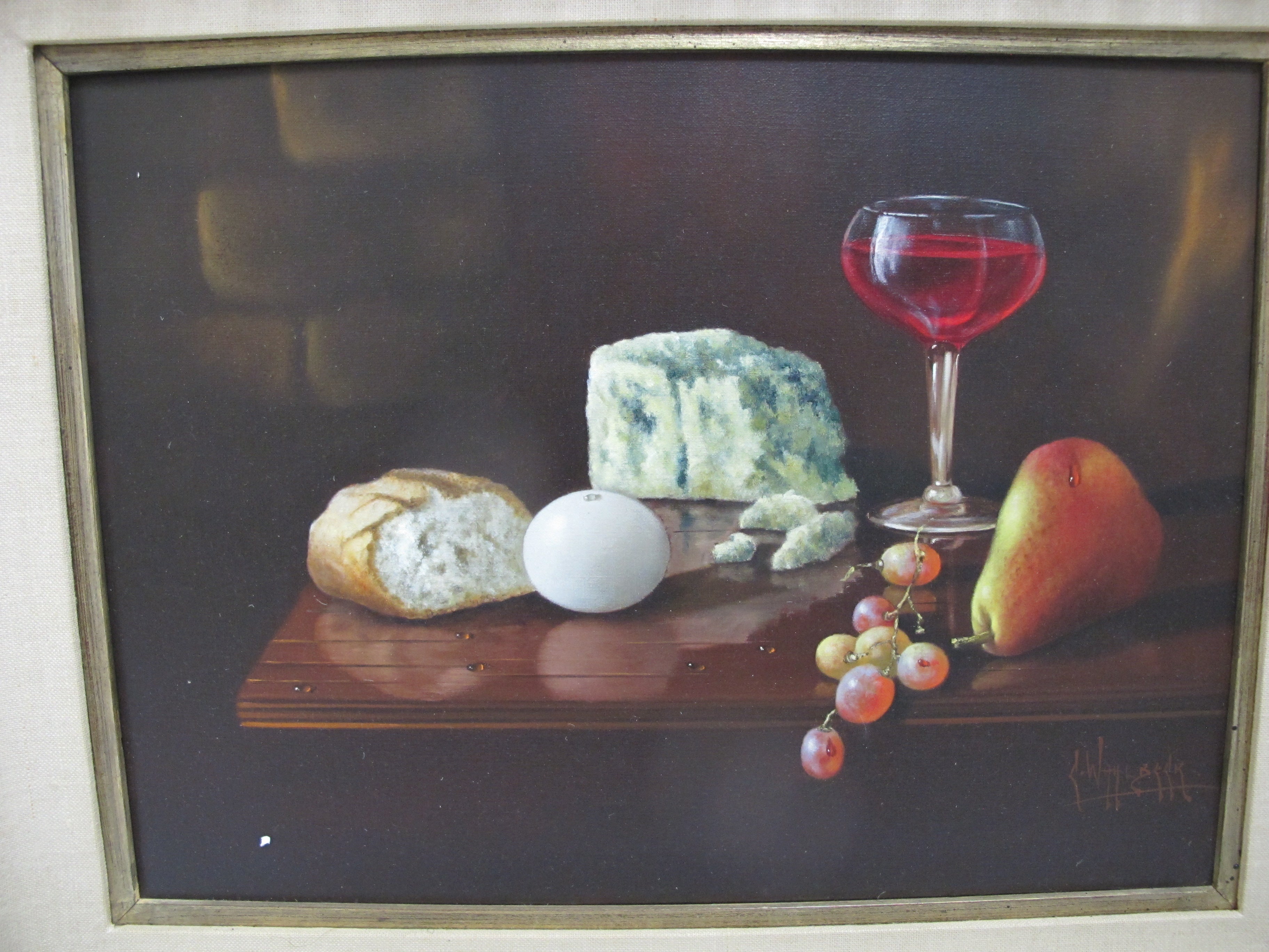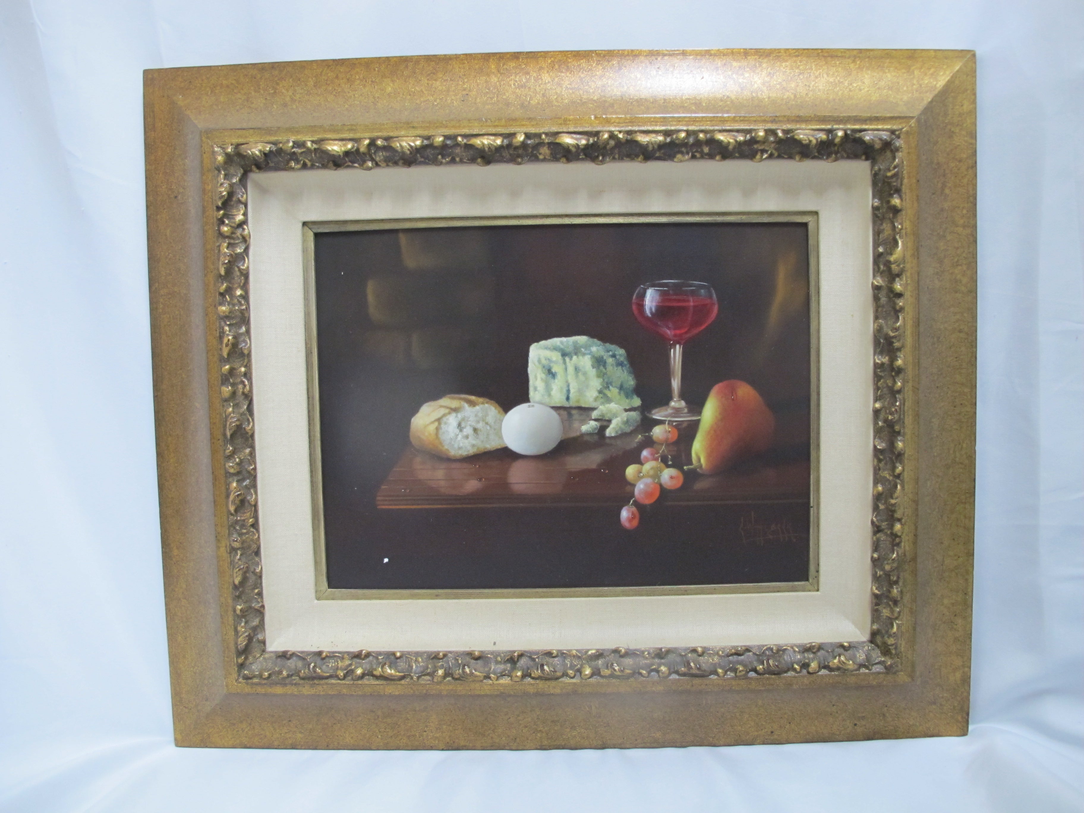 CARLO WAHLBECK Gold Frame Fruit Cheese Bread & Wine STILL LIFE Oil Painting