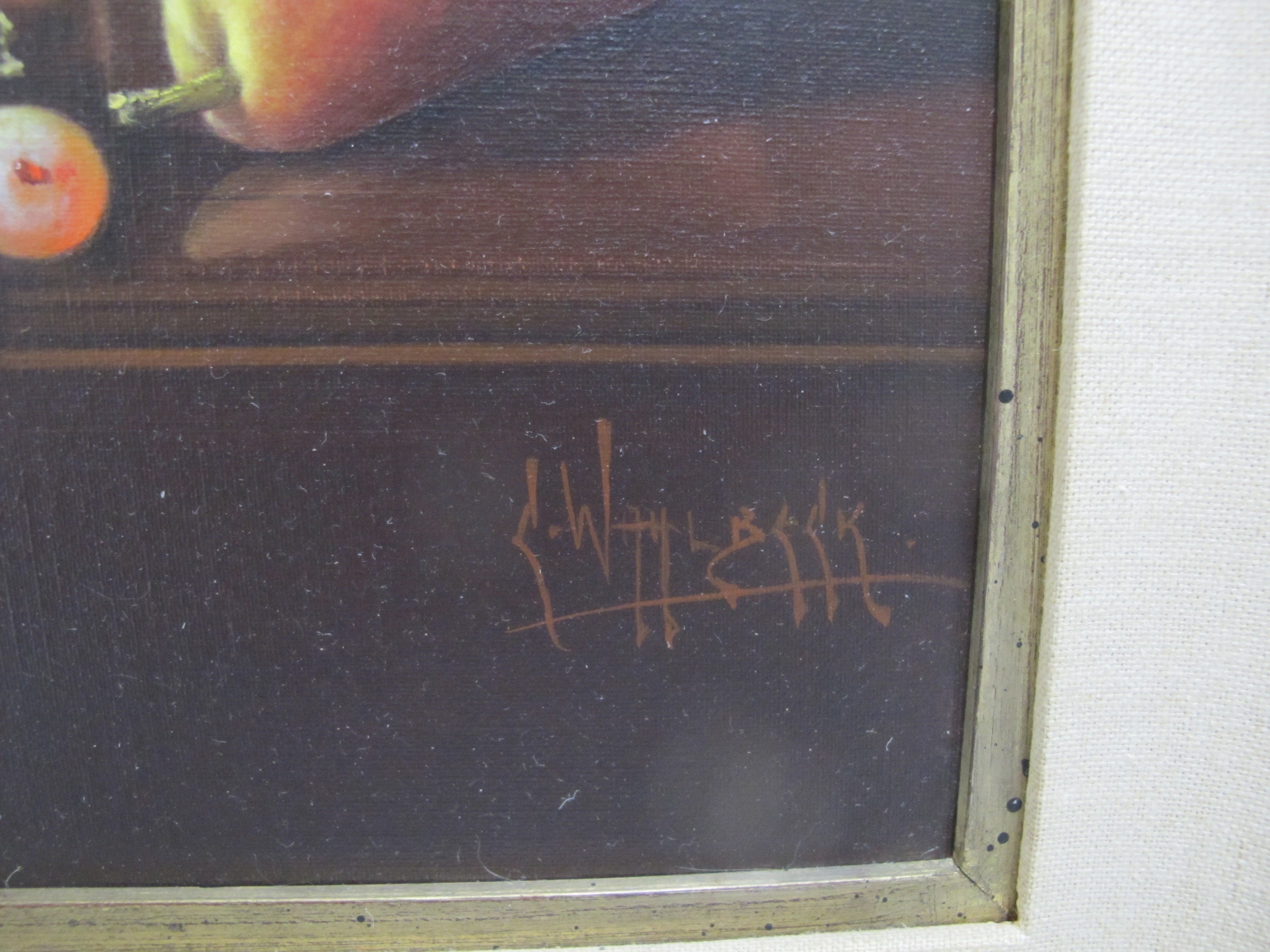Carlo Wahlbeck, (Sweden/USA, b.1933) framed still life oil painting on canvas. Fruit, cheese, wine, and bread on table top. Signed at lower right. Ornate gilt frame measures 26" x 22". Excellent condition.