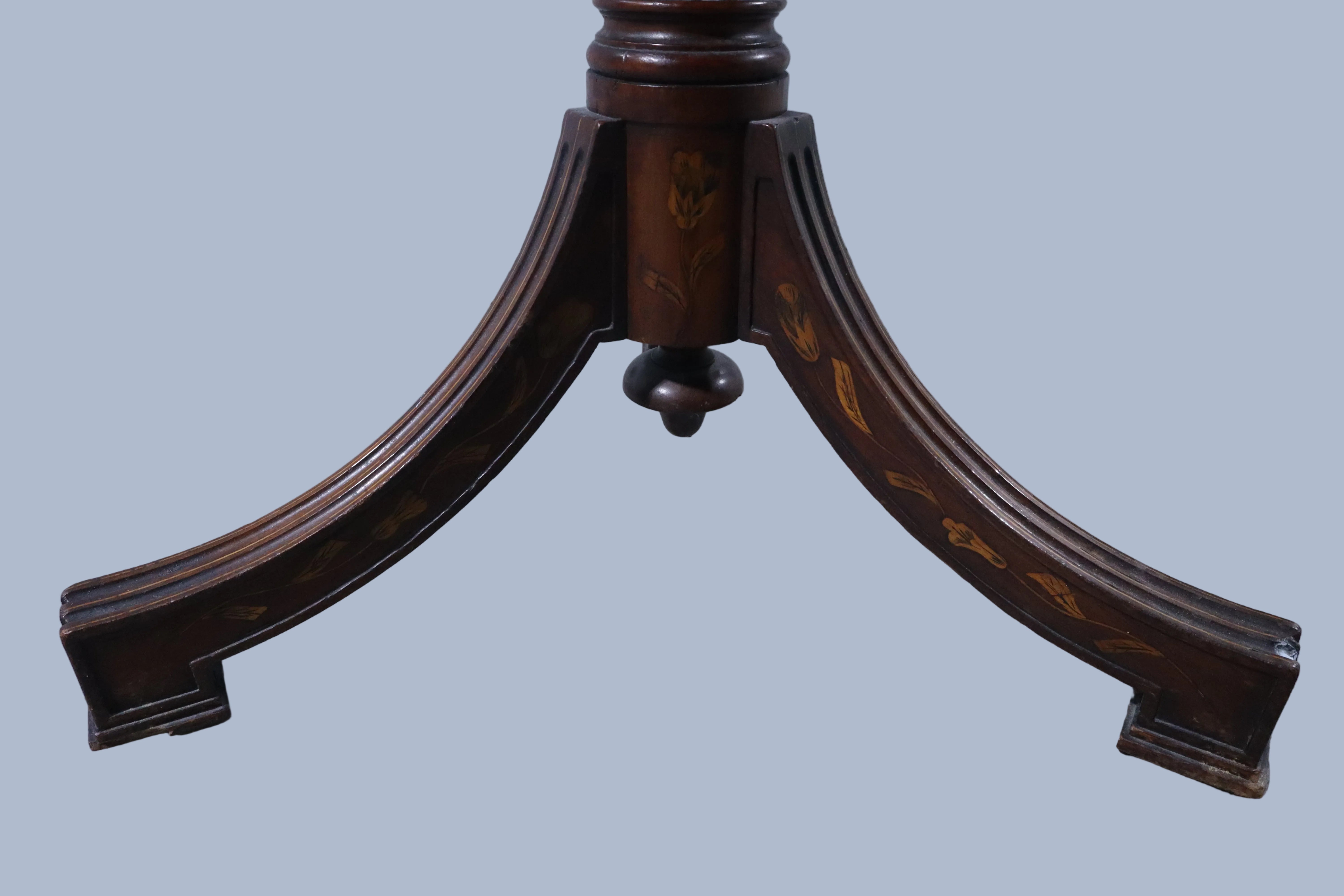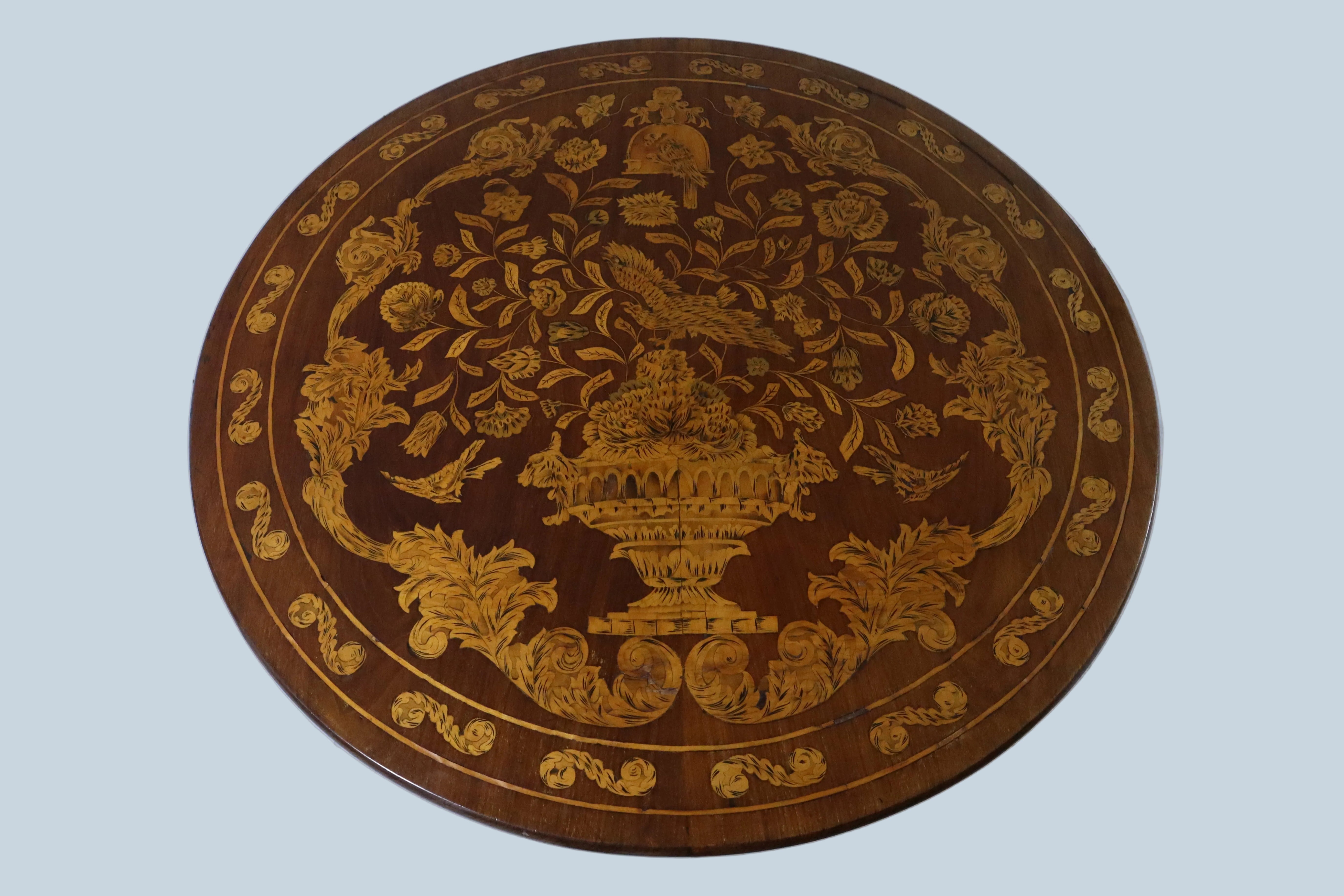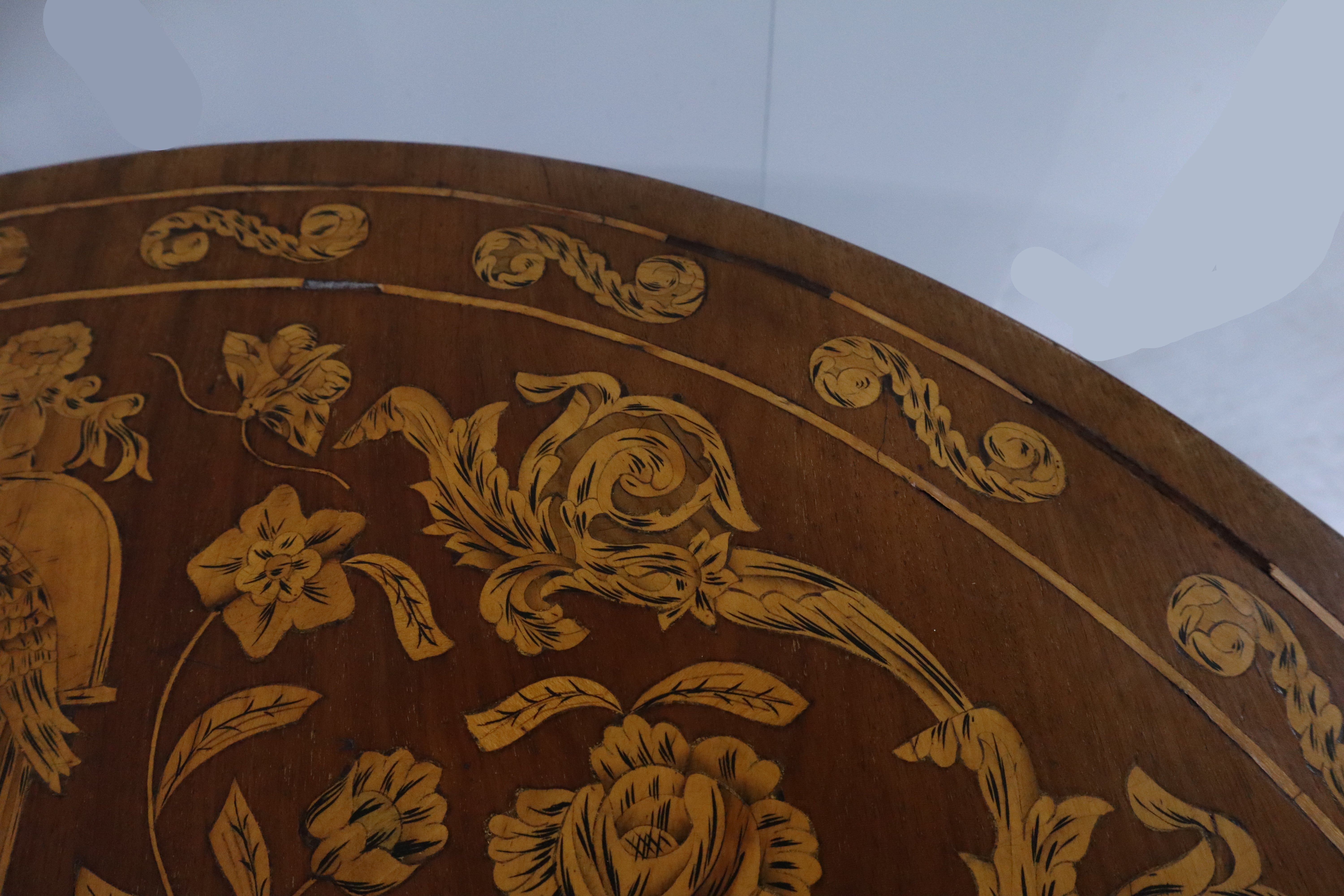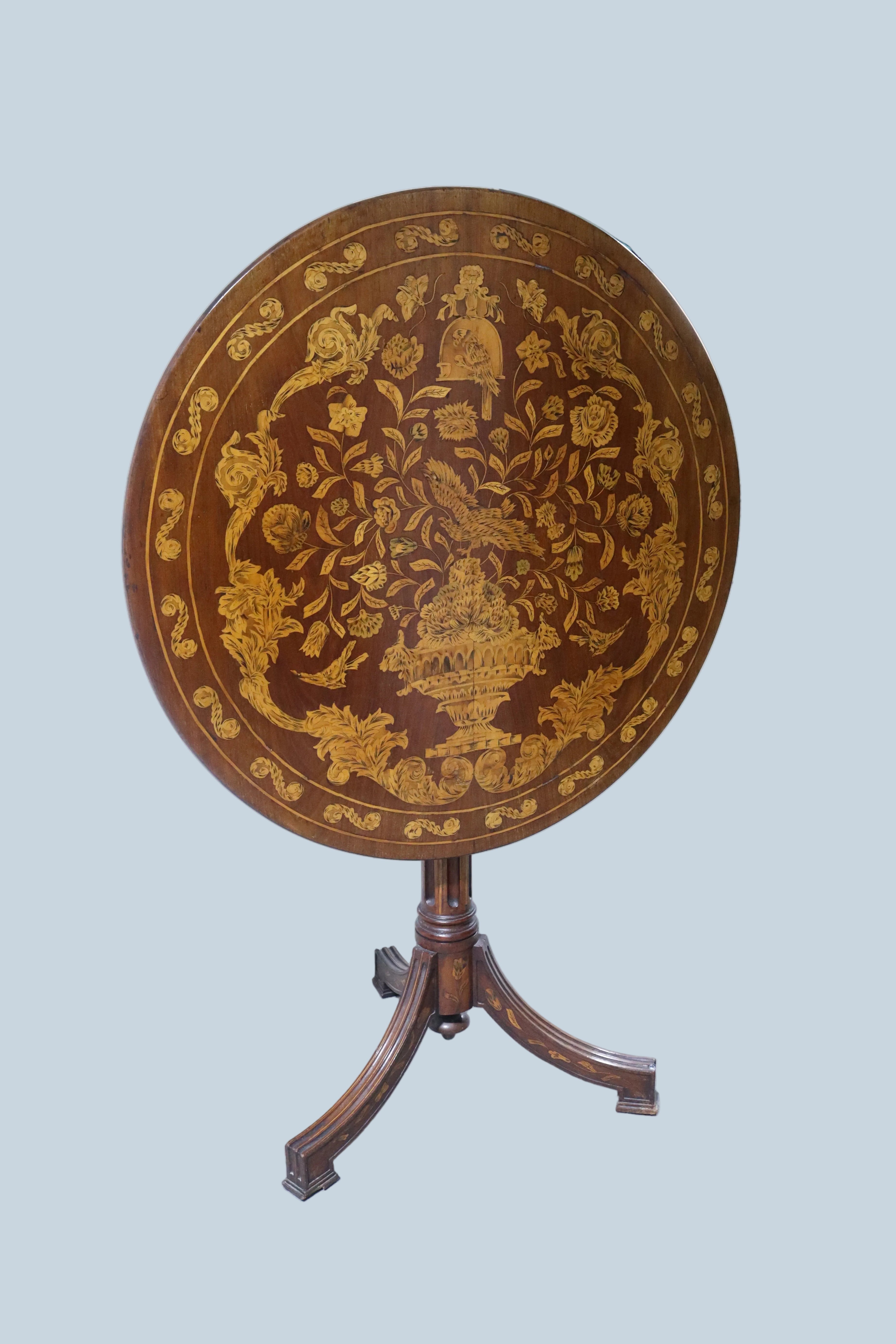 Wonderfully crafted circular flip top table with a floral motif surrounding a Roman antiquity style vase and a bird in flight. Single stem leg in the middle of the table that separates into tripod feet. The base of the table is also decorated with floral marquetry. There is a locking mechanism for the table face when it's in its up position, makes for a very sturdy surface!