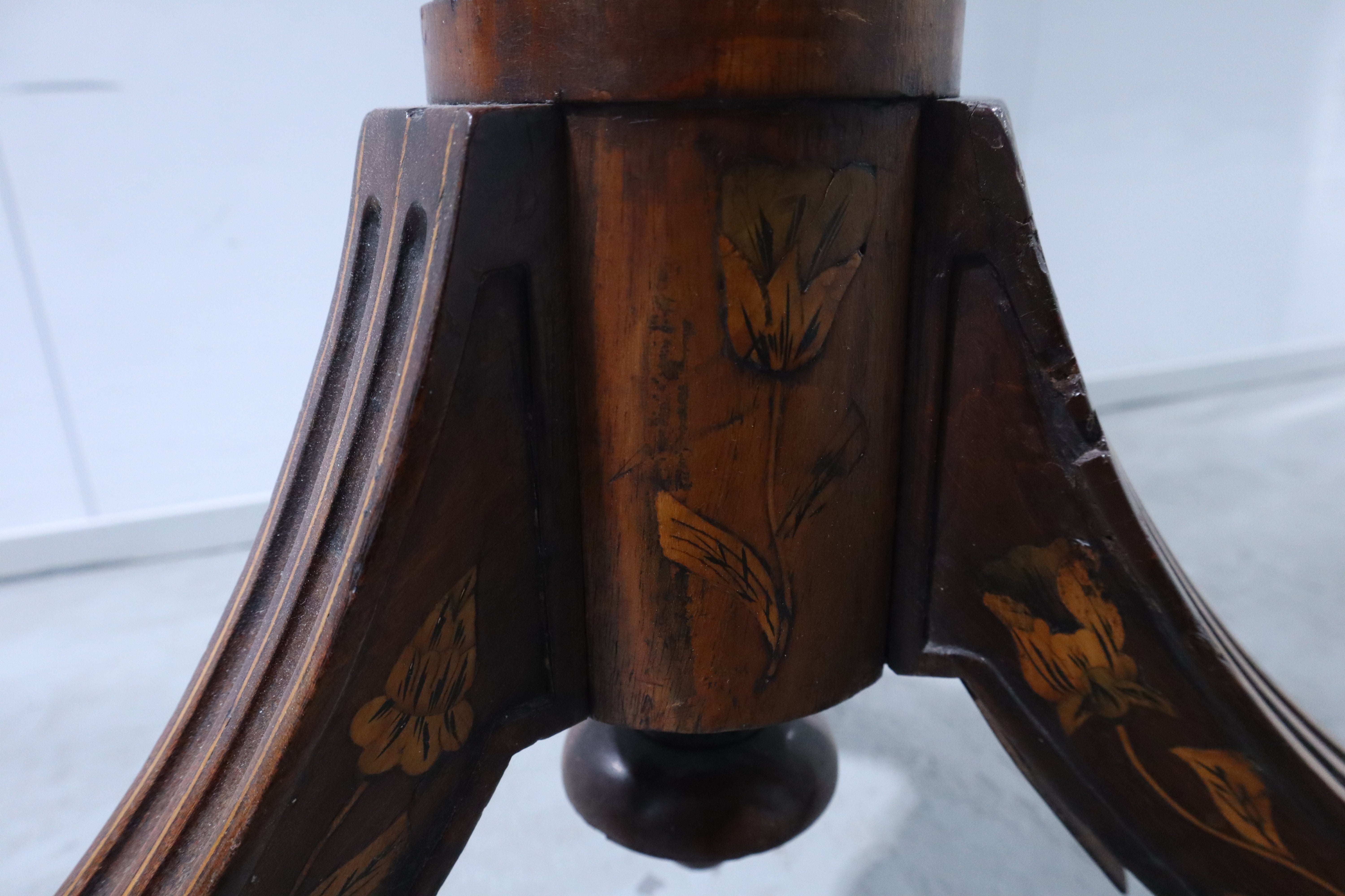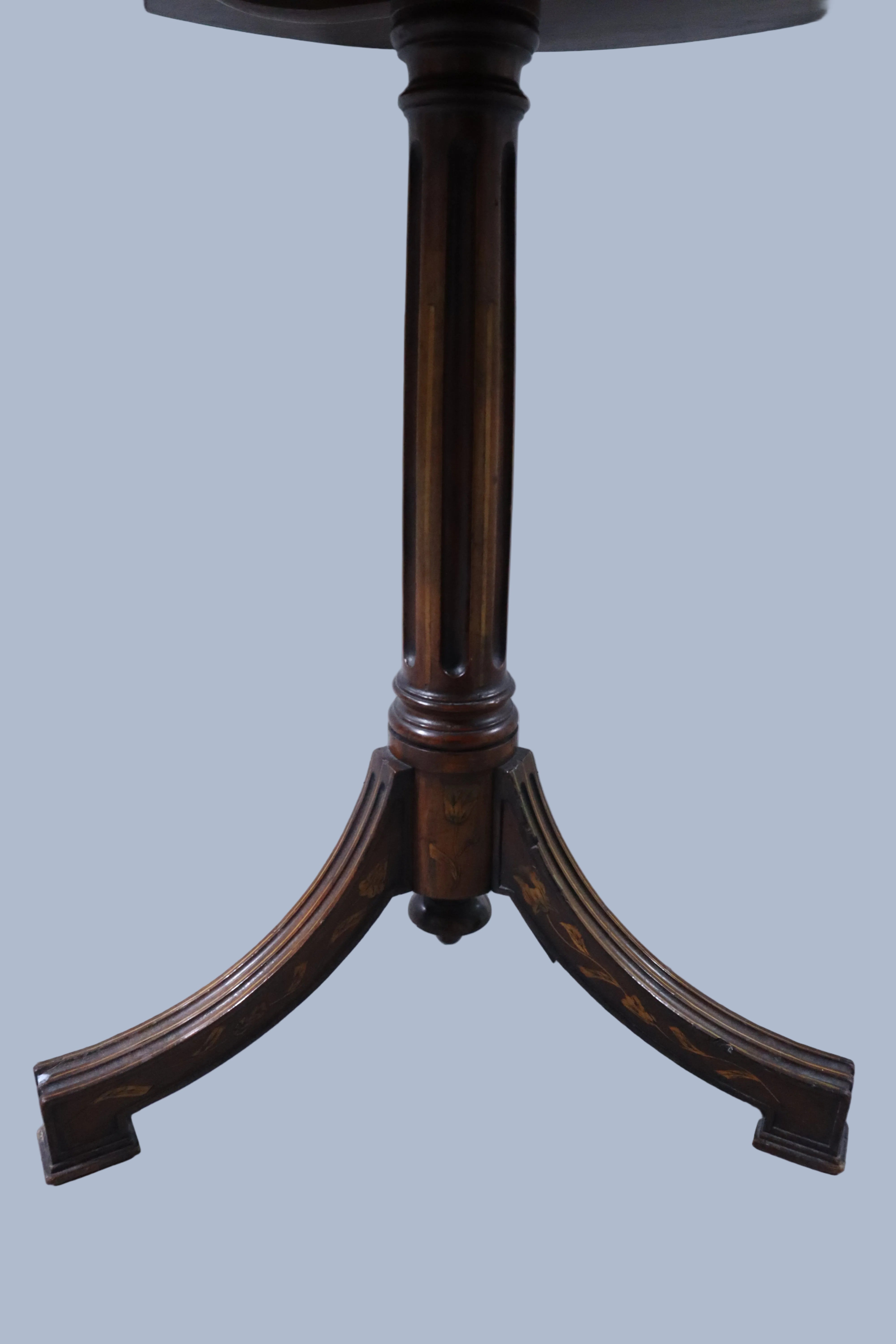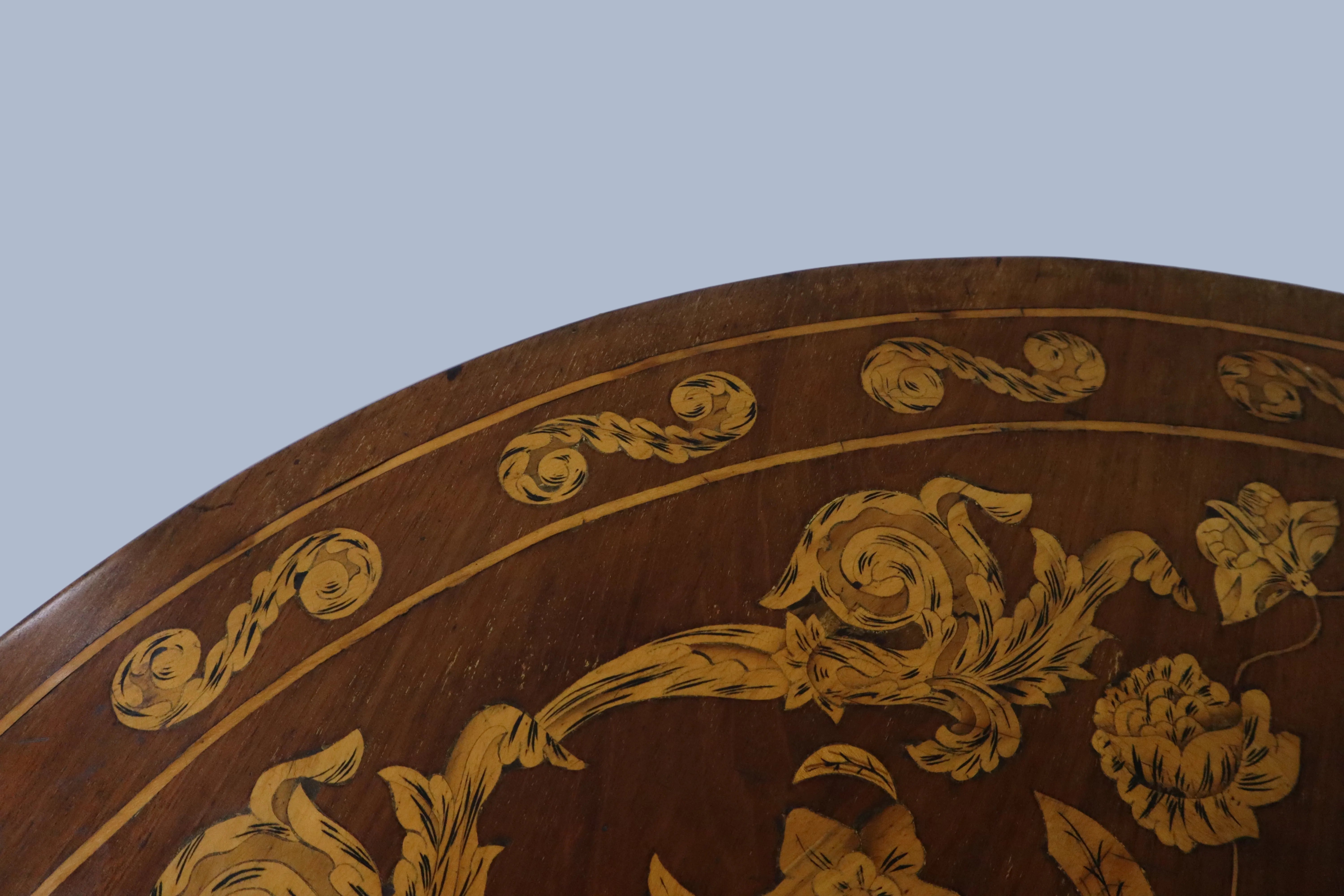 Wonderfully crafted circular flip top table with a floral motif surrounding a Roman antiquity style vase and a bird in flight. Single stem leg in the middle of the table that separates into tripod feet. The base of the table is also decorated with floral marquetry. There is a locking mechanism for the table face when it's in its up position, makes for a very sturdy surface!