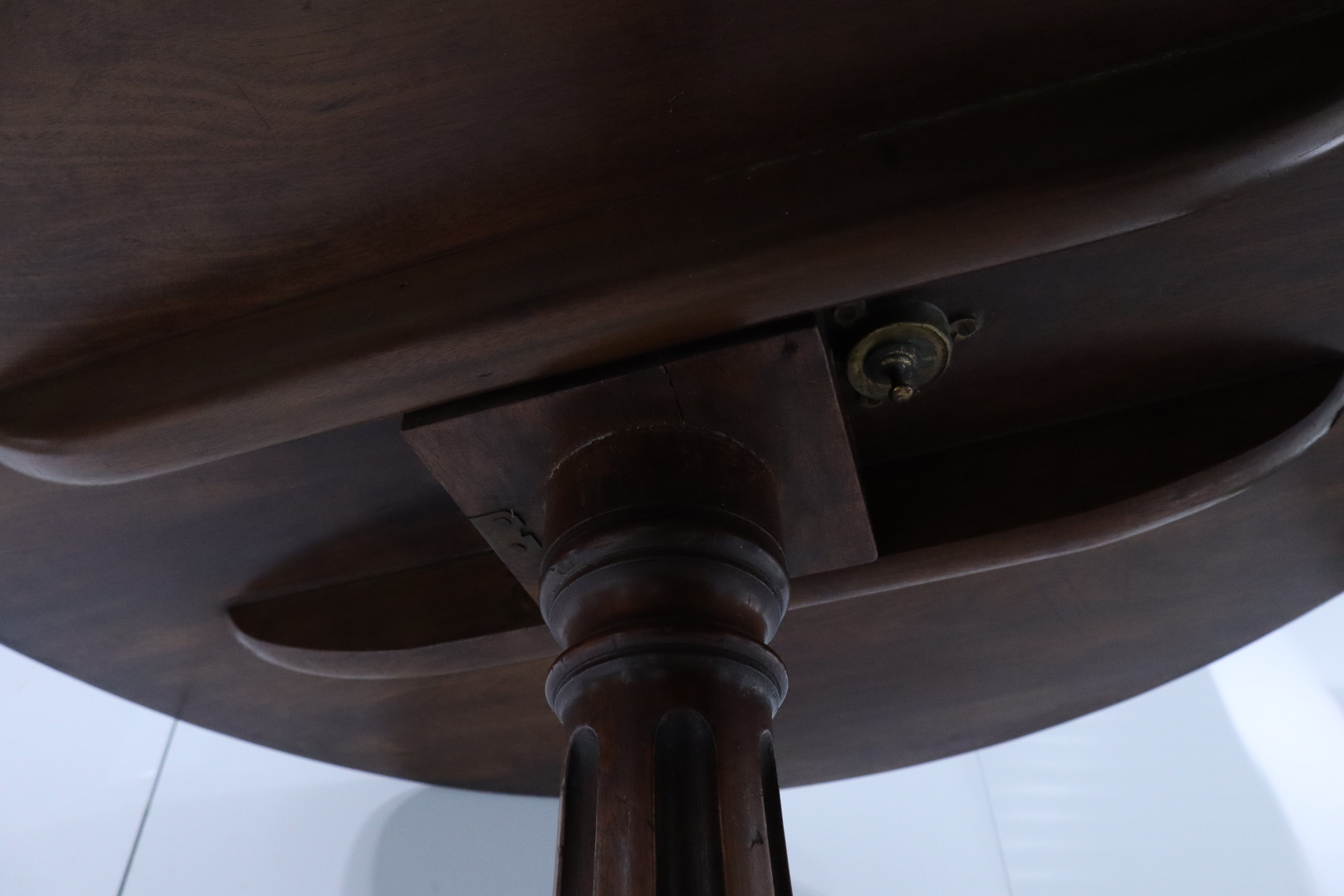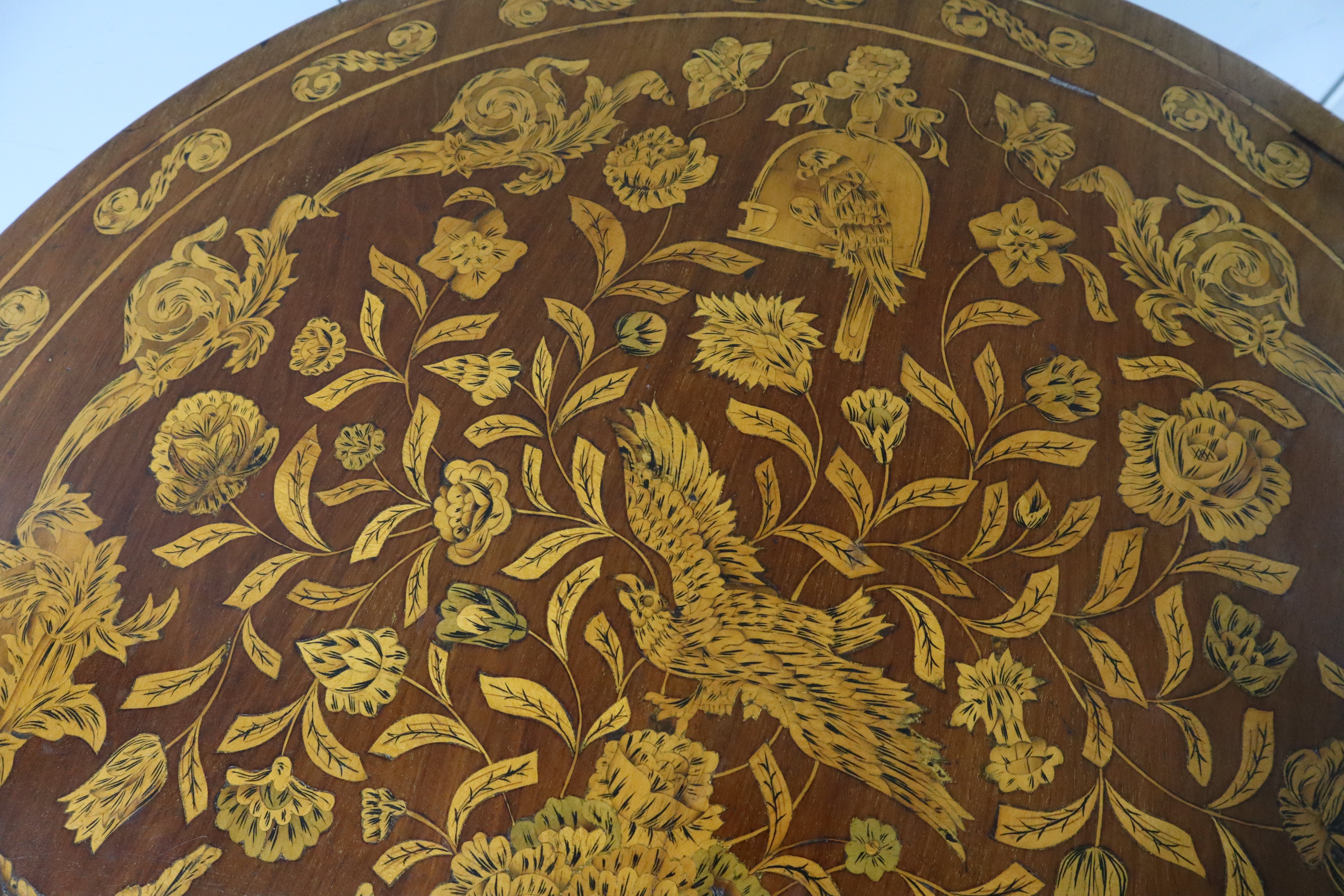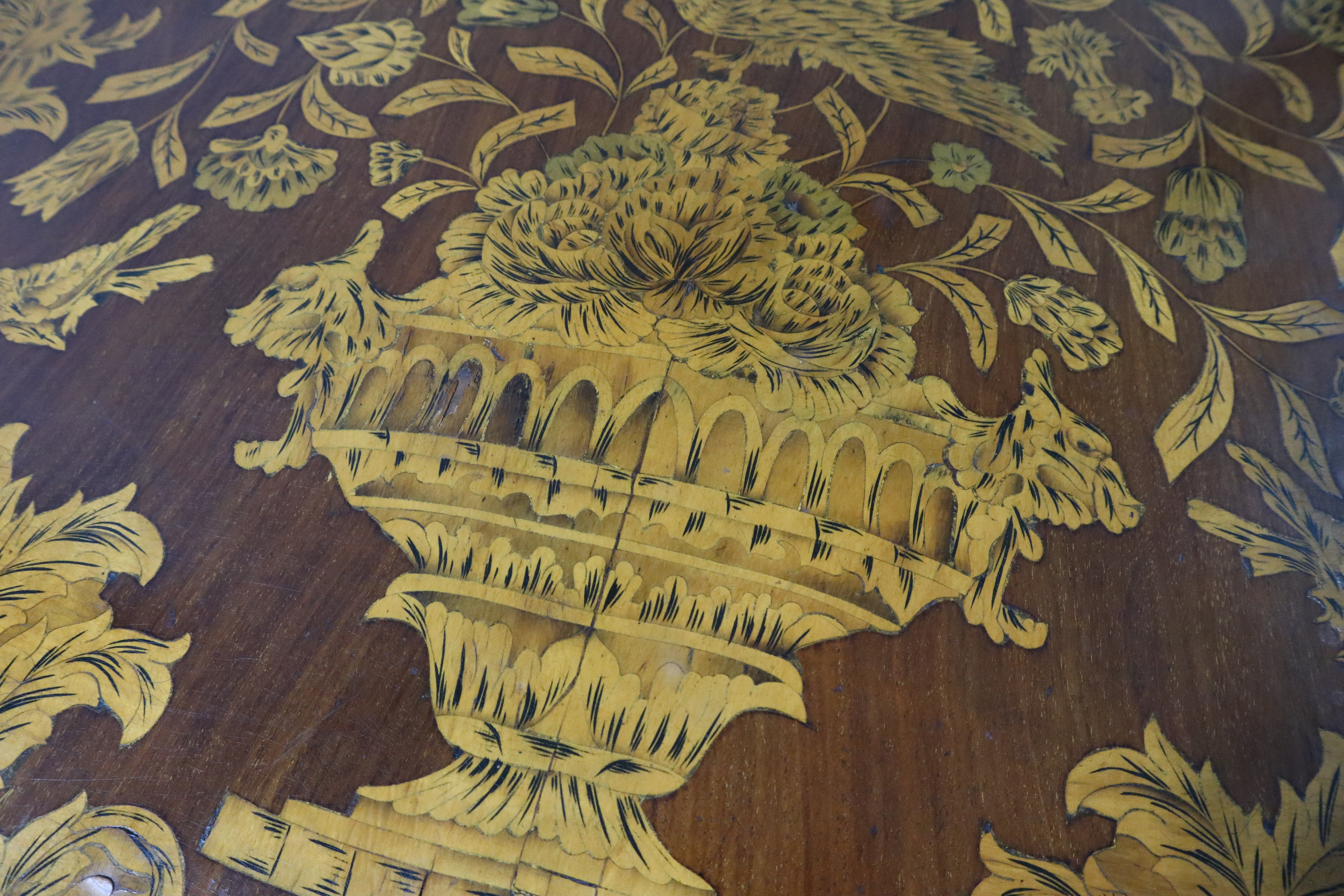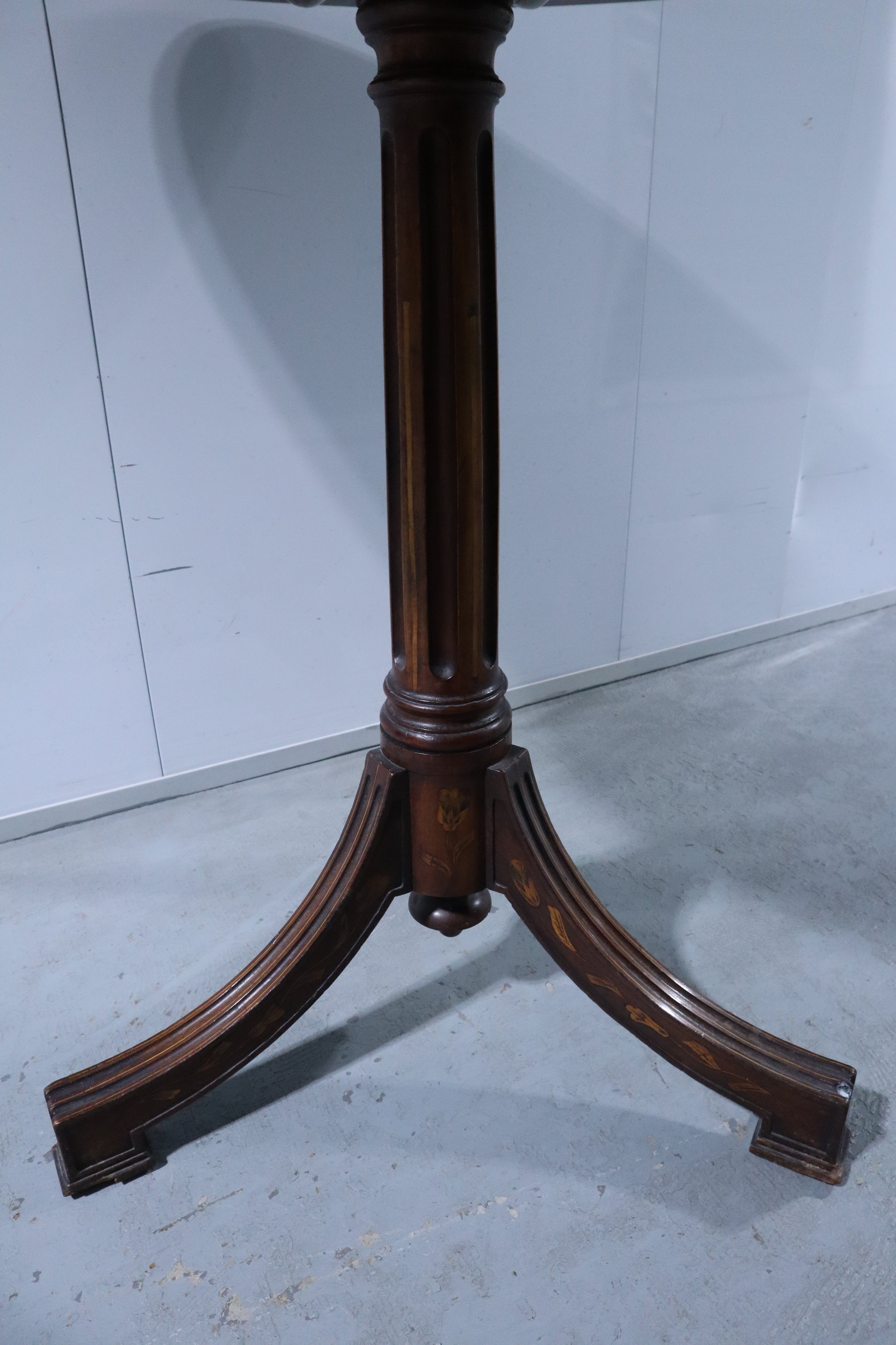 Wonderfully crafted circular flip top table with a floral motif surrounding a Roman antiquity style vase and a bird in flight. Single stem leg in the middle of the table that separates into tripod feet. The base of the table is also decorated with floral marquetry. There is a locking mechanism for the table face when it's in its up position, makes for a very sturdy surface!