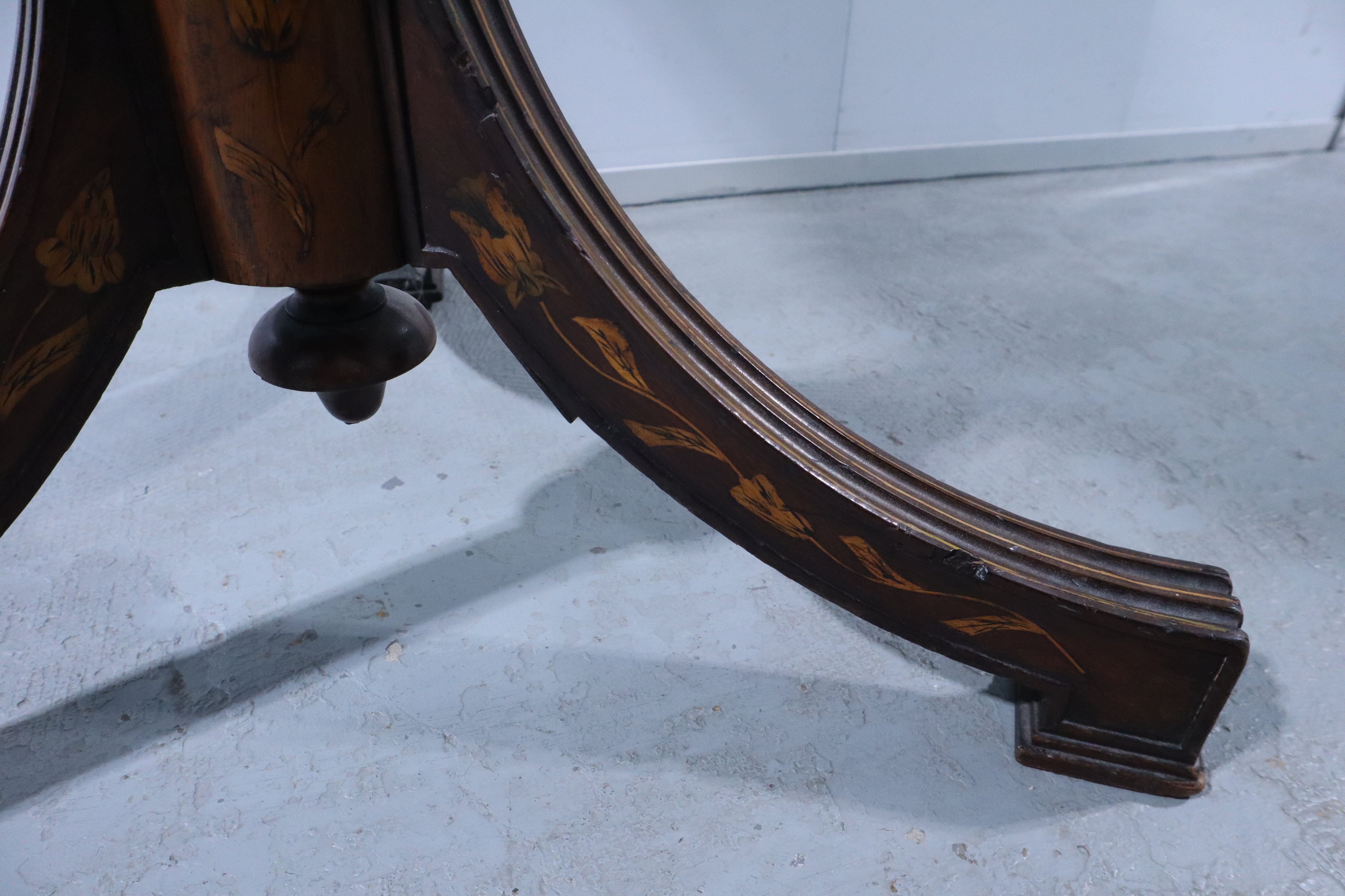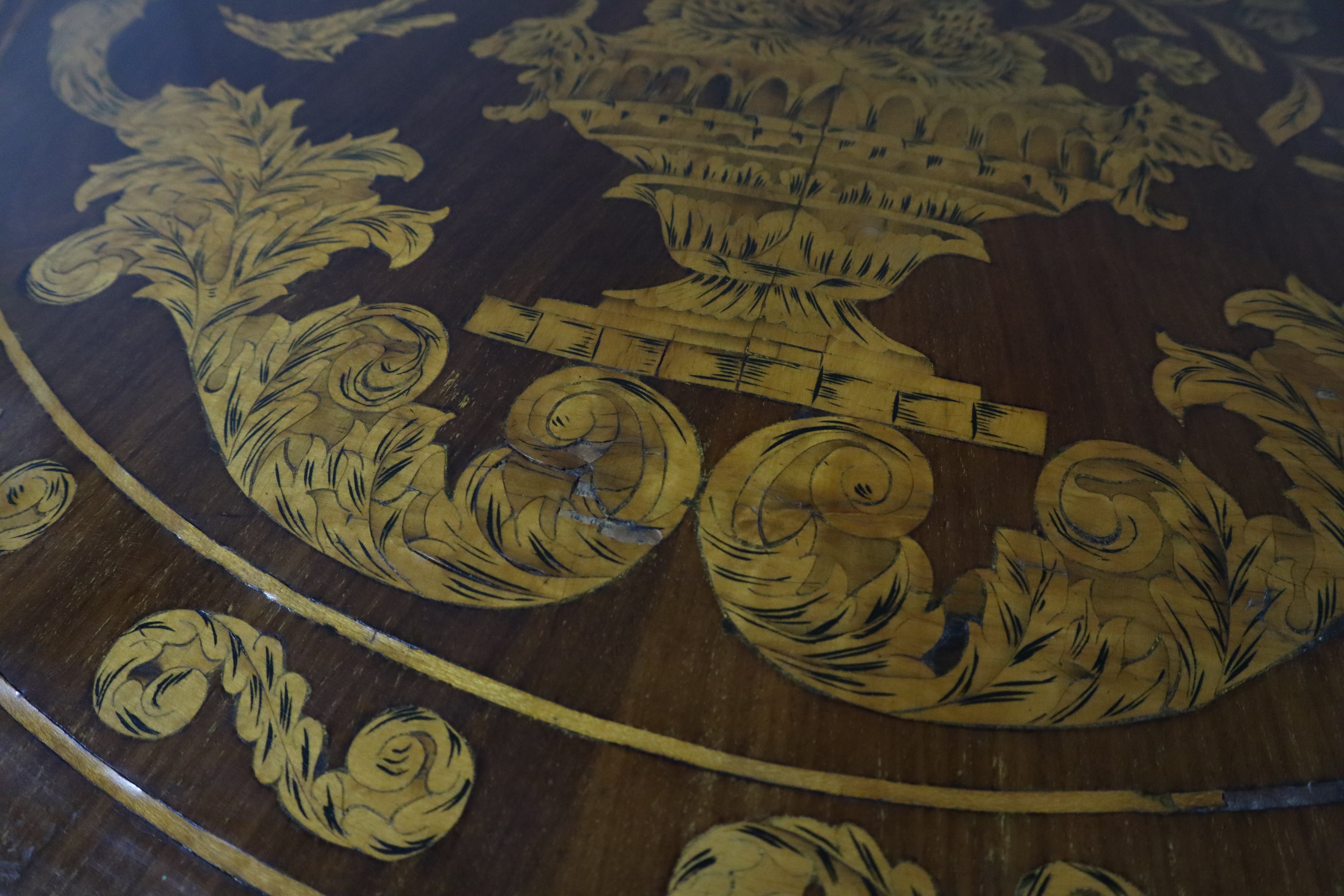 Great condition, wear is consistent with age. Some small sections of marquetry on the tables surface are missing.