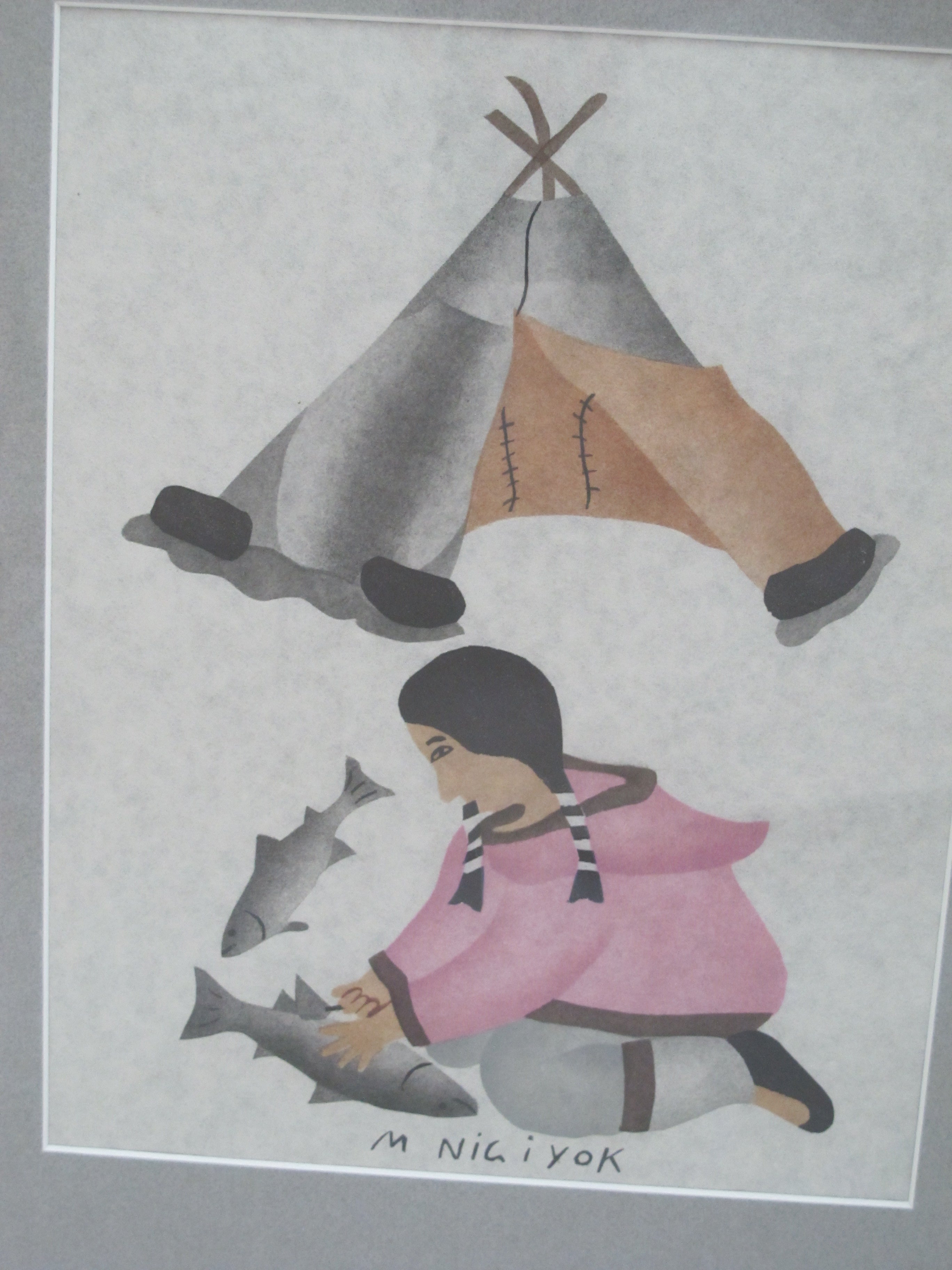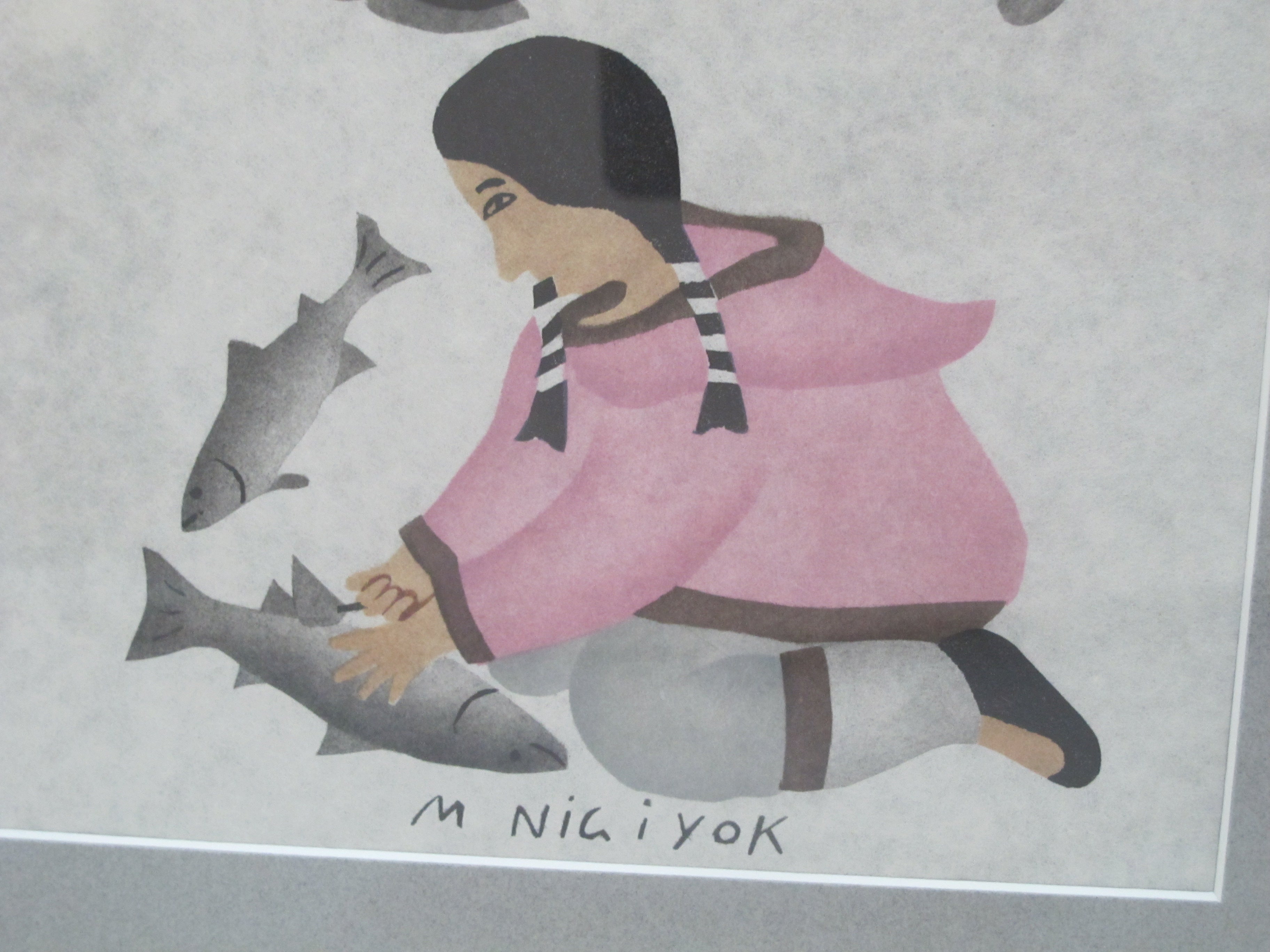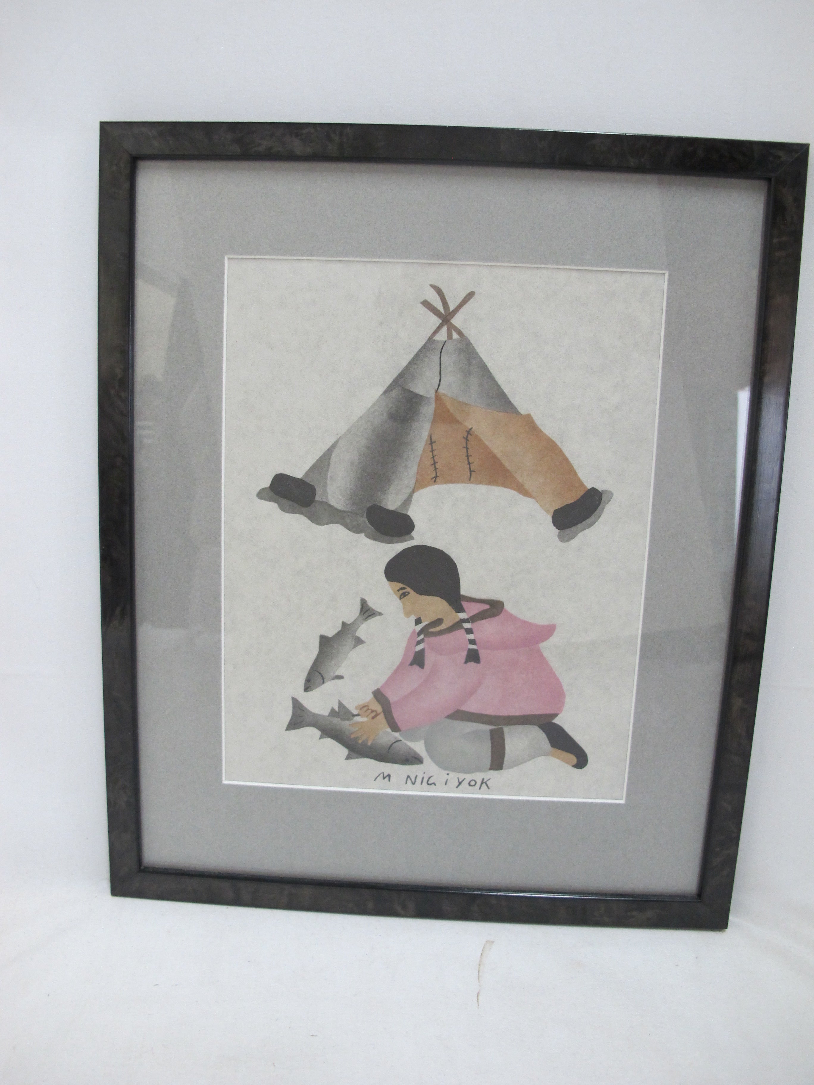 INUIT Canadian MABEL NIGIYOK Signed Framed CLEANING FISH Stenciled Print