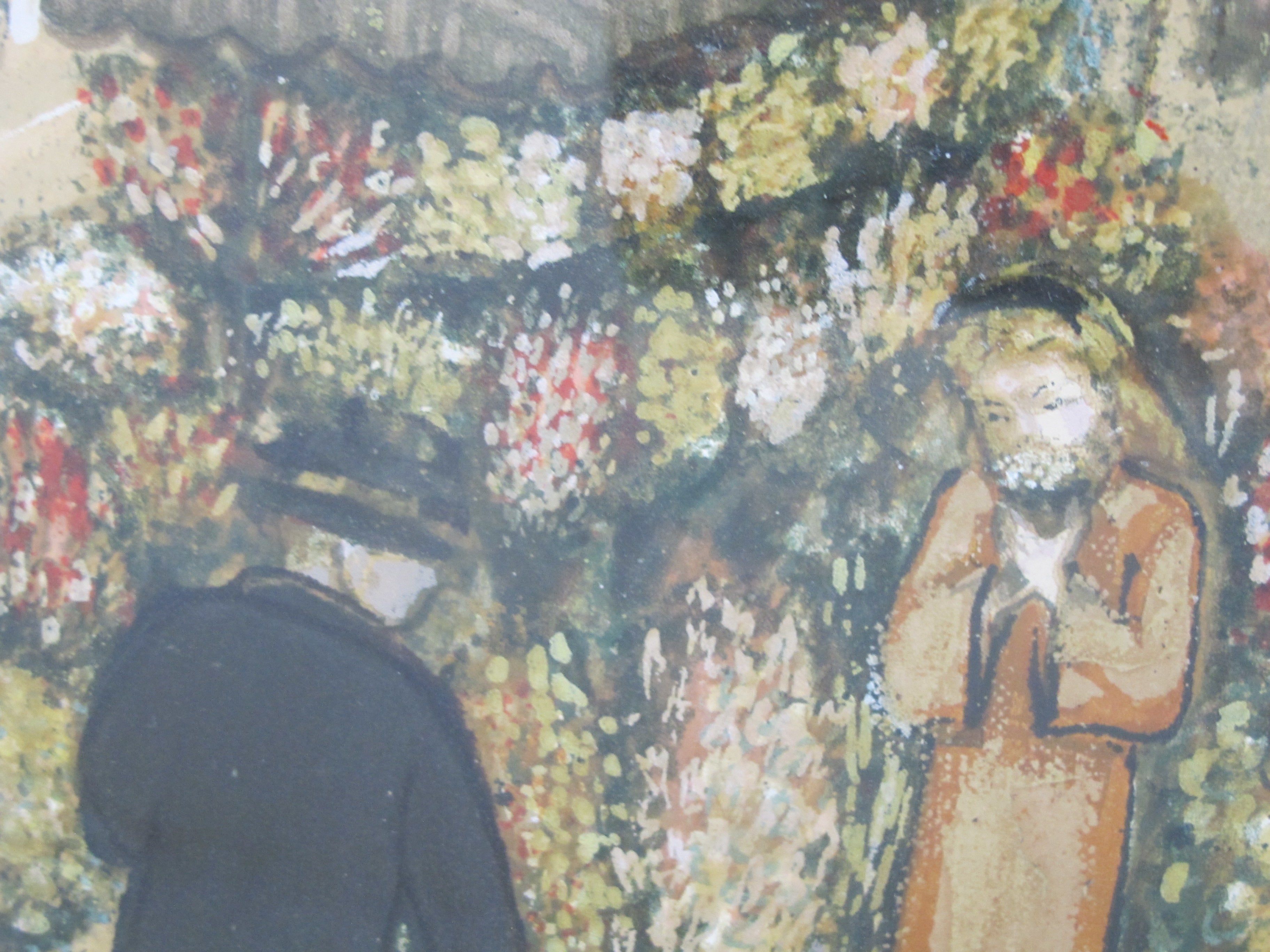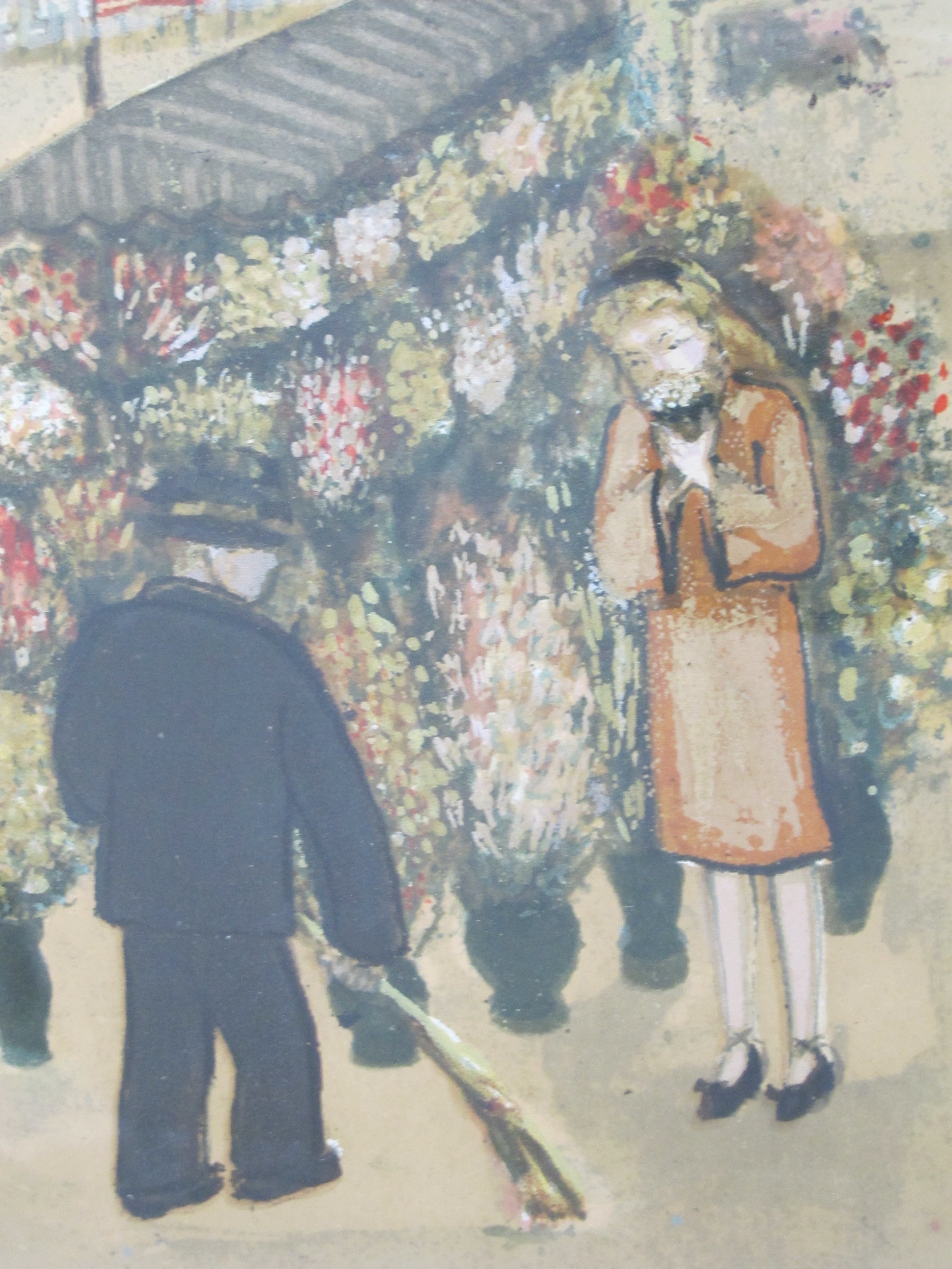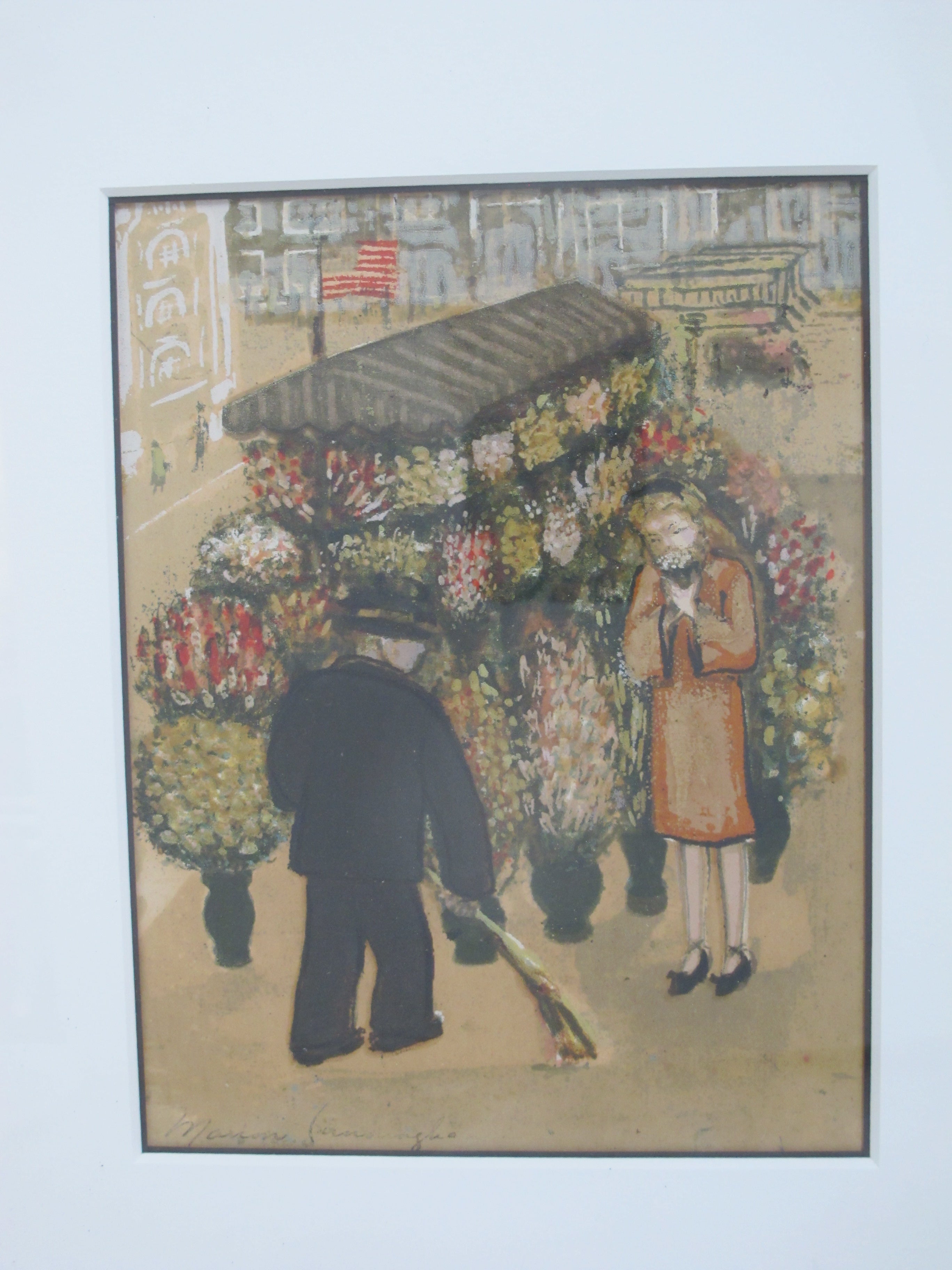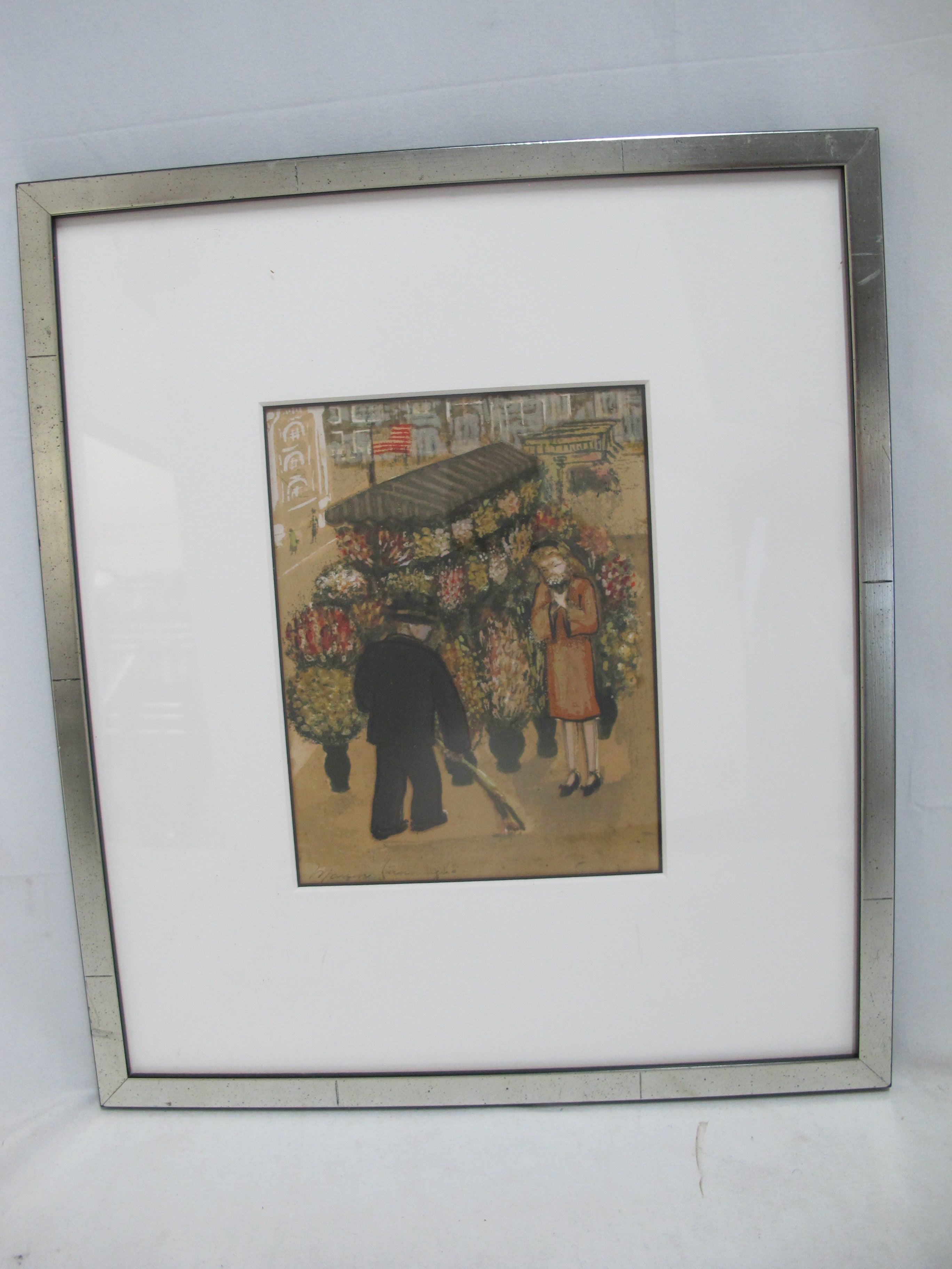 Marion Osborn Cunningham (American, 1908 - 1948) framed hand pulled silkscreen, 'Cable Car Turnaround'. Showing 2 figures stopped at a flower cart.