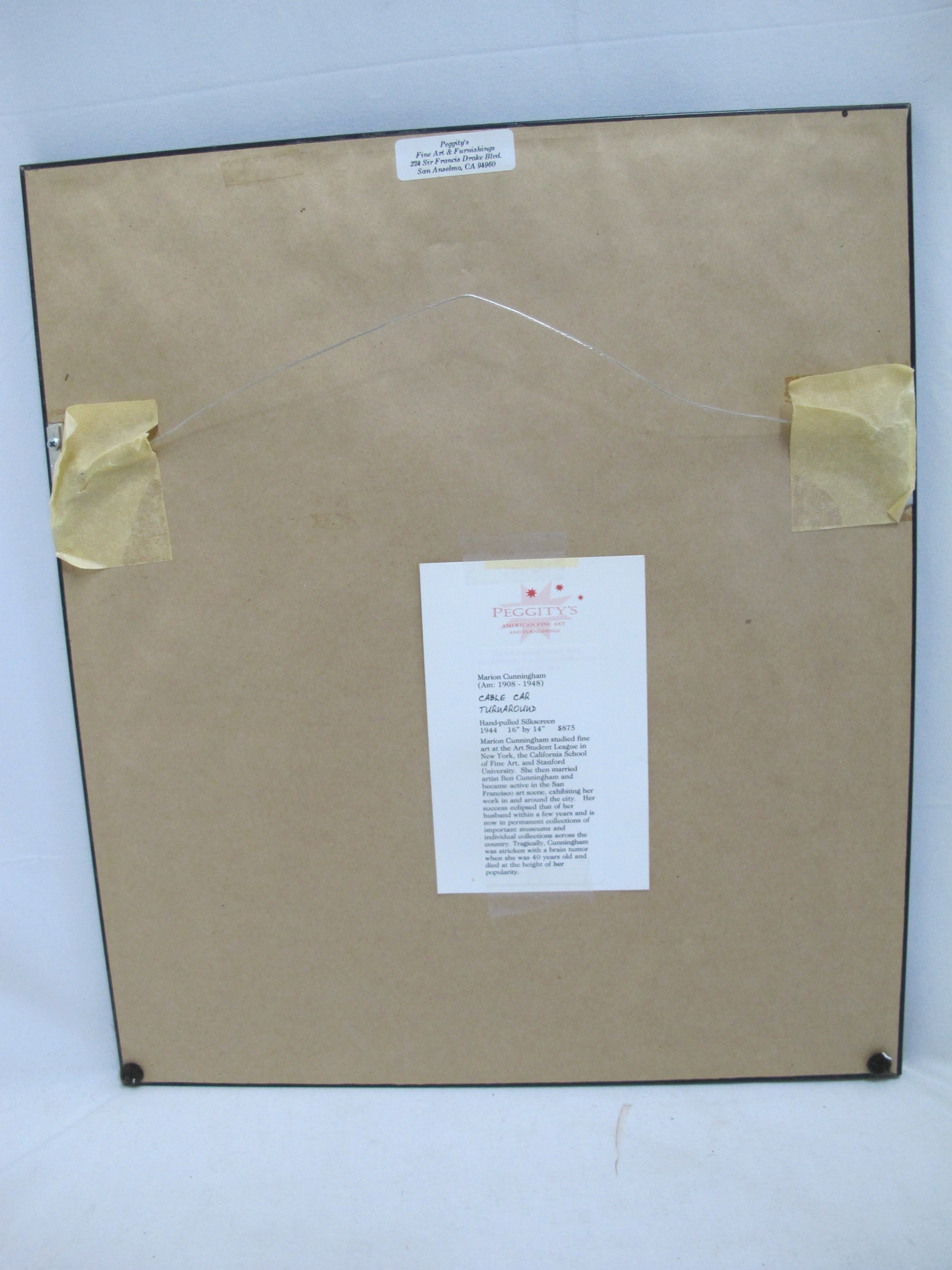 Marion Osborn Cunningham first became known for her pastels and paintings, but quickly turned her attention to the creation of screenprints (silk screens) in the 1930s. She is said to have printed thousands and been specialized in creating greeting cards. We have thus far however been unable to locate any such card. The extent of her artistic output may be overestimated. She died unexpectedly of a brain tumor, while in New York, on her way to Europe, at the age of 39. Her family founded the Cunningham Memorial Art Gallery in her honor in 1956, and it is today known as the Bakersfield Museum of Art.