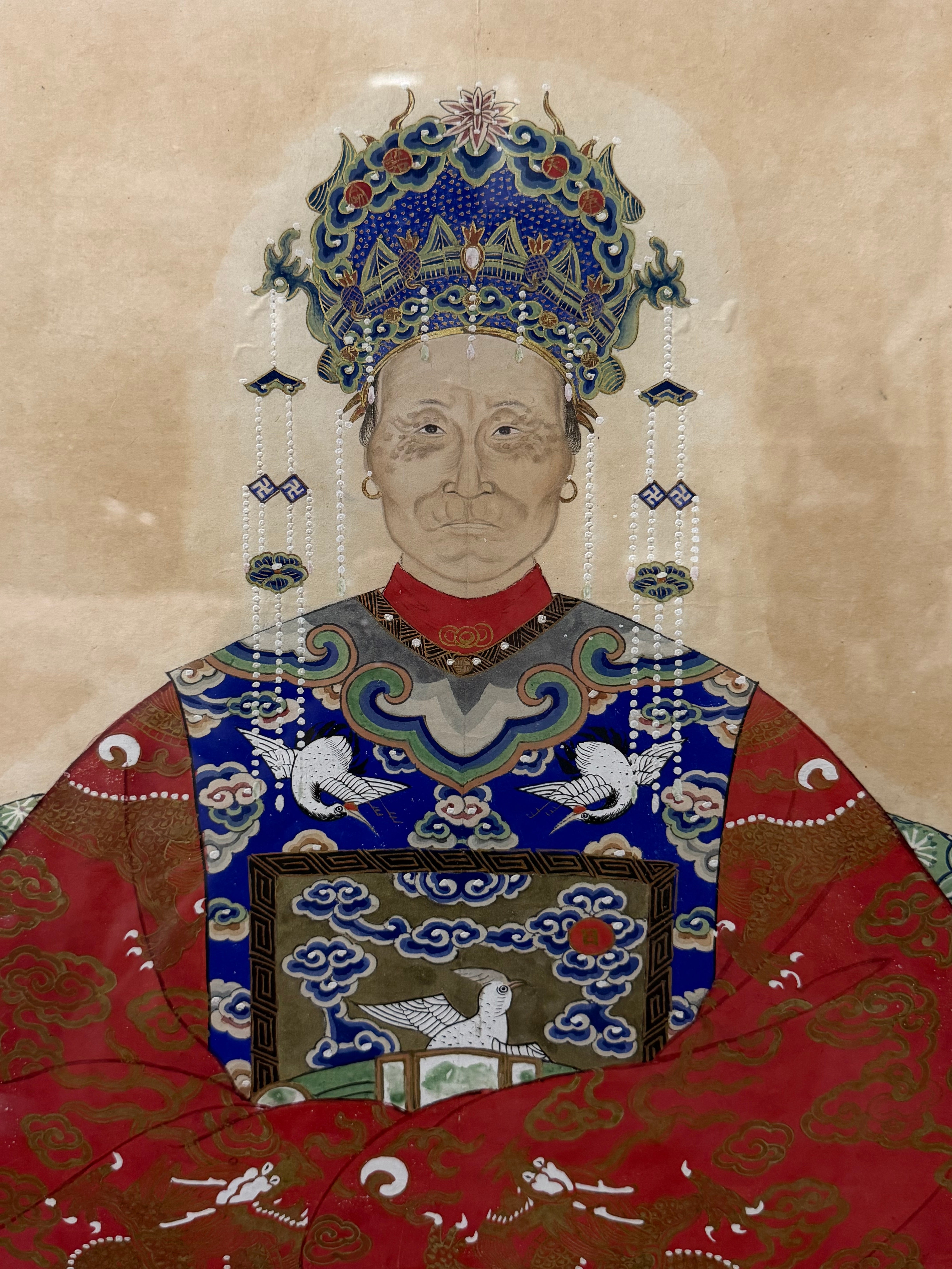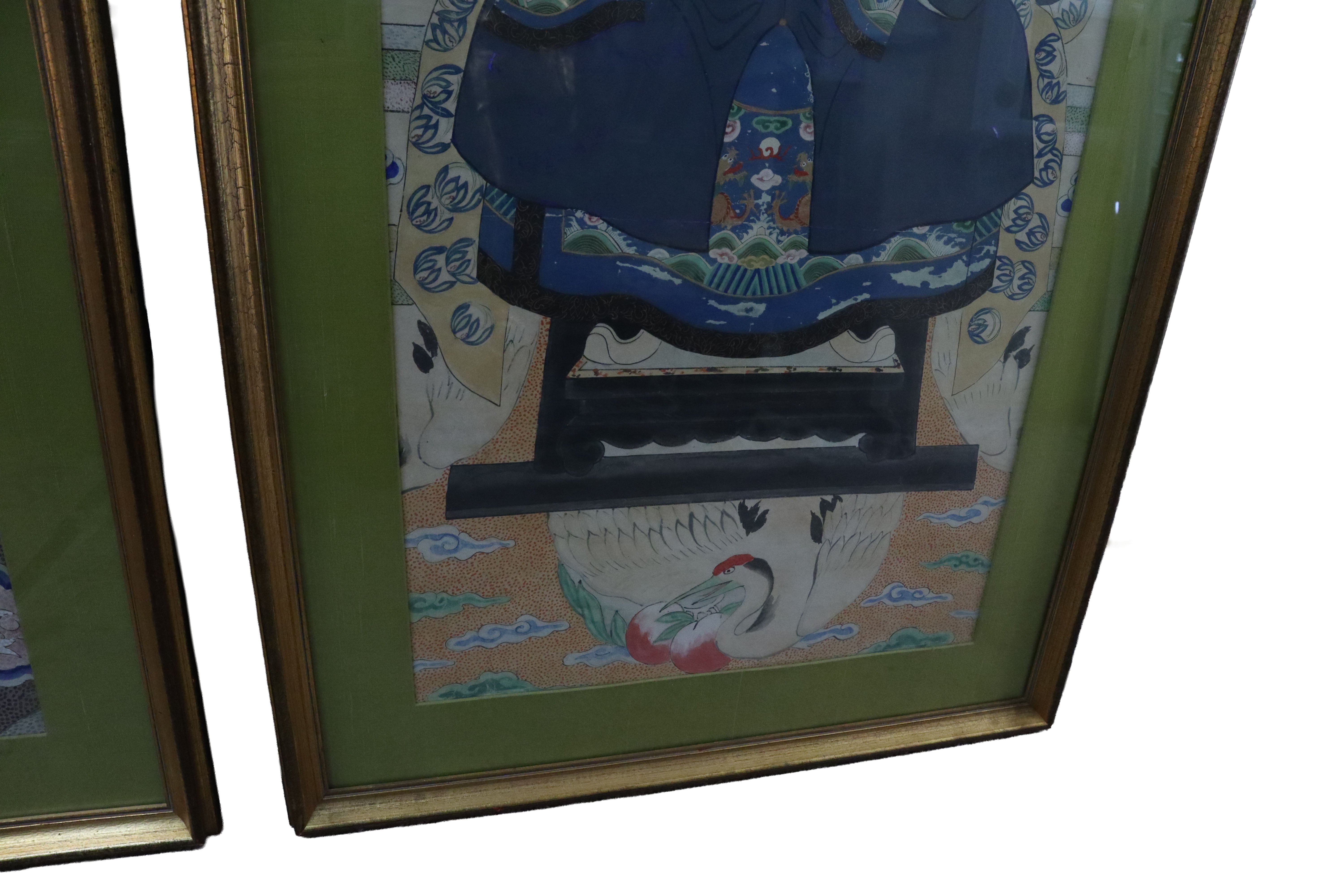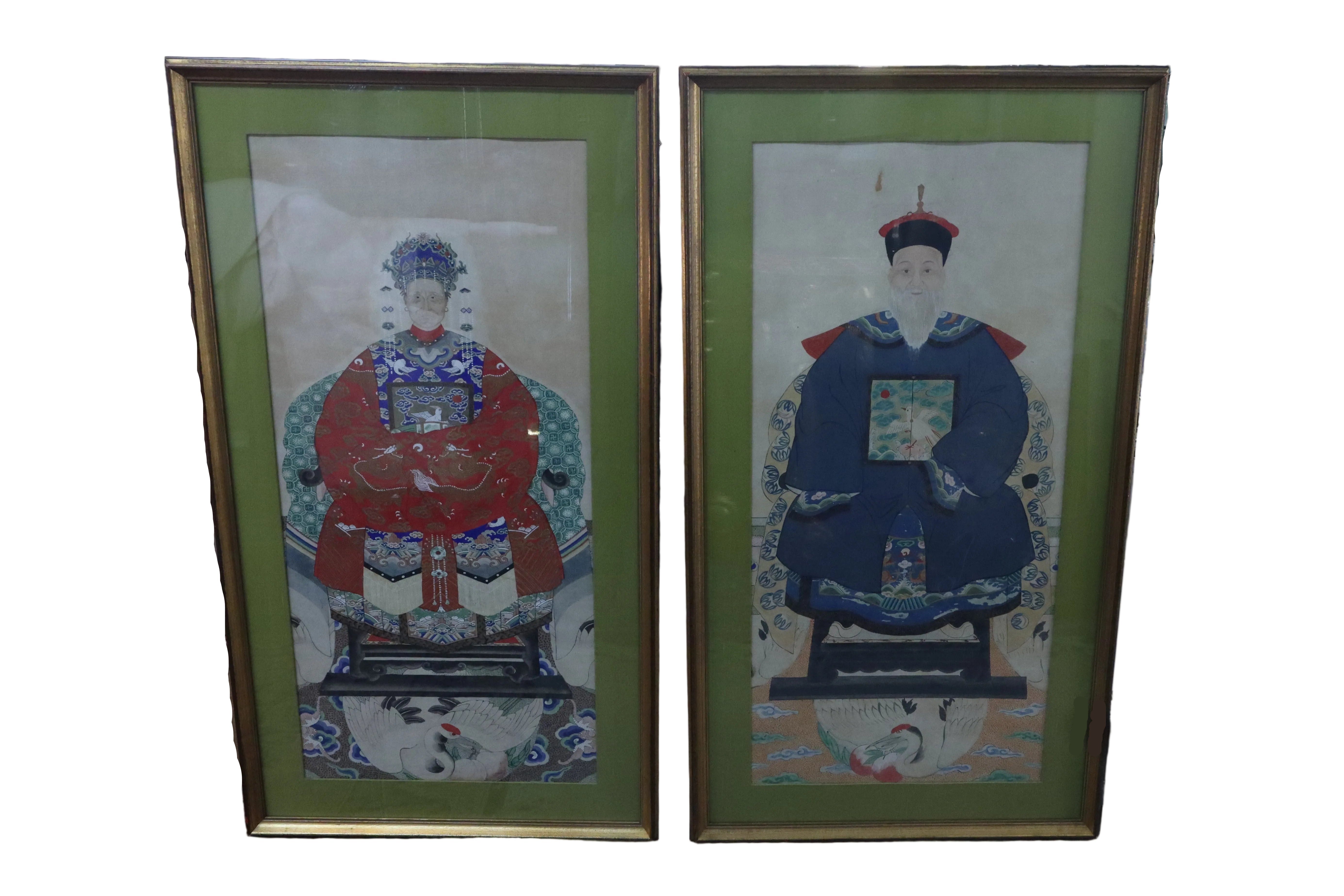 Fantastic pair of large Chinese 19th century hand painted ancestor portraits. Well framed with olive green mattes that compliment the overall color scheme of the portraits. The woman is depicted in red and the man is in blue. They both share a crane, clouds and wave motif. The main similarity between the two portraits, not including the pose, is the crane with two peaches found sitting at the bottom of both figures, facing each other.