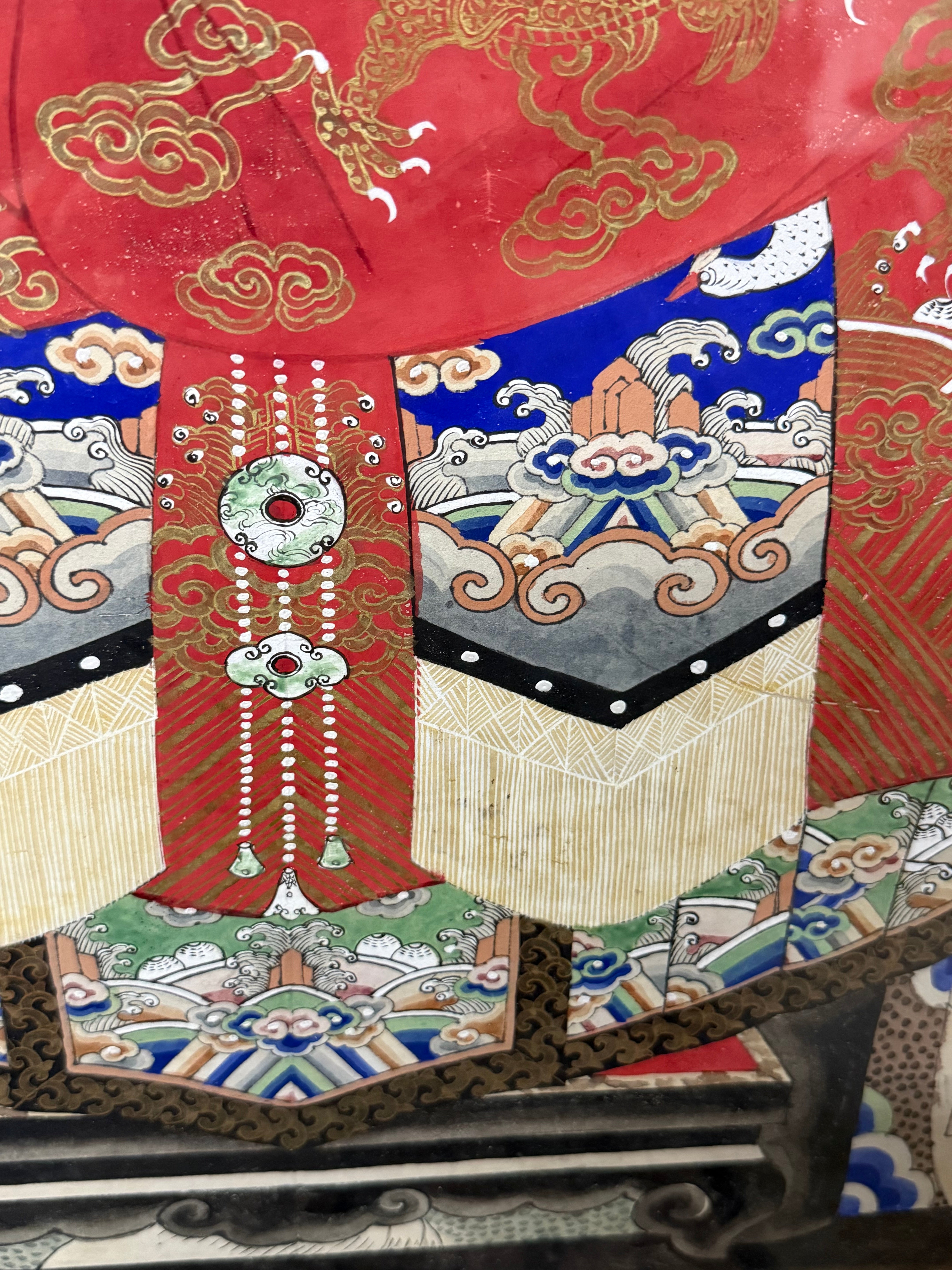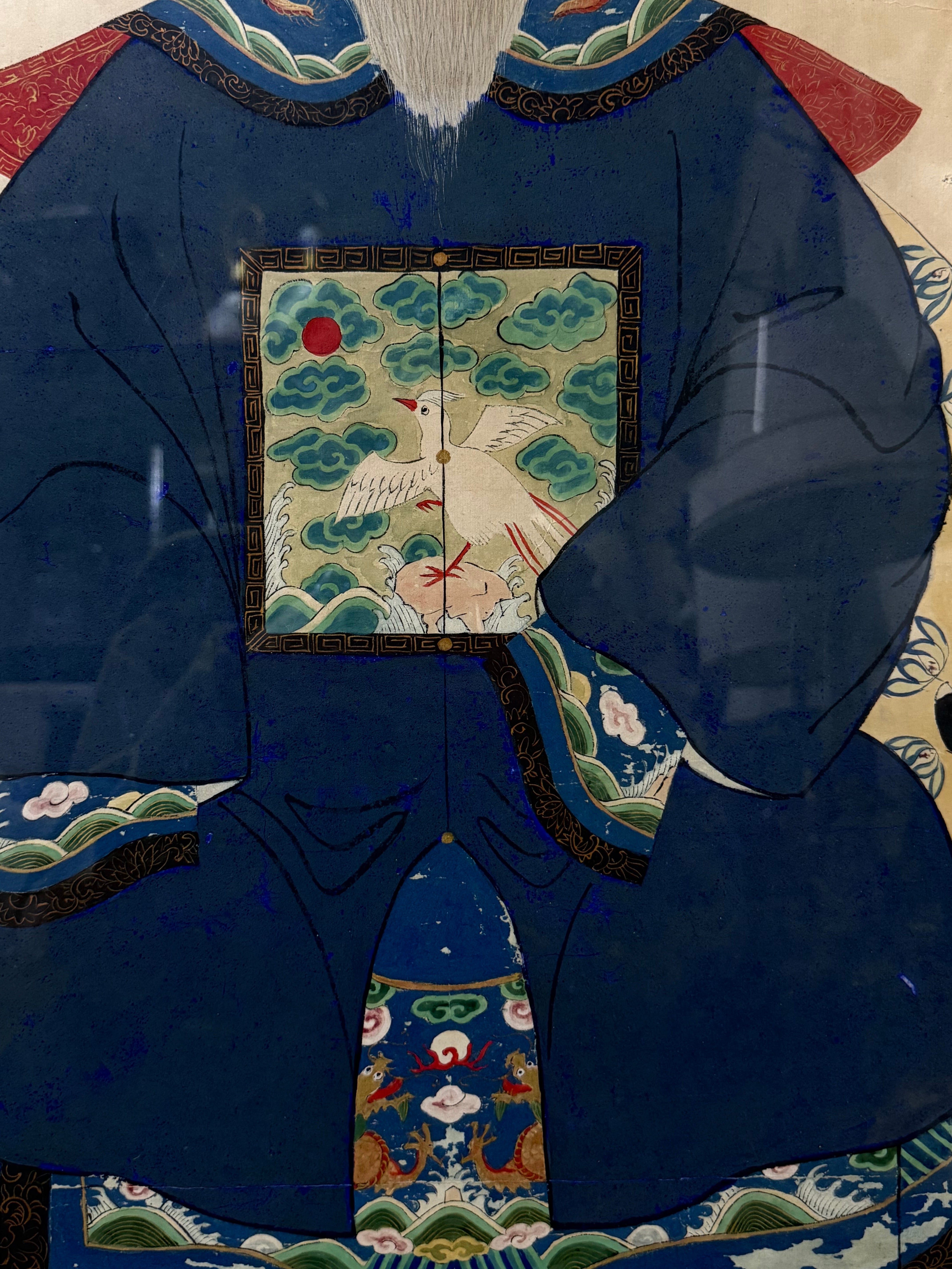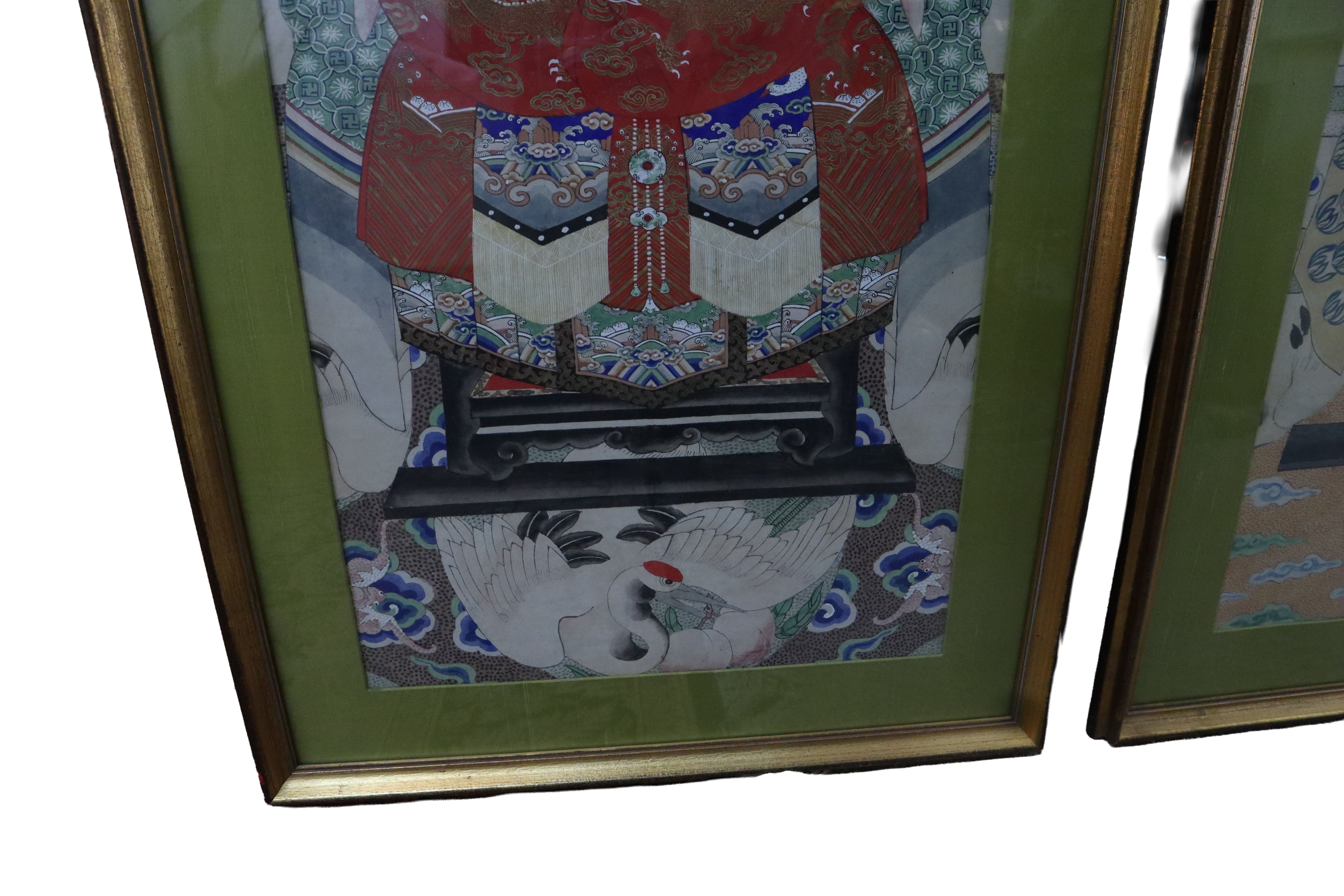 Fantastic pair of large Chinese 19th century hand painted ancestor portraits. Well framed with olive green mattes that compliment the overall color scheme of the portraits. The woman is depicted in red and the man is in blue. They both share a crane, clouds and wave motif. The main similarity between the two portraits, not including the pose, is the crane with two peaches found sitting at the bottom of both figures, facing each other.
