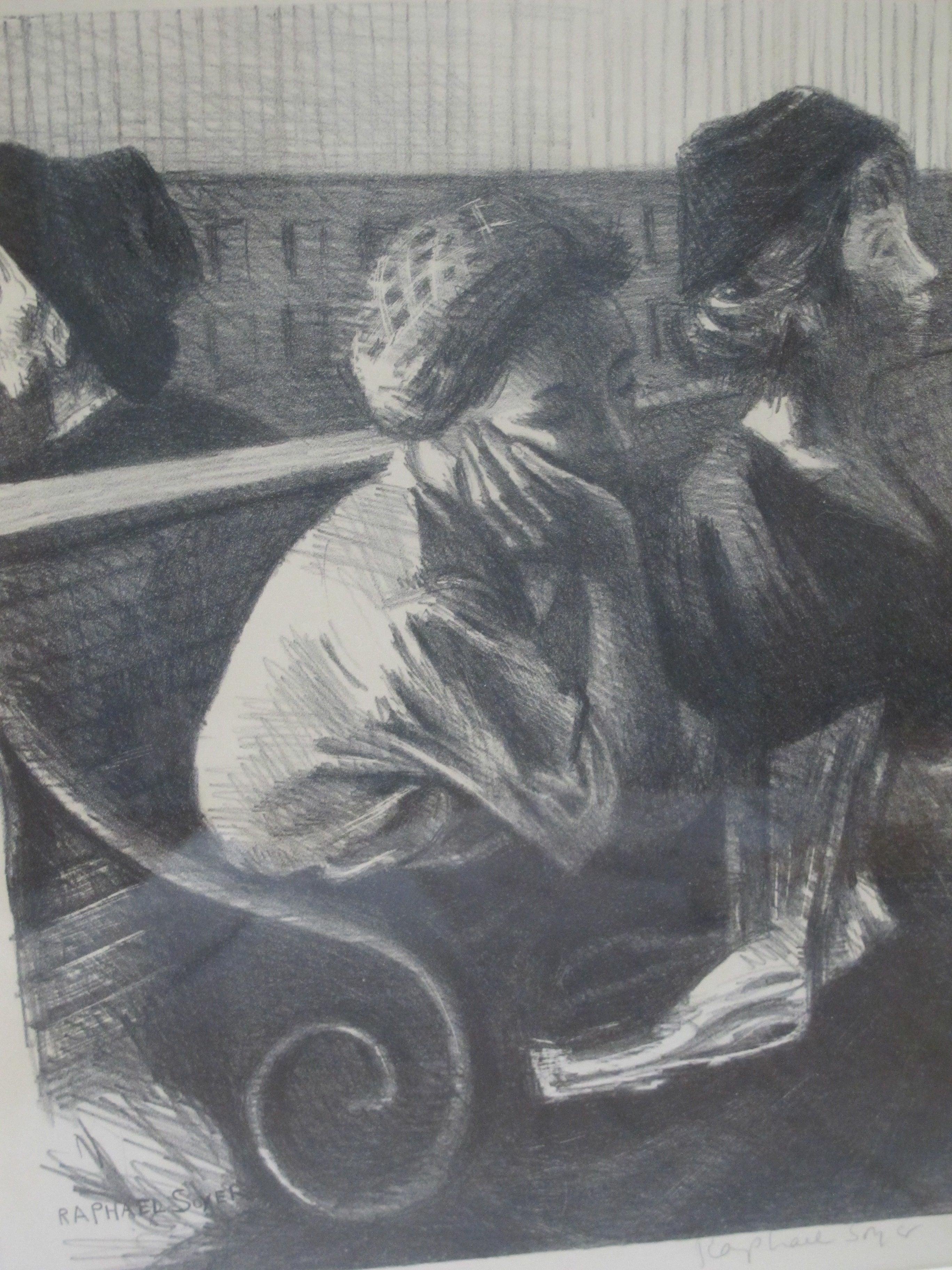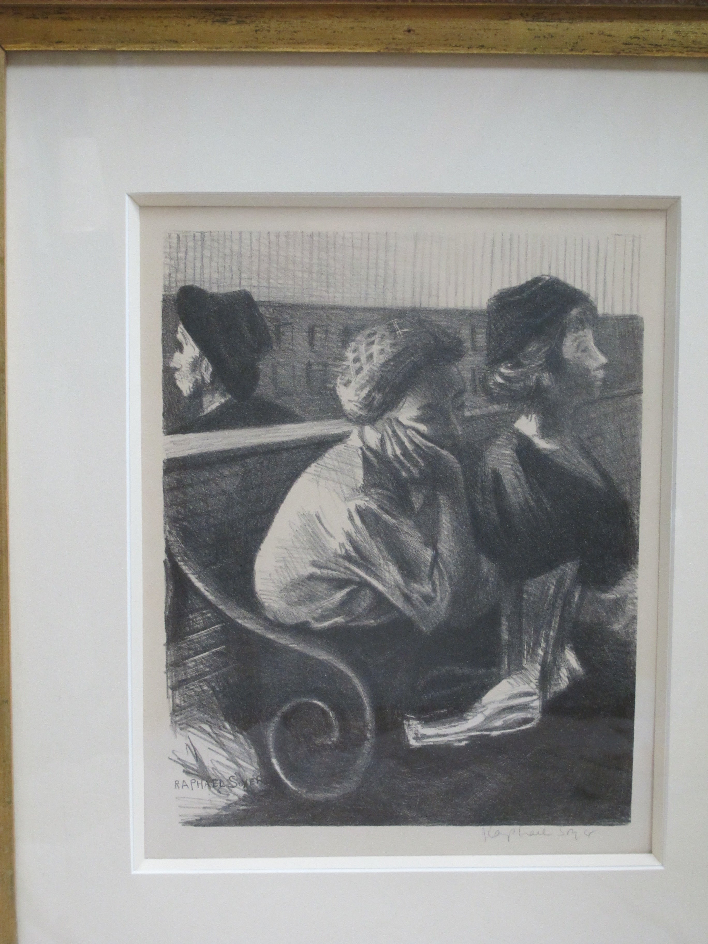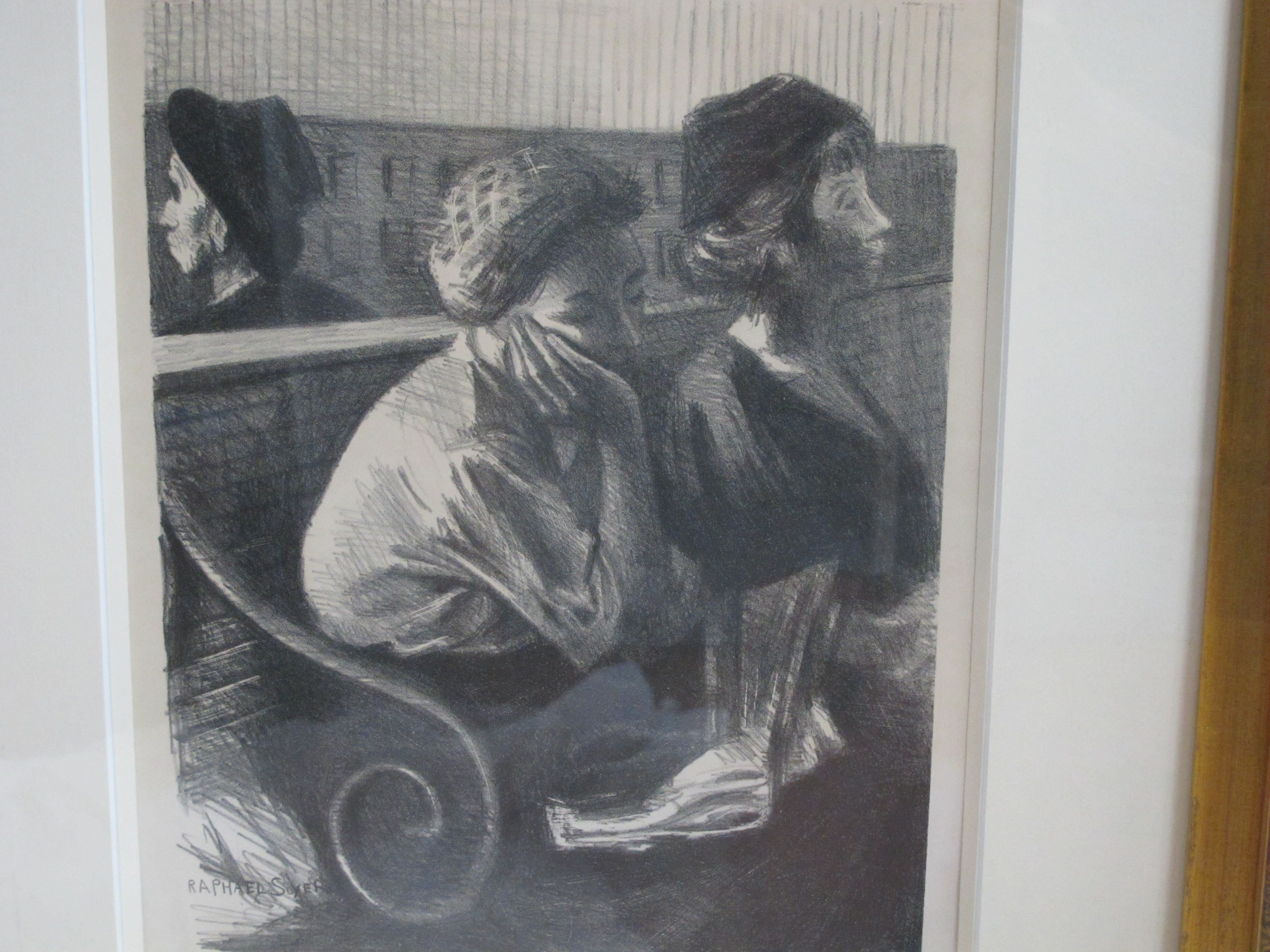 Raphael Soyer (Russian/American, 1899 -1987) framed lithograph figures in a Railroad Waiting Room, 1954. Printed by George C. Miller. Signed at pencil at lower right. Very well framed, frame measures 23 1/2" x 27 1/2", print measures 13 1/2" x 10 1/2". Print is in excellent condition. Frame shows a crack at upper left corner, still in solid condition.