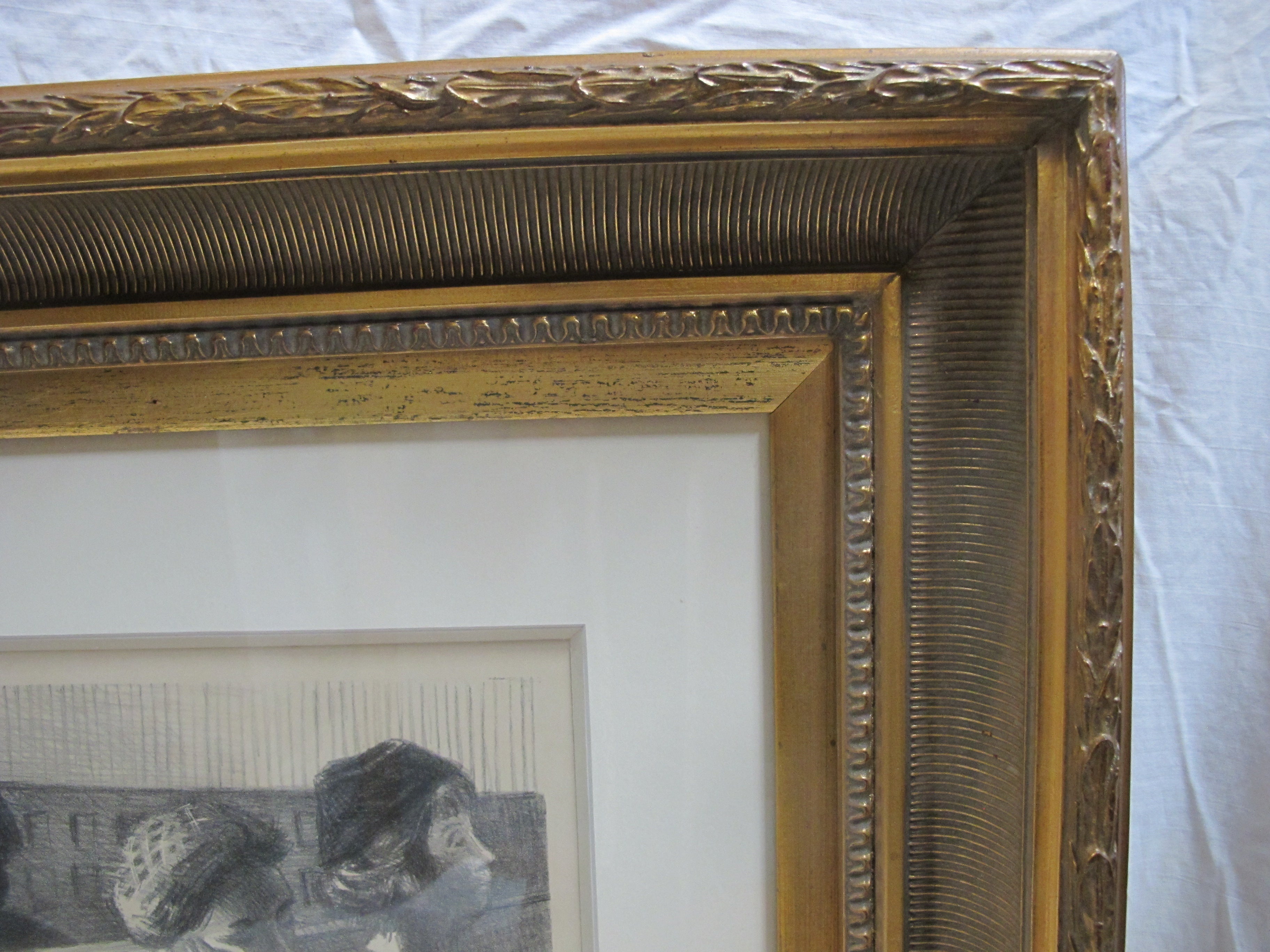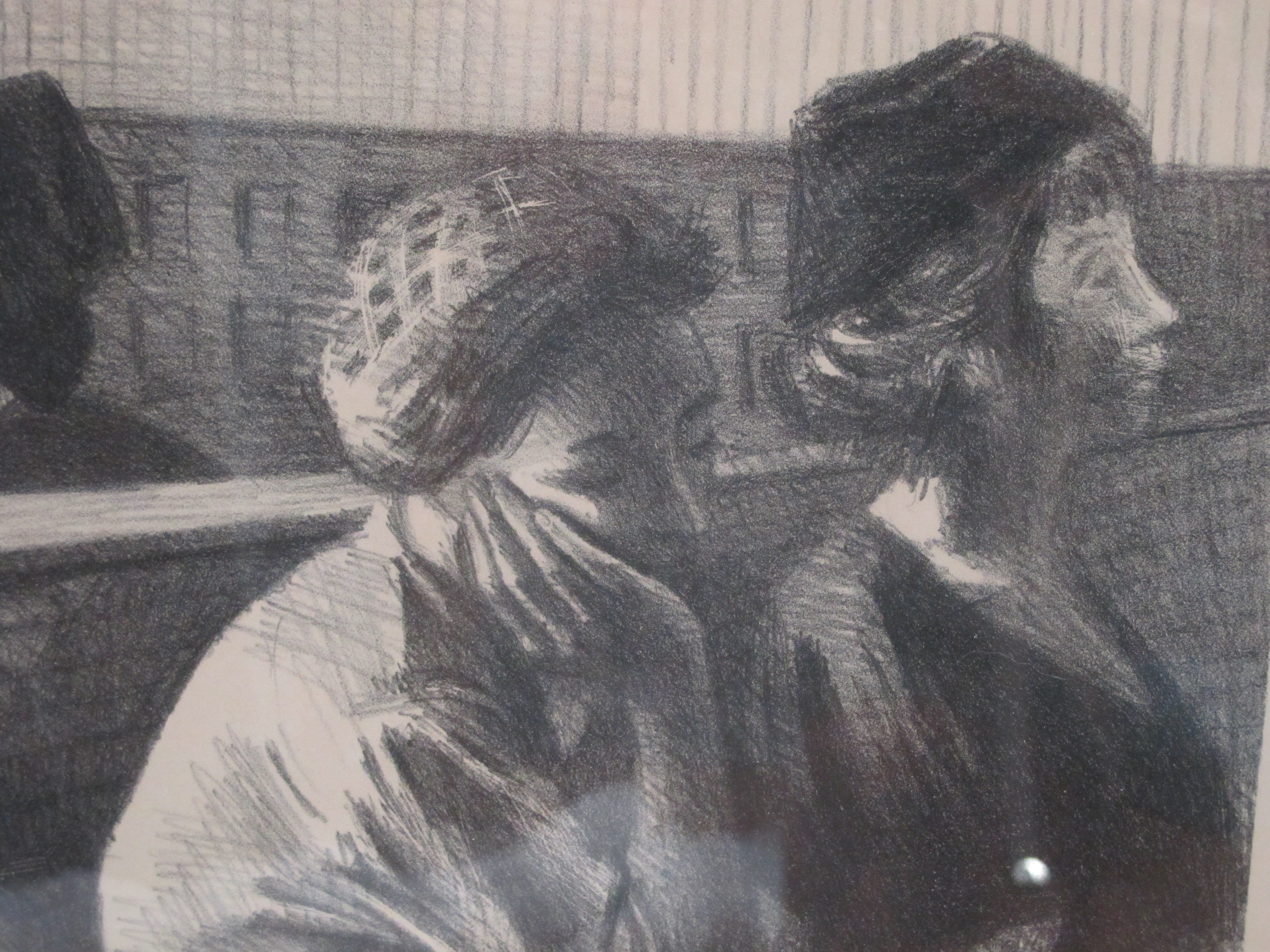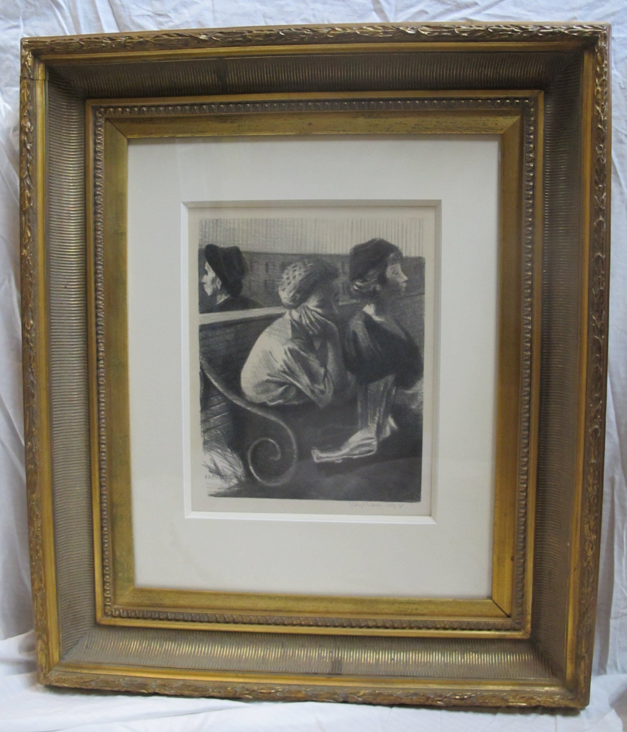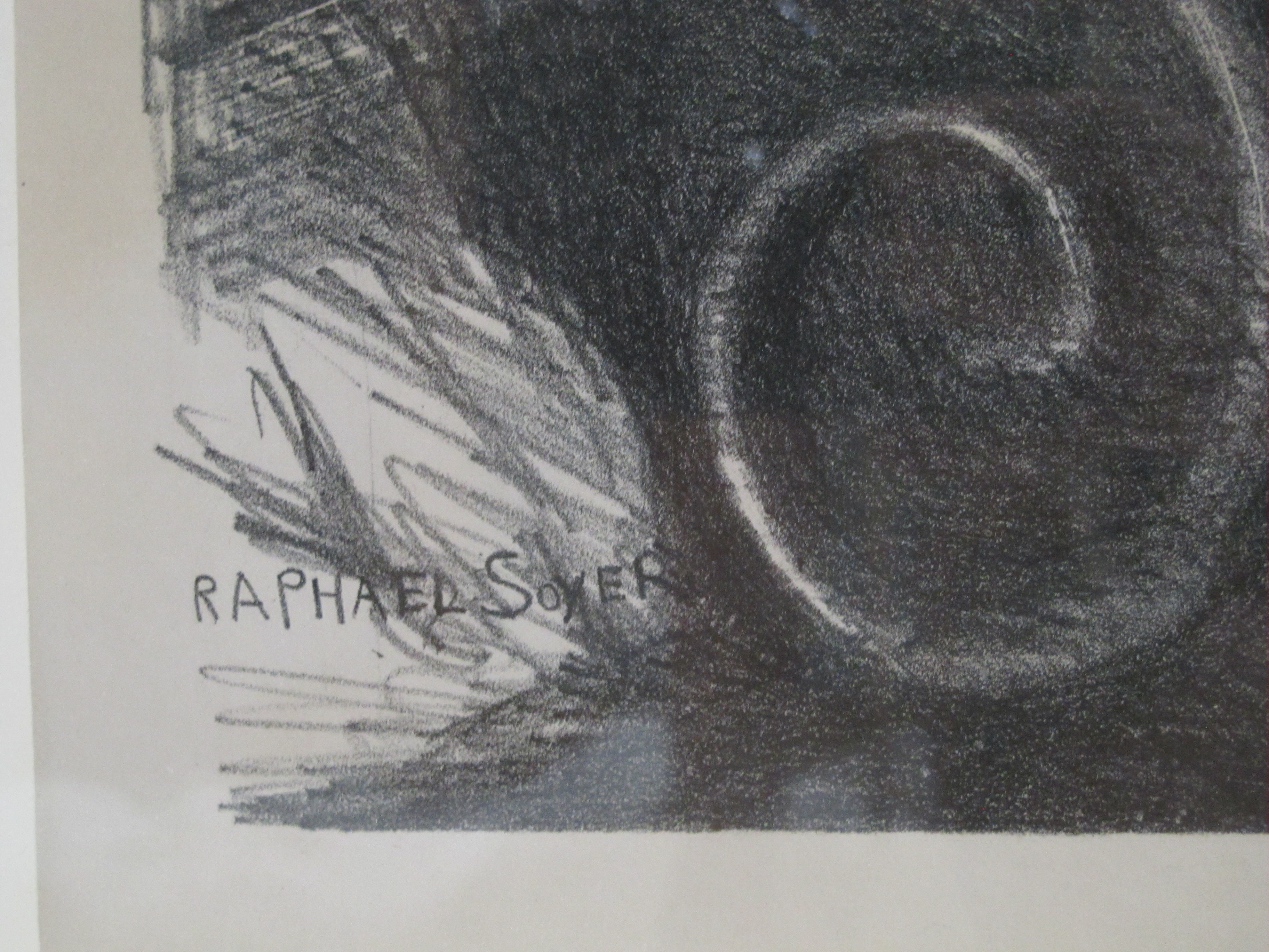 Raphael Soyer (Russian/American, 1899 -1987) framed lithograph figures in a Railroad Waiting Room, 1954. Printed by George C. Miller. Signed at pencil at lower right. Very well framed, frame measures 23 1/2" x 27 1/2", print measures 13 1/2" x 10 1/2". Print is in excellent condition. Frame shows a crack at upper left corner, still in solid condition.