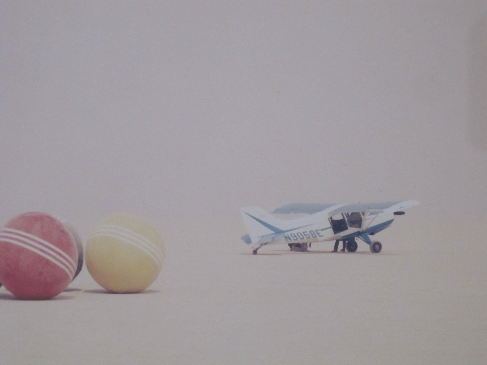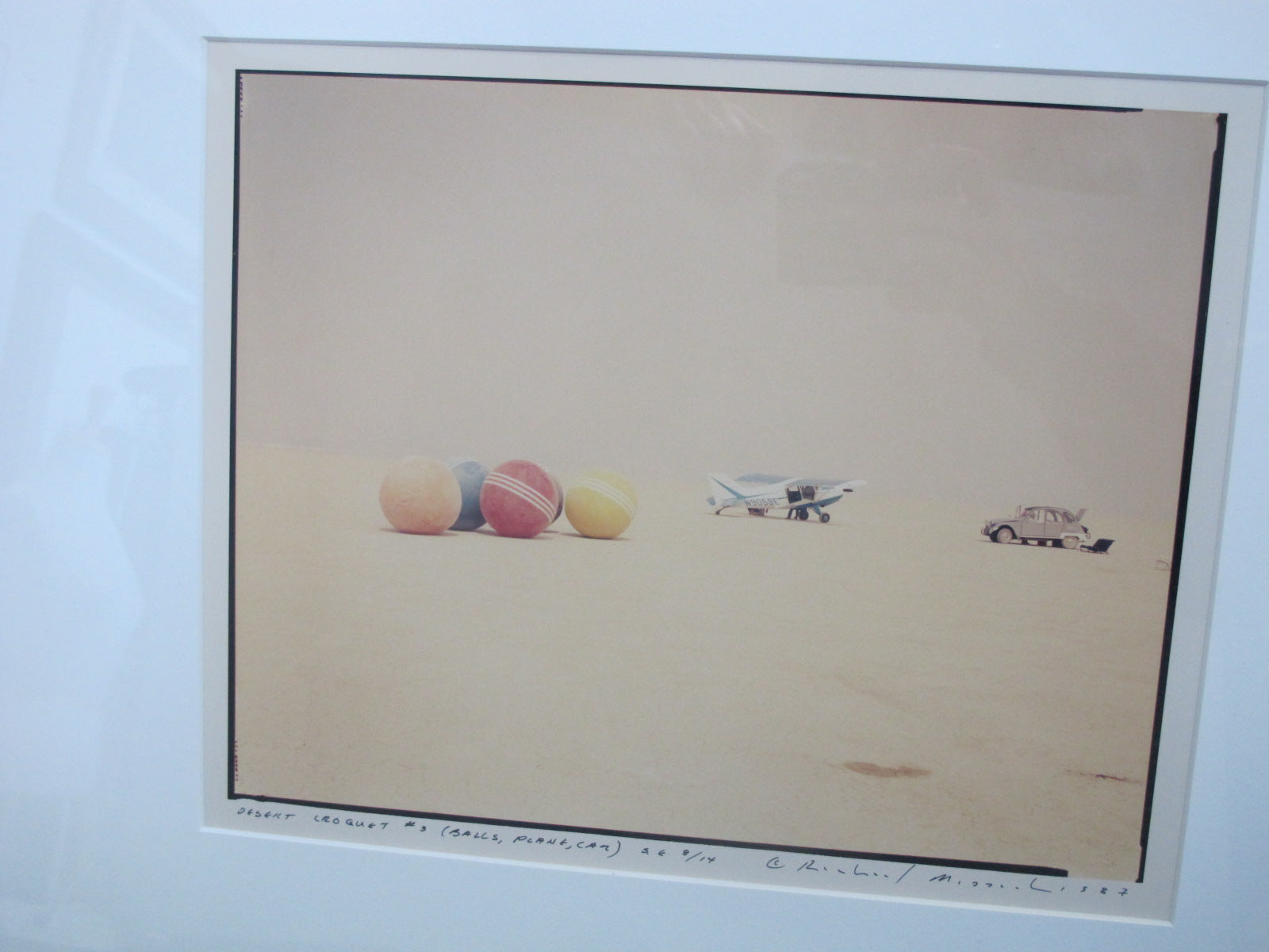 Richard Misrach (American, 1949) , photograph titled "Desert Croquet #3 (Balls, Plane, Car)", Black Rock City, Nevada, 1987, limited edition 8/14.