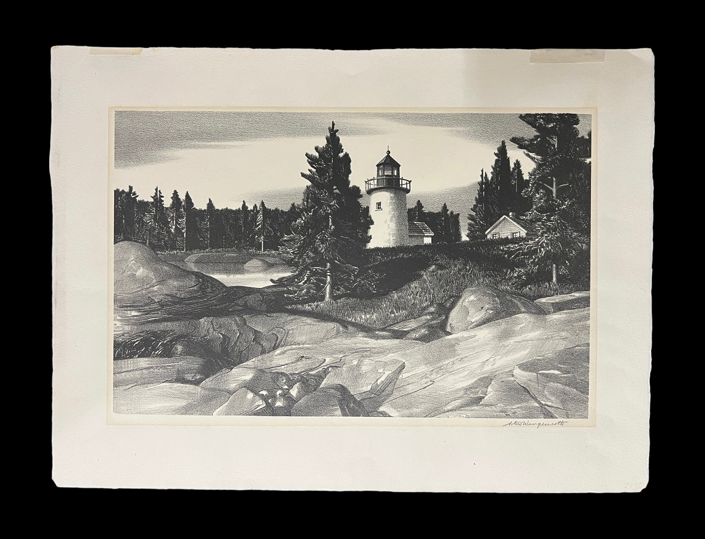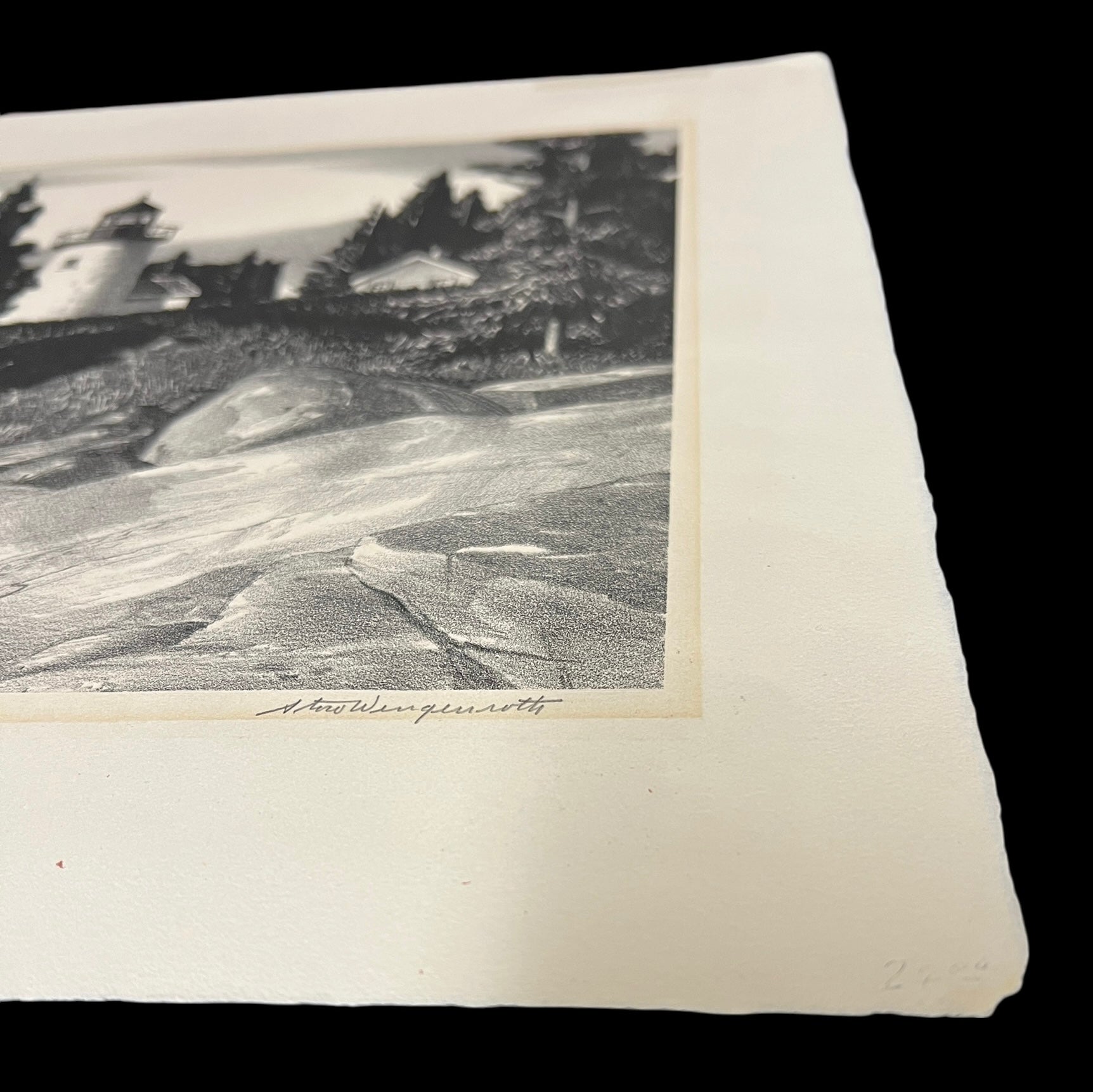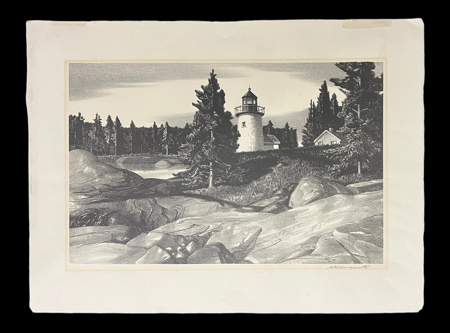"Stow Wengenroth is a well known American artist who created wonderful images of New England, New York City, and Long Island. He was born in Brooklyn, New York, on July 25, 1906, to Frederick Wengenroth, an architect, and Isabelle Stow, a textile designer. He studied at the Art Students League in 1923 with George Bridgman, then at the Grand Central School of Art with Wyman Adams. During the summers in the 1920’s, he would go to Woodstock, New York, to work with John Carlson or to Eastport, Maine, and work with George Ennis. It was Ennis in 1929 who recommended that Wengenroth should consider working in lithography. He felt that his drawing style suited the medium. In 1931 Wengenroth published his first lithographs - all images in and around Eastport, Maine. He had his first one-artist exhibition in 1931 at Macbeth Gallery showcasing his lithographs and drybrush drawings."